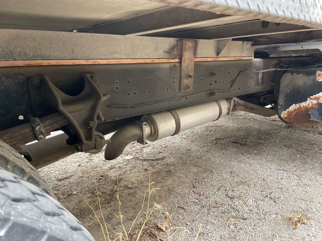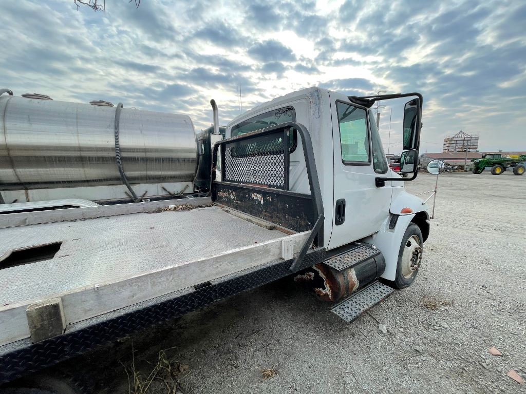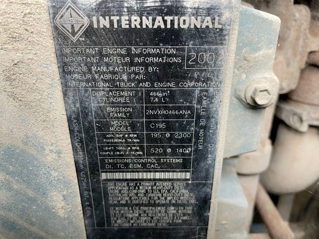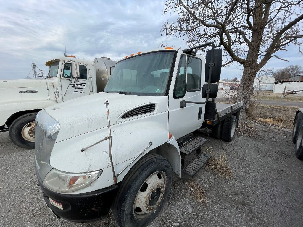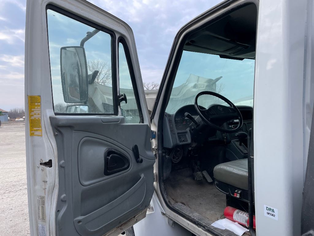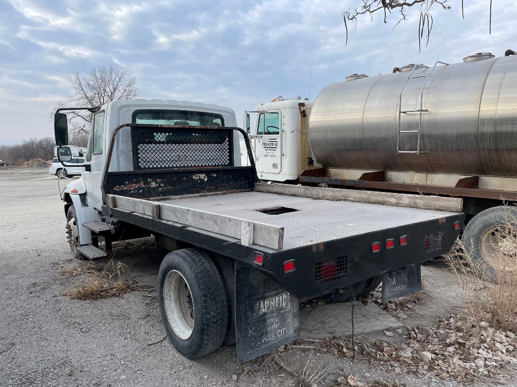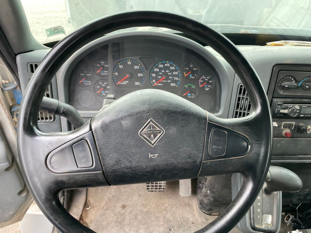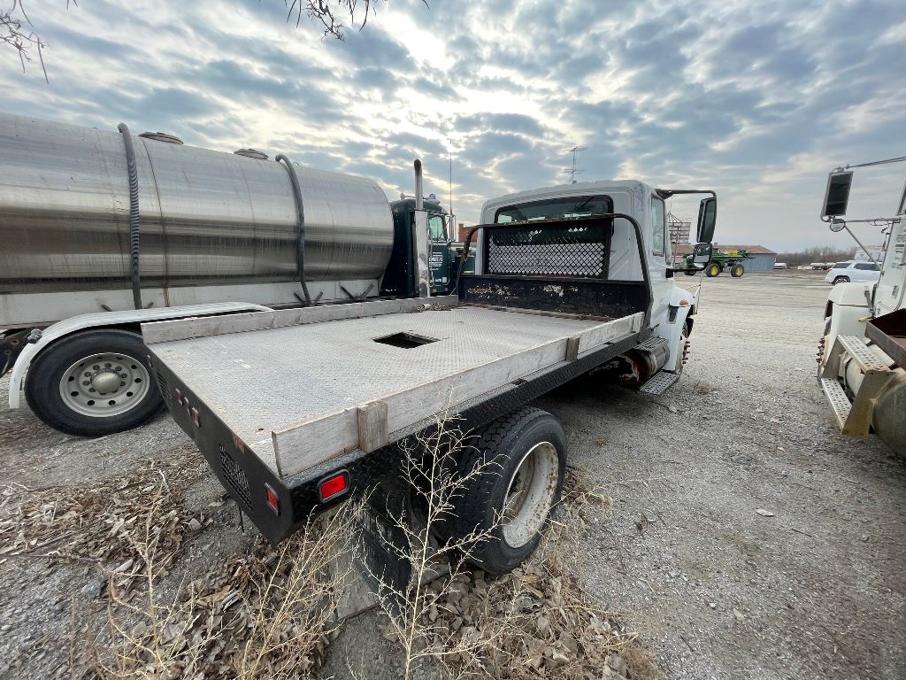 2003 IHC Flatbed Truck (GP2362, Unit 11689), 7.6L diesel engine, automatic transmission, air conditioning, heat, Am/Fm CD radio, cruise control, single axle, spring suspension, 10' steel flatbed, 5th wheel ball, 255/70R22.5 tires, shows 209,414 miles, 11,040 hours.