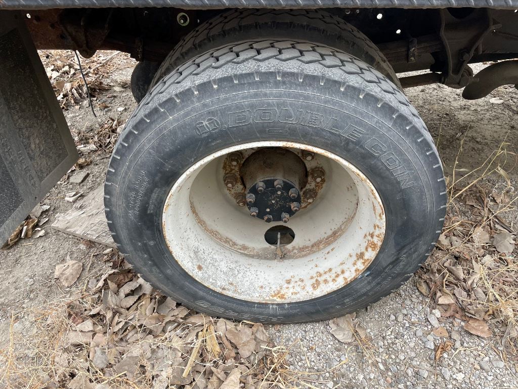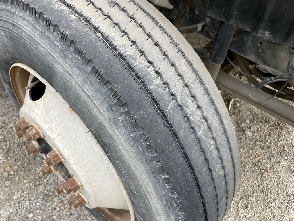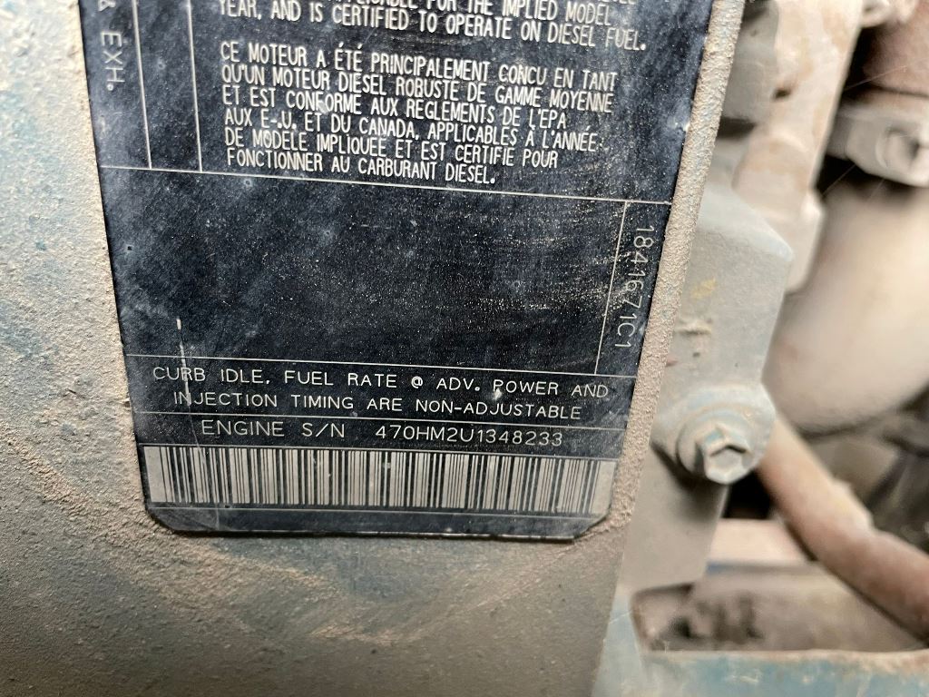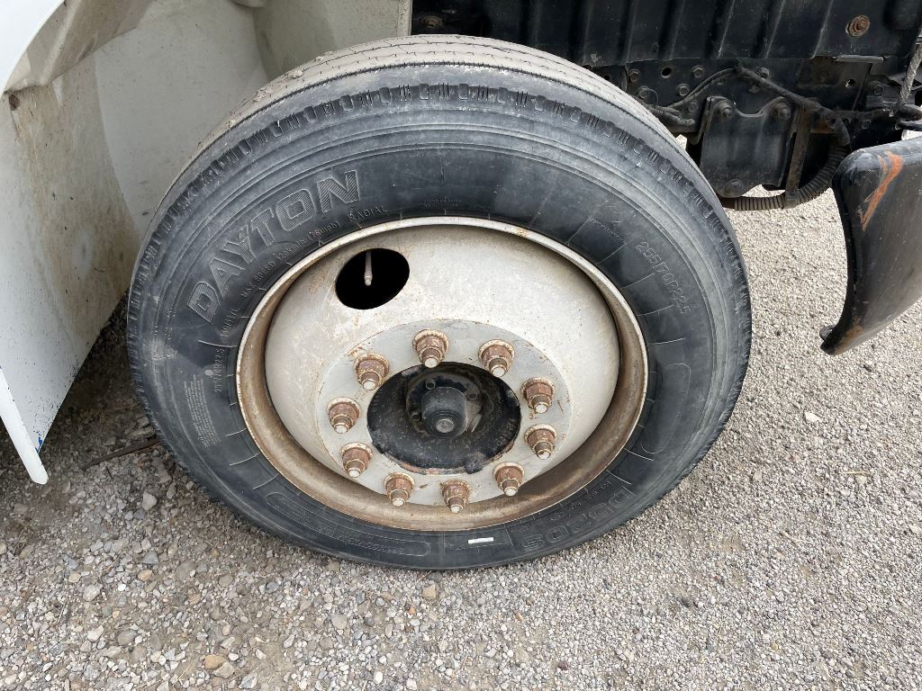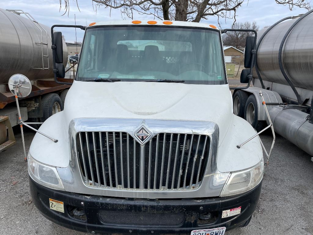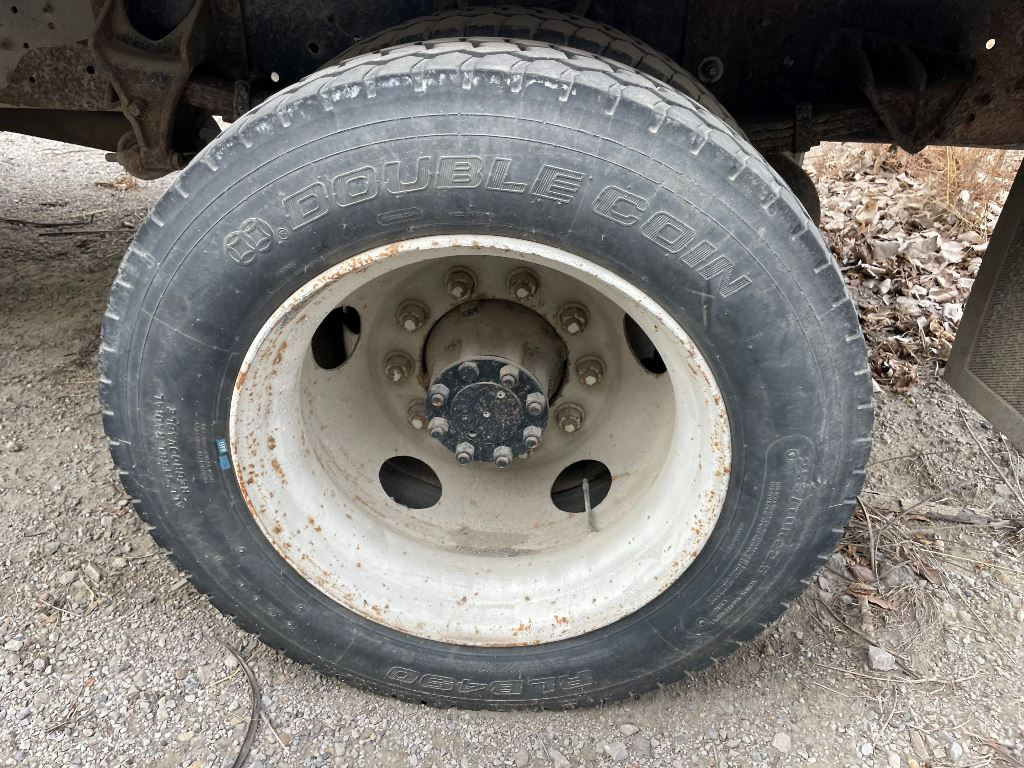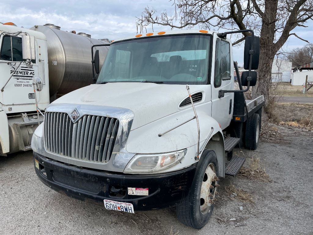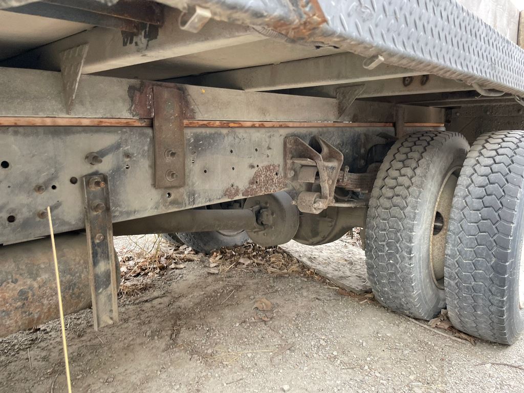 2003 IHC Flatbed Truck (GP2362, Unit 11689), 7.6L diesel engine, automatic transmission, air conditioning, heat, Am/Fm CD radio, cruise control, single axle, spring suspension, 10' steel flatbed, 5th wheel ball, 255/70R22.5 tires, shows 209,414 miles, 11,040 hours.
