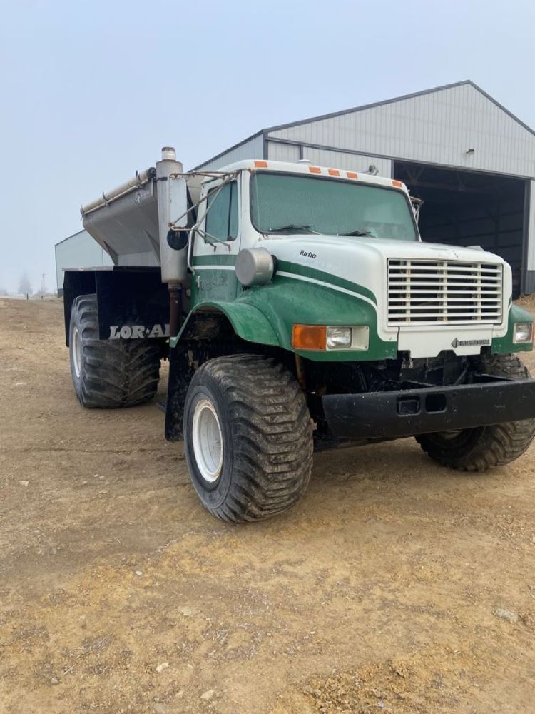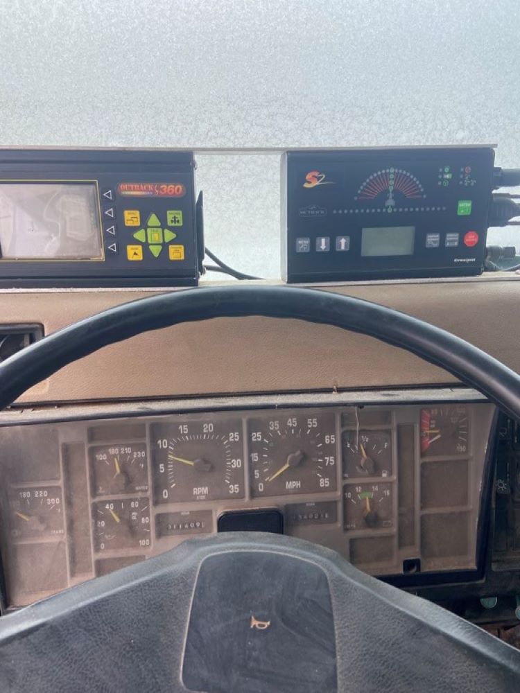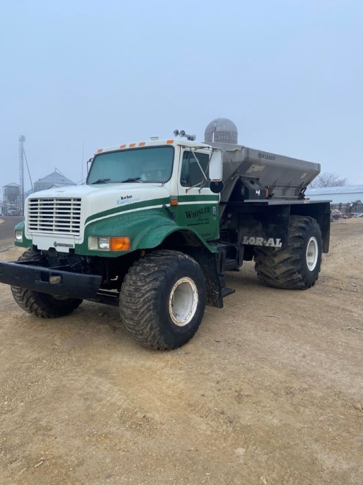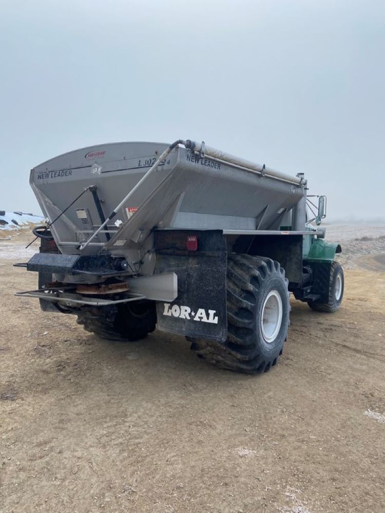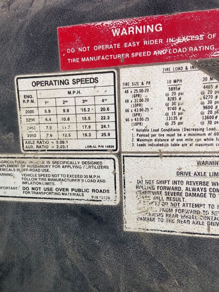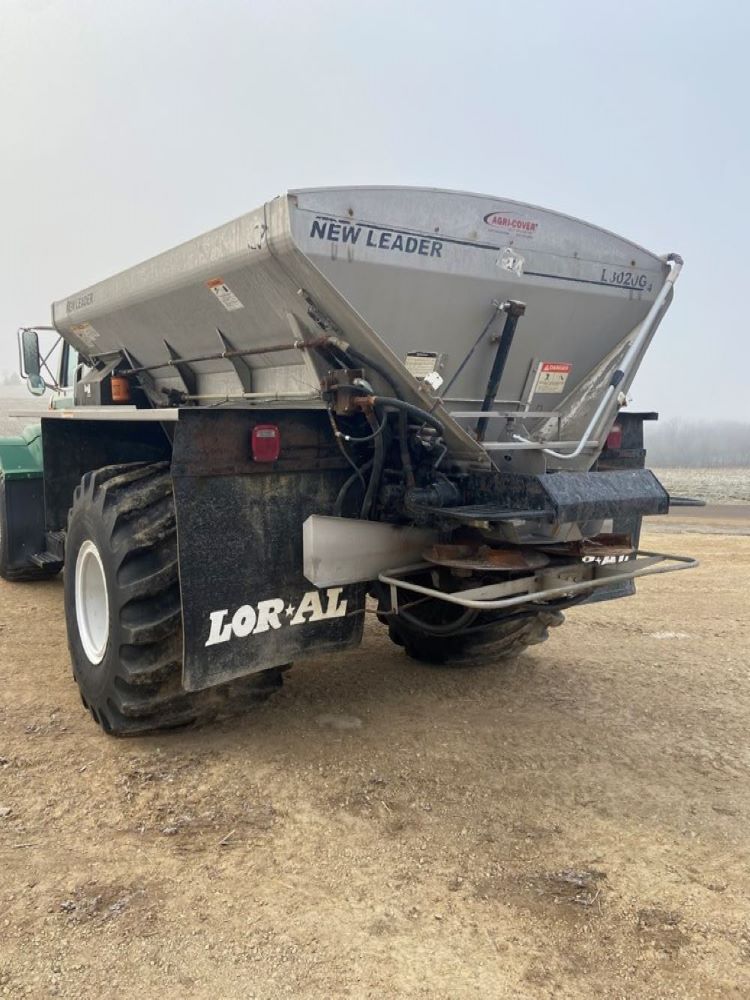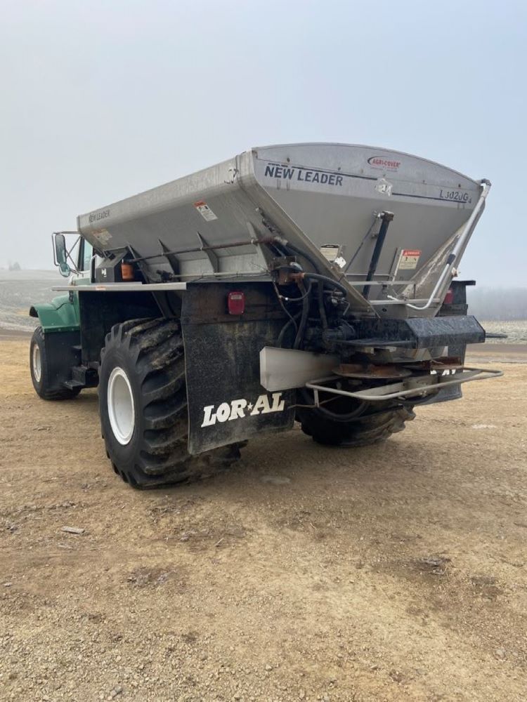 1993 Loral Easy Rider Dry Floater (DR3623), DT466 diesel engine, Allison automatic transmission, New Leader L3020 G4 hydraulic stainless steel dry spinner box, belt/chain, roll over tarp, New Leader controller, Outback swathing, cab heat/air conditioning, 66X43.00-25 rear tires, 48X25.00-20 front tires, shows 134,021 miles, 11,409 hours.