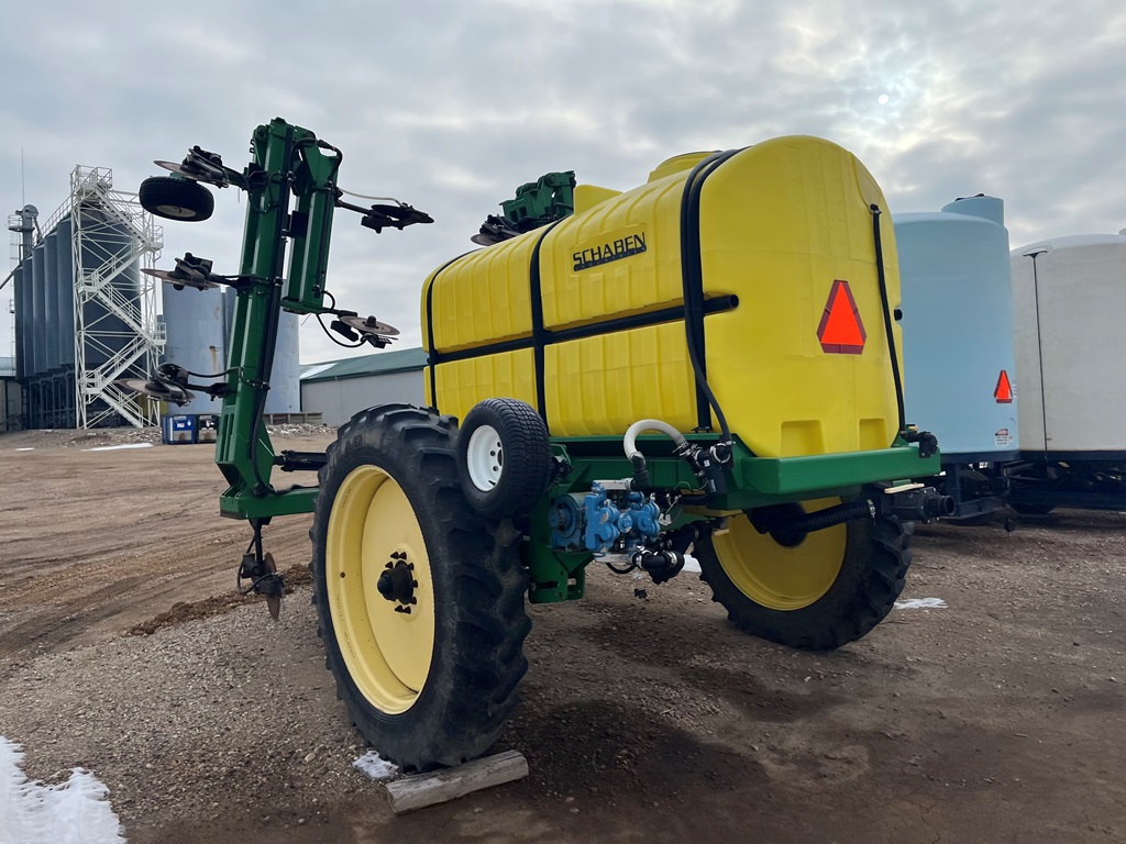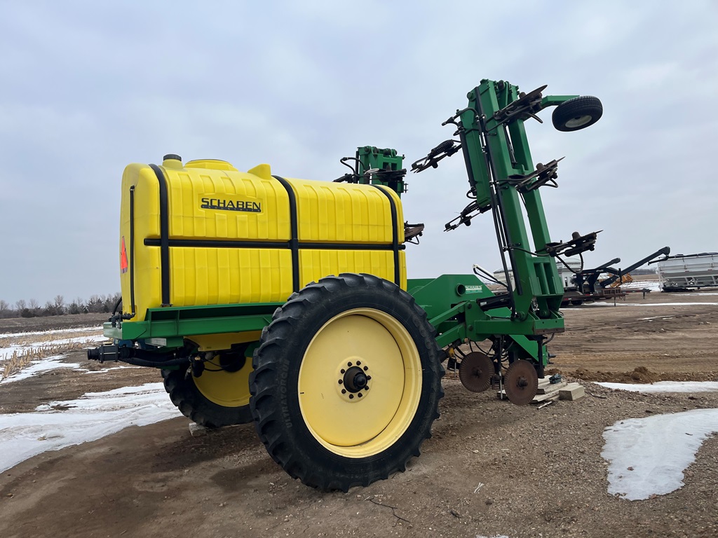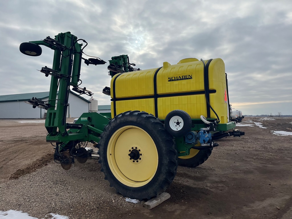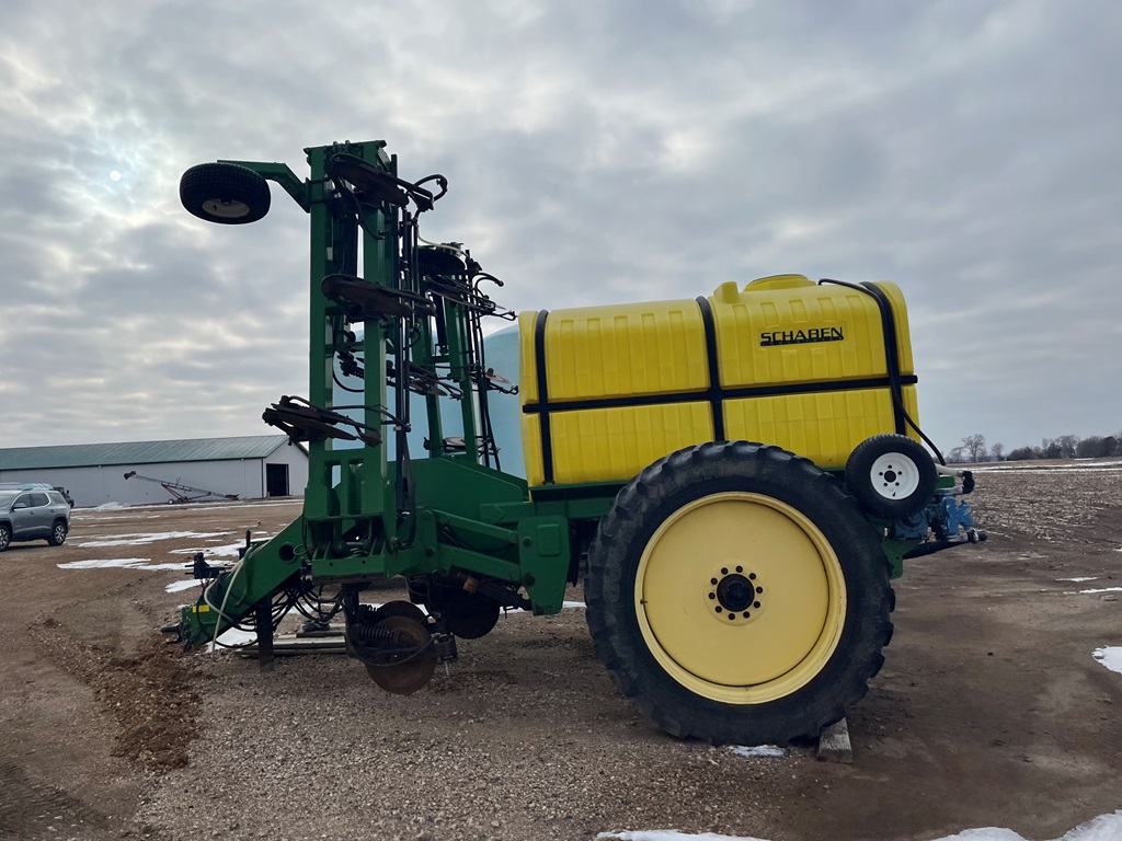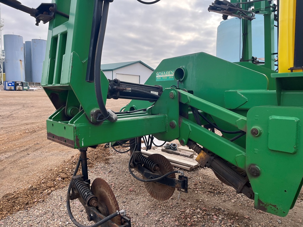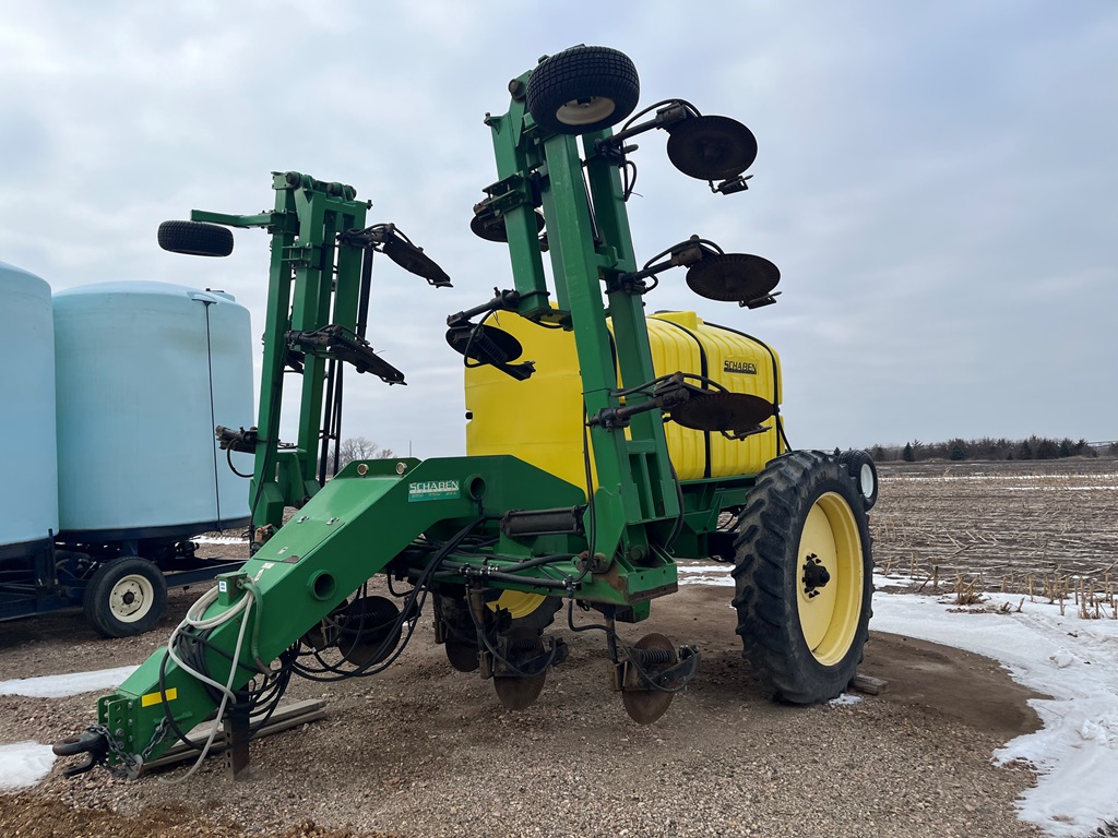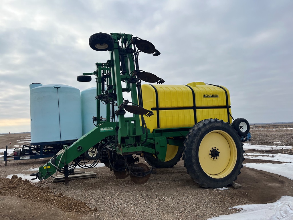 Schaben Applicator (DR3622), model LA-9000 15 row side dress liquid applicator, 1,500 gallon poly tank, John-blu ground drive pump, hydraulic fold, ripple coulters, adjustable axles, 380/90R46 row crop tires.