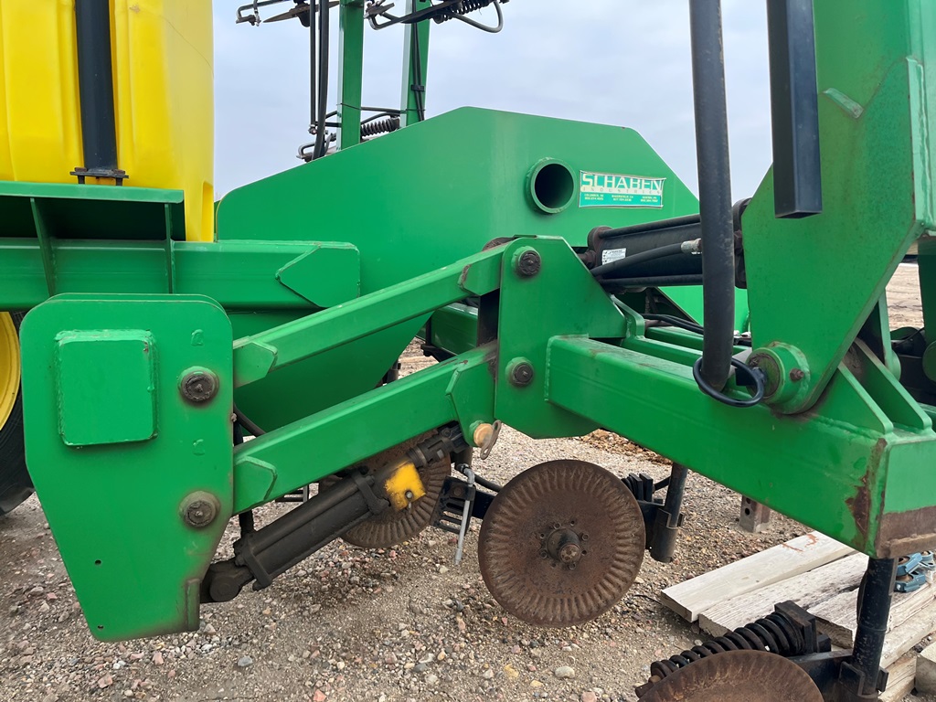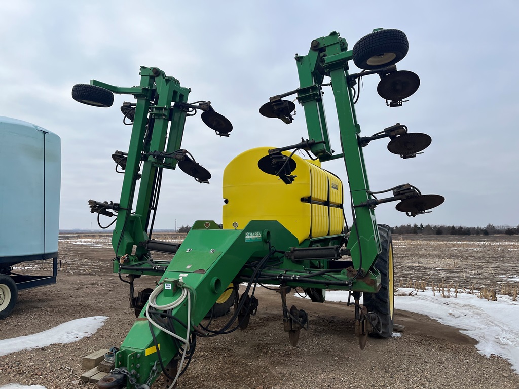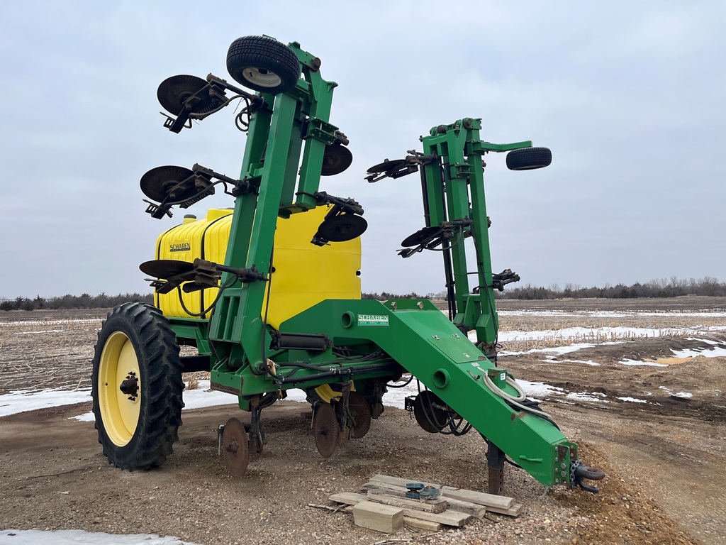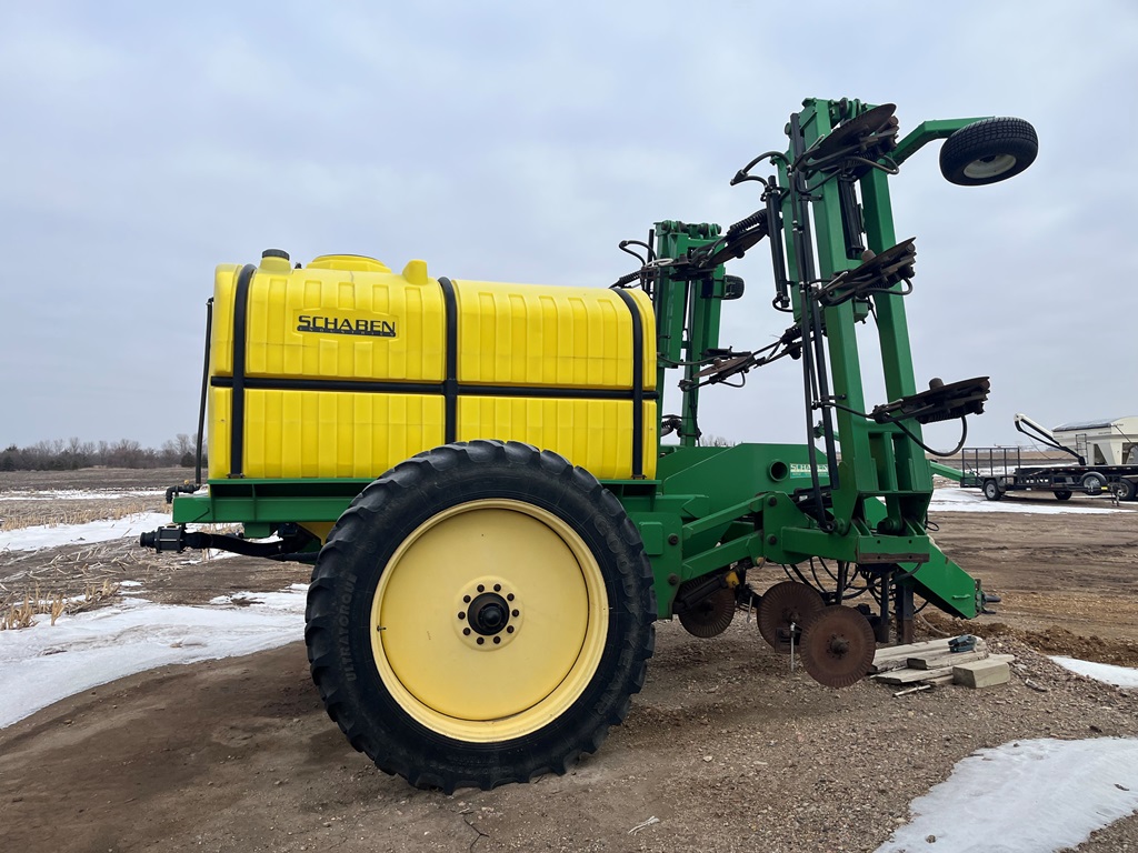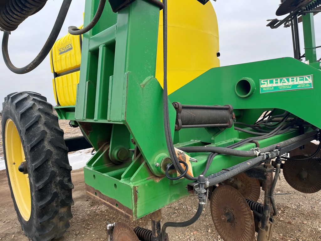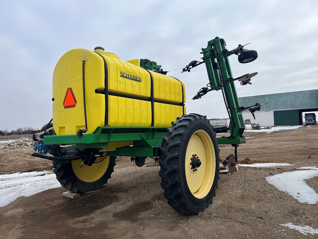 Schaben Applicator (DR3622), model LA-9000 15 row side dress liquid applicator, 1,500 gallon poly tank, John-blu ground drive pump, hydraulic fold, ripple coulters, adjustable axles, 380/90R46 row crop tires.