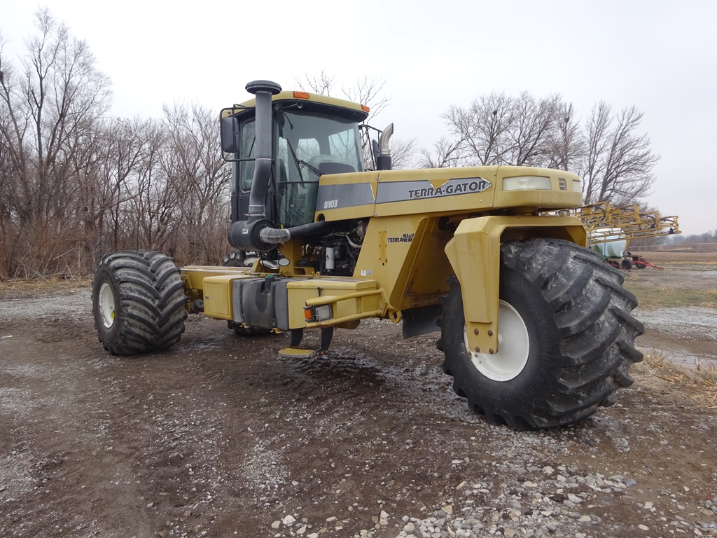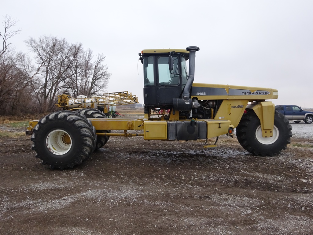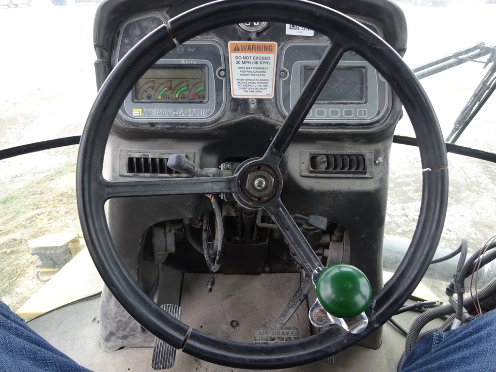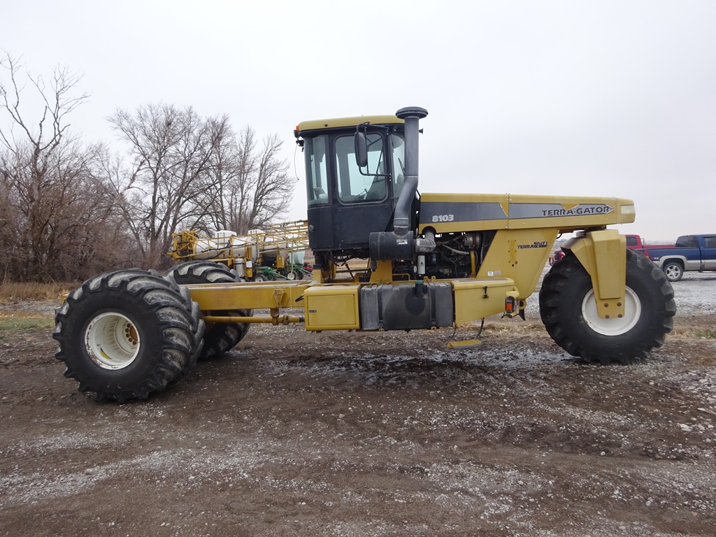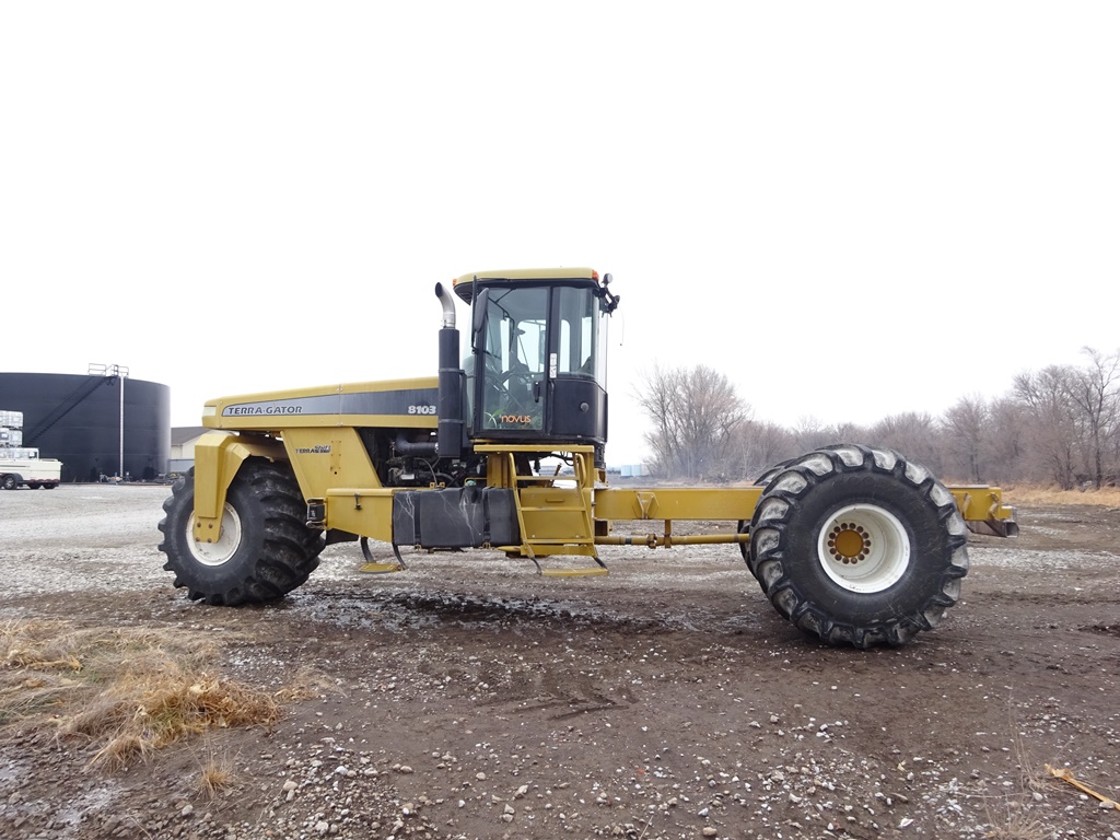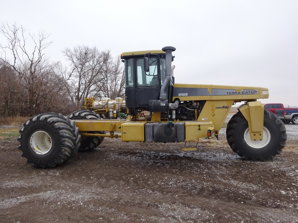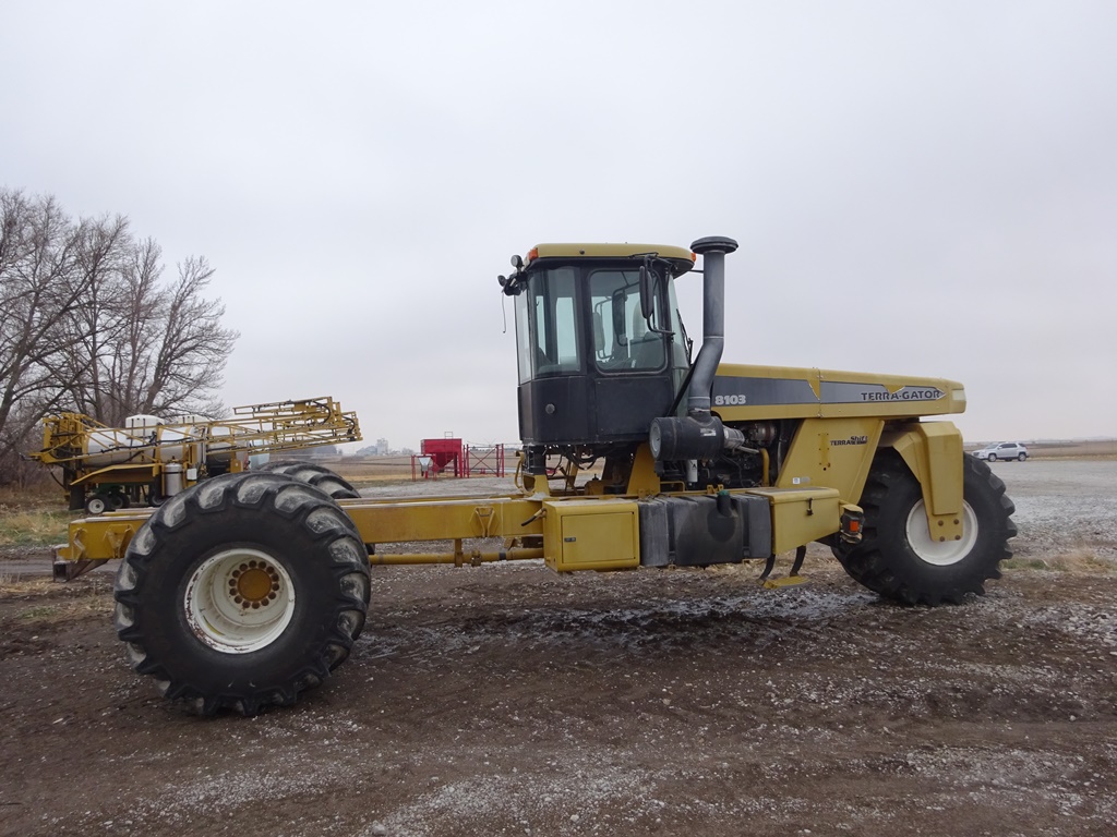 2003 Terra Gator 8103 Cab Chasis Floater (PZ10112), John Deere diesel engine (S/N RG6081H210308), Terra Shift transmission, air conditioning, heat, Am/Fm cassette radio, Firestone 66x43.00-25 front tire, Good Year Optiterra 1000/50R25 rear tires, shows 10,162 hours.