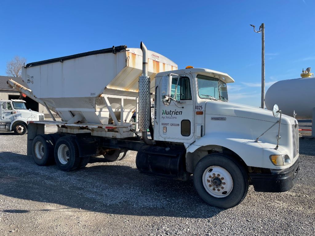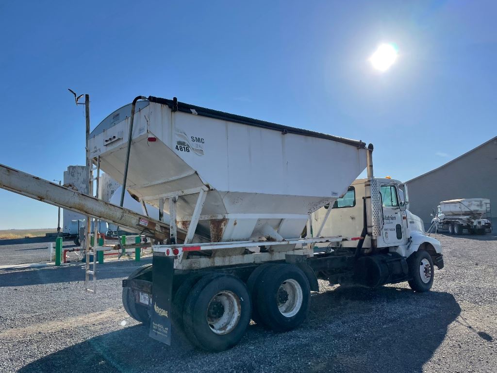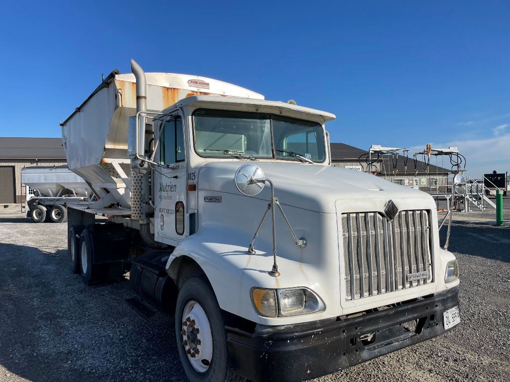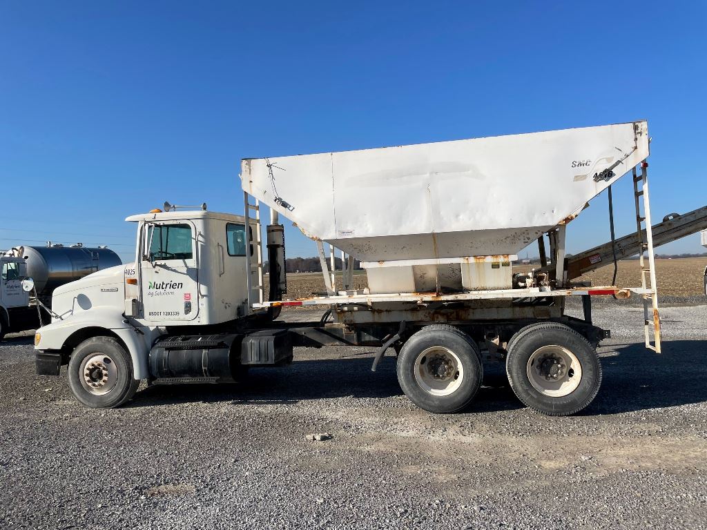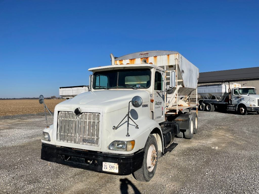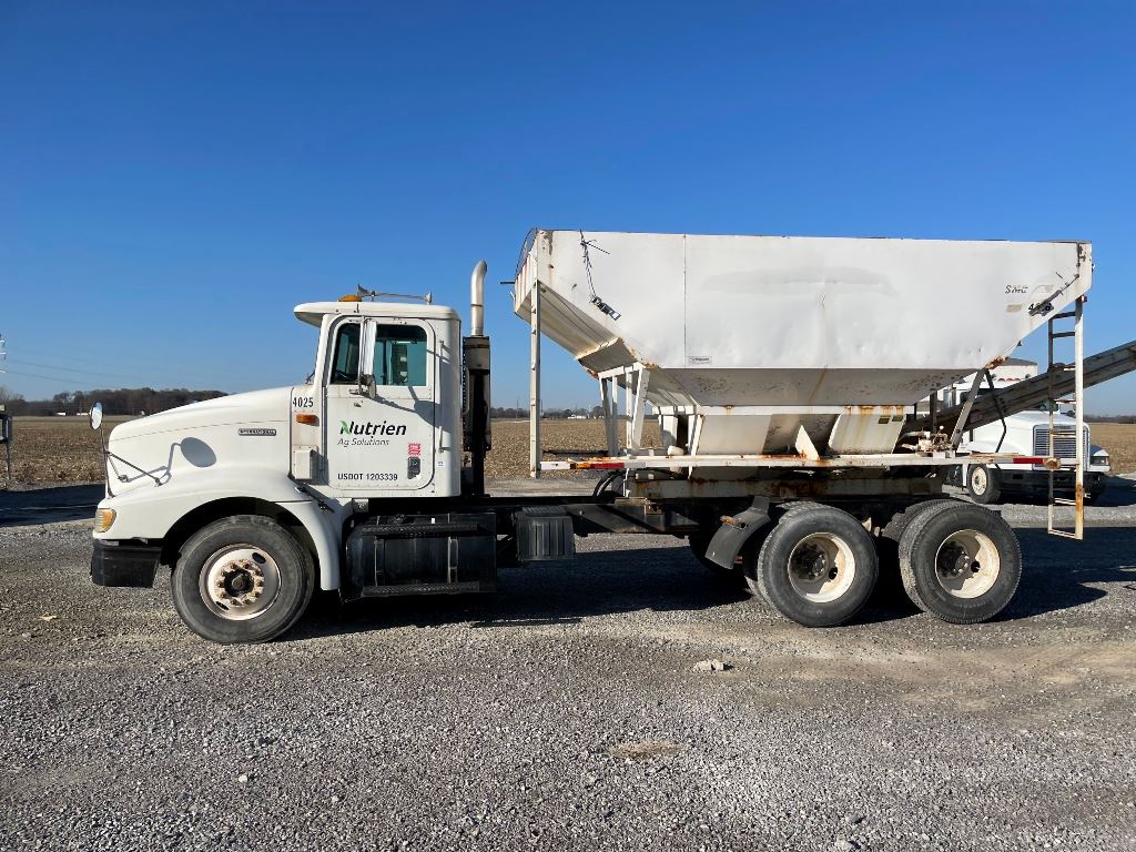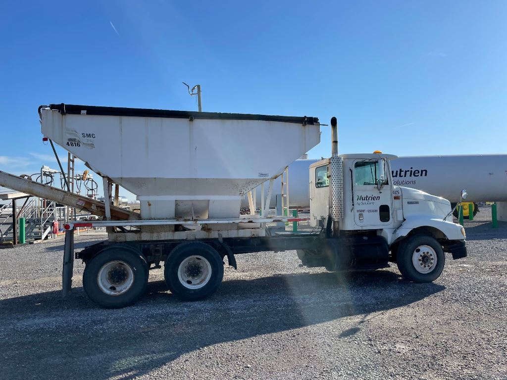 1998 IHC 9100 Dry Tender Truck (GP2201, Unit 111535), Detroit Series 60 diesel engine, Spicer 10 speed transmission, air conditioning, heat, Am/Fm CD radio, cruise control, tandem axle, full screw, spring suspension, Simonsen model 4816 16 ton dry tender box (S/N 2780), rear discharge auger, all hydraulic, 11R22.5 tires, shows 438,779 miles.