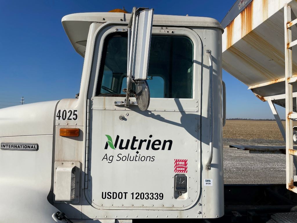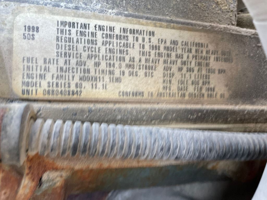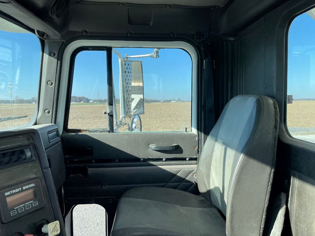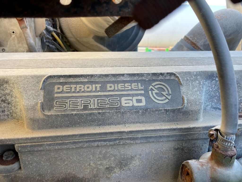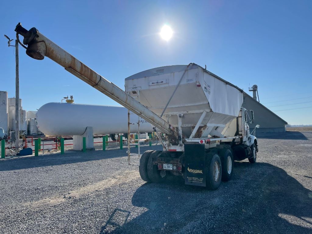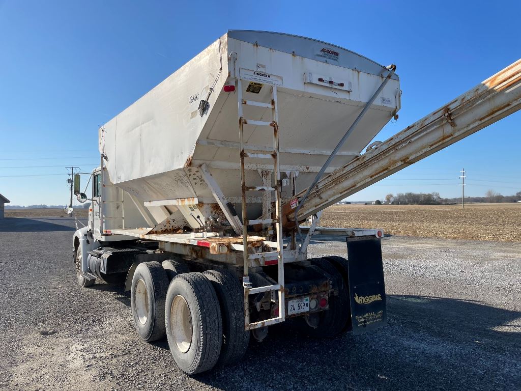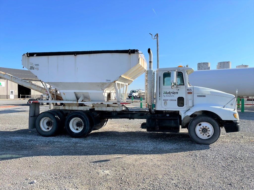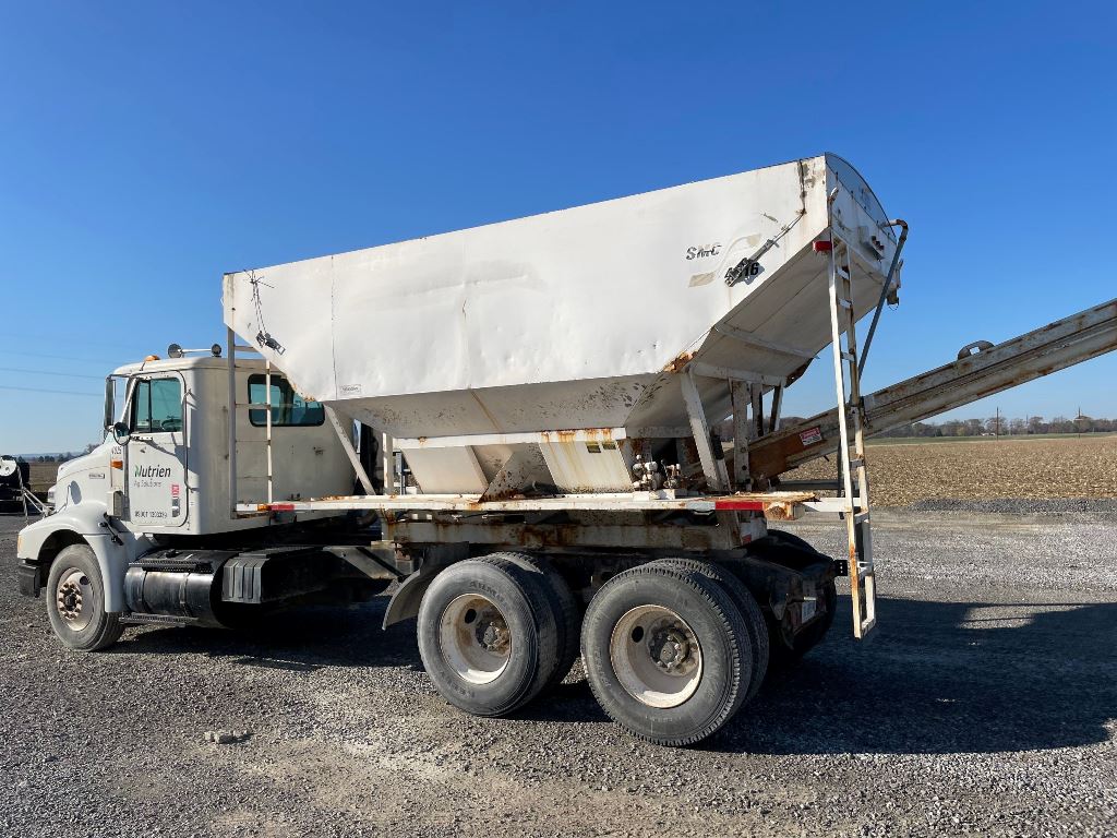 1998 IHC 9100 Dry Tender Truck (GP2201, Unit 111535), Detroit Series 60 diesel engine, Spicer 10 speed transmission, air conditioning, heat, Am/Fm CD radio, cruise control, tandem axle, full screw, spring suspension, Simonsen model 4816 16 ton dry tender box (S/N 2780), rear discharge auger, all hydraulic, 11R22.5 tires, shows 438,779 miles.
