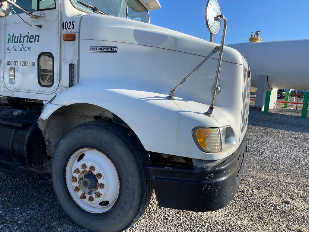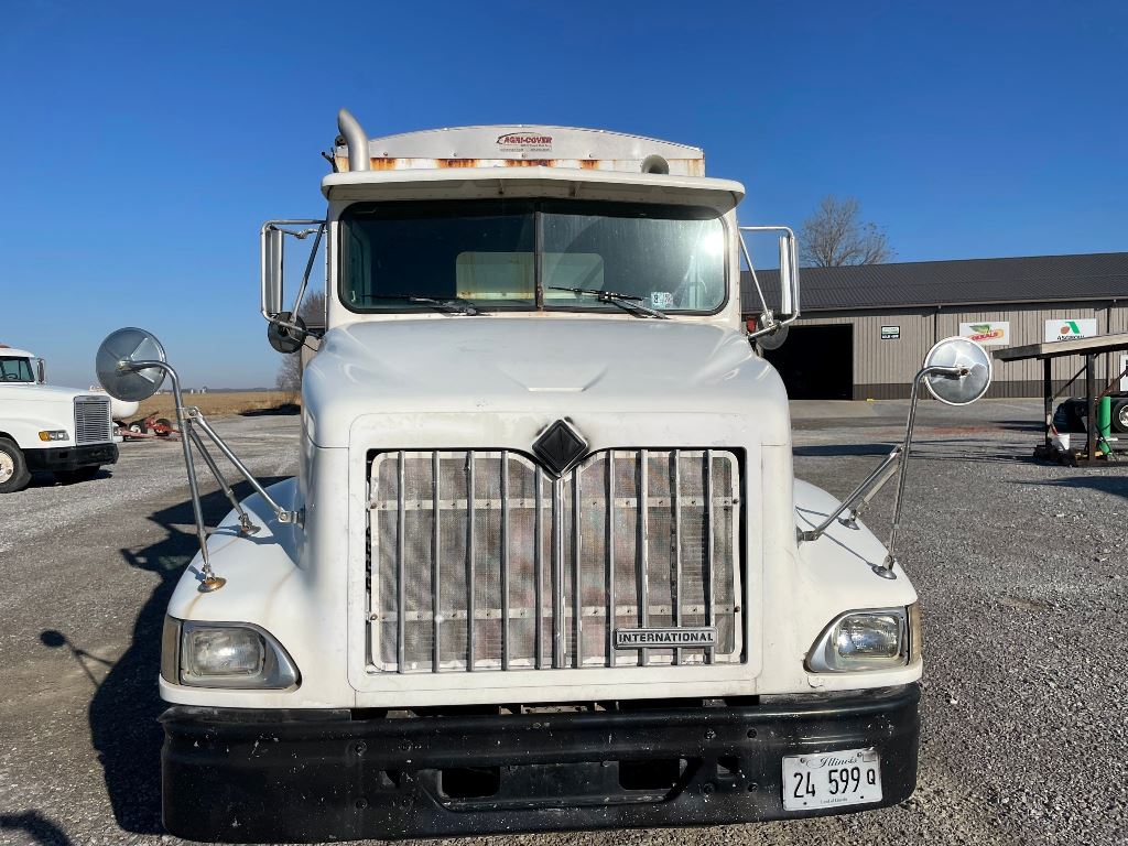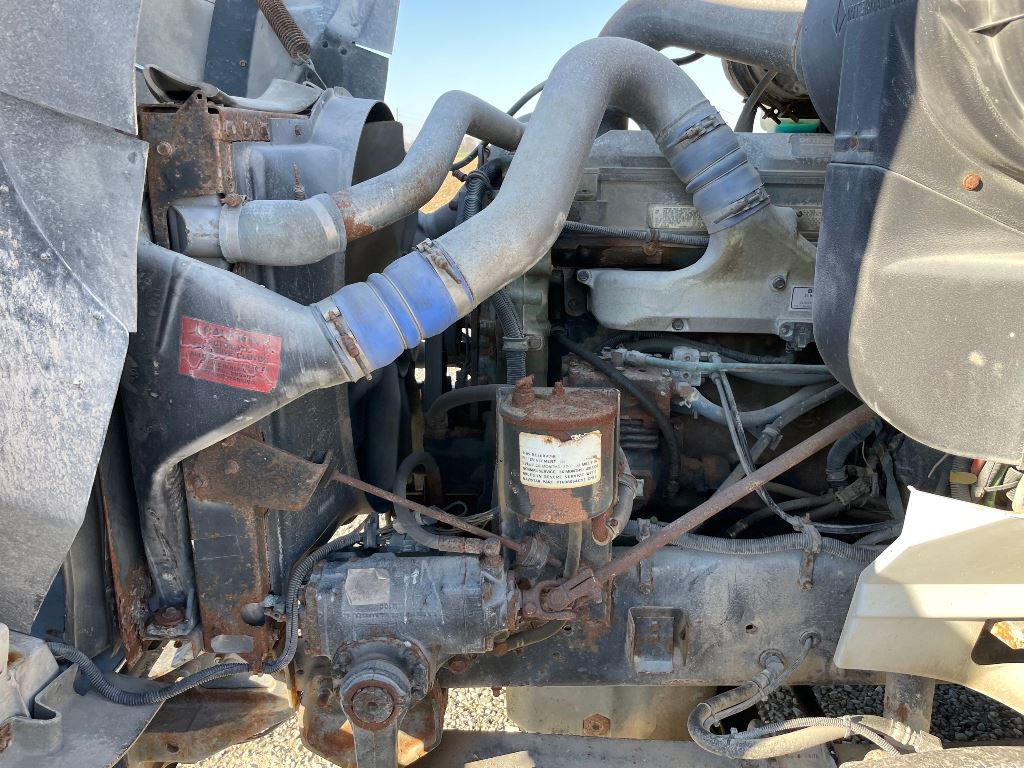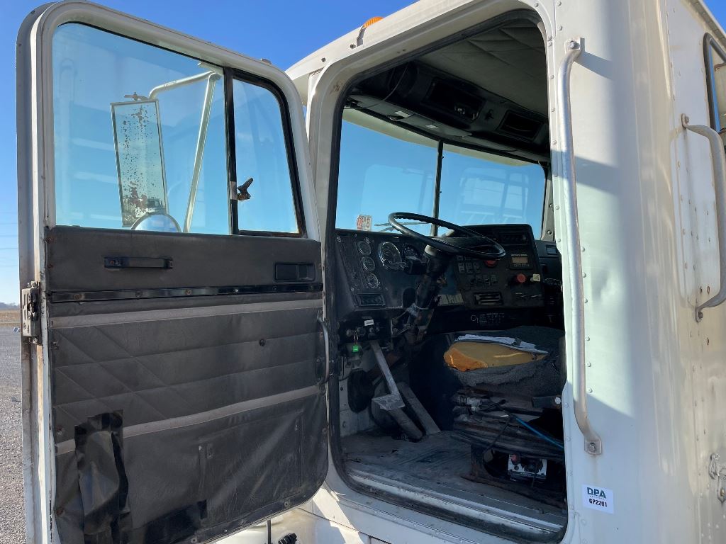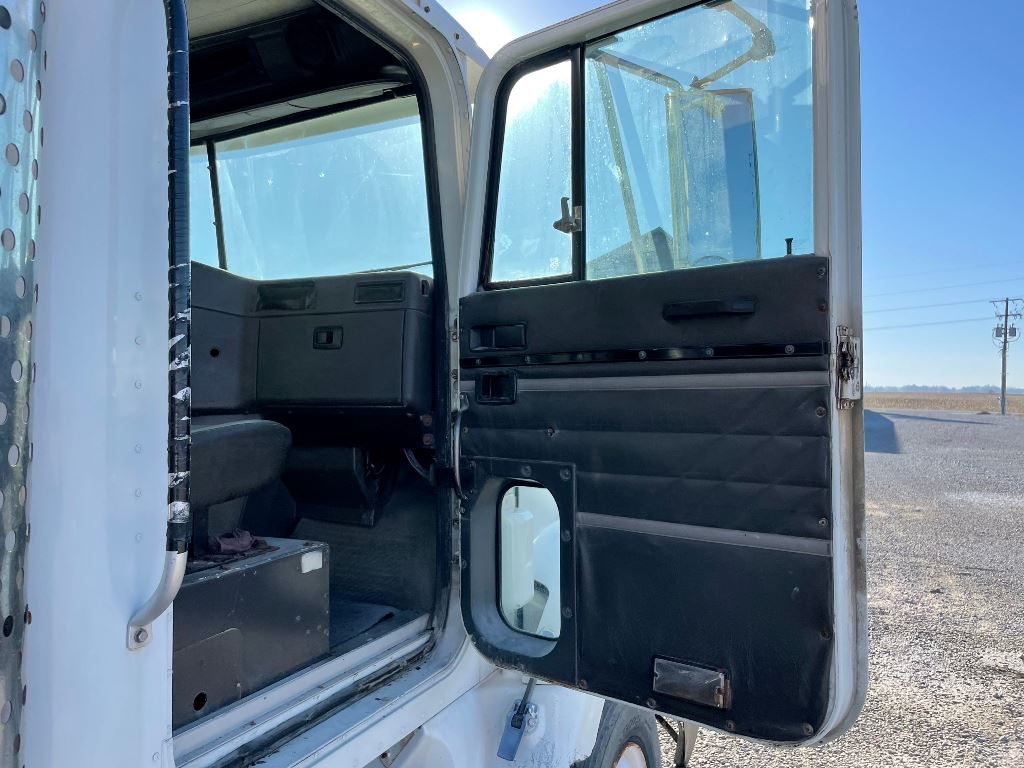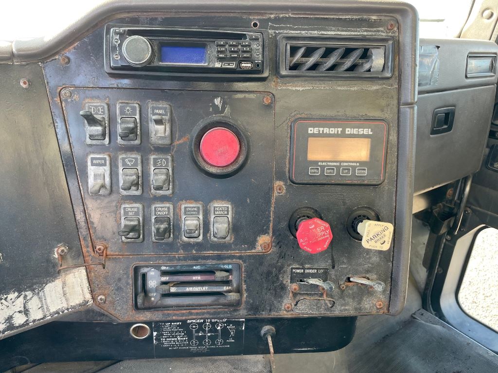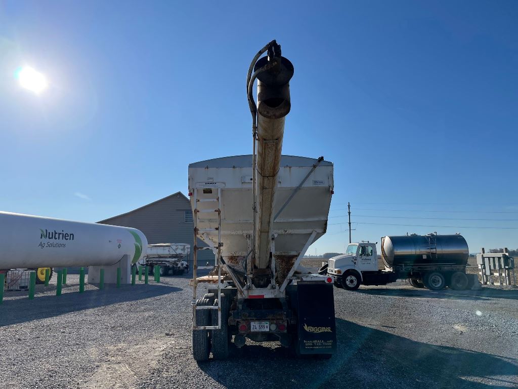 1998 IHC 9100 Dry Tender Truck (GP2201, Unit 111535), Detroit Series 60 diesel engine, Spicer 10 speed transmission, air conditioning, heat, Am/Fm CD radio, cruise control, tandem axle, full screw, spring suspension, Simonsen model 4816 16 ton dry tender box (S/N 2780), rear discharge auger, all hydraulic, 11R22.5 tires, shows 438,779 miles.