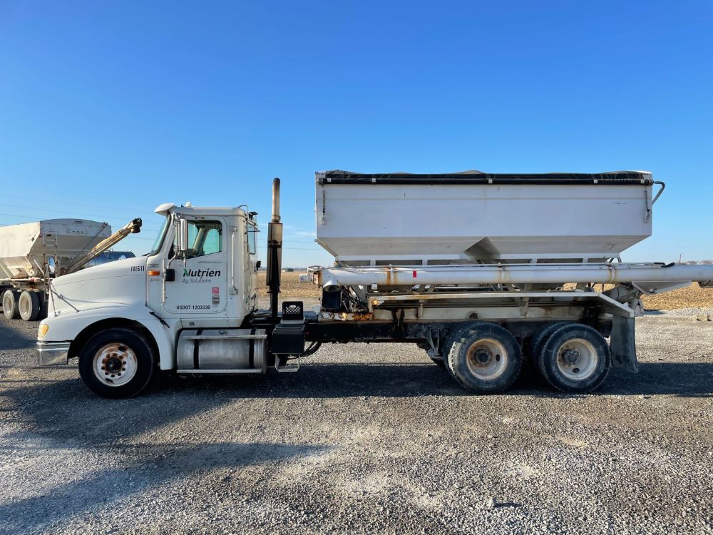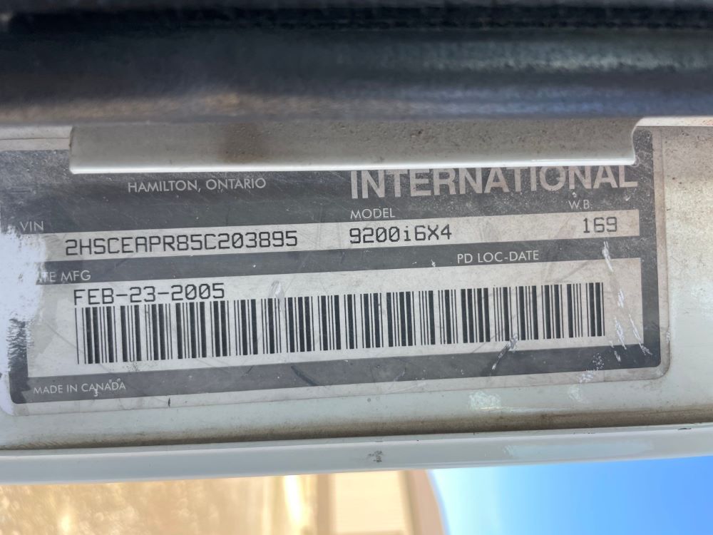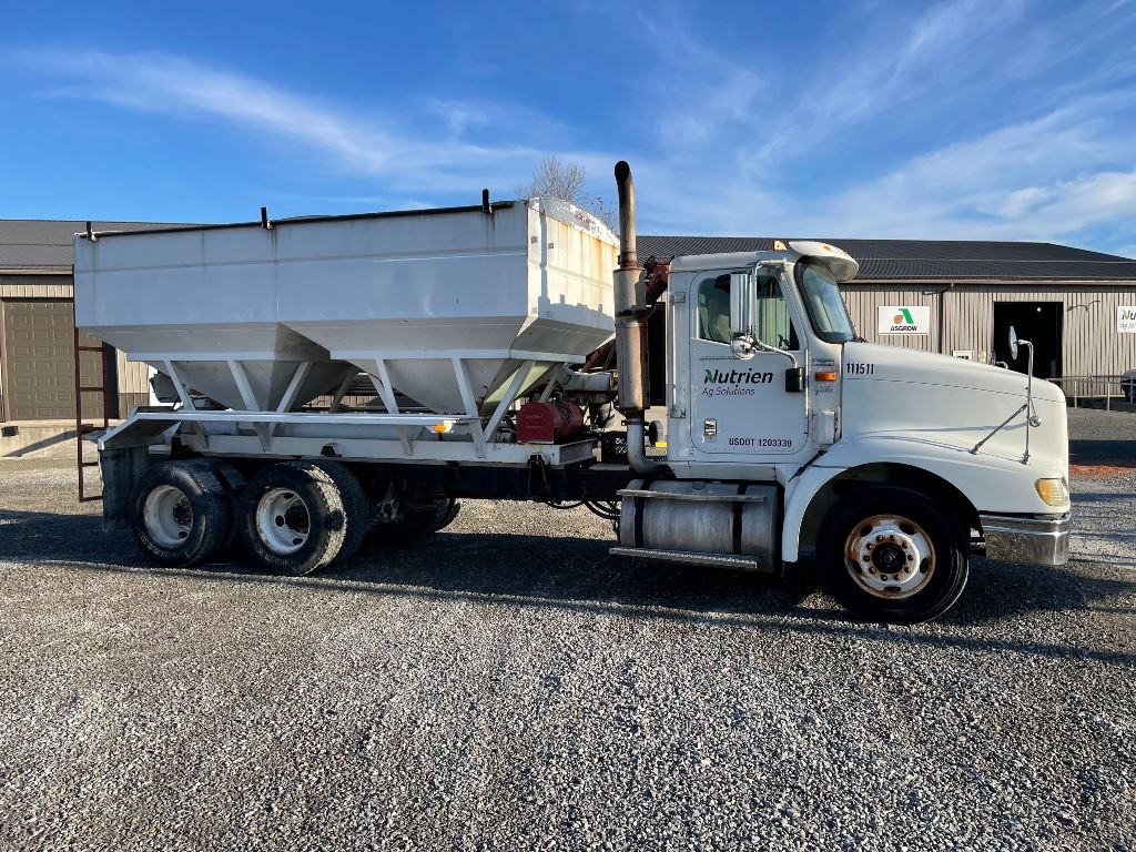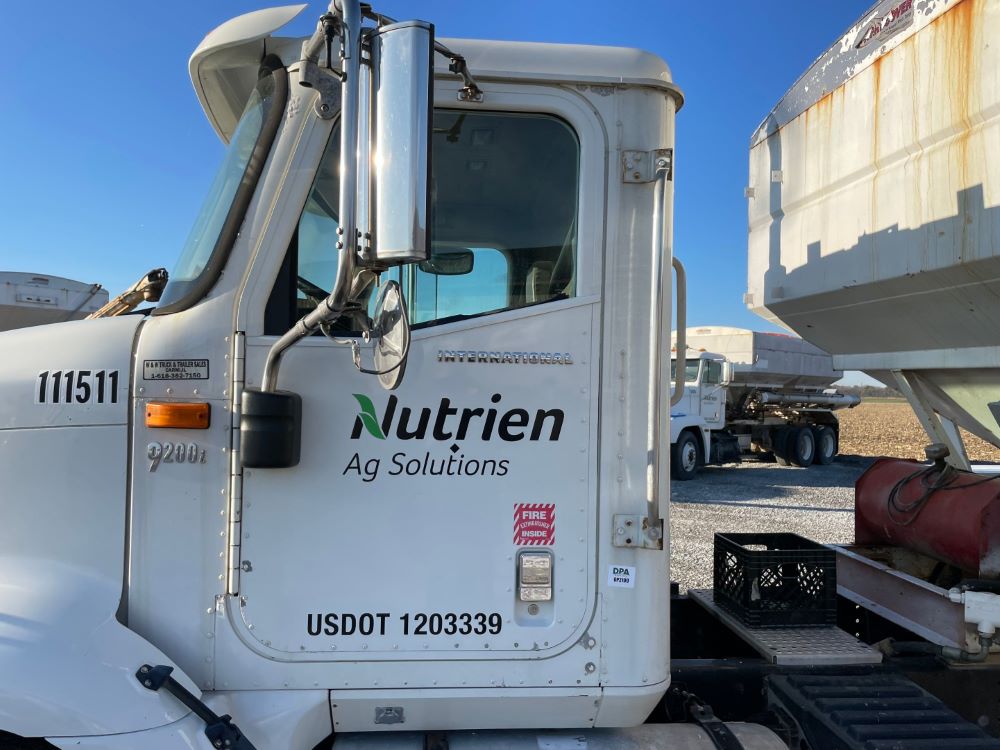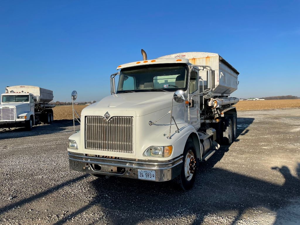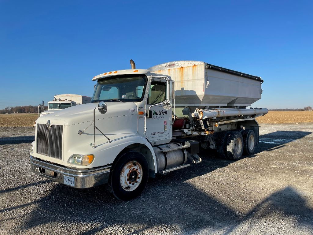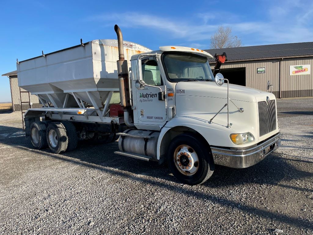 2005 IHC 9200i Dry Tender Truck (GP2199, Unit 111511), Cummins ISX 435ST diesel engine, Eaton Fuller 10 speed transmission, air conditioning, heat, Am/Fm CD radio, cruise control, engine brake, power windows, tandem axle, full screw, air ride suspension, 16 ton dry tender box, side discharge auger, all hydraulic, roll over tarp, 275/80R22.5 tires, shows 837,806 miles.