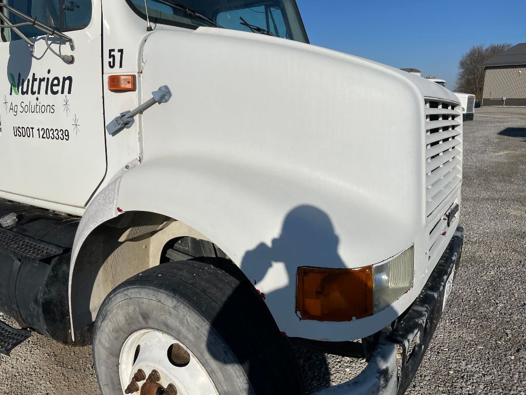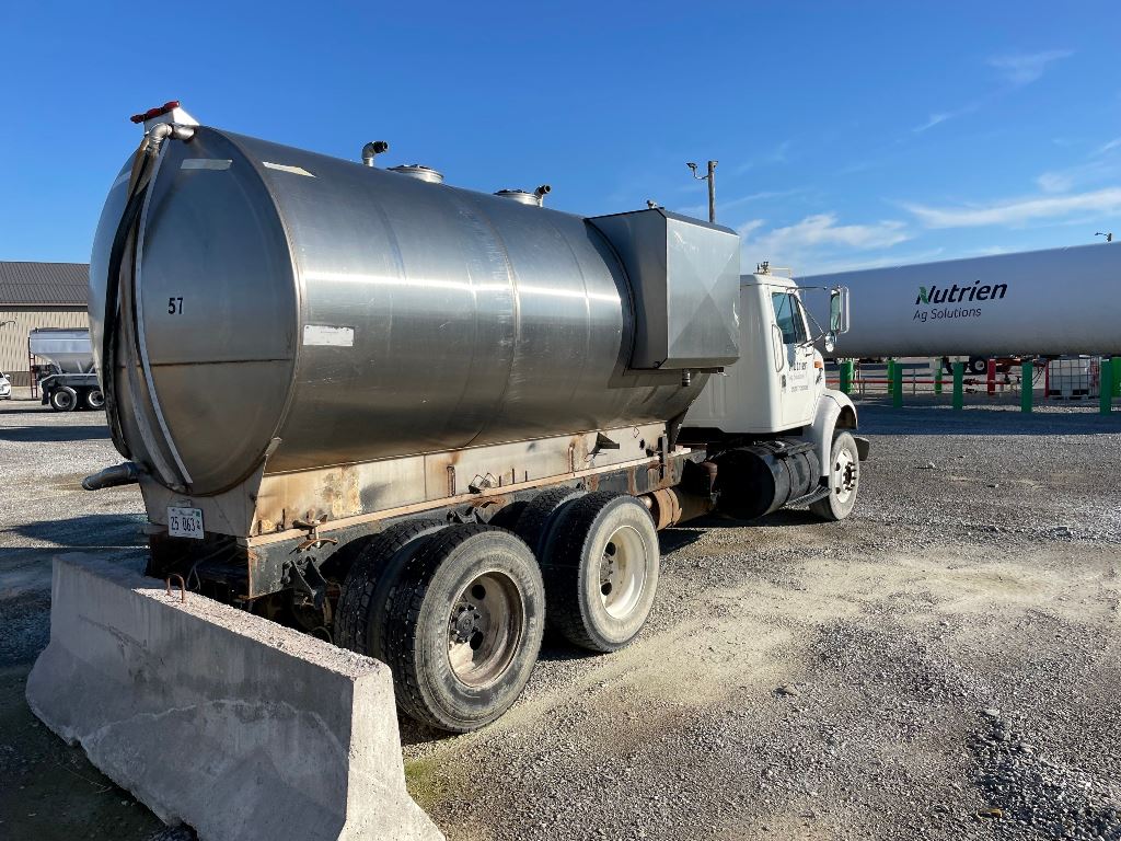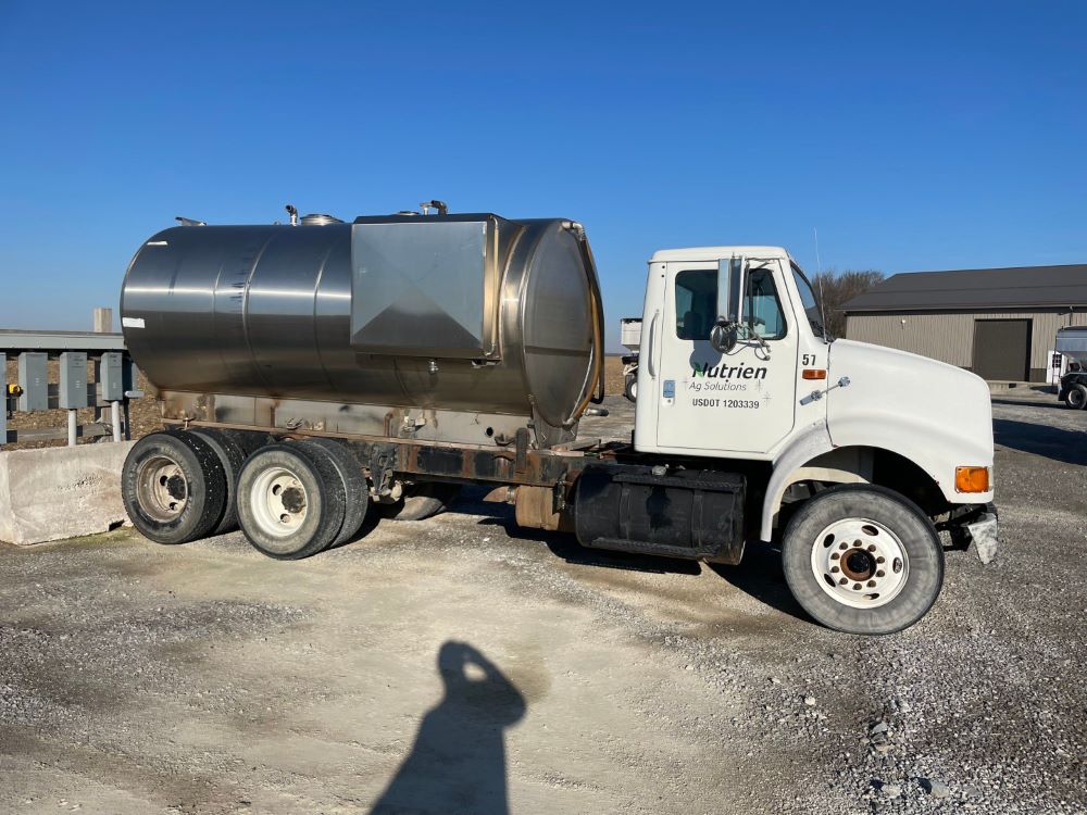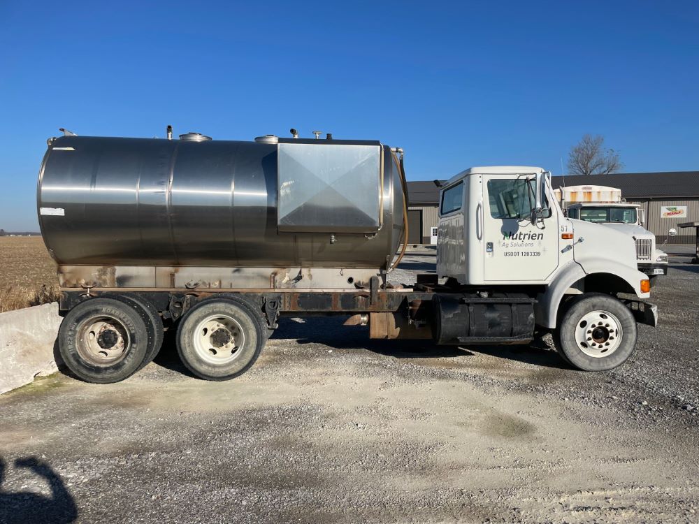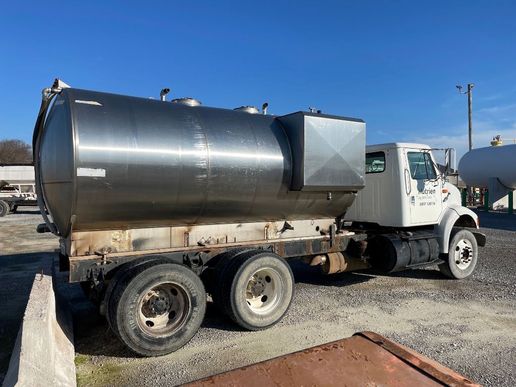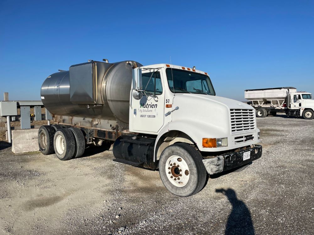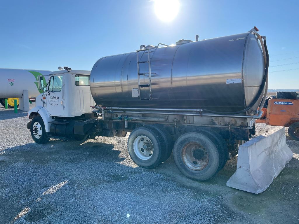 2000 IHC 8100 Liquid Nurse Truck (GP2203, Unit 111575), diesel engine, Rockwell 10 speed transmission, air conditioning, heat, Am/Fm cassette radio, cruise control, power windows, tandem axle, full screw, spring suspension, Precision 3200 gallon 2 compartment stainless steel liquid nurse tank, side stainless steel fresh water tank, 295/75R22.5 tires, shows 337,747 miles.