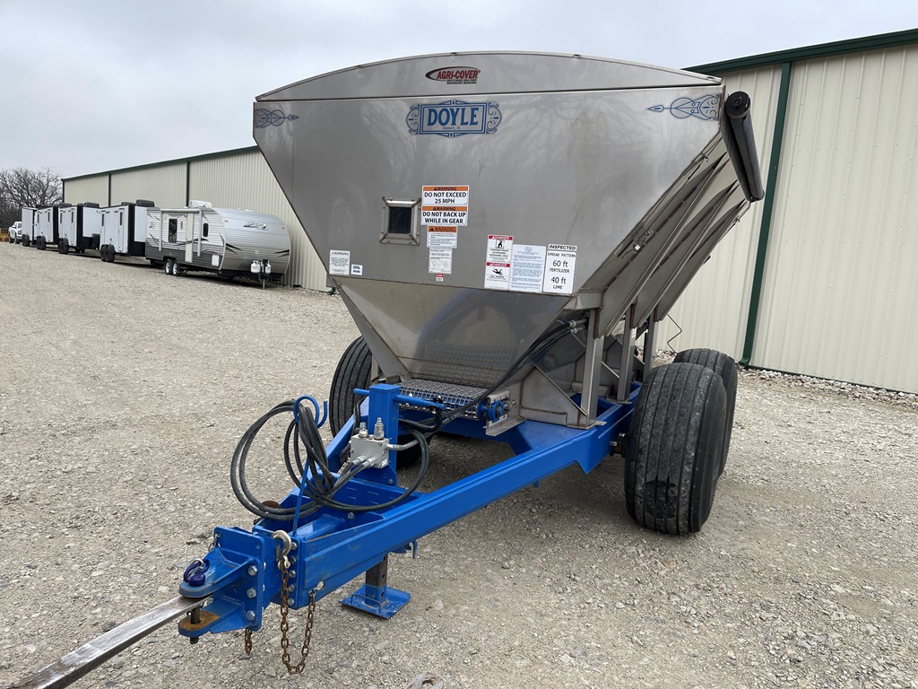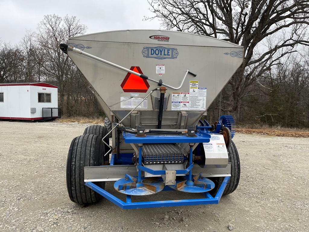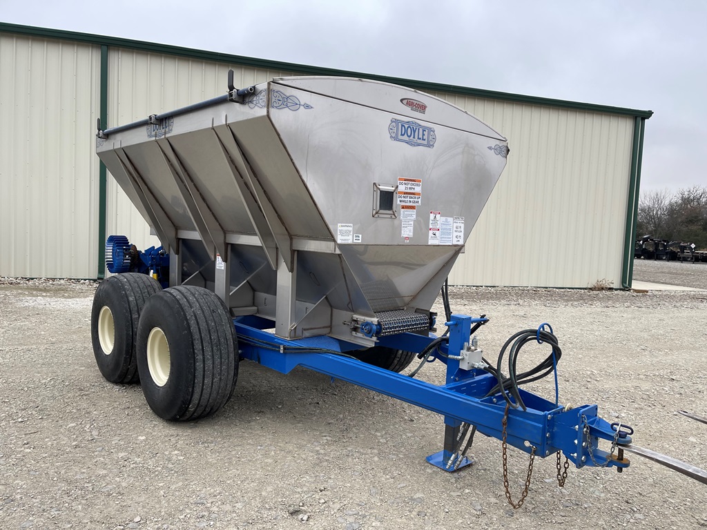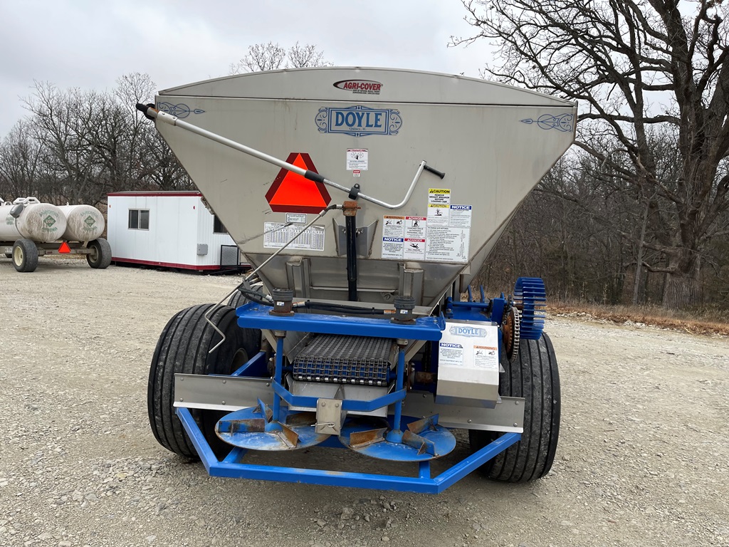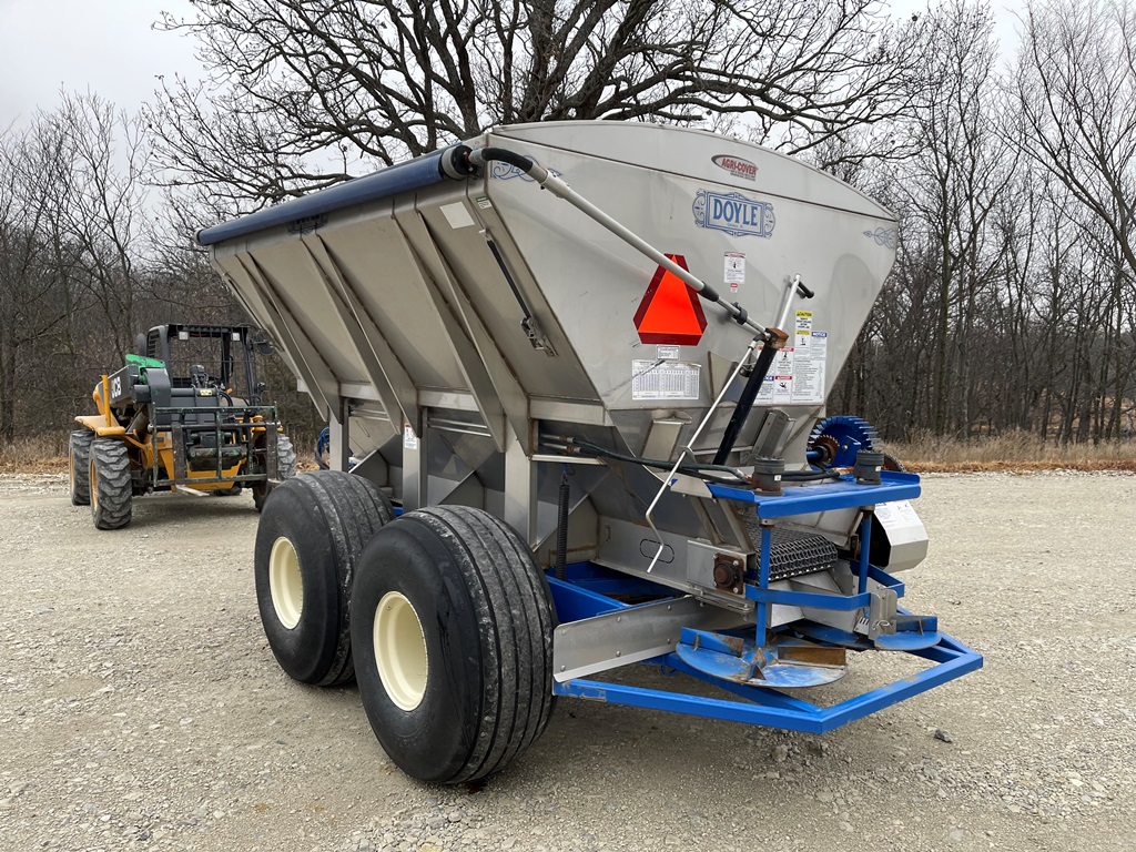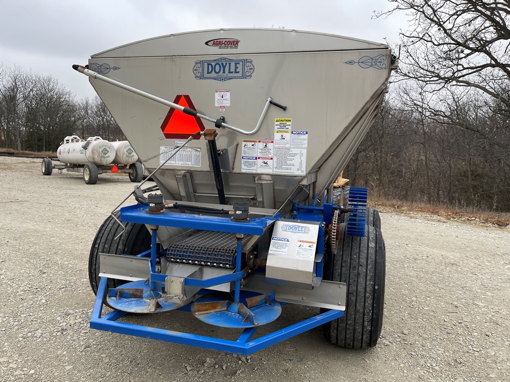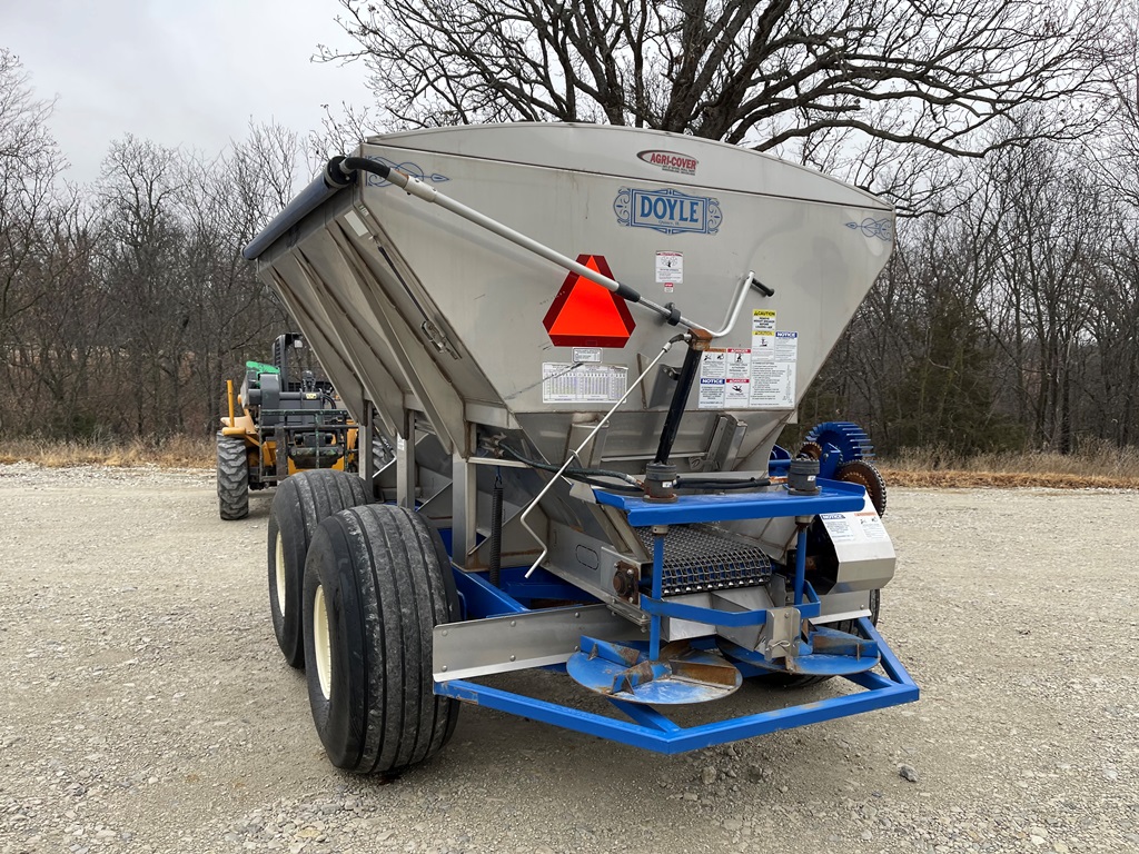Doyle 8 Ton Combo Dry Spreader (NP3389), Doyle 8 ton combo stainless steel pull type dry spreader, dual spinners, hydraulic, Agri-Cover manual roll tarp, 60' fertilizer spread pattern, 40' lime spreader pattern, tandem axle, 19L-16.1SL flotation tires, jack stand.