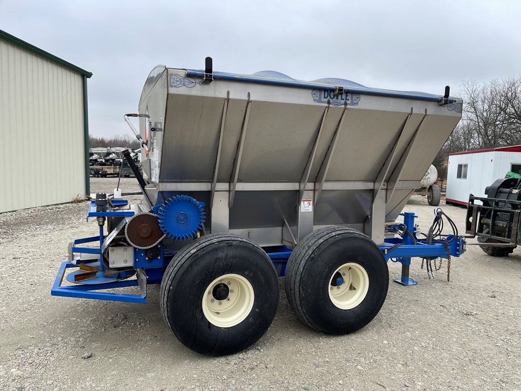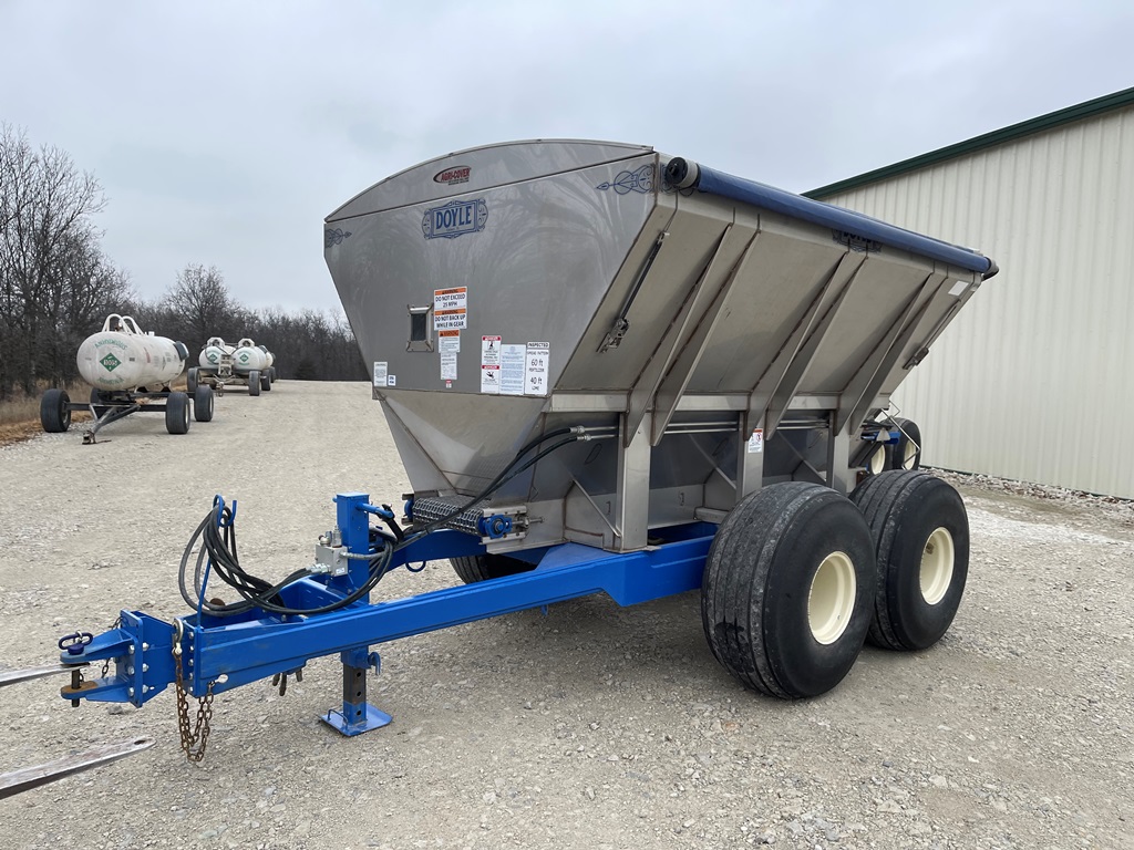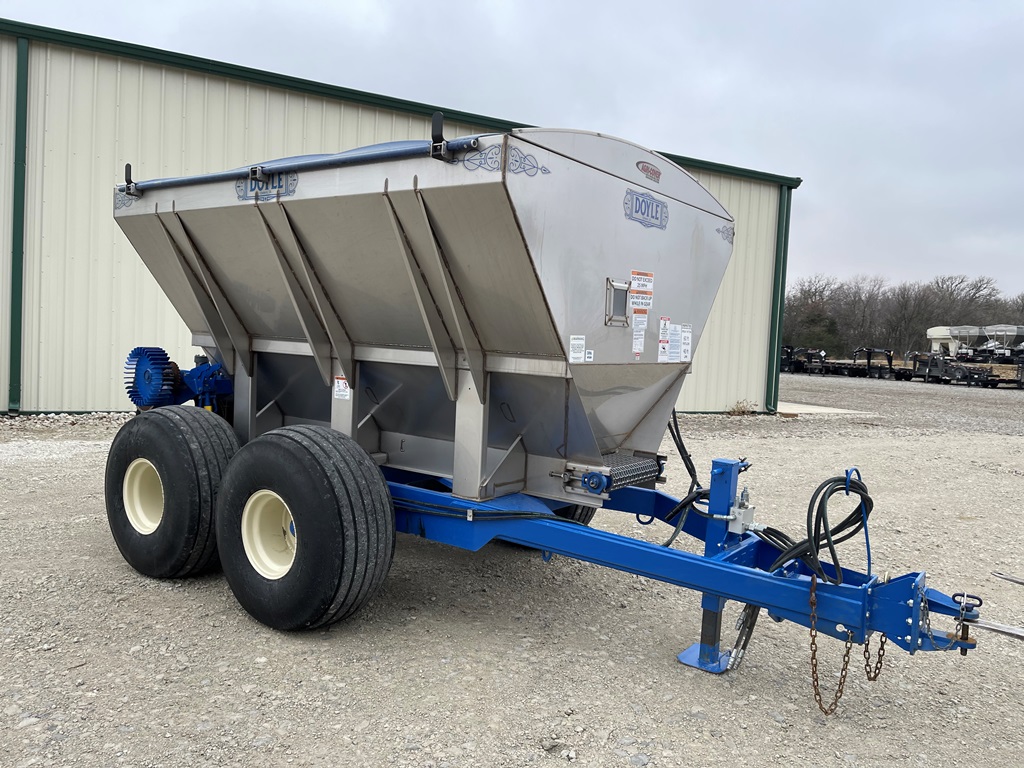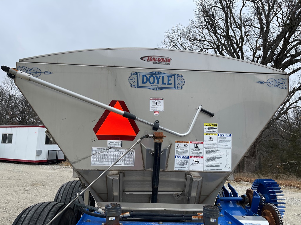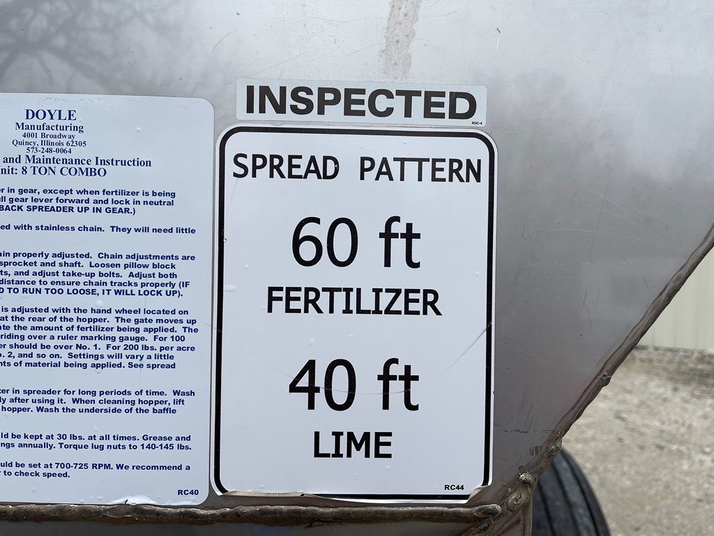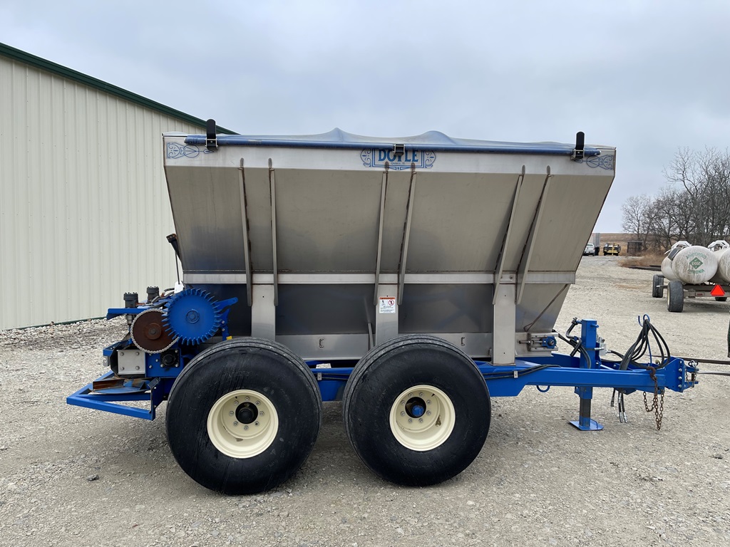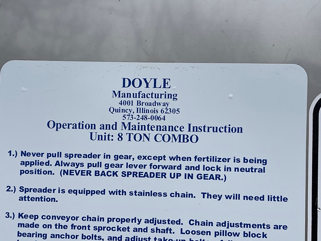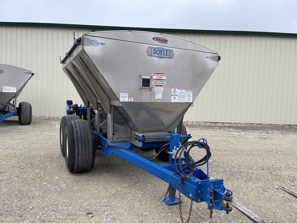 Doyle 8 Ton Combo Dry Spreader (NP3389), Doyle 8 ton combo stainless steel pull type dry spreader, dual spinners, hydraulic, Agri-Cover manual roll tarp, 60' fertilizer spread pattern, 40' lime spreader pattern, tandem axle, 19L-16.1SL flotation tires, jack stand.