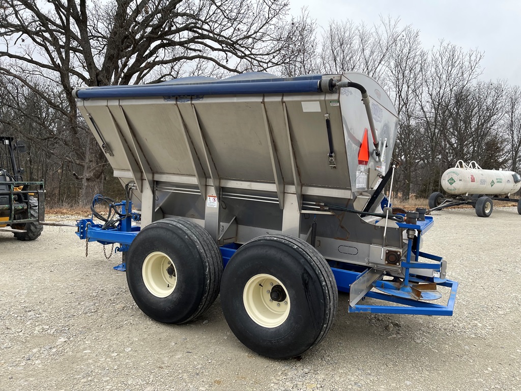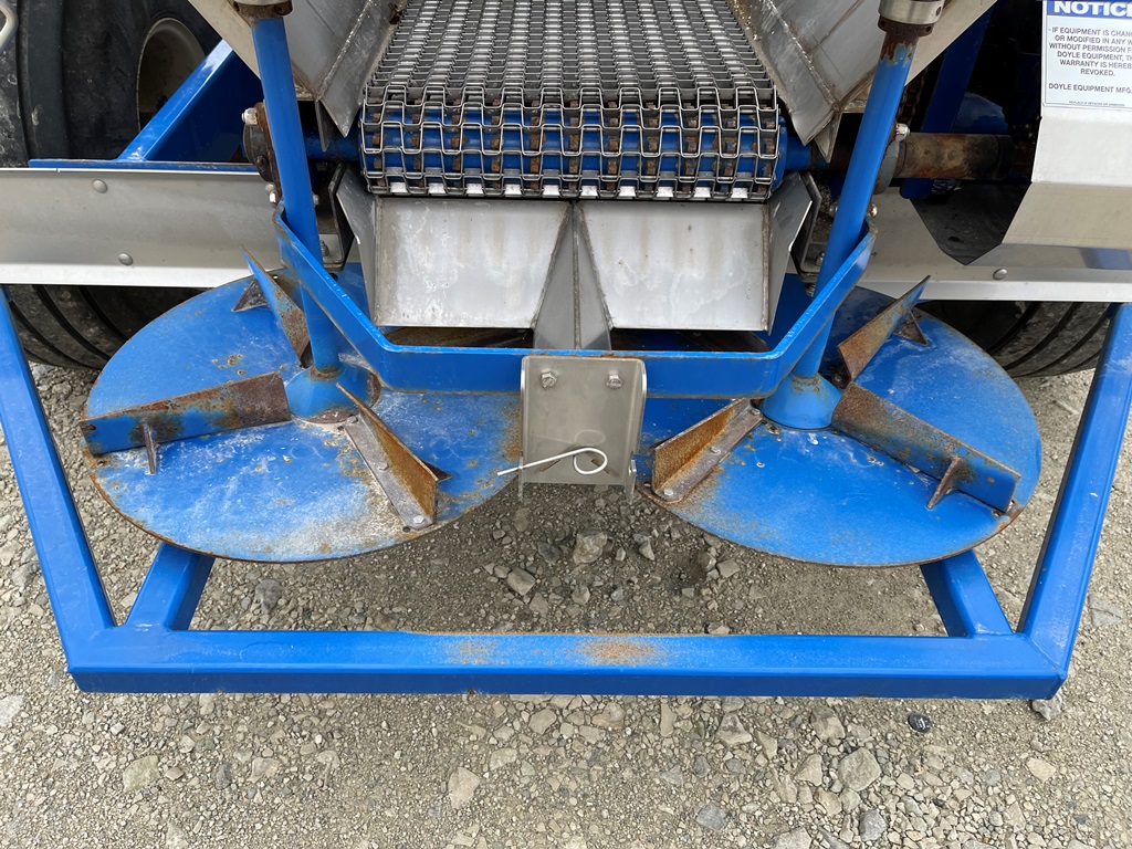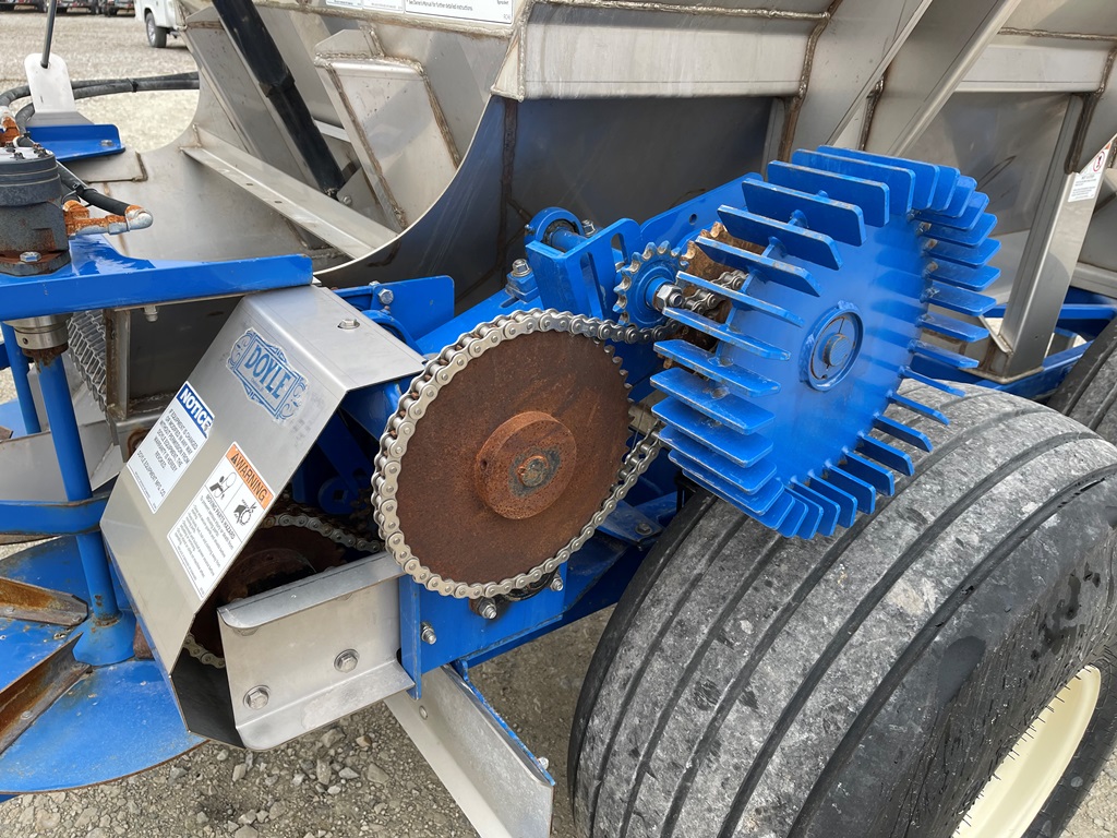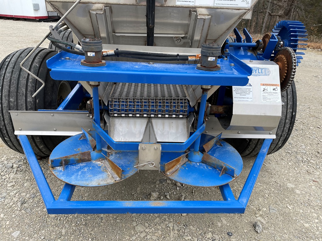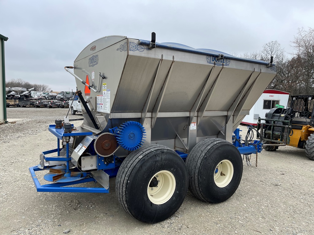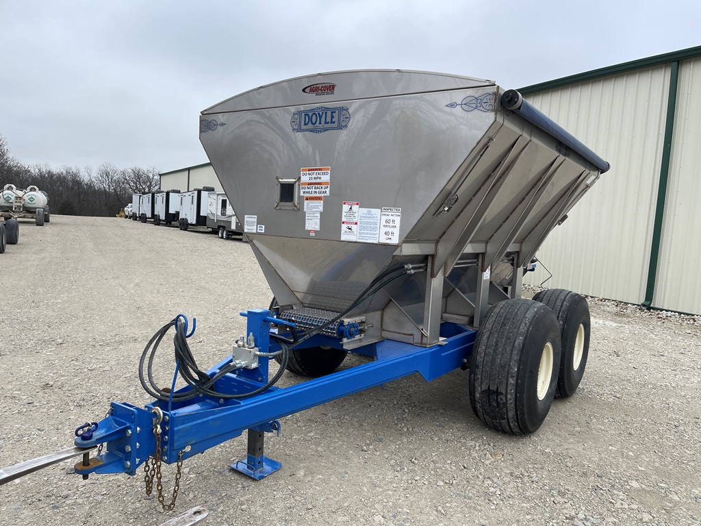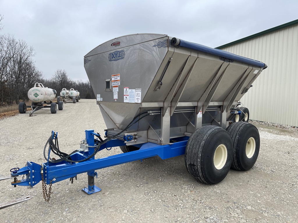 Doyle 8 Ton Combo Dry Spreader (NP3389), Doyle 8 ton combo stainless steel pull type dry spreader, dual spinners, hydraulic, Agri-Cover manual roll tarp, 60' fertilizer spread pattern, 40' lime spreader pattern, tandem axle, 19L-16.1SL flotation tires, jack stand.
