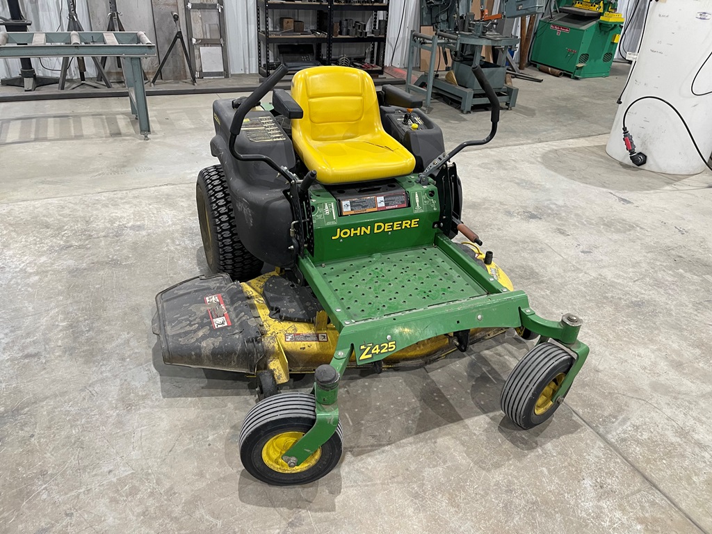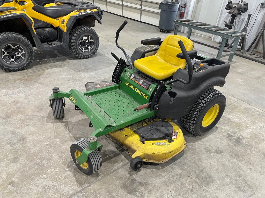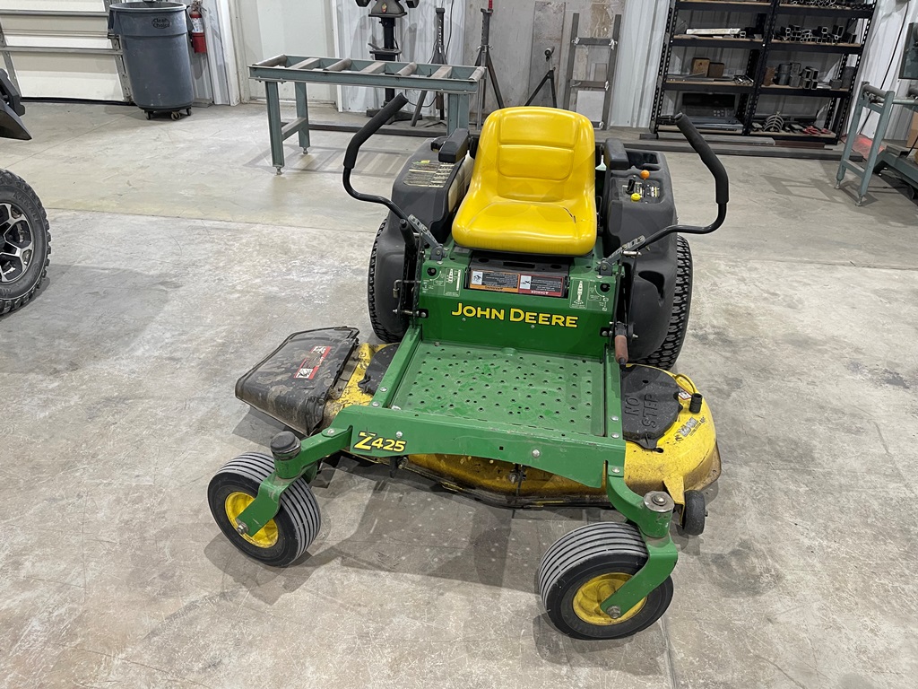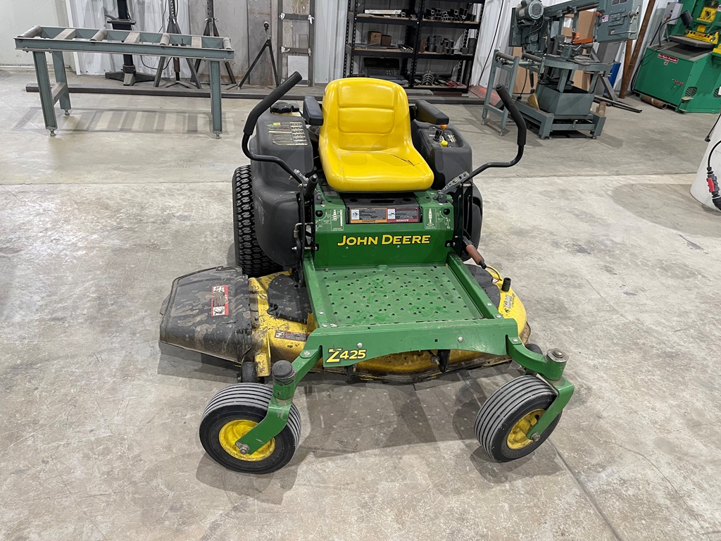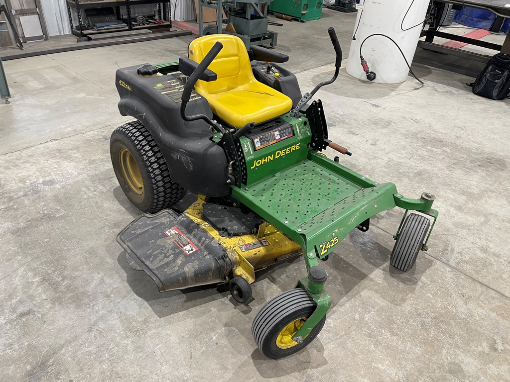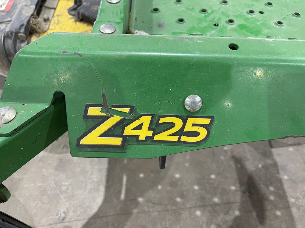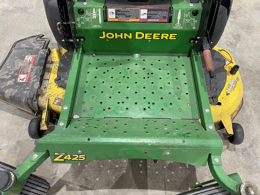 John Deere Z425 EZtrak Zero Turn Mower (NP3378), gas motor, EDGE 48" cutting system, single fuel tank, 22x9.50-10 rear tires, shows 424 hours.