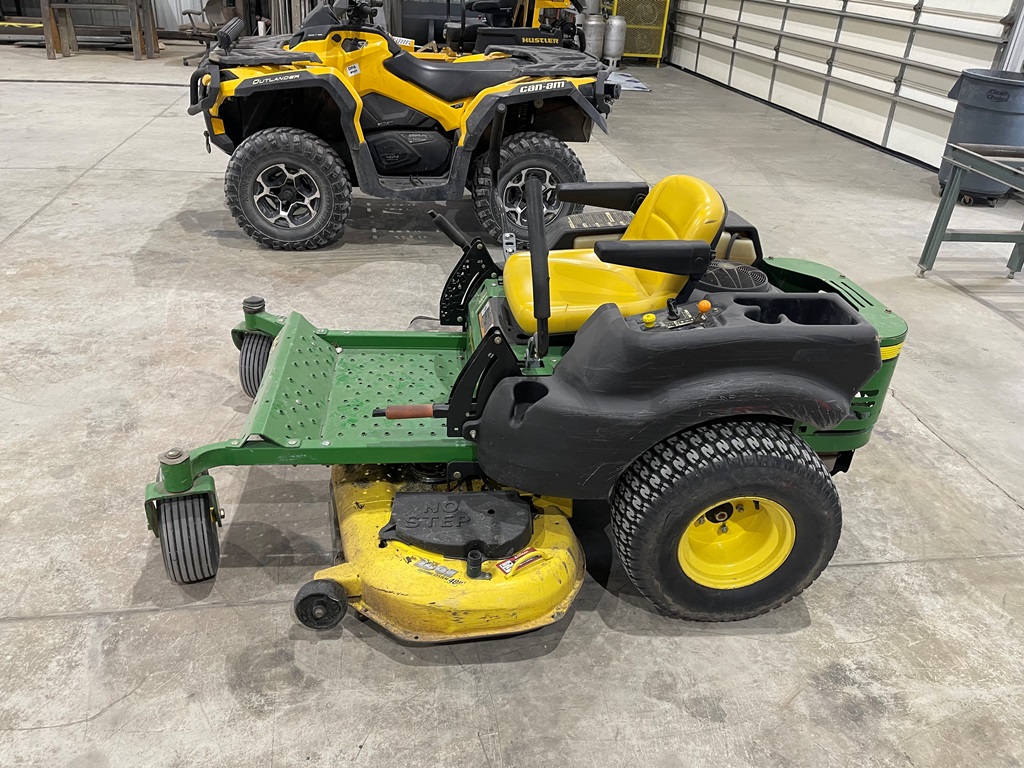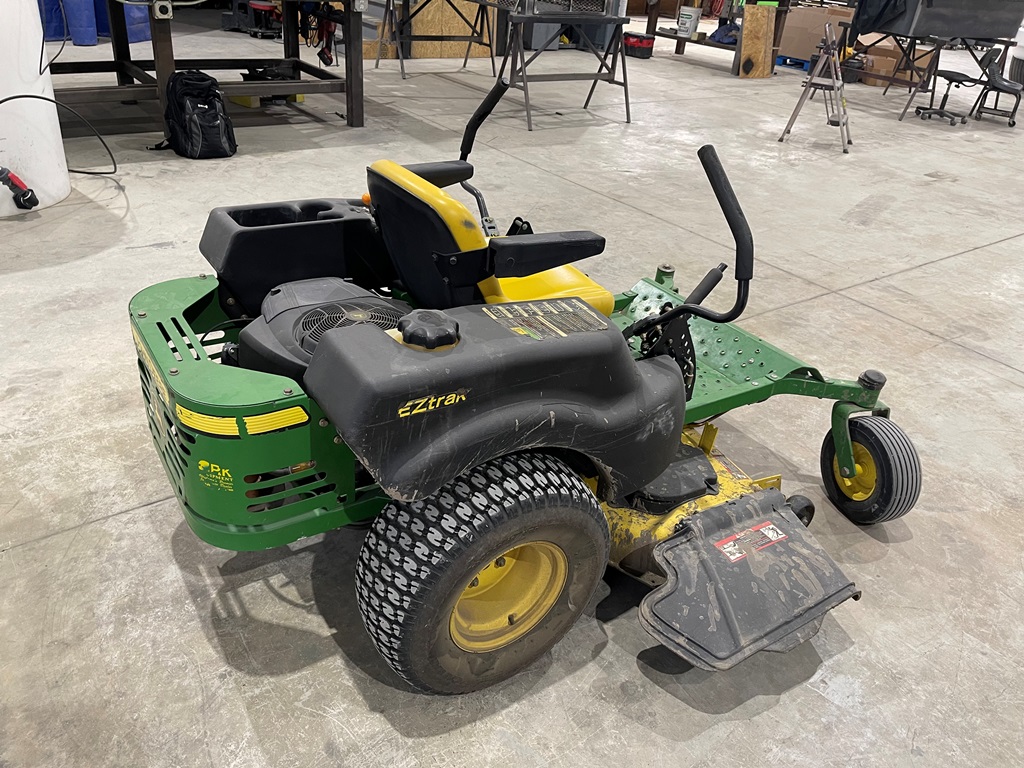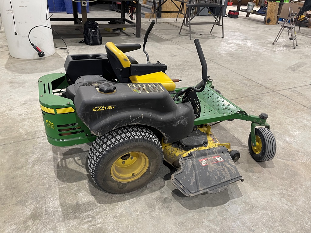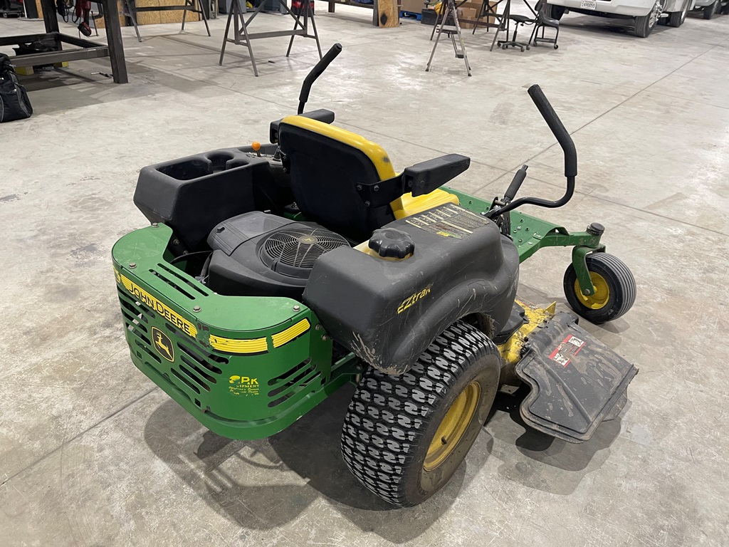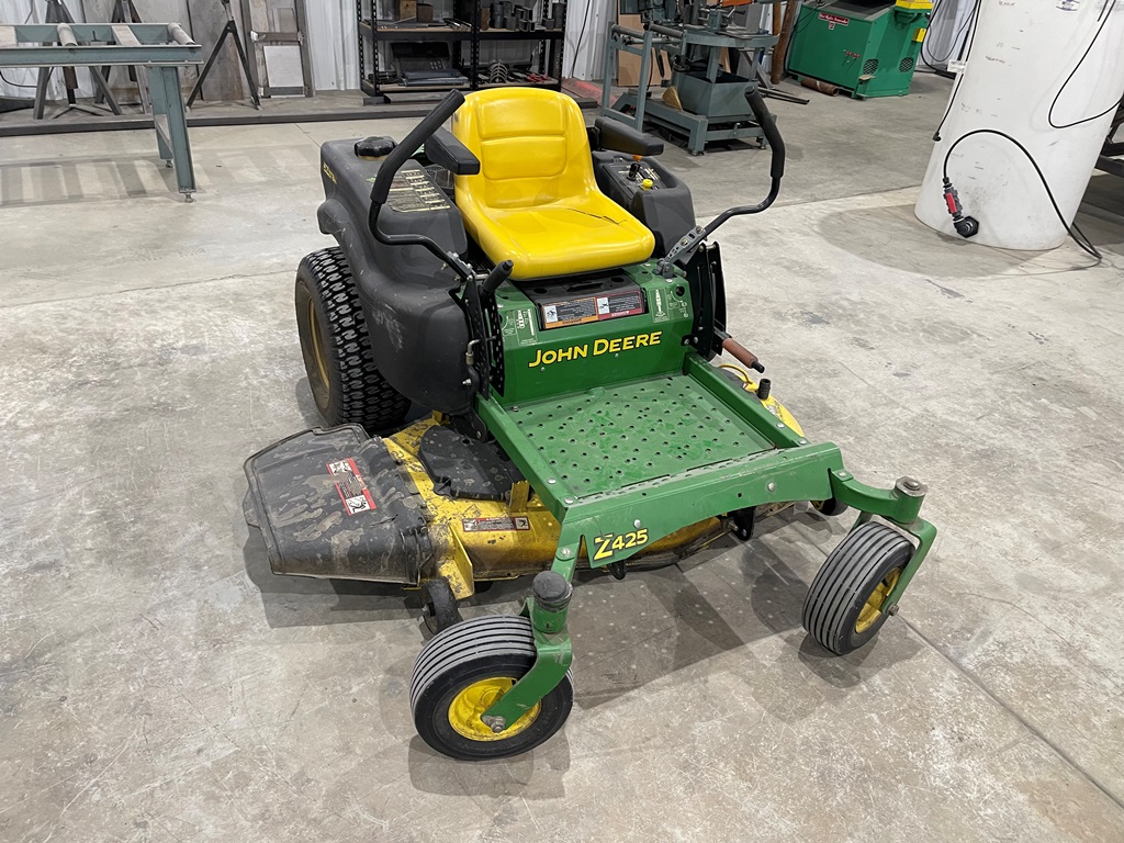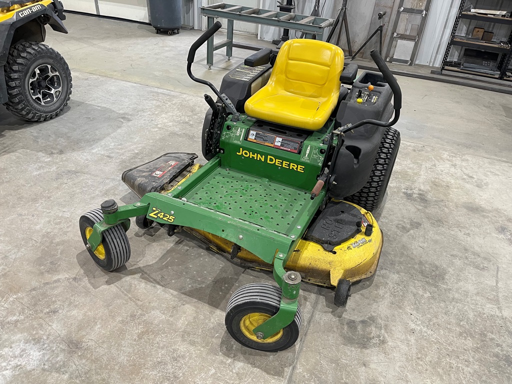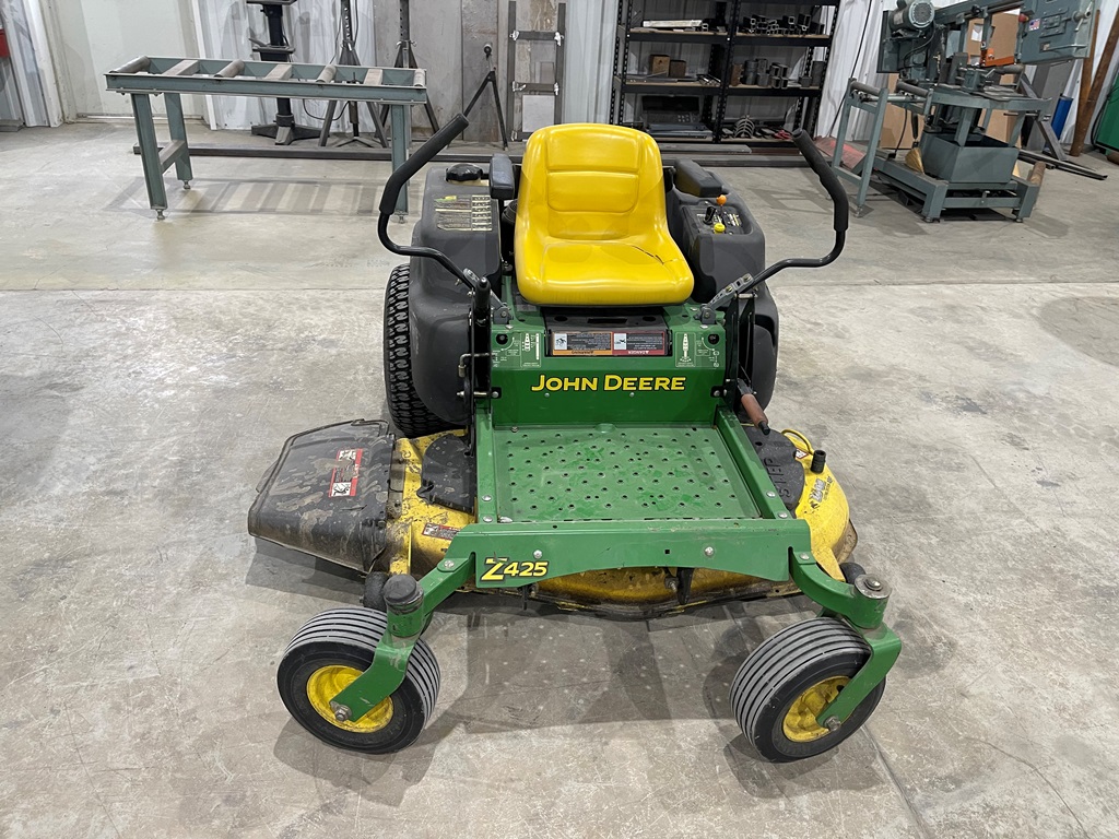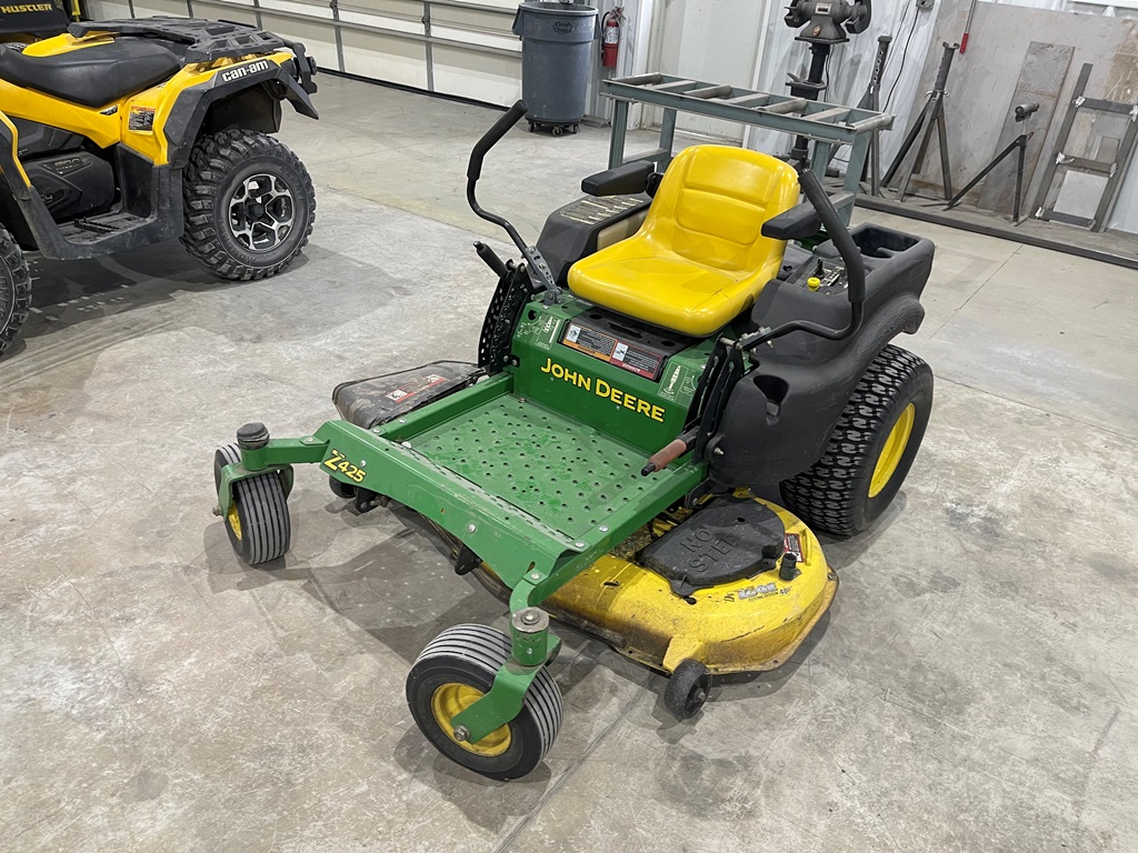 John Deere Z425 EZtrak Zero Turn Mower (NP3378), gas motor, EDGE 48" cutting system, single fuel tank, 22x9.50-10 rear tires, shows 424 hours.