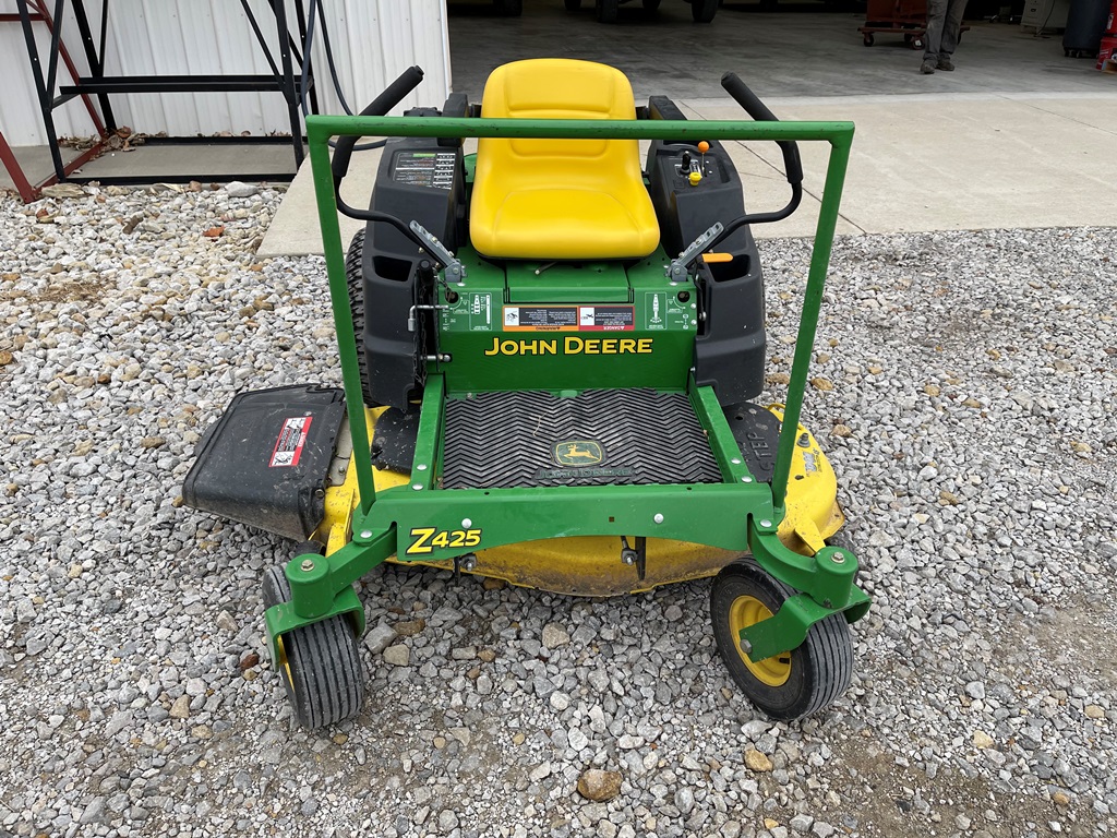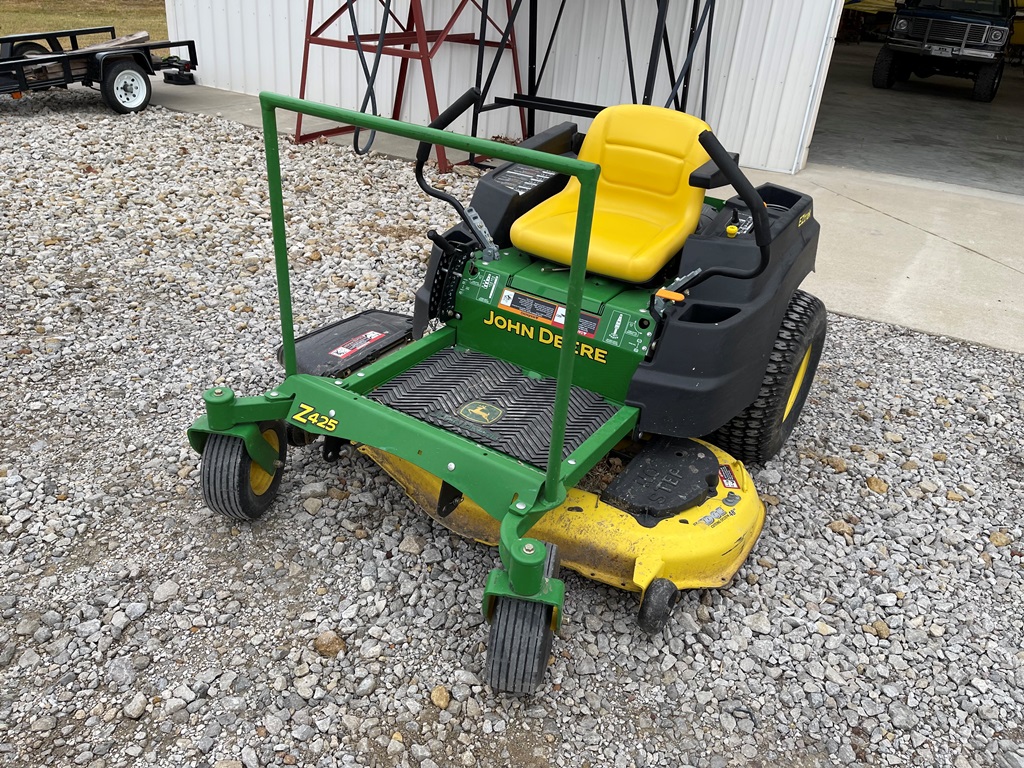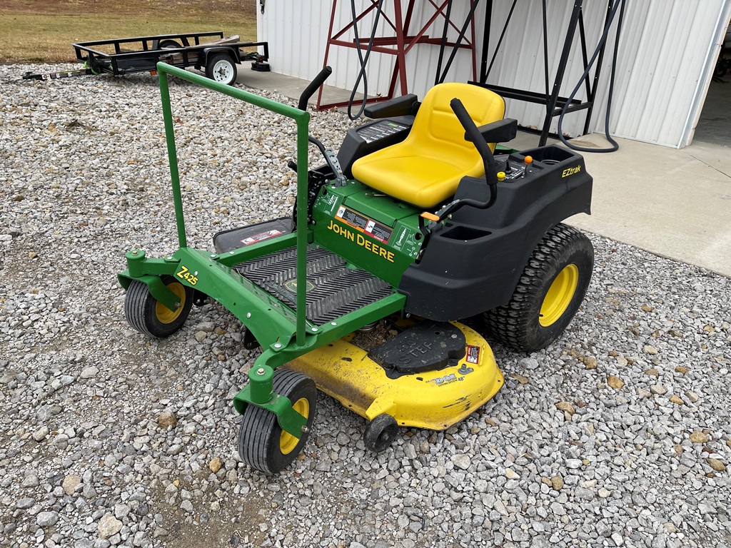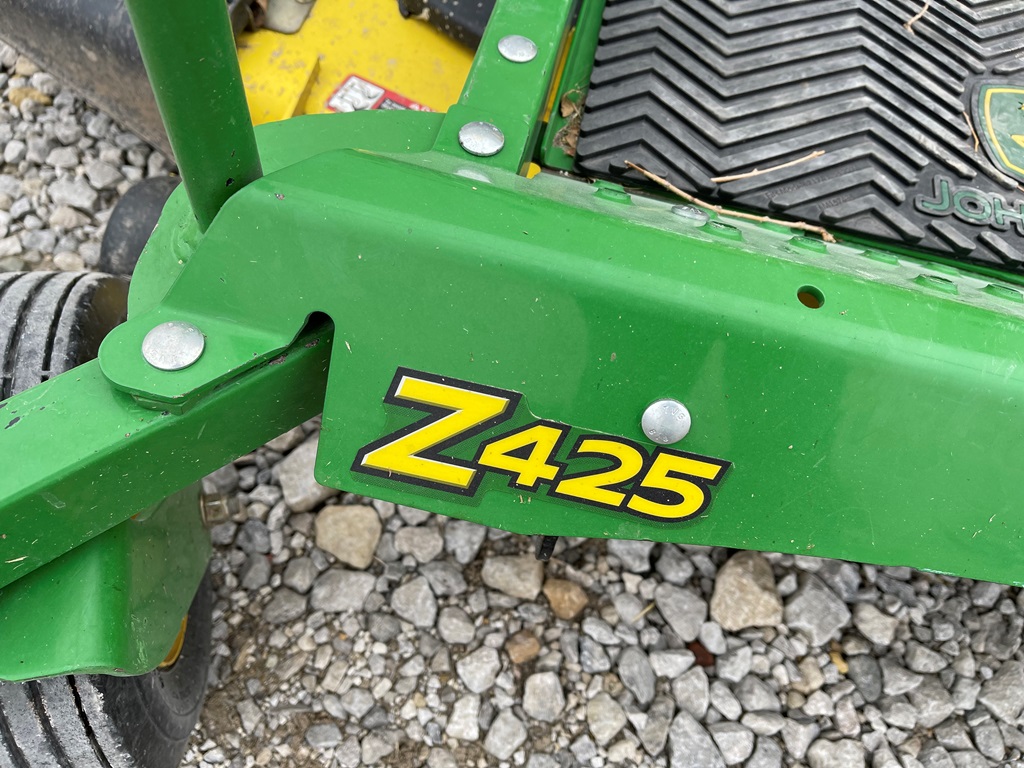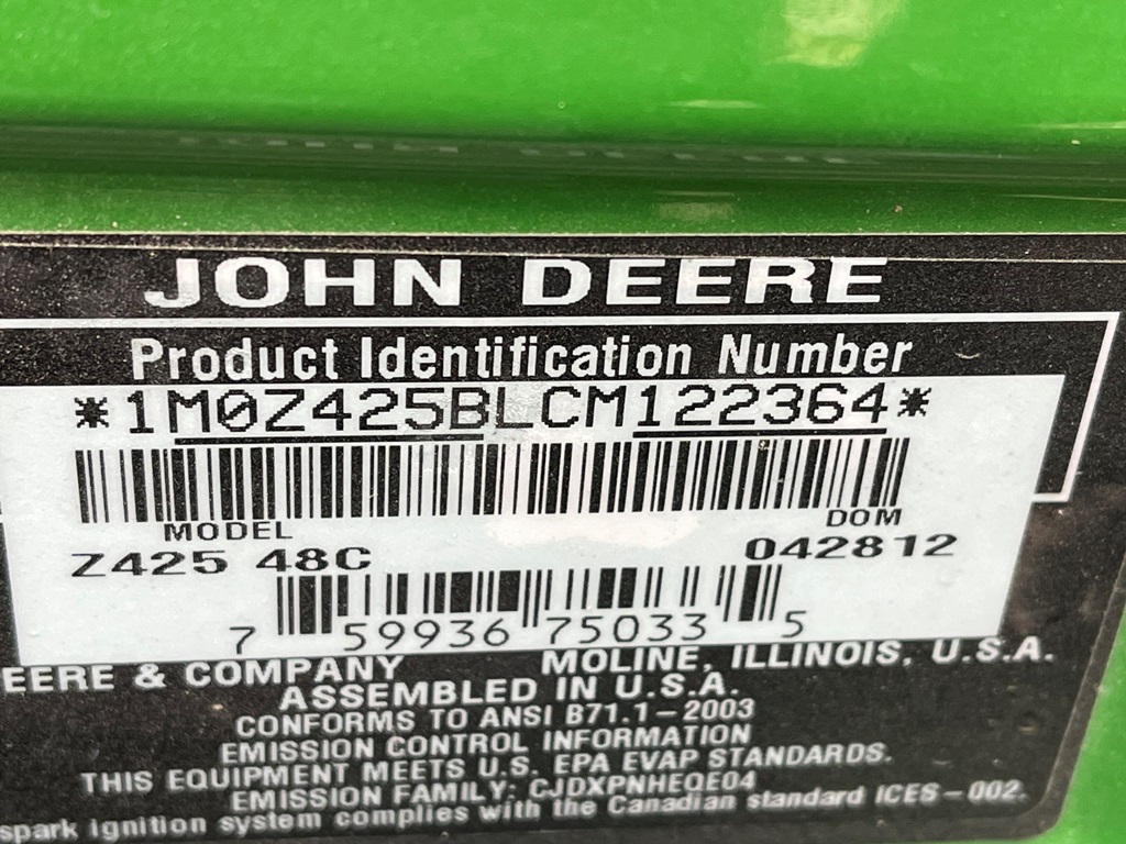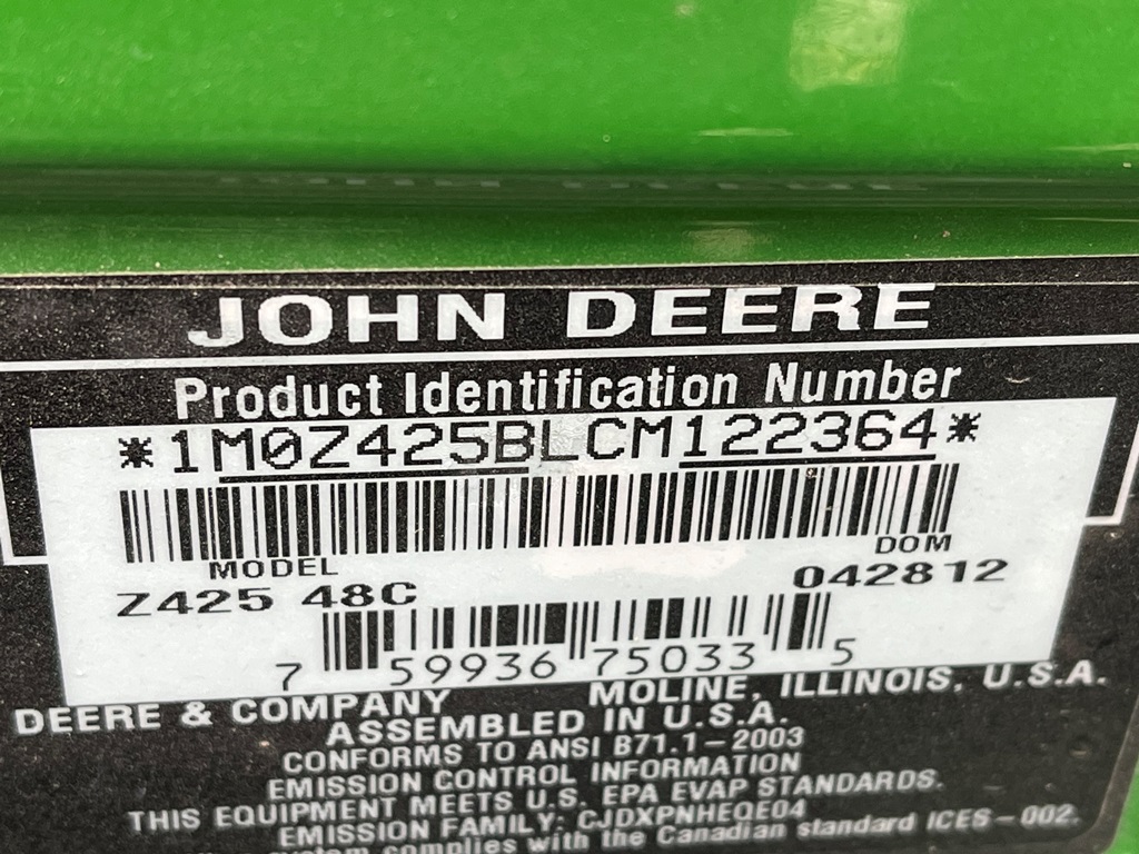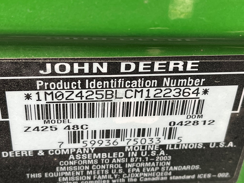 John Deere Z425 EZtrak Zero Turn Mower (NP3399), gas motor, EDGE 48" cutting system, single fuel tank, 22x9.50-10 rear tires, shows 653 hours.