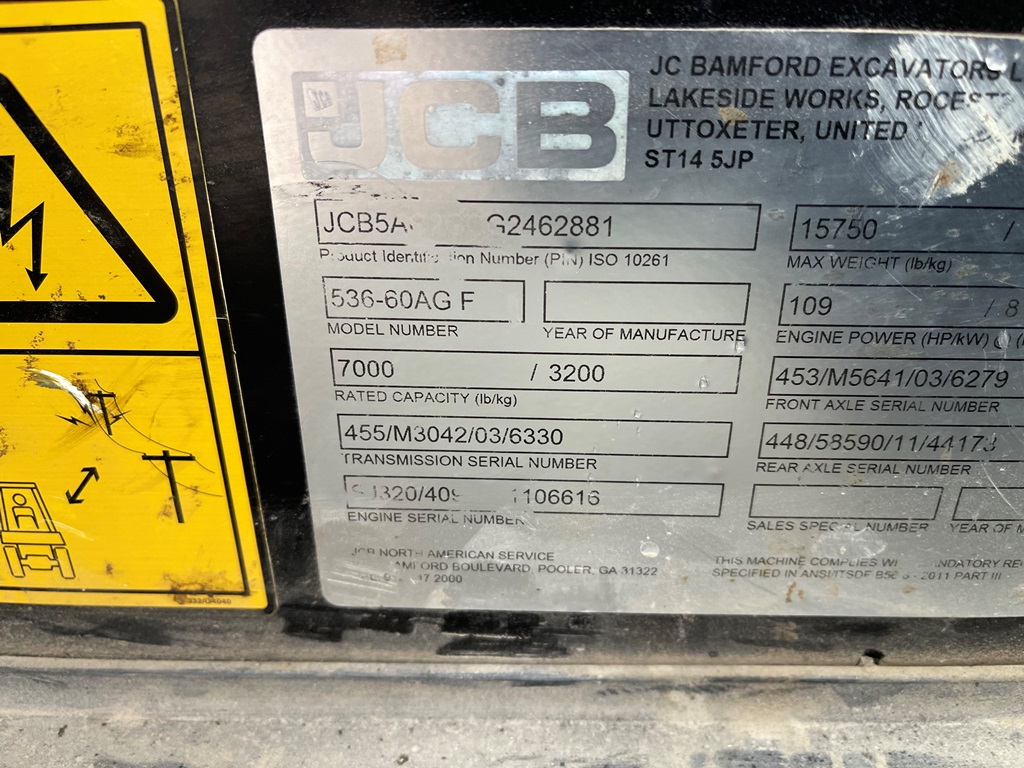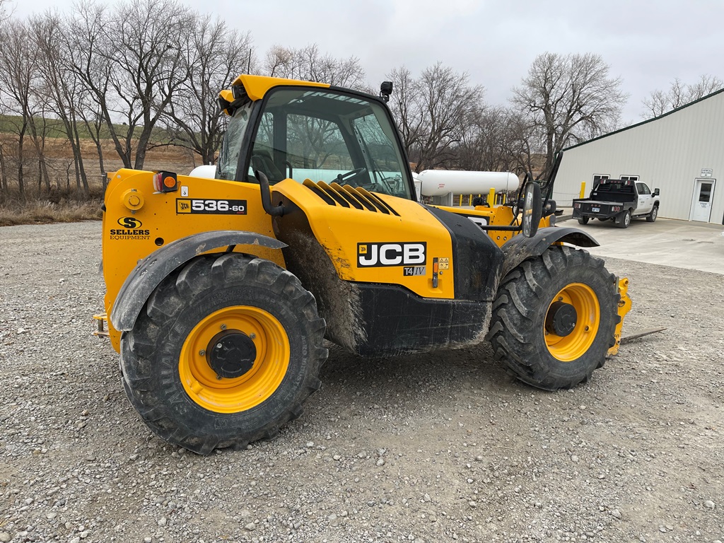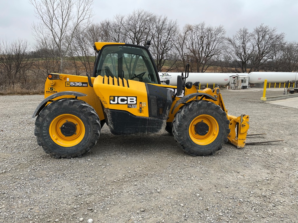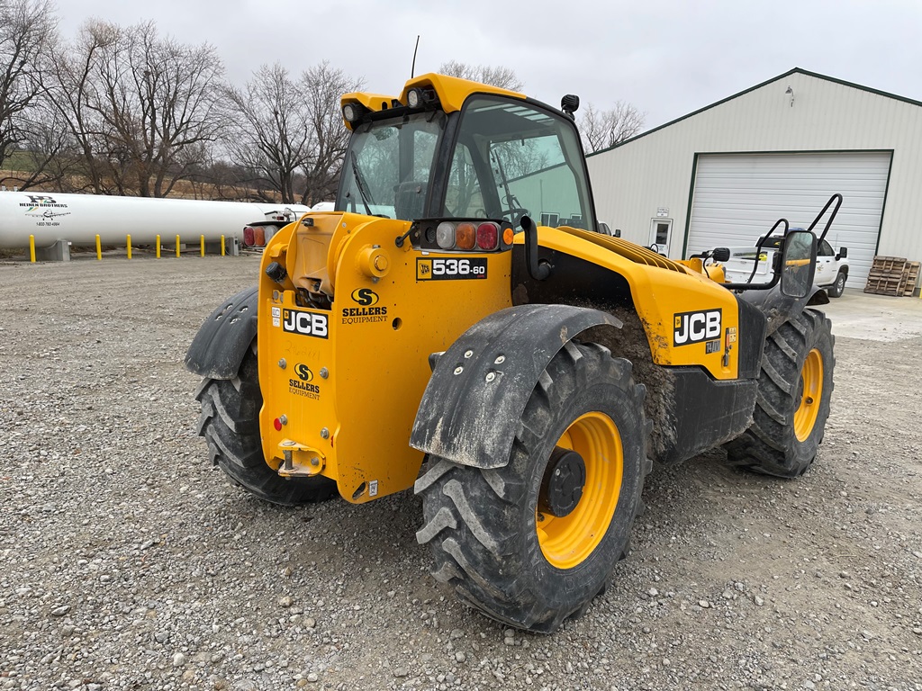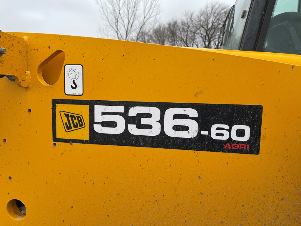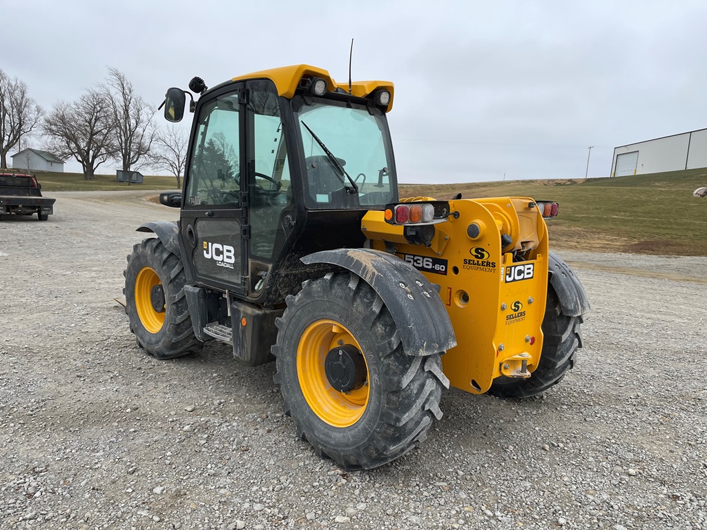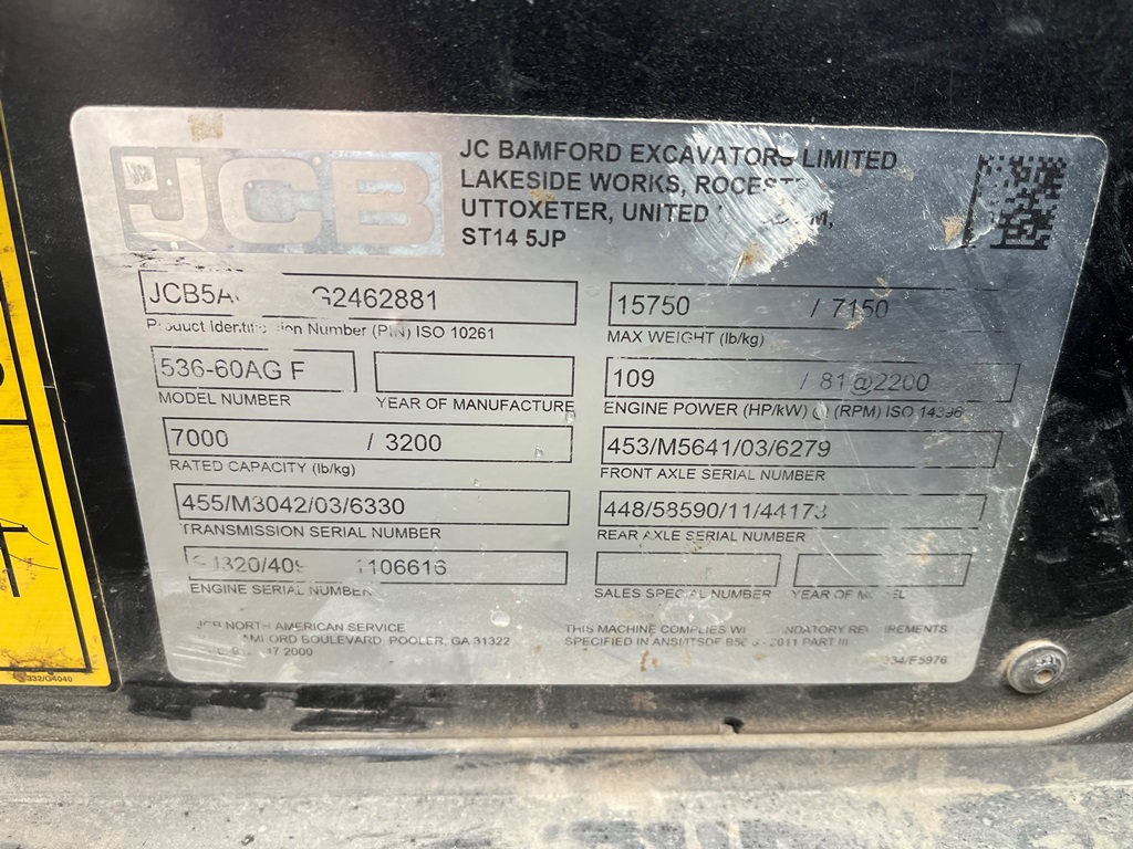 JCB Loadall 536-60 AGRI Telehandler (NP3393), EROPS, 109 HP diesel engine, shuttle shift, joystick control, heat, Am/Fm radio, 7,000 pound rated capacity, 2016 JCB Q-Fit forks, Alliance 460/70R24 tires, front/rear lights, shows 1,995 hours.