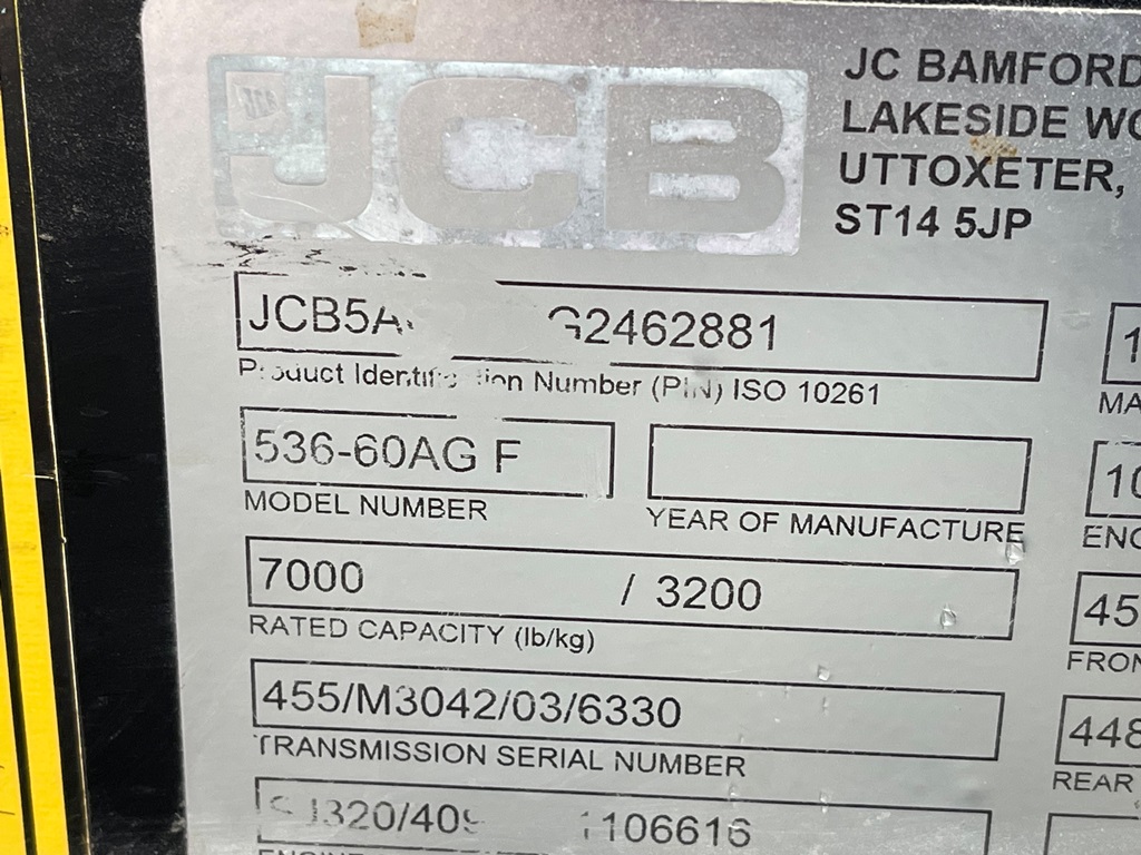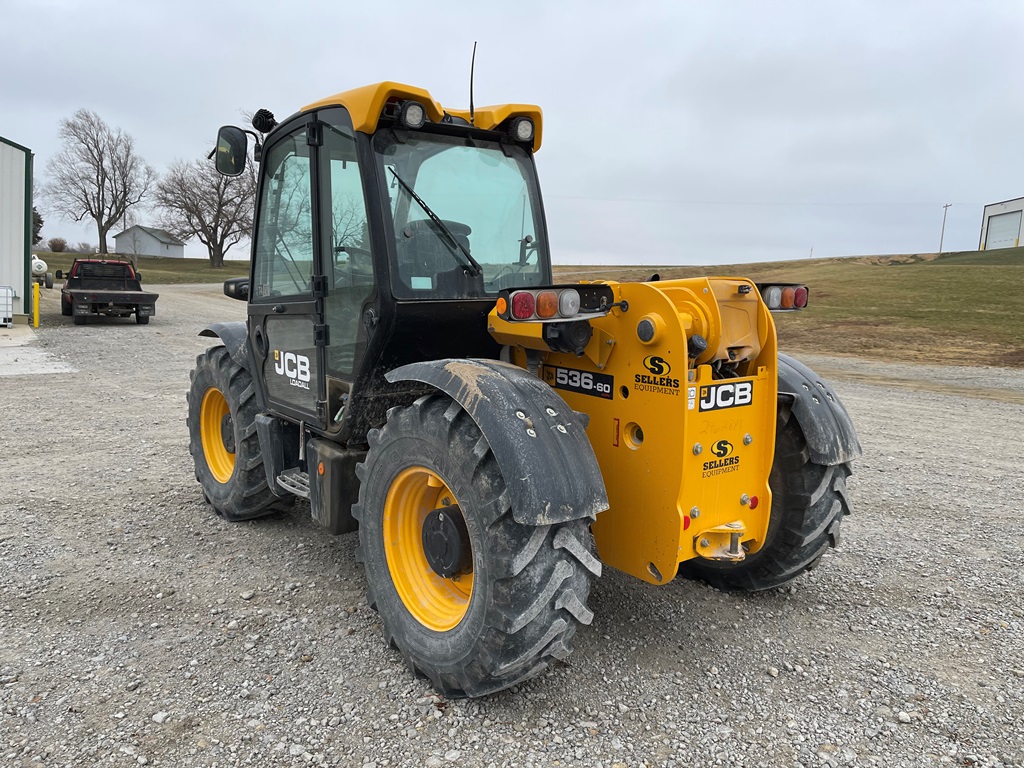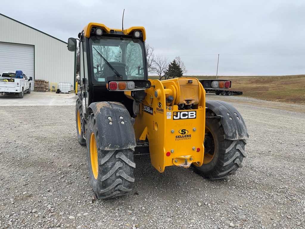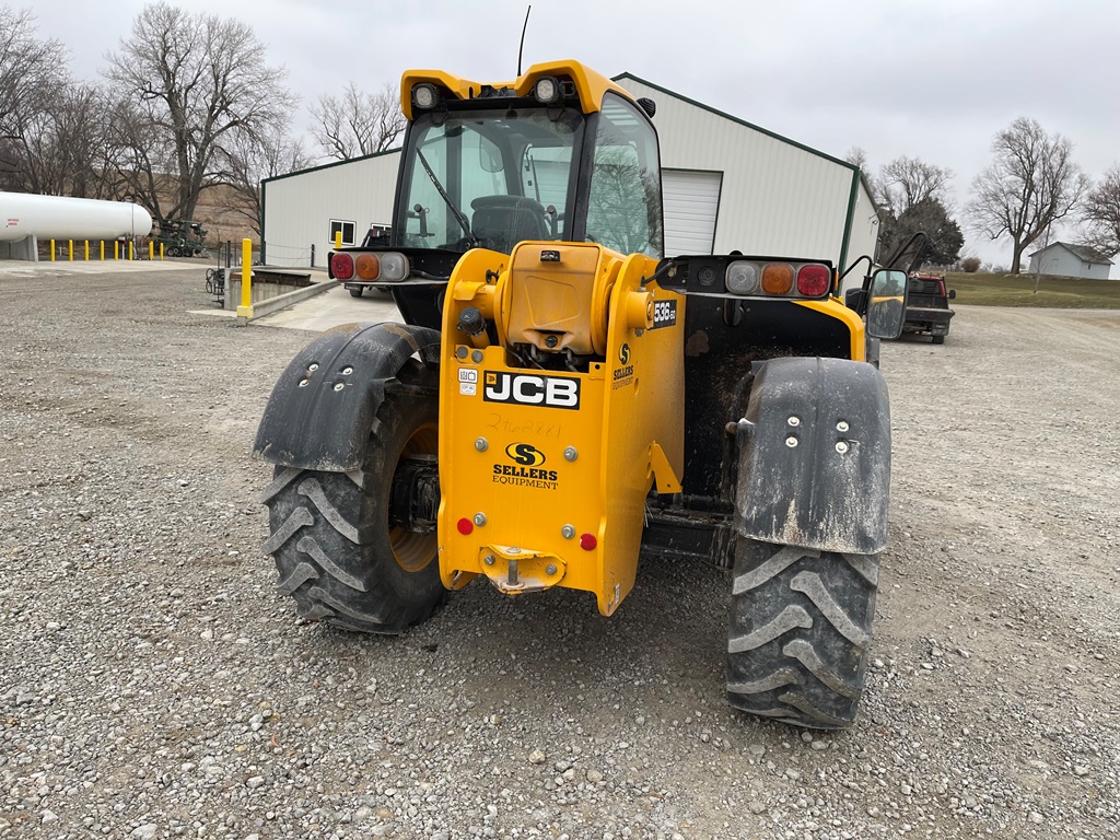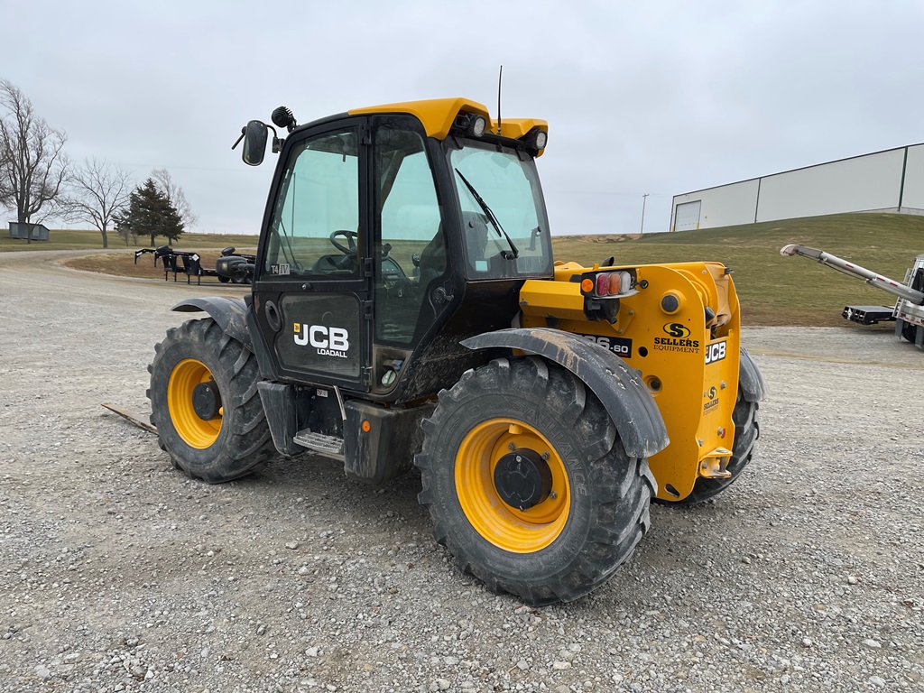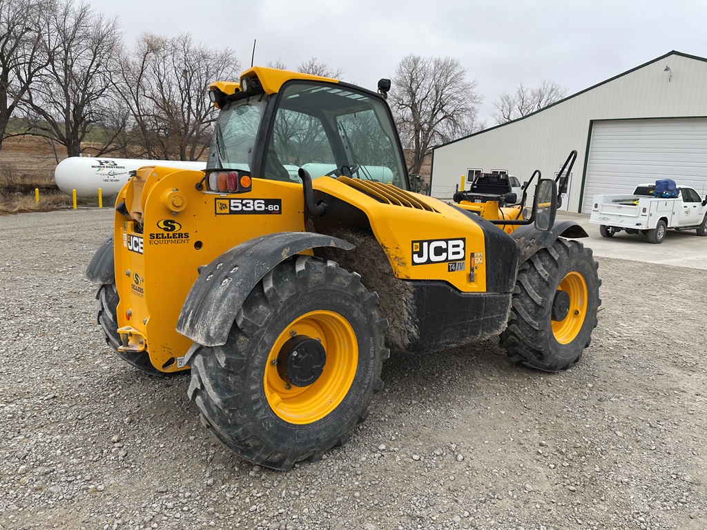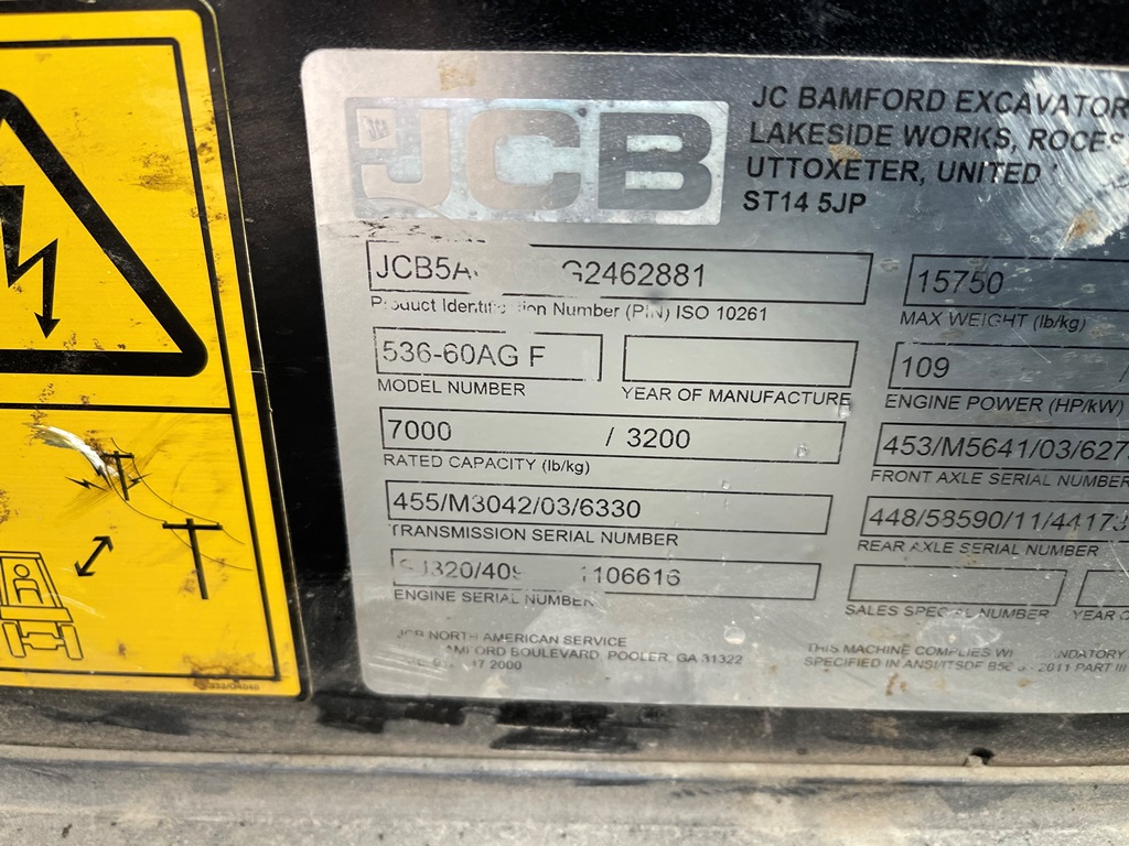 JCB Loadall 536-60 AGRI Telehandler (NP3393), EROPS, 109 HP diesel engine, shuttle shift, joystick control, heat, Am/Fm radio, 7,000 pound rated capacity, 2016 JCB Q-Fit forks, Alliance 460/70R24 tires, front/rear lights, shows 1,995 hours.
