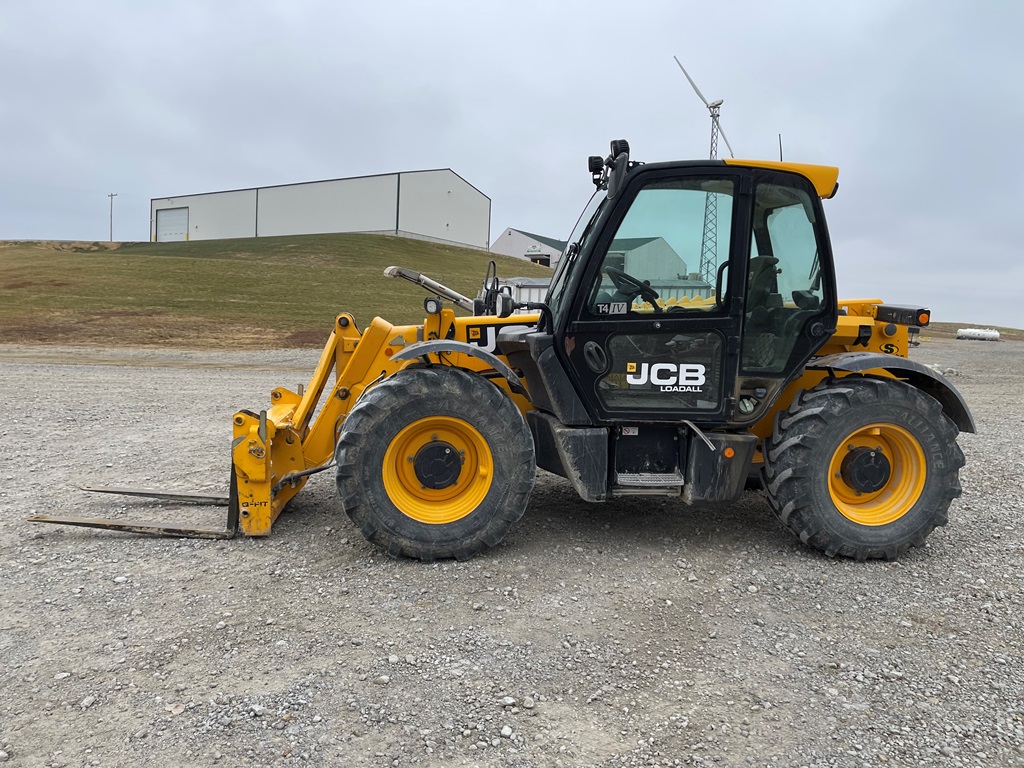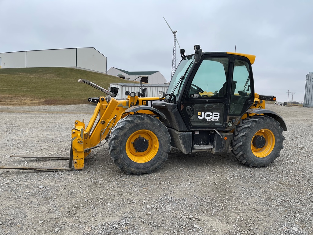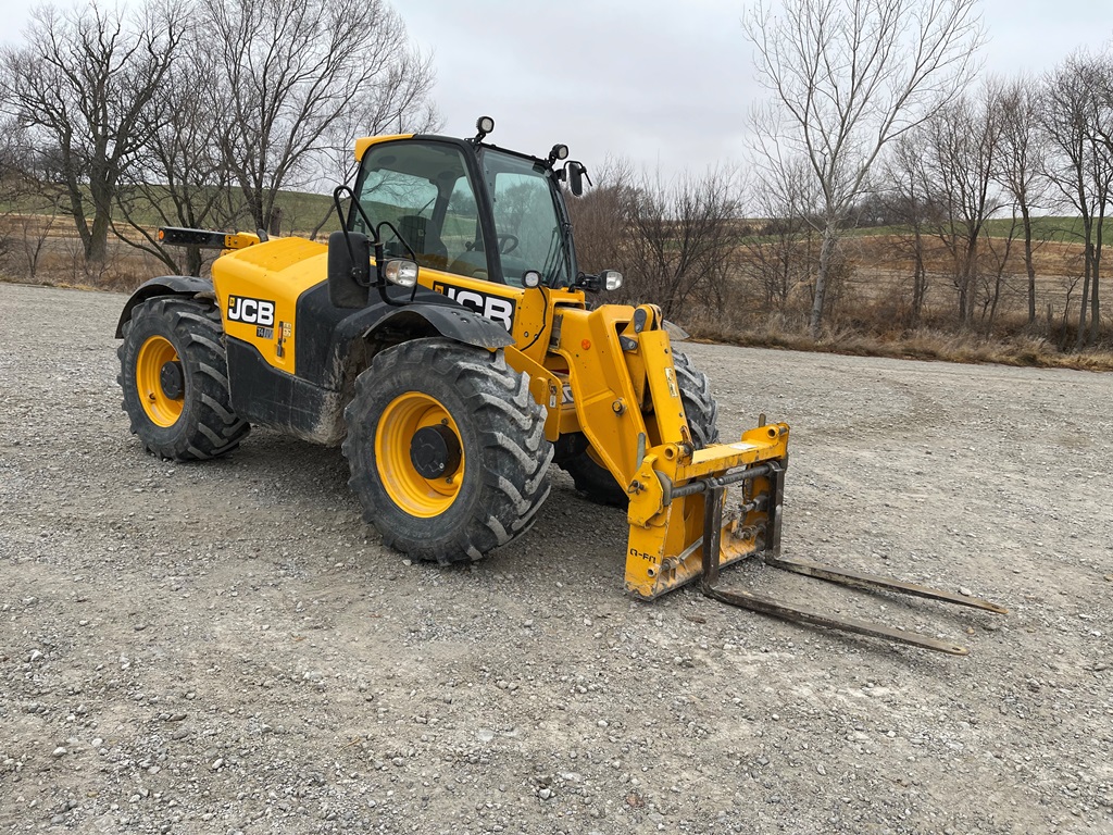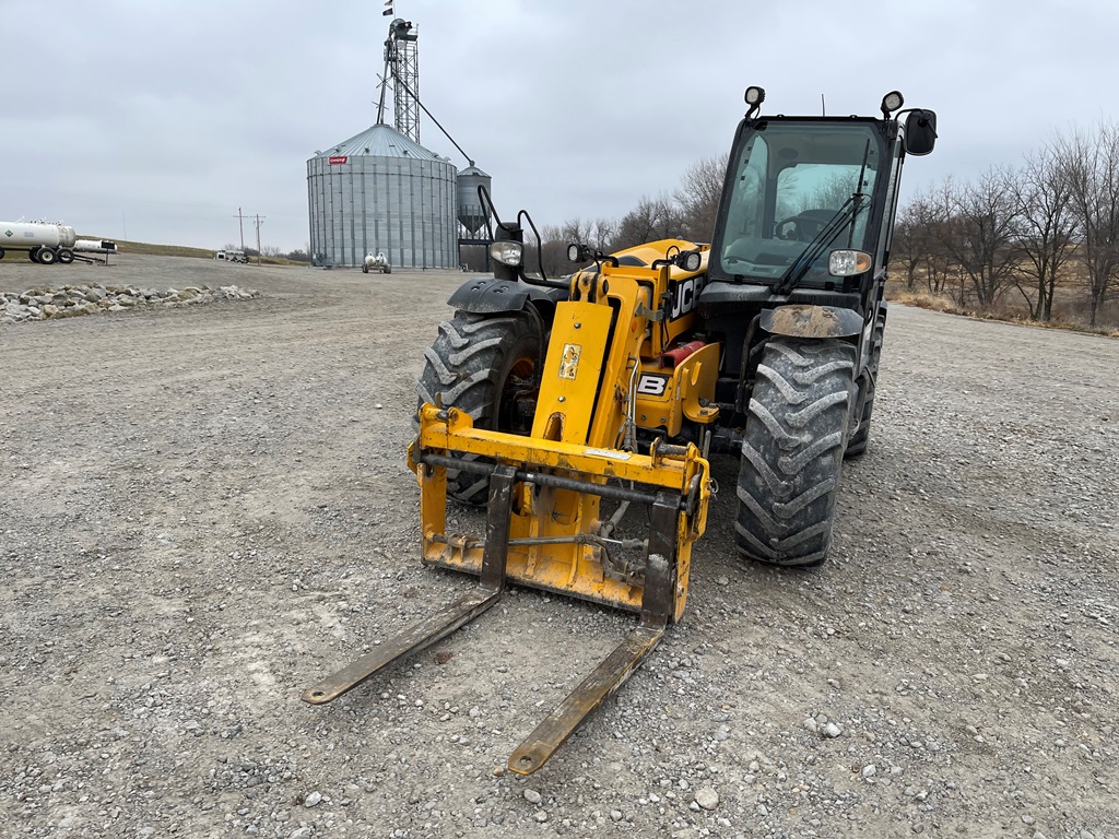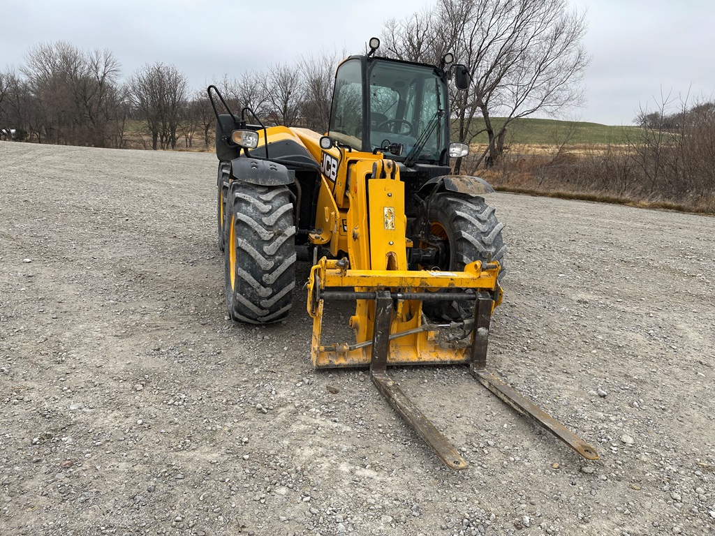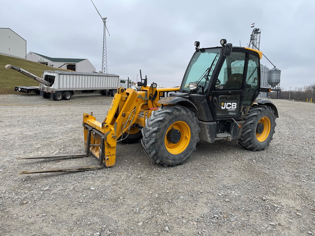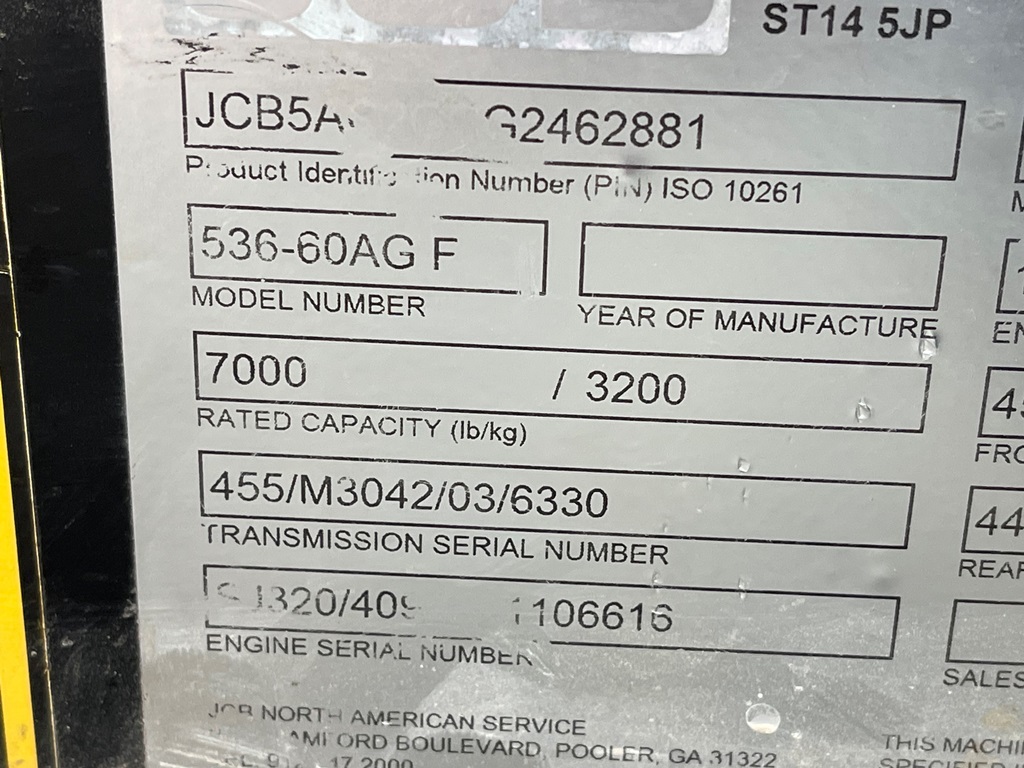 JCB Loadall 536-60 AGRI Telehandler (NP3393), EROPS, 109 HP diesel engine, shuttle shift, joystick control, heat, Am/Fm radio, 7,000 pound rated capacity, 2016 JCB Q-Fit forks, Alliance 460/70R24 tires, front/rear lights, shows 1,995 hours.