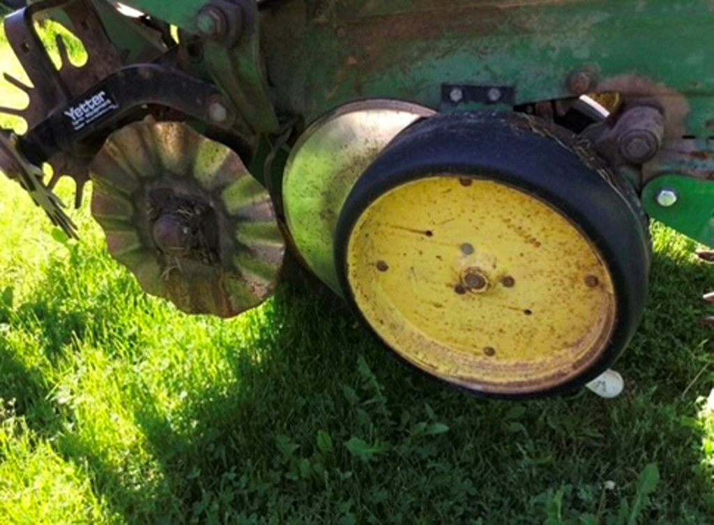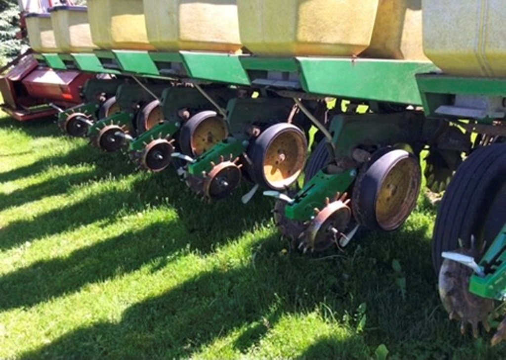 John Deere 7000 Planter (LD1251), 6 row, 30 inch spacing, adjustable brushes, Yetter floating row cleaners, wavy no till coulters, heavy duty downforce springs, spiked closing wheels.