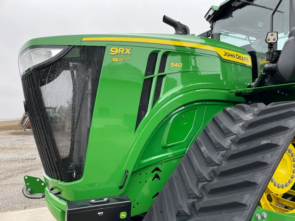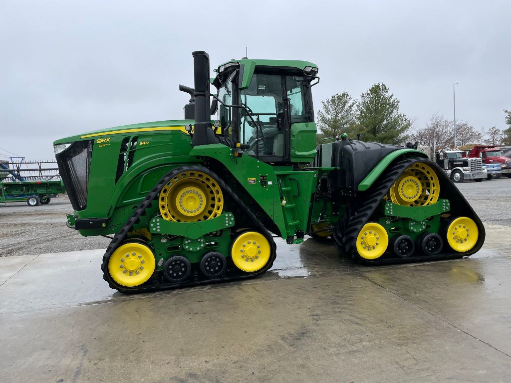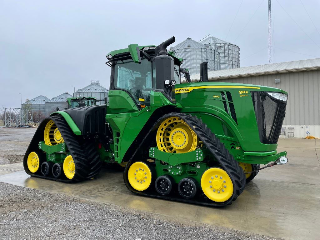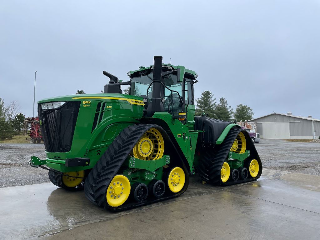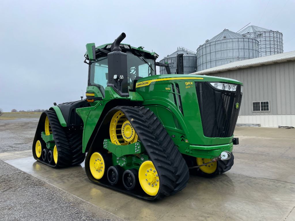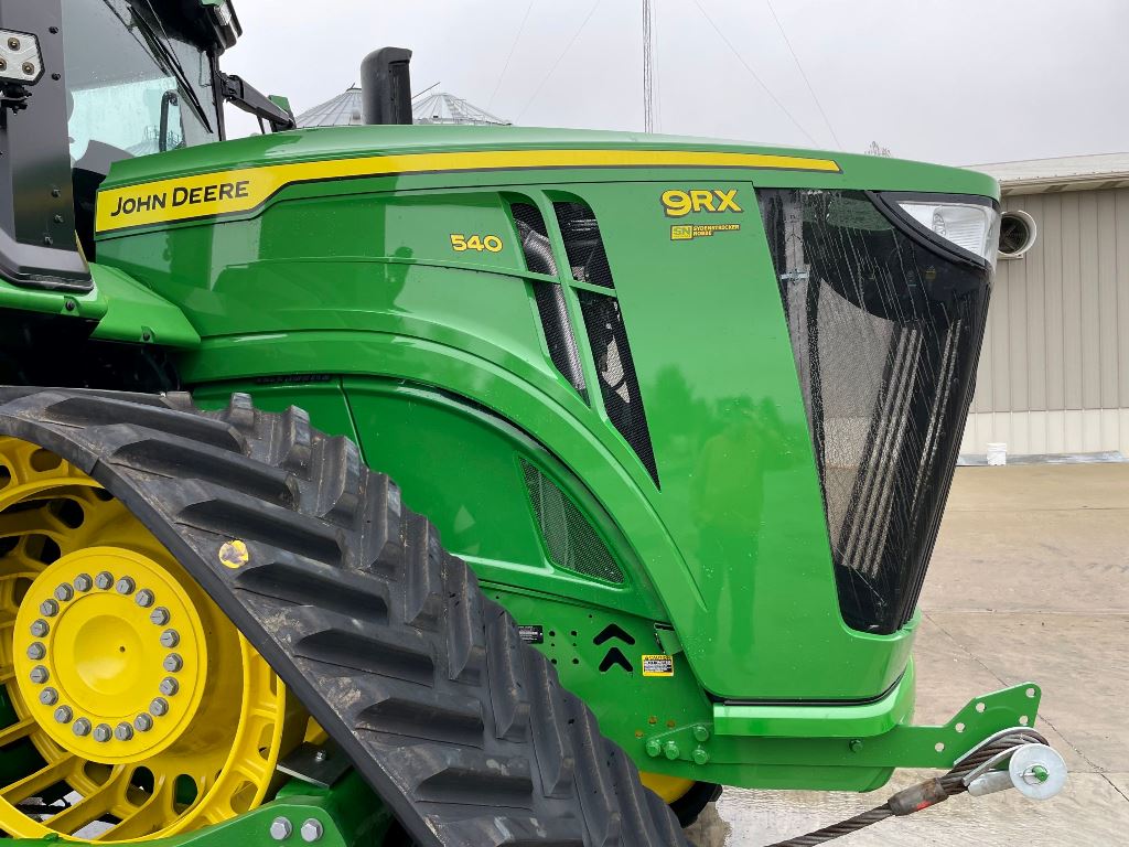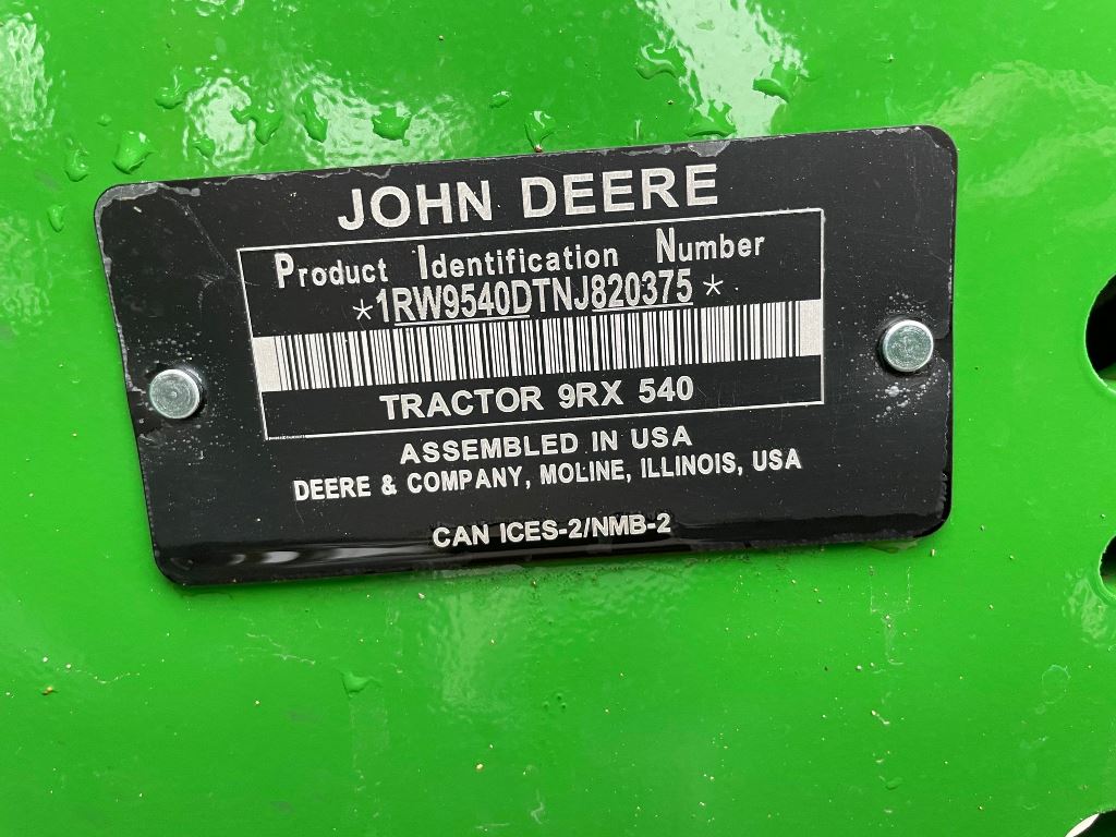 2022 John Deere 9RX 540 Tractor (GP2383), NEVER USED, model 9RX 540, Sydenstricker Nobbe, JD14 13.6L/827 cu in. engine (model TA13702, serial number 9XWPR2204419), 540 HP, John Deere e18 18 speed PowerShift with Efficiency Manager 40km/h 25mph,13.6L FT4/S5 cooling package, no PTO, enclosed cab, adjustable seat, buddy seat, heat and A/C, Generation 4 46000 CommandCenter 10in display, touch screen audio player (AM/FM stereo with weather band, remote controls, auxiliary input jack, four speakers and external antenna), 9 series visibility package (24 LED work lights and 8 LED convenience lights), rear hitch, Full-locking electrohydraulic front and rear axle, Camso 4W-5085 and 5W-0533 rollers, 36 inch wide tracks, 6.2 hours, factory testing hours only, full factory warranty.