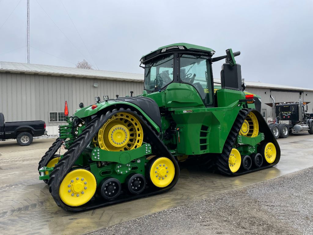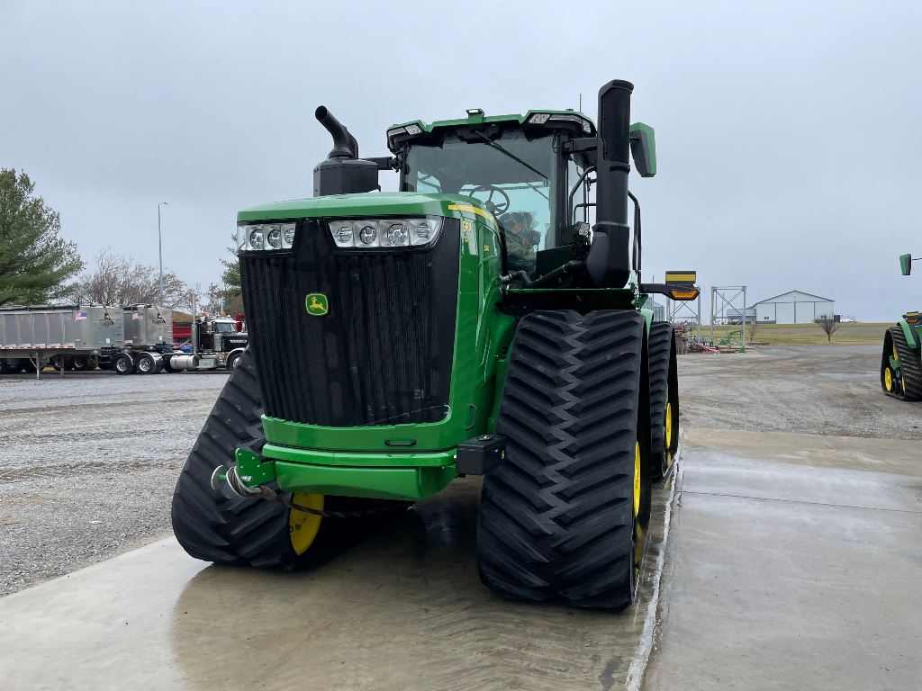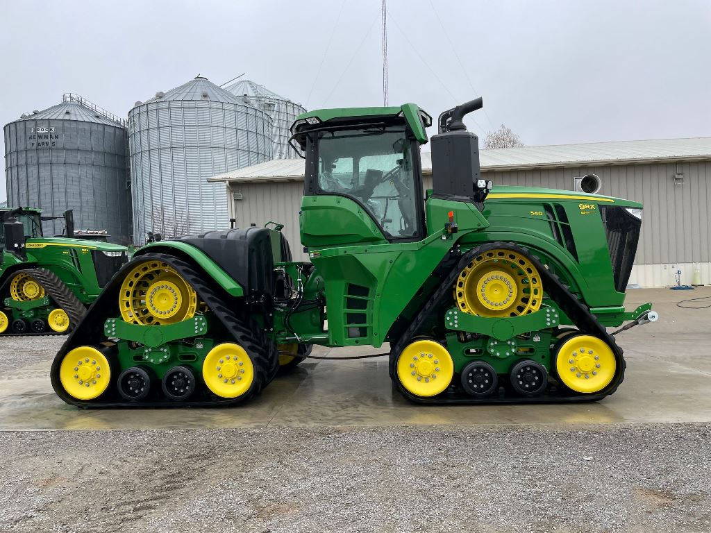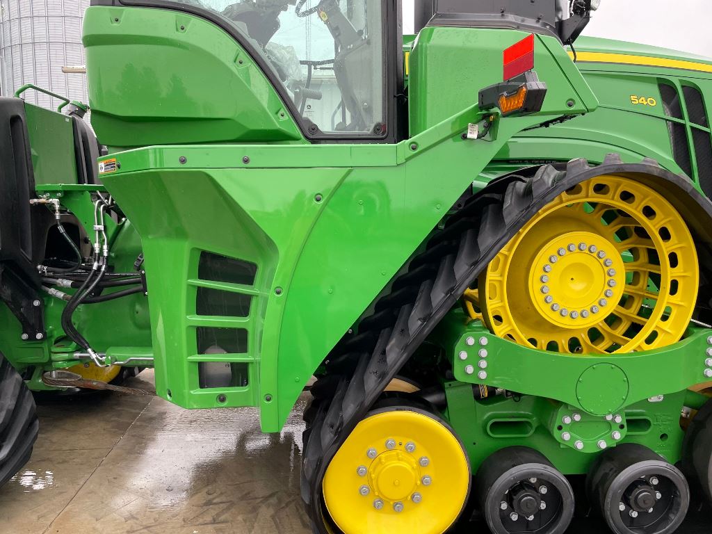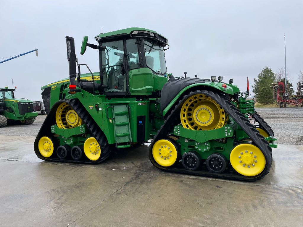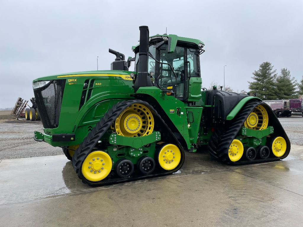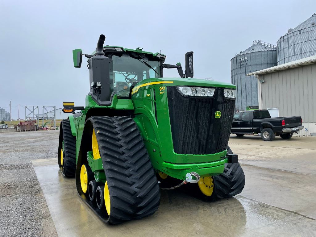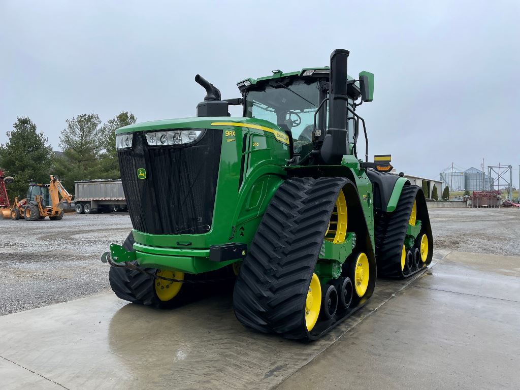 2022 John Deere 9RX 540 Tractor (GP2383), NEVER USED, model 9RX 540, Sydenstricker Nobbe, JD14 13.6L/827 cu in. engine (model TA13702, serial number 9XWPR2204419), 540 HP, John Deere e18 18 speed PowerShift with Efficiency Manager 40km/h 25mph,13.6L FT4/S5 cooling package, no PTO, enclosed cab, adjustable seat, buddy seat, heat and A/C, Generation 4 46000 CommandCenter 10in display, touch screen audio player (AM/FM stereo with weather band, remote controls, auxiliary input jack, four speakers and external antenna), 9 series visibility package (24 LED work lights and 8 LED convenience lights), rear hitch, Full-locking electrohydraulic front and rear axle, Camso 4W-5085 and 5W-0533 rollers, 36 inch wide tracks, 6.2 hours, factory testing hours only, full factory warranty.