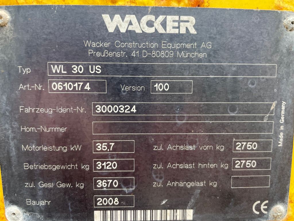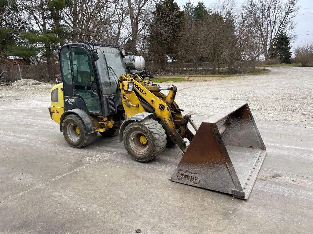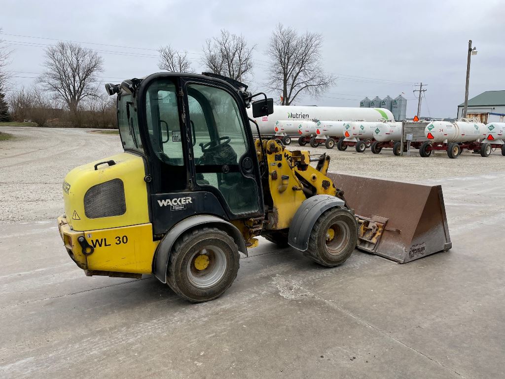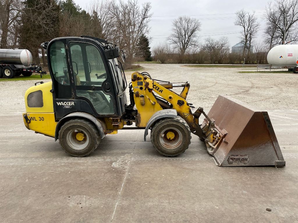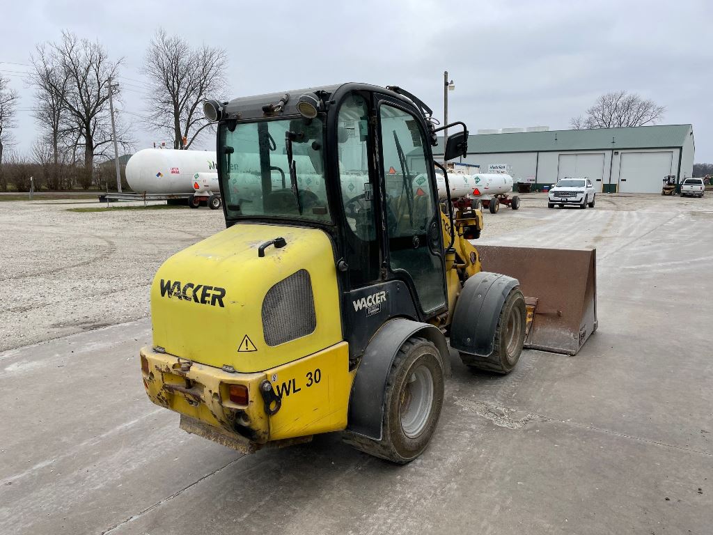 2008 Wacker WL30 Loader (GP2430, Unit 14664), diesel engine, shuttle shift transmission, cab, lights, Berlon bucket, auxiliary hydraulics, 31x15.5-15 tires, fenders.
