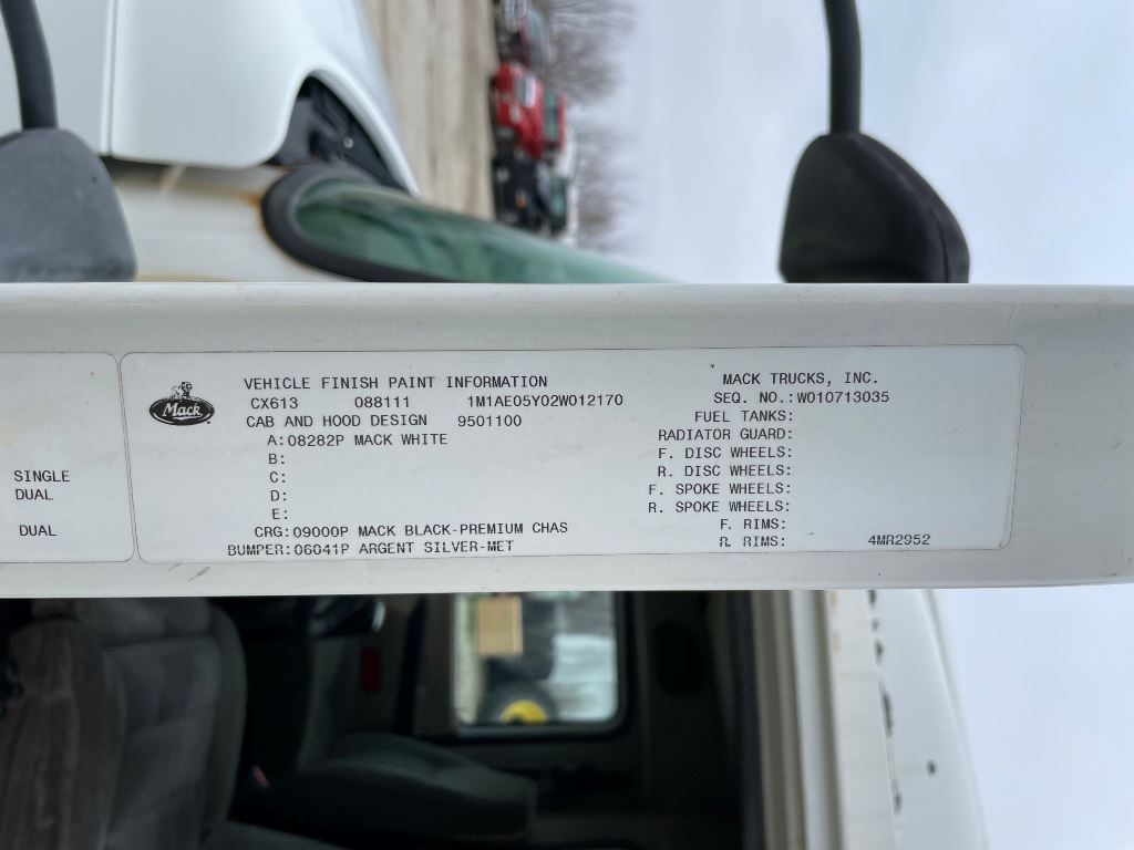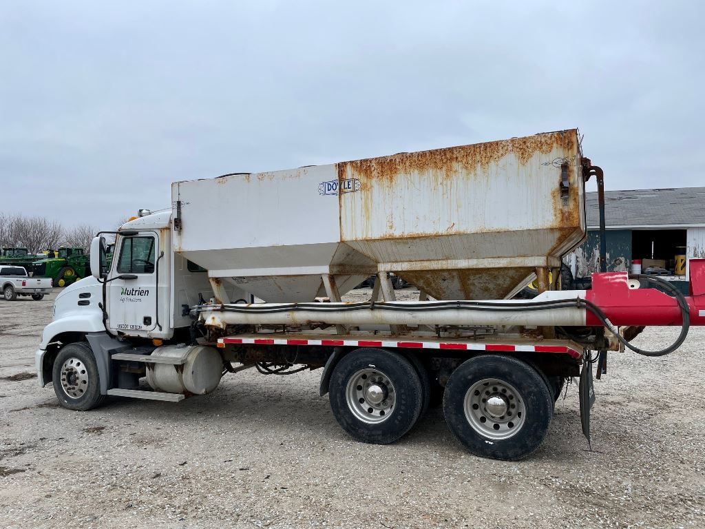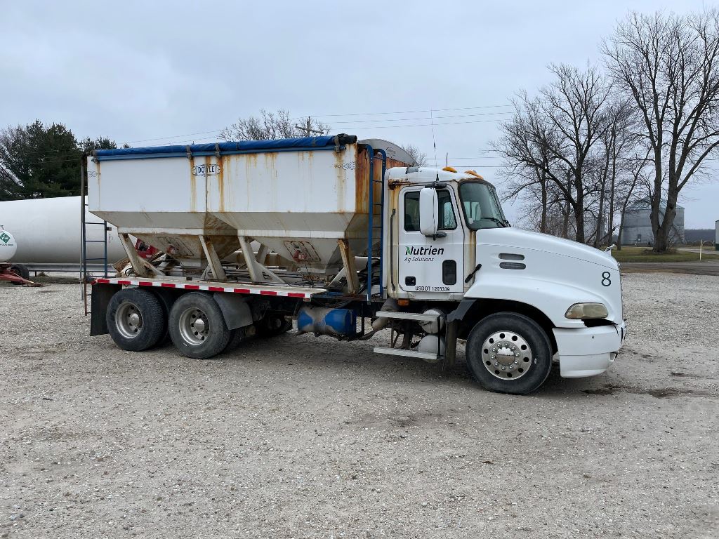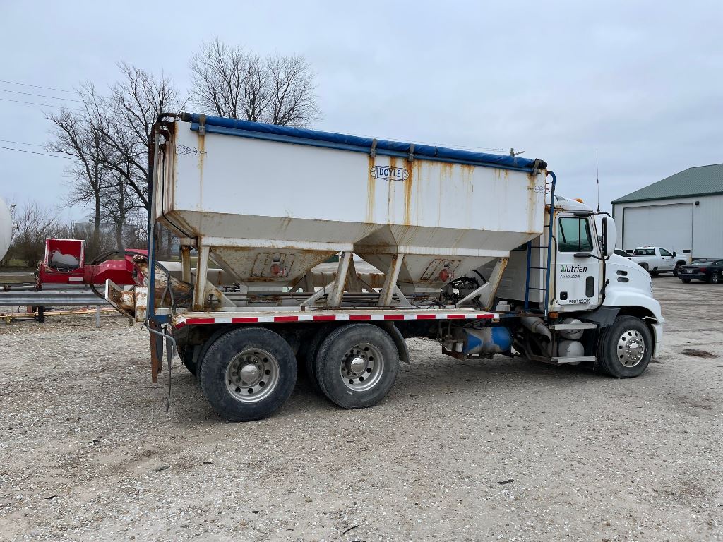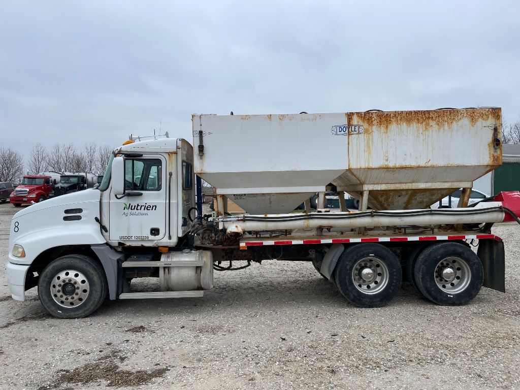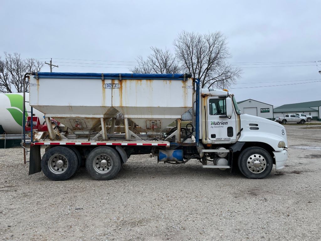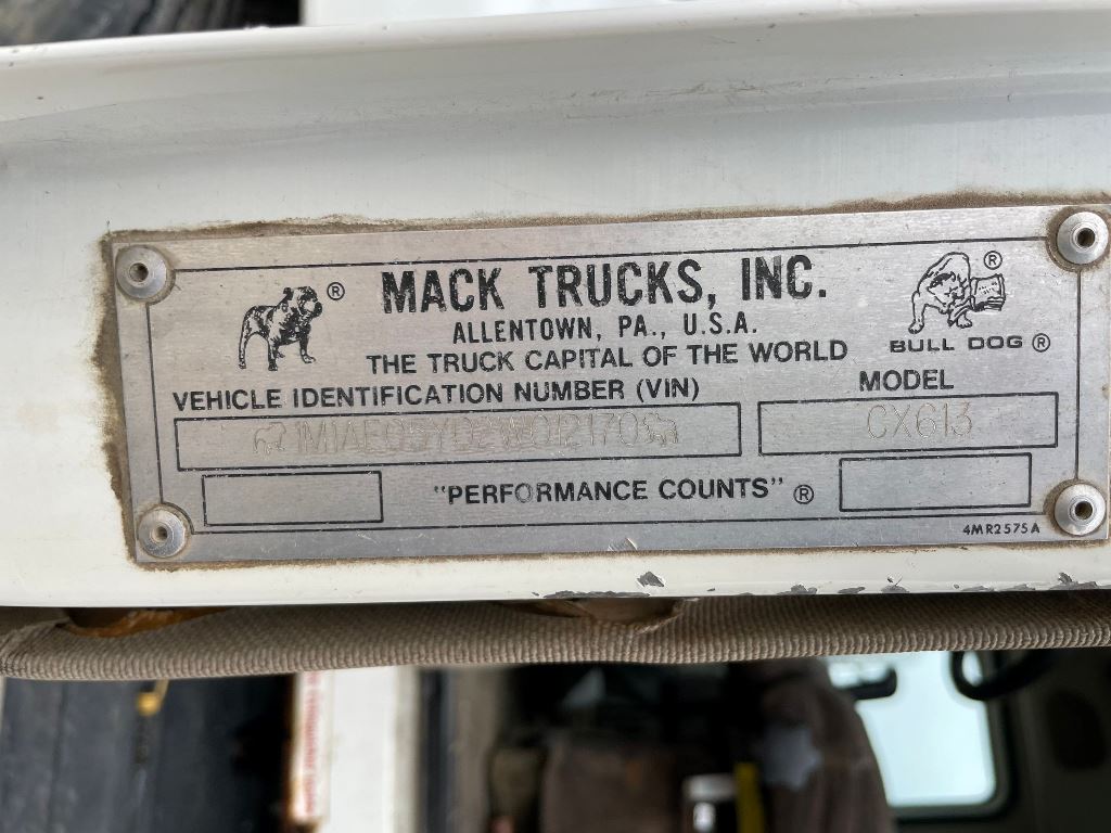 2002 Mack CX613 Dry Tender Truck (GP2431, Unit 17864), Mack E7-330/350 diesel engine, Eaton Fuller 9 speed transmission, air conditioning, heat, Am/Fm cassette radio, cruise control, engine brake, tandem axle, full screw, air ride suspension, Doyle 16 ton dry tender box, side discharge auger, all hydraulic, vibrators, roll over tarp, 295/75R22.5 tires, aluminum rims, shows 774,927 miles.