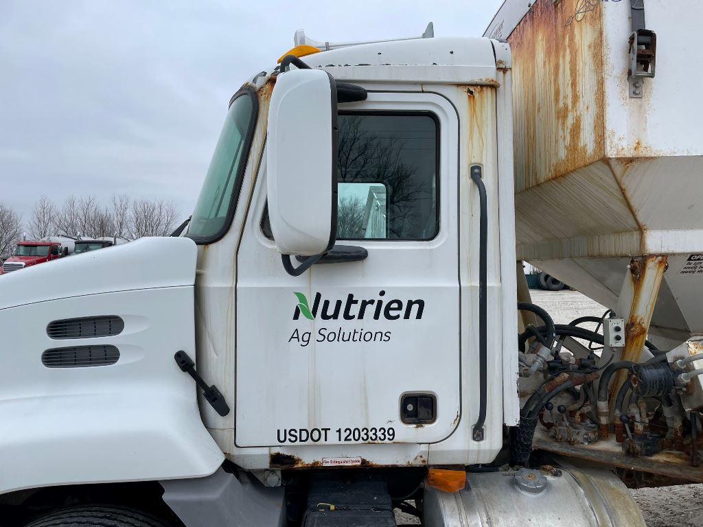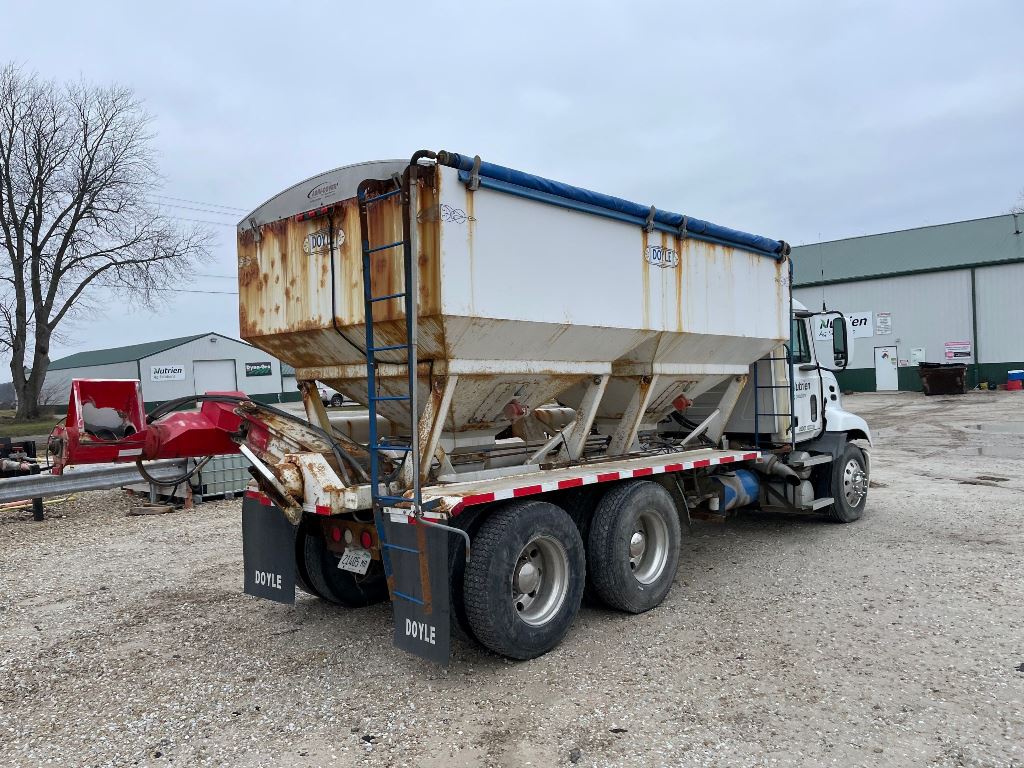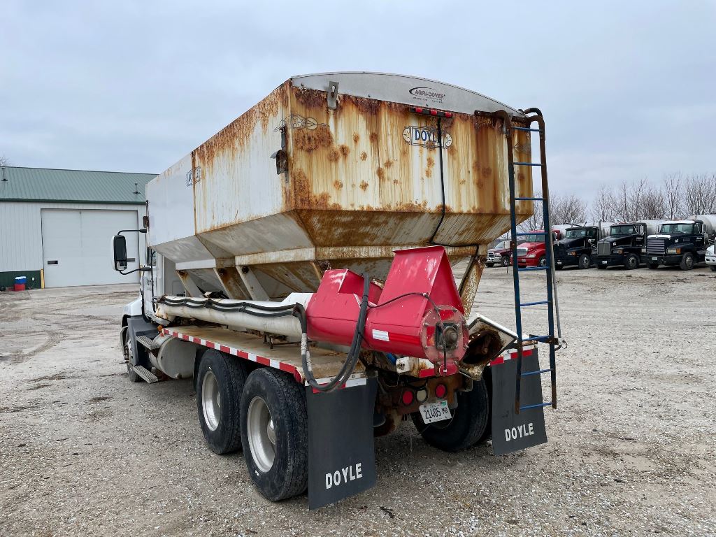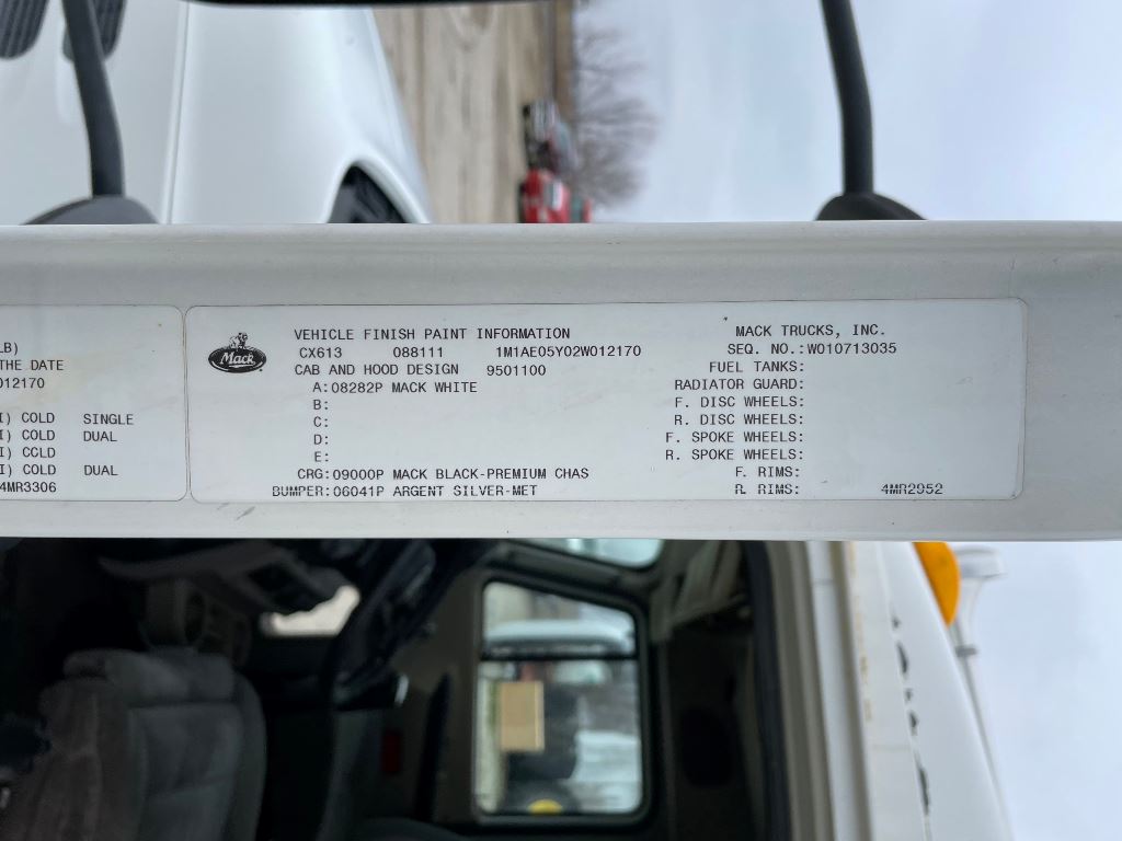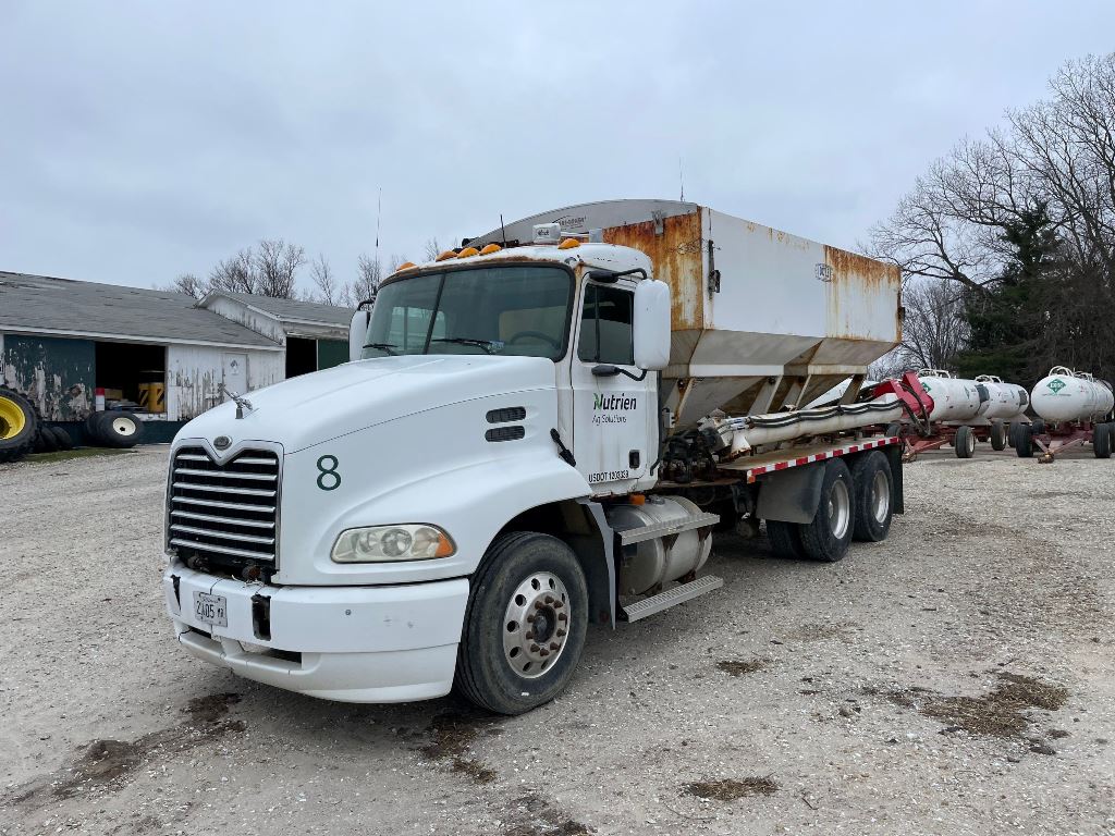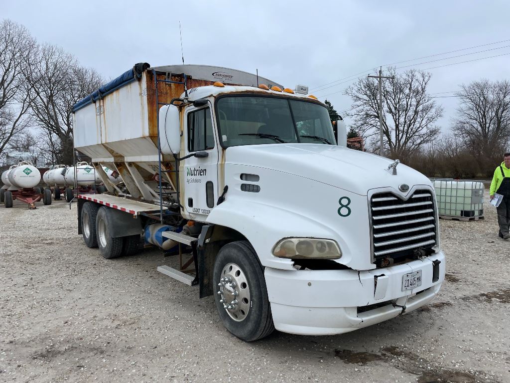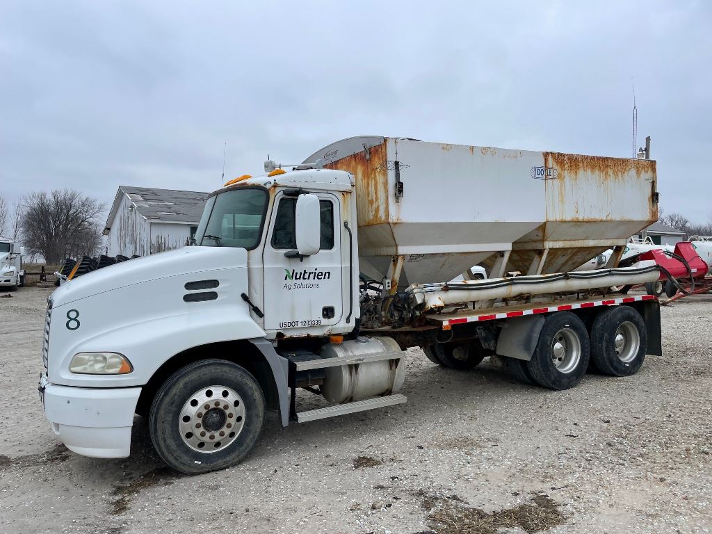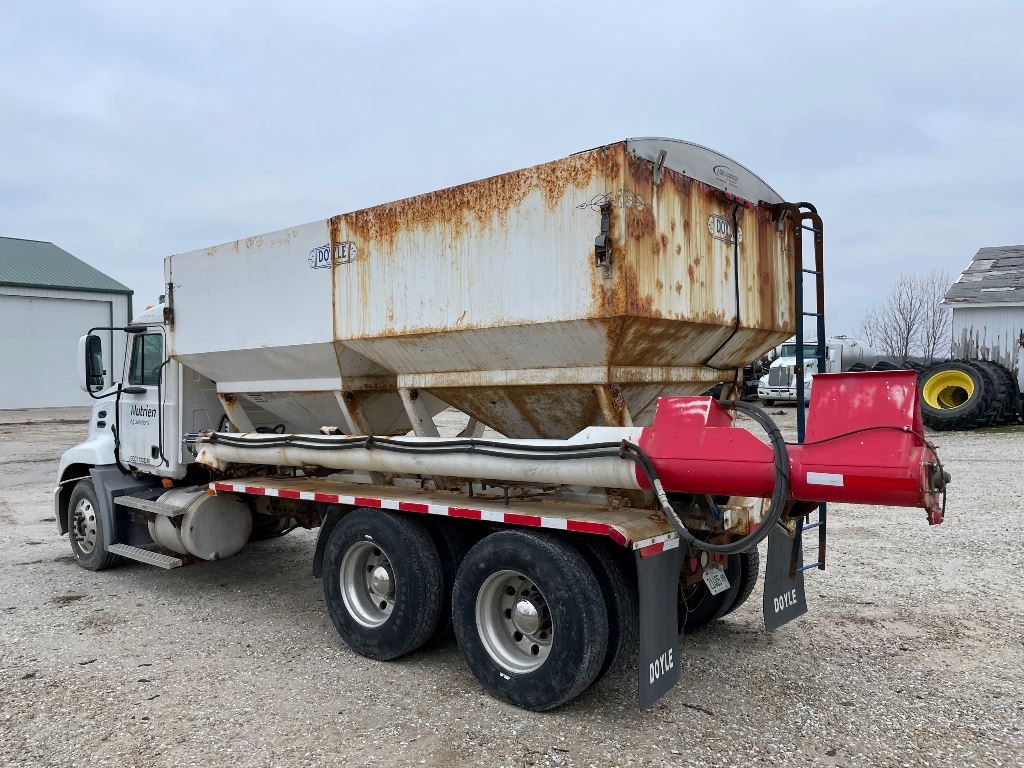 2002 Mack CX613 Dry Tender Truck (GP2431, Unit 17864), Mack E7-330/350 diesel engine, Eaton Fuller 9 speed transmission, air conditioning, heat, Am/Fm cassette radio, cruise control, engine brake, tandem axle, full screw, air ride suspension, Doyle 16 ton dry tender box, side discharge auger, all hydraulic, vibrators, roll over tarp, 295/75R22.5 tires, aluminum rims, shows 774,927 miles.