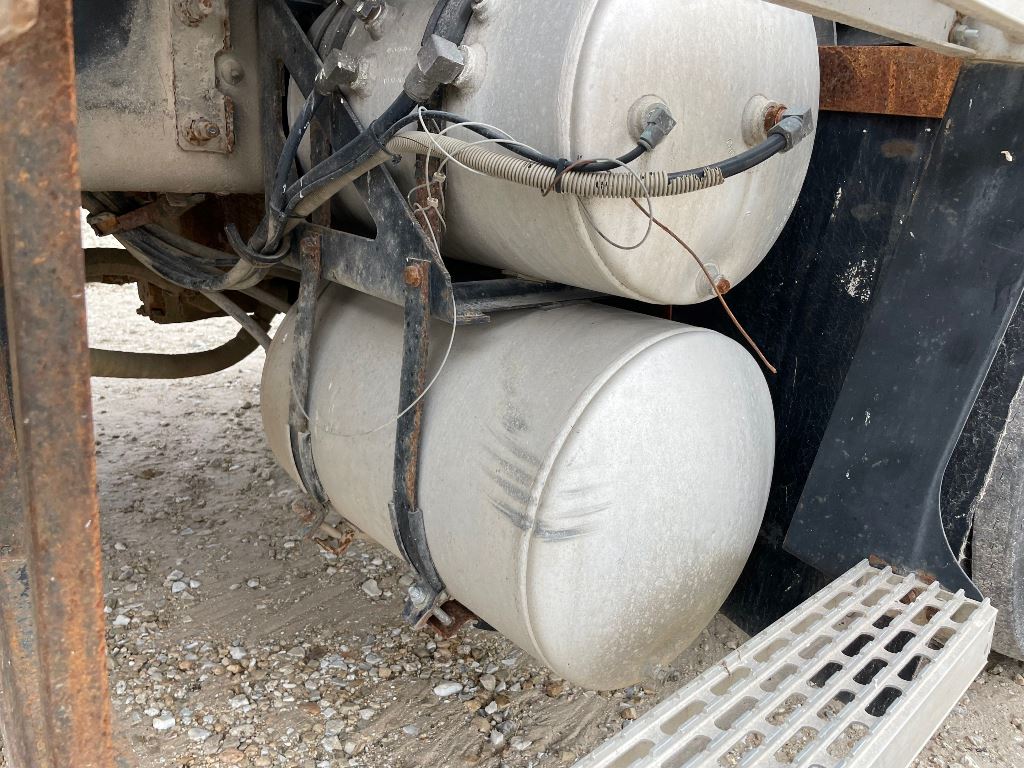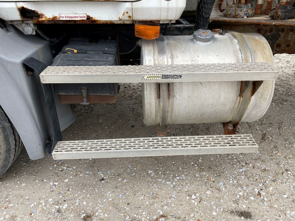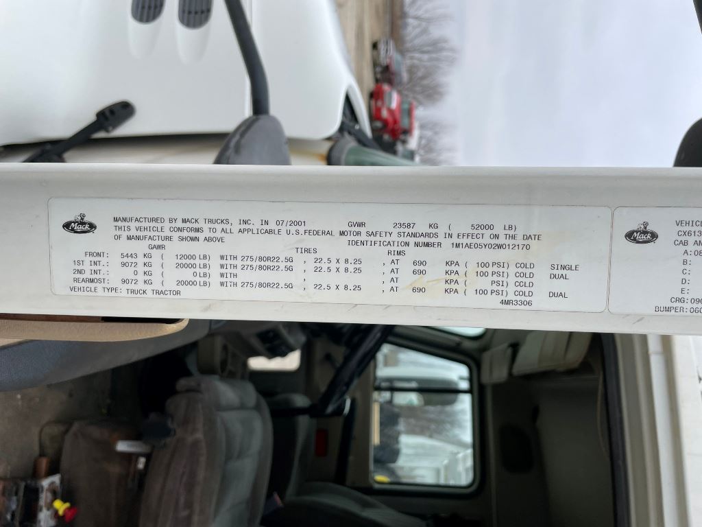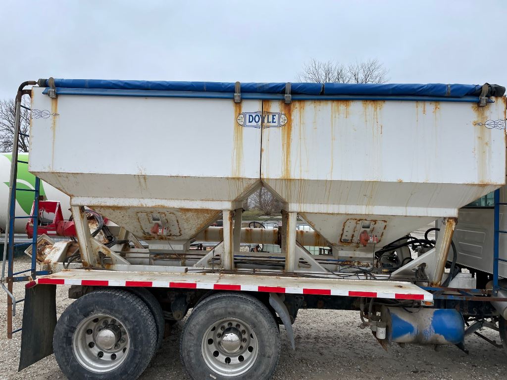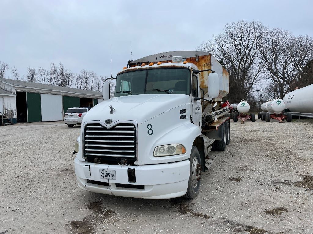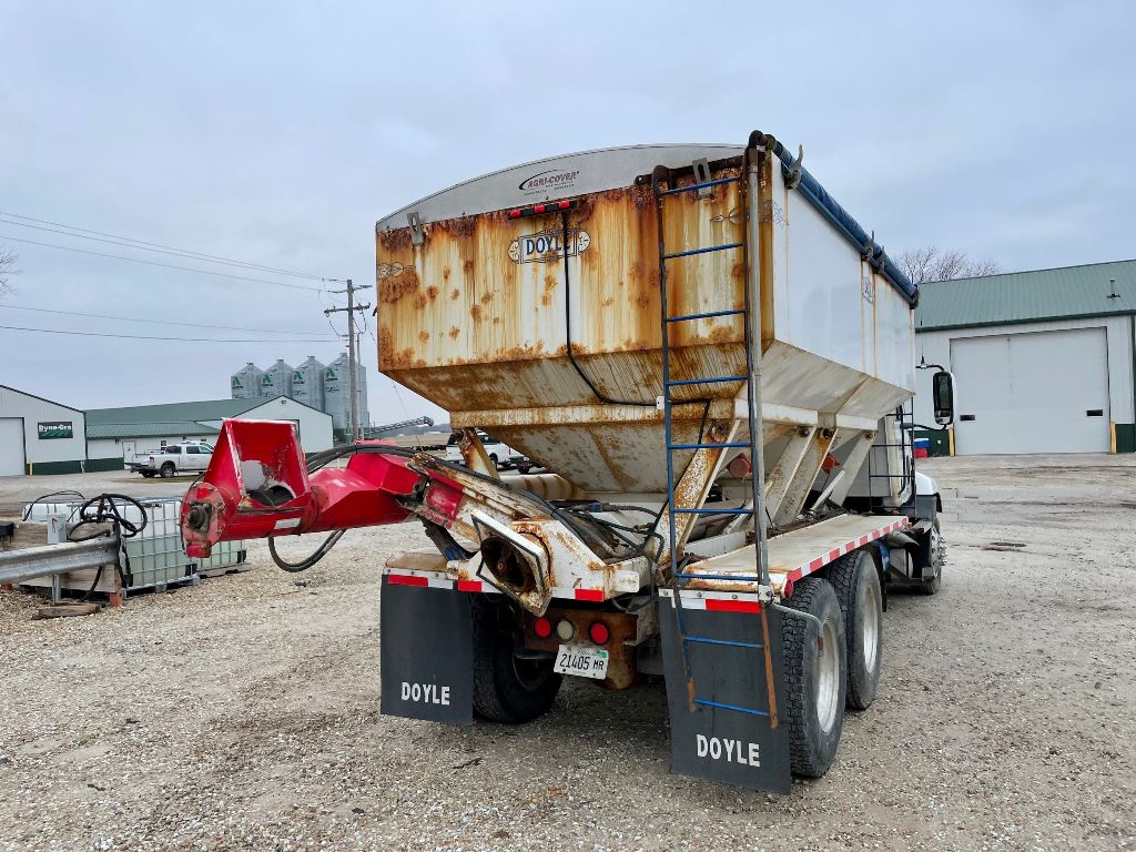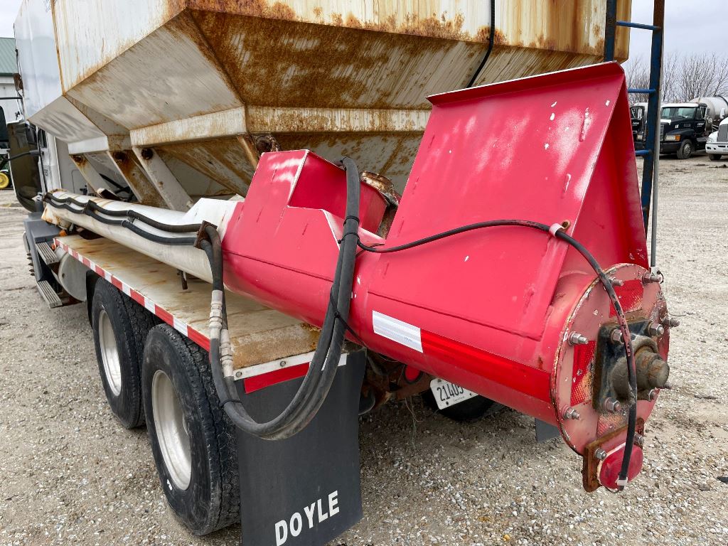 2002 Mack CX613 Dry Tender Truck (GP2431, Unit 17864), Mack E7-330/350 diesel engine, Eaton Fuller 9 speed transmission, air conditioning, heat, Am/Fm cassette radio, cruise control, engine brake, tandem axle, full screw, air ride suspension, Doyle 16 ton dry tender box, side discharge auger, all hydraulic, vibrators, roll over tarp, 295/75R22.5 tires, aluminum rims, shows 774,927 miles.