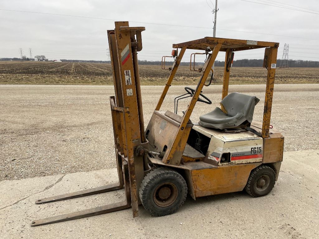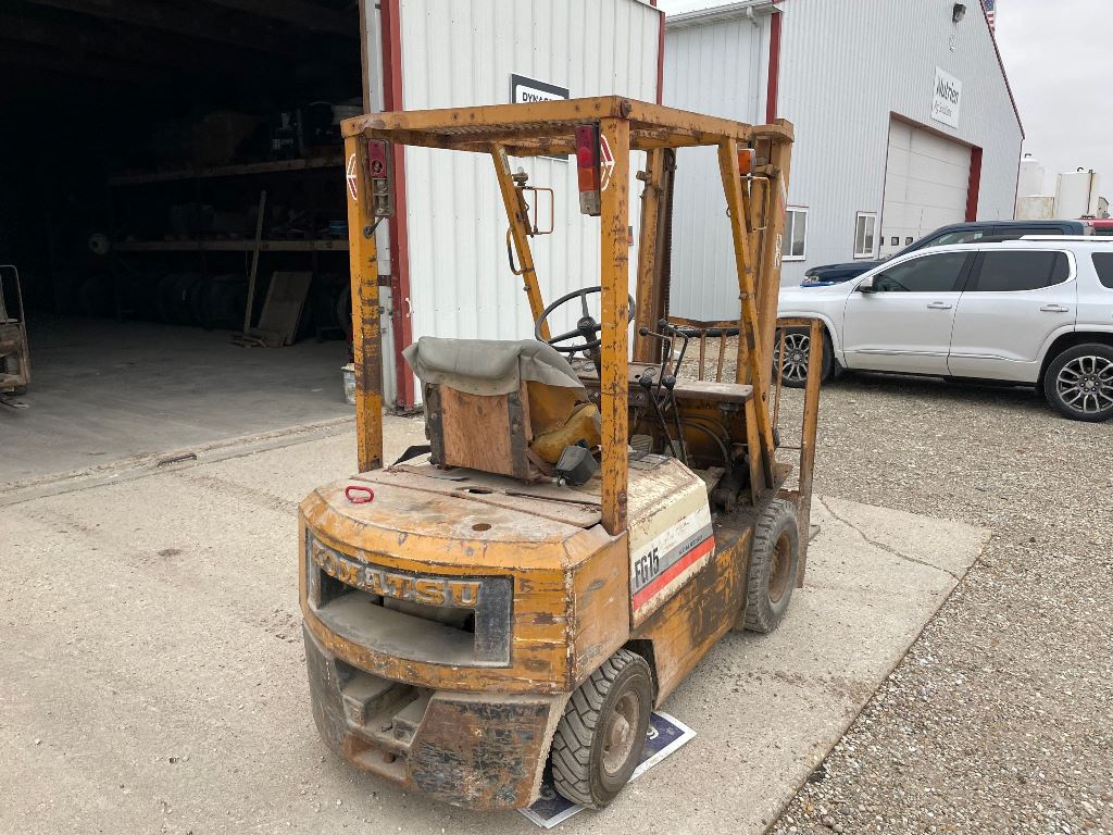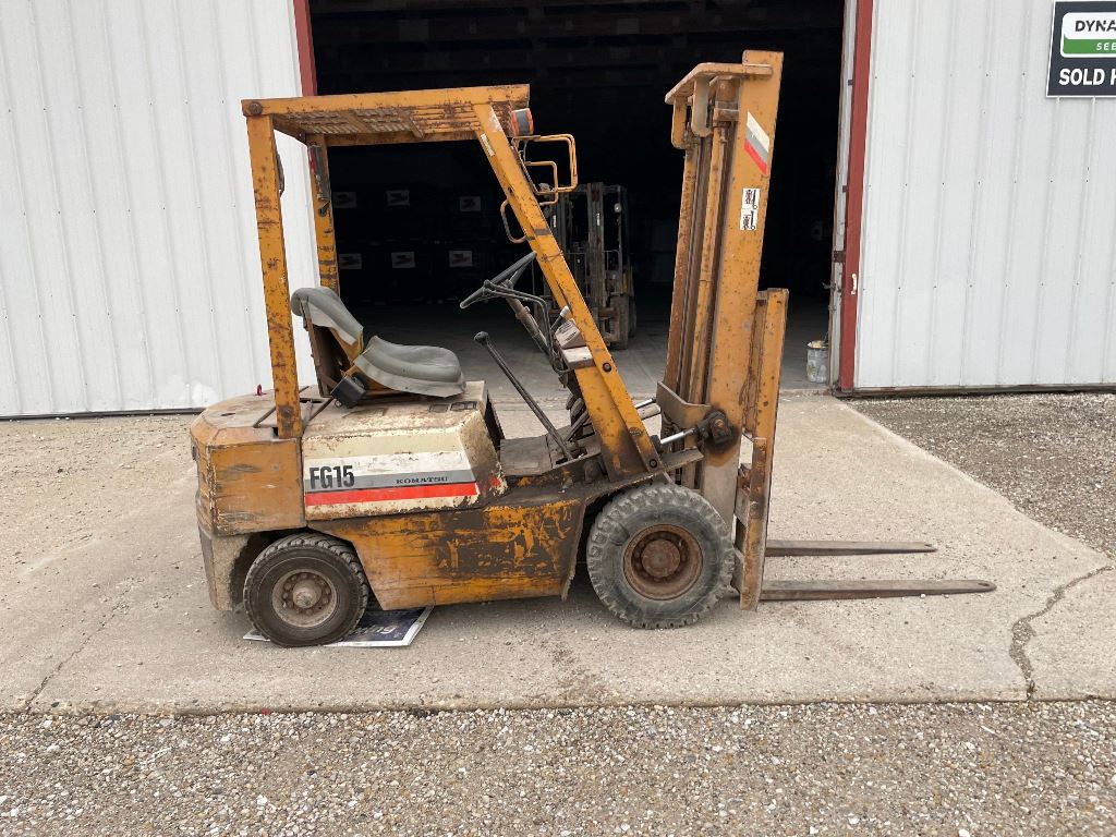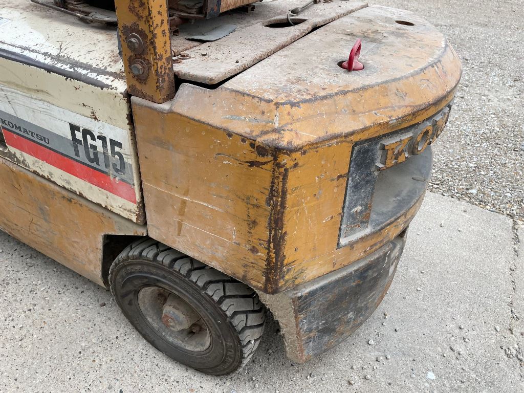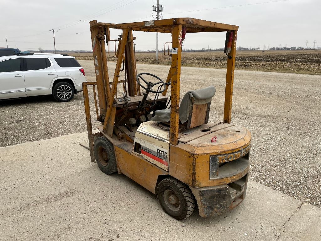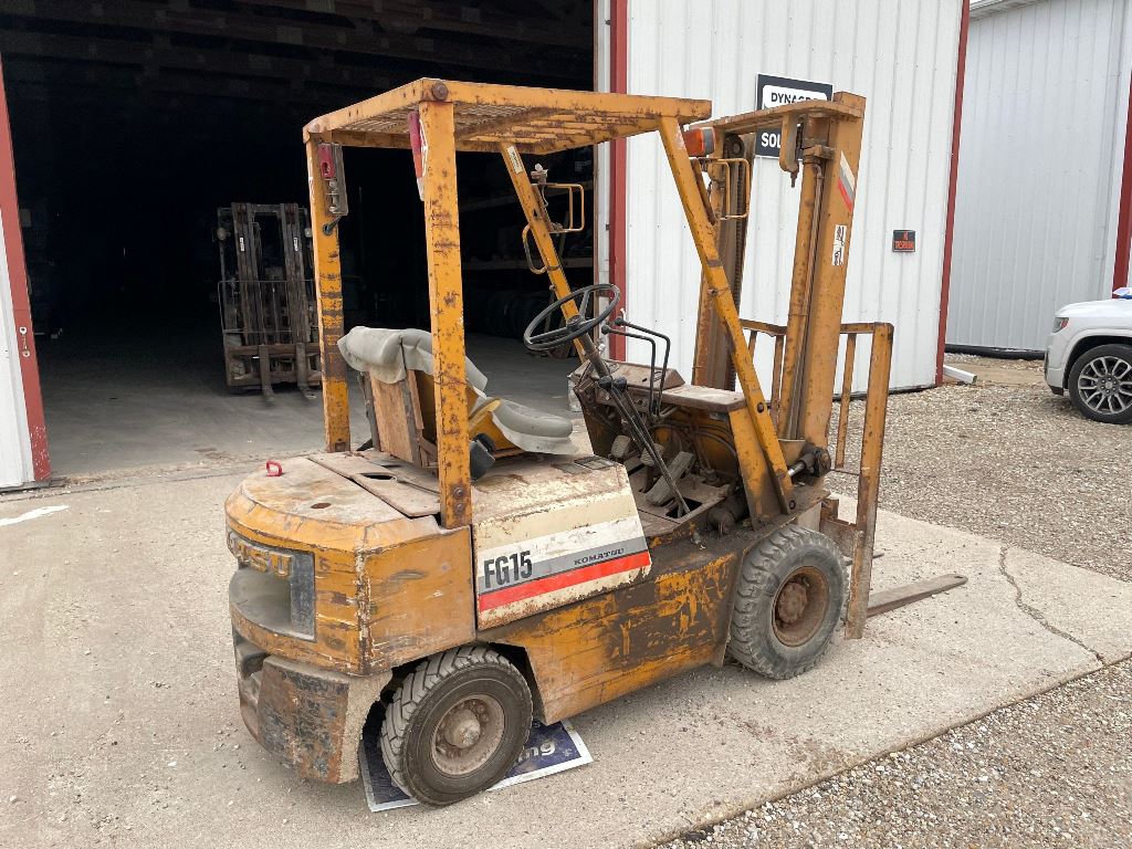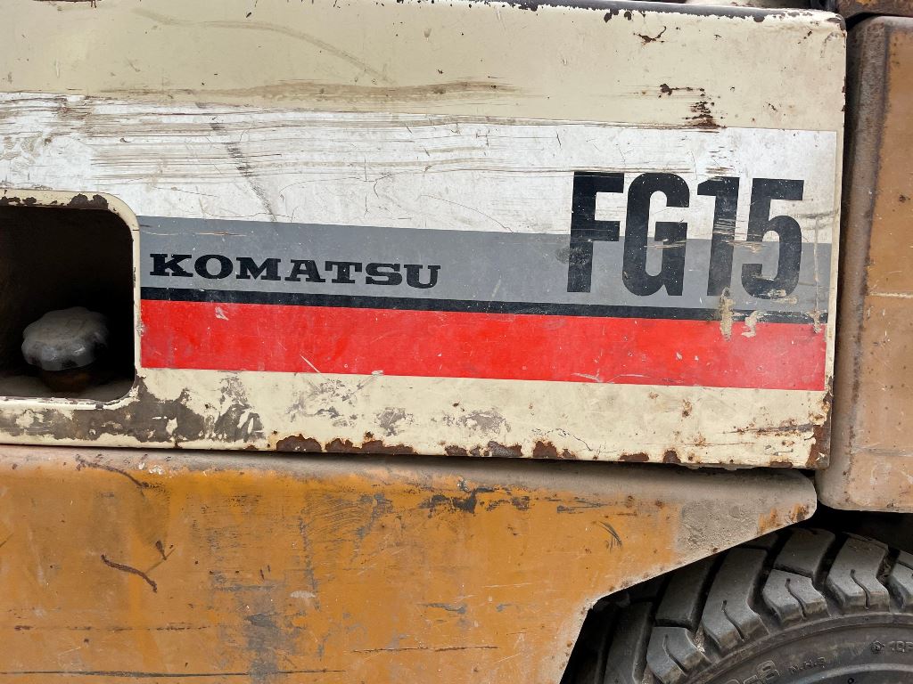 1986 Komatsu FG15 - 14 Forklift (GP2428, Unit 104362), gas engine, shuttle shift transmission, canopy, lights, forks, 6.50-10 front tires, 5.00-8 rear tires, shows 4,683 hours.
