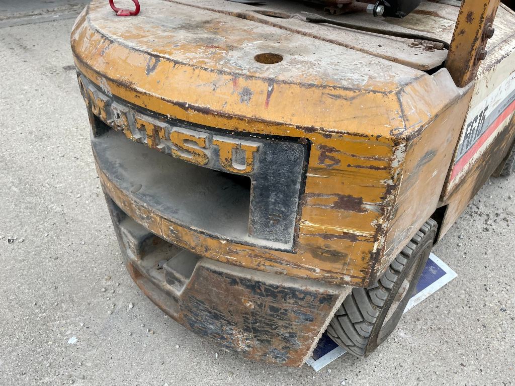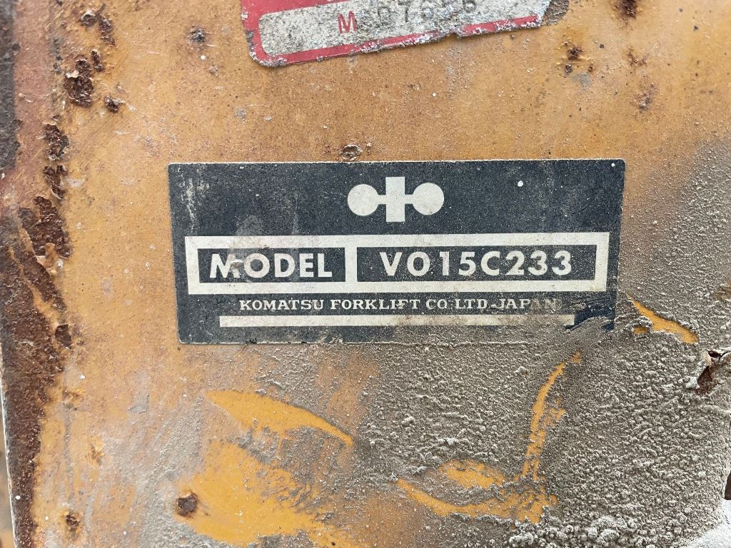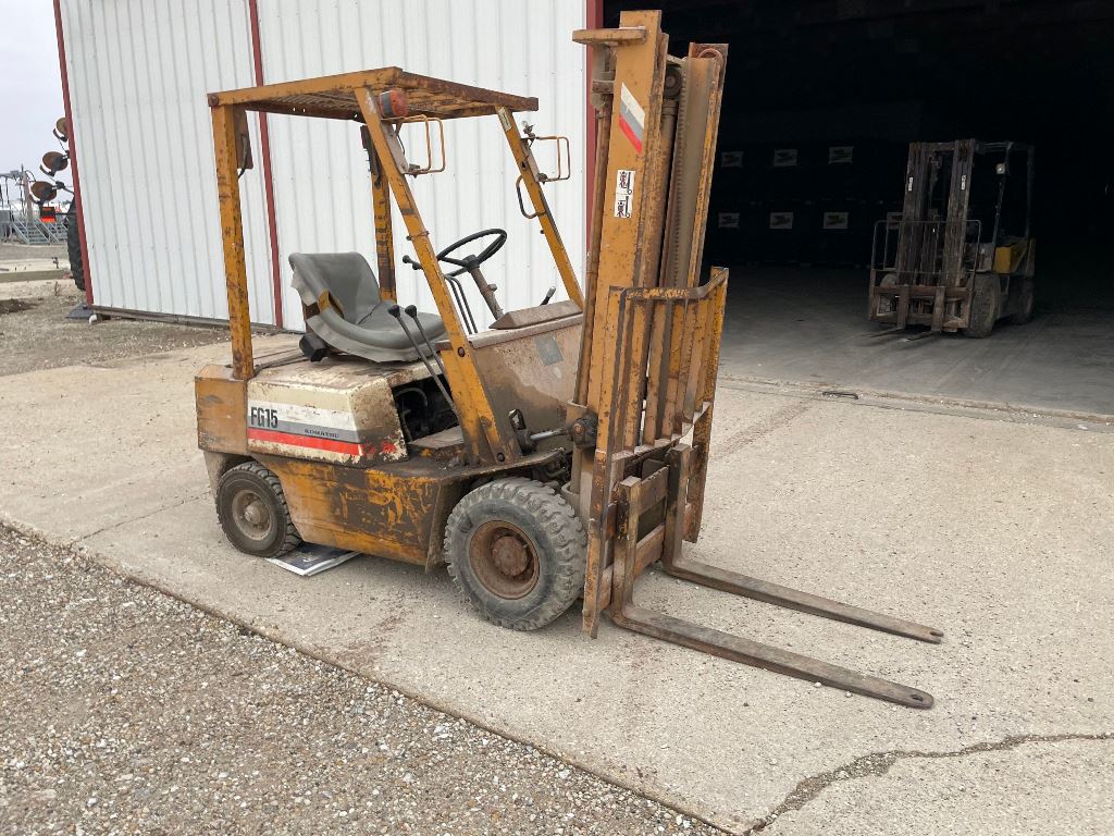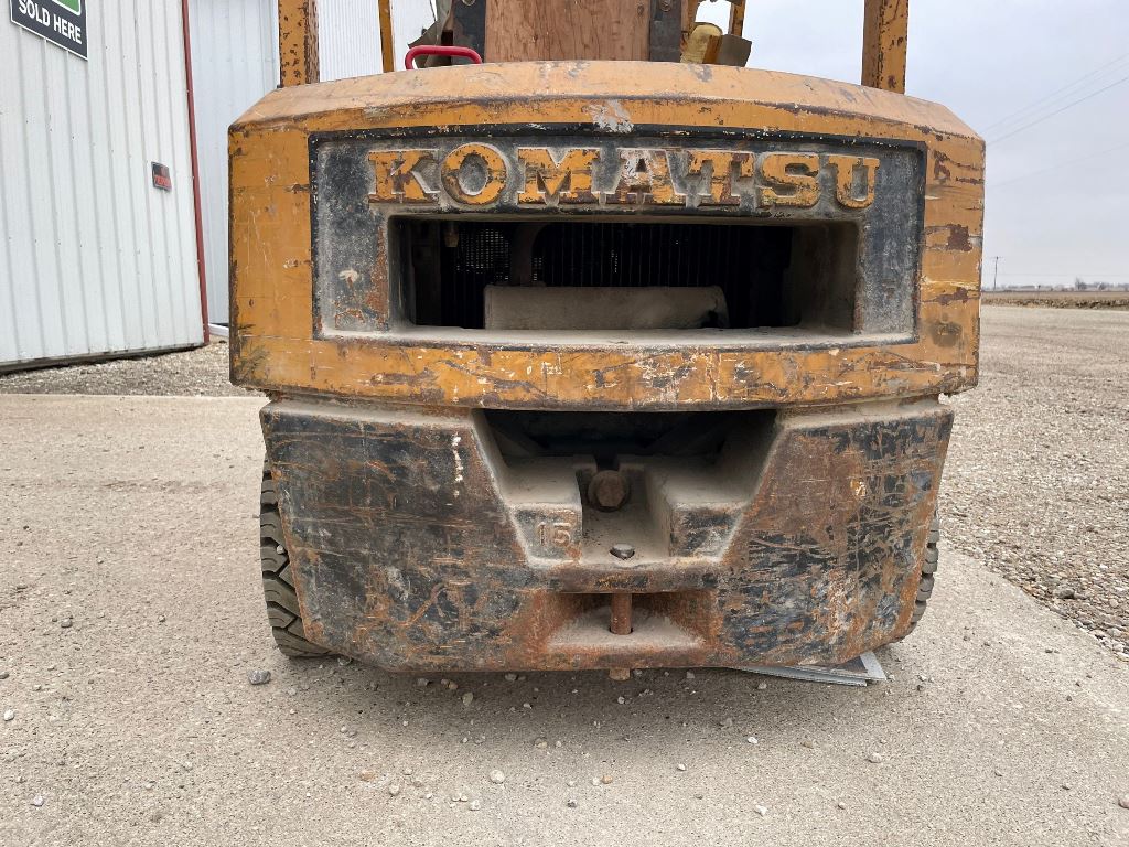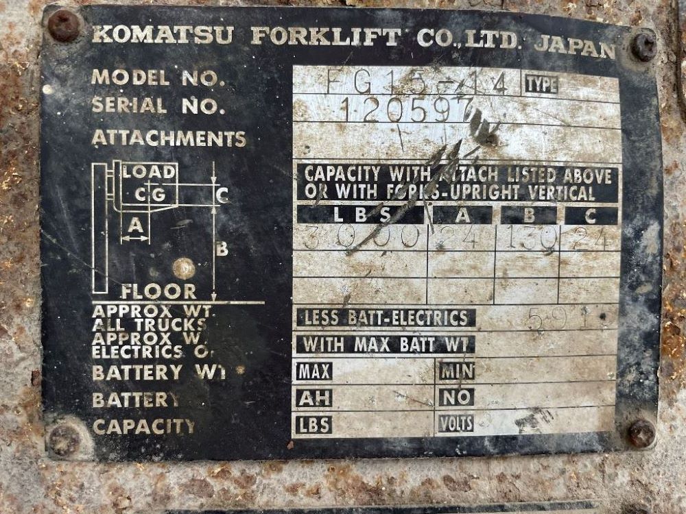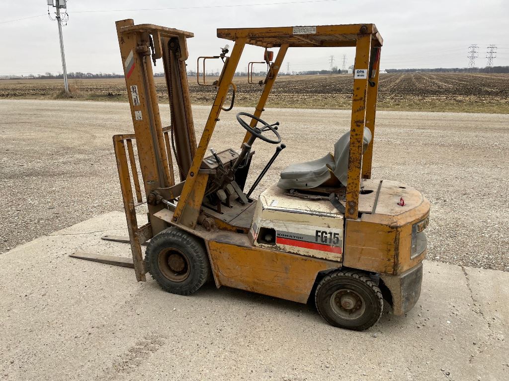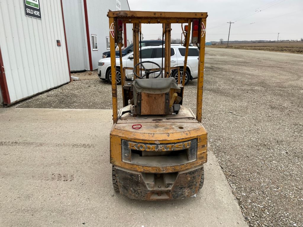 1986 Komatsu FG15 - 14 Forklift (GP2428, Unit 104362), gas engine, shuttle shift transmission, canopy, lights, forks, 6.50-10 front tires, 5.00-8 rear tires, shows 4,683 hours.
