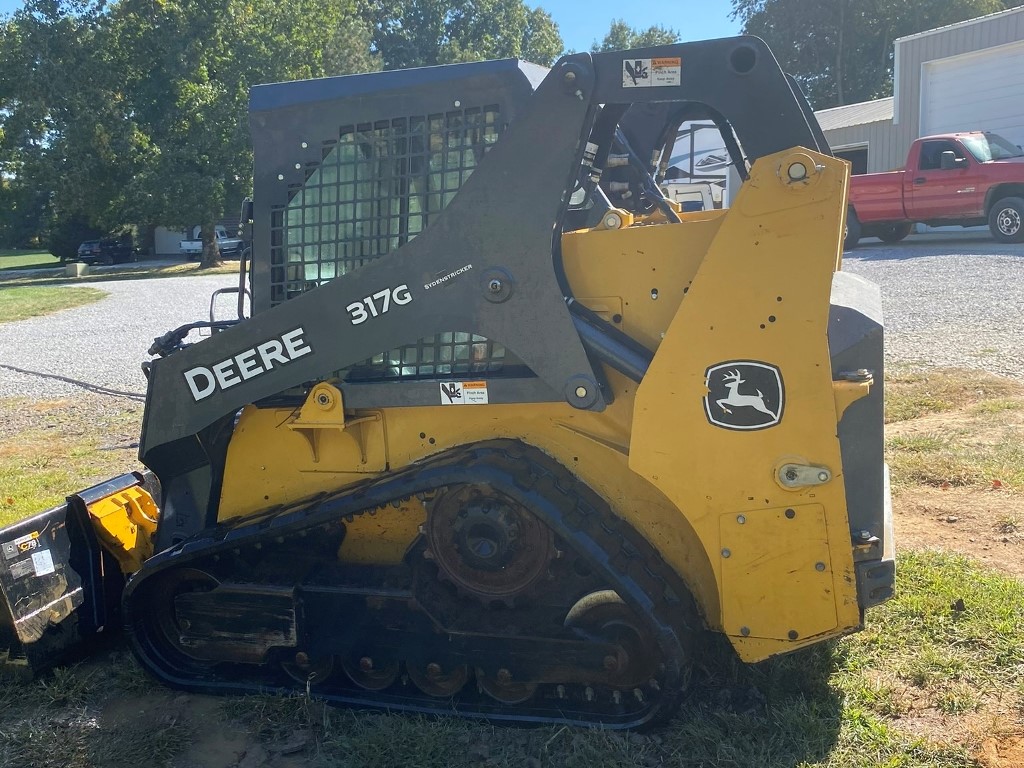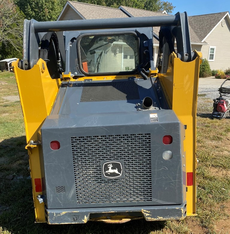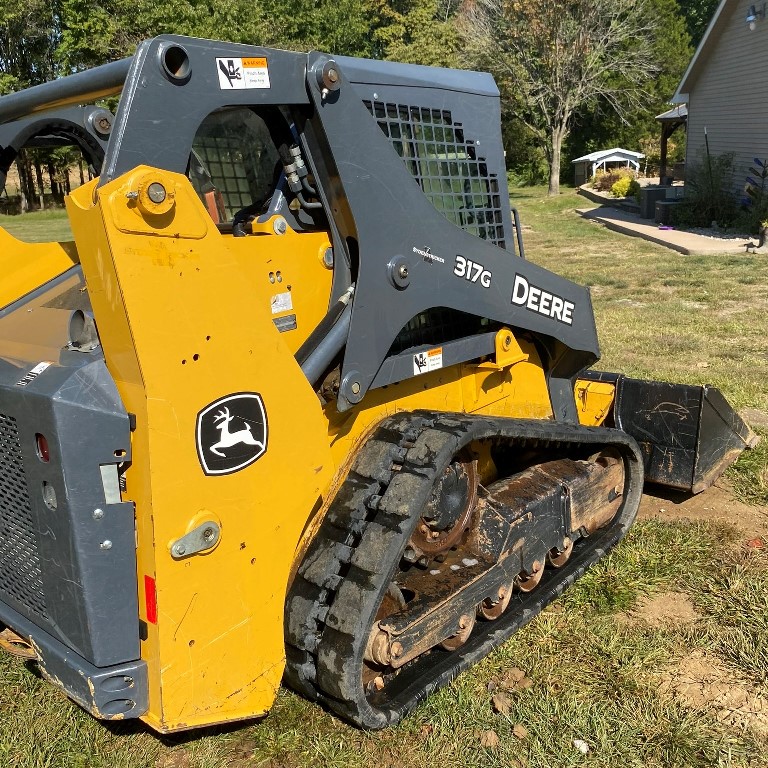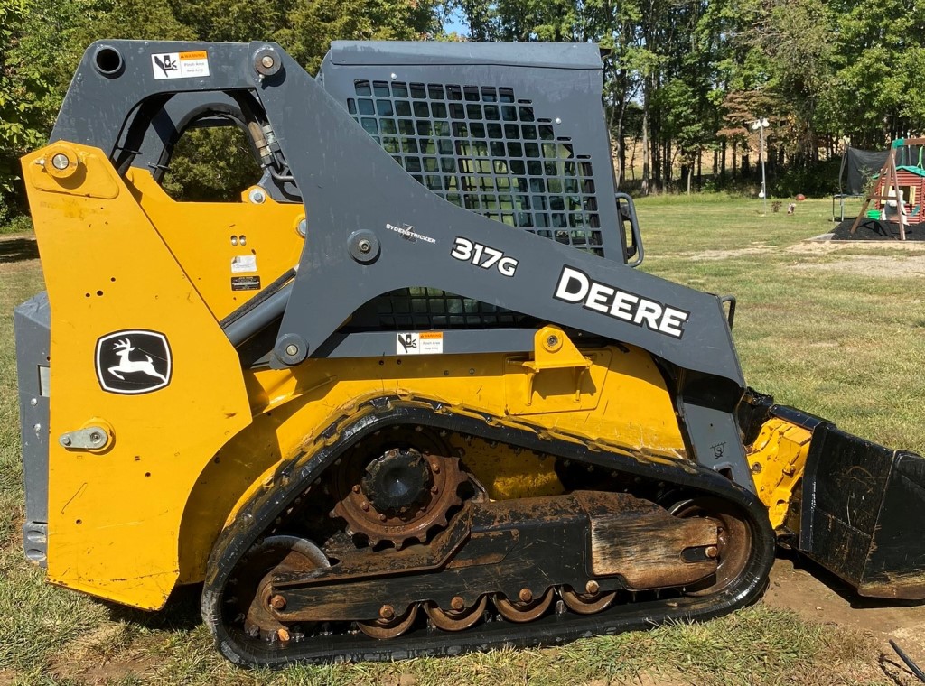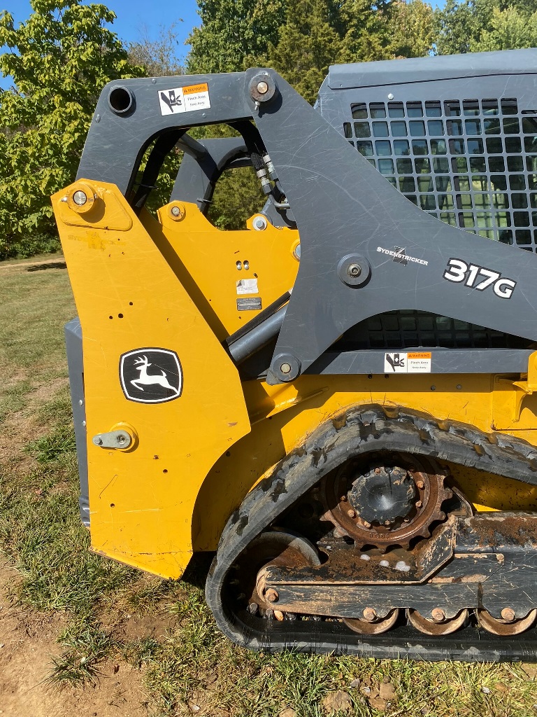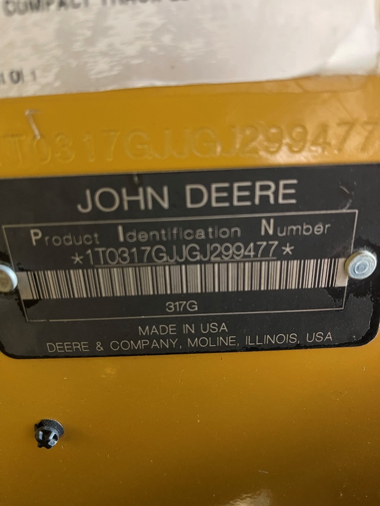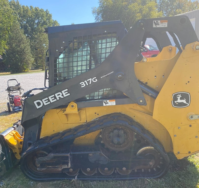 2016 John Deere 317G Skid Loader (LD1258), diesel engine, joystick pilot controls, auxiliary hydraulic hookup, air ride seat, air conditioning, heat, smooth bucket included, shows 877 hours.
