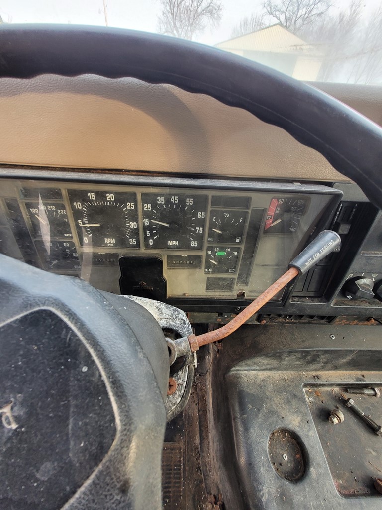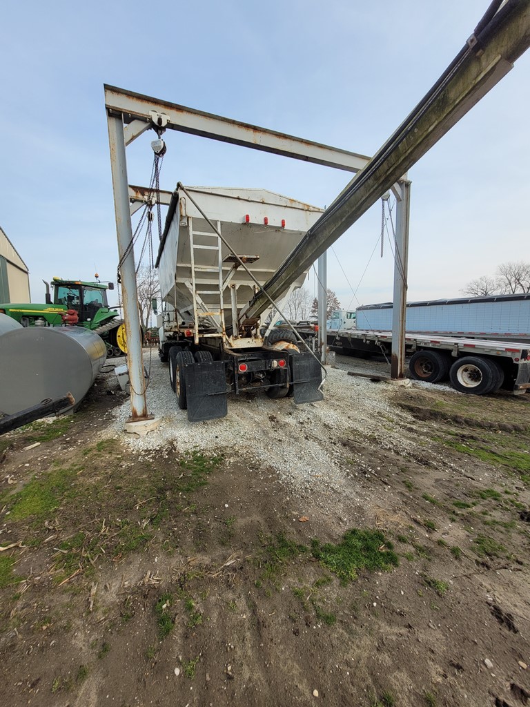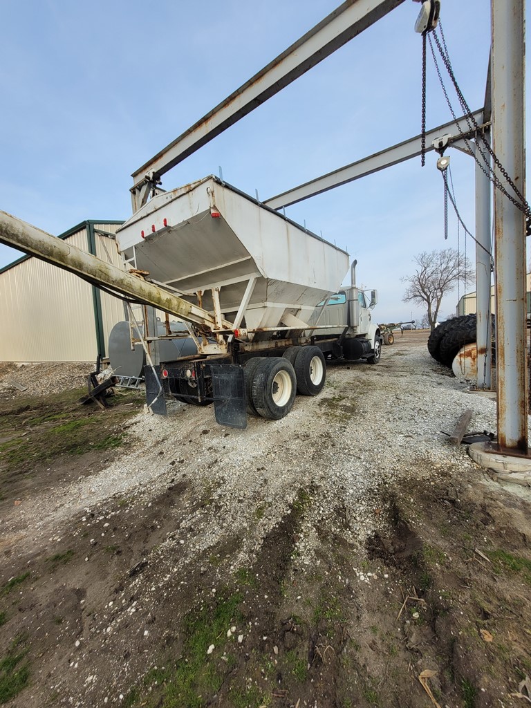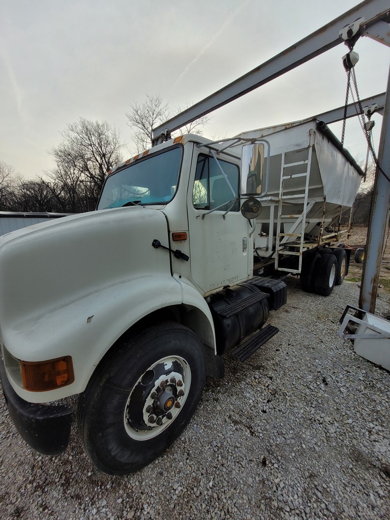 1995 International 8100 Dry Tender Truck (NP3408), Cummins M11 diesel engine, 9 speed transmission, tandem axle, Western 14 ton dry tender box, rear discharge auger, shows 387,687 miles.