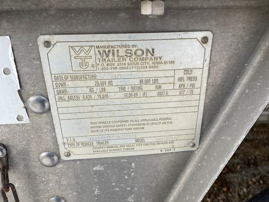2008 Wilson Commander DWH-501C Grain Trailer (MN400), model Commander DWH-501C, 41ft long, double hopper, tandem axle, spring ride suspension, air brakes, GVWR 65,000lbs., Shurco Shur-Lok 4500HD electric roll-over tarp, NEW tarp, front and rear ladders, front and rear platforms, landing gear, 11R24.5 tires.