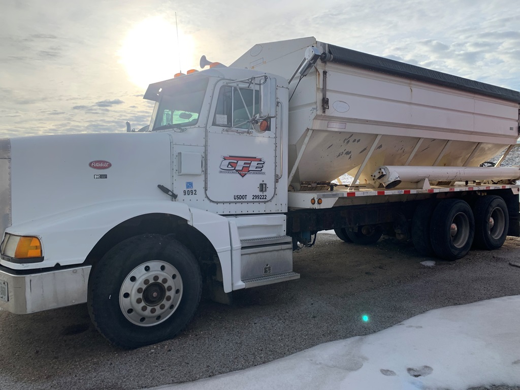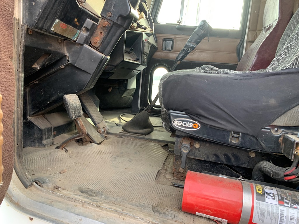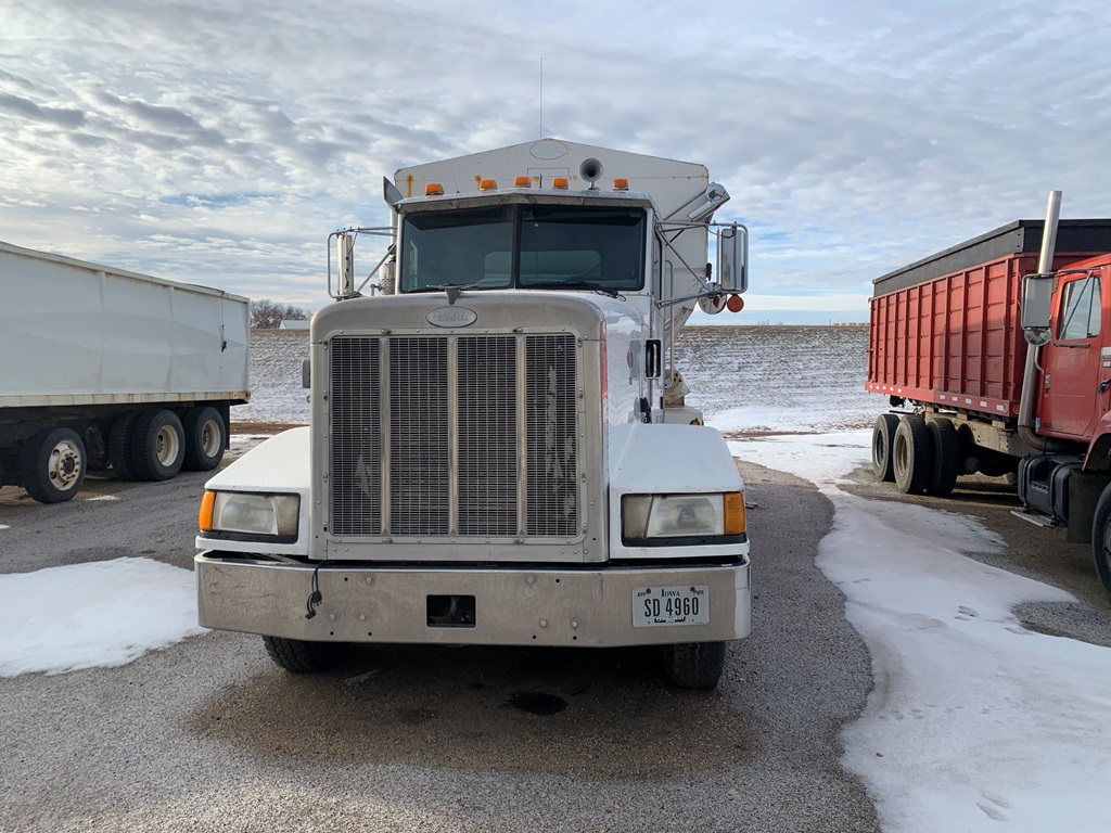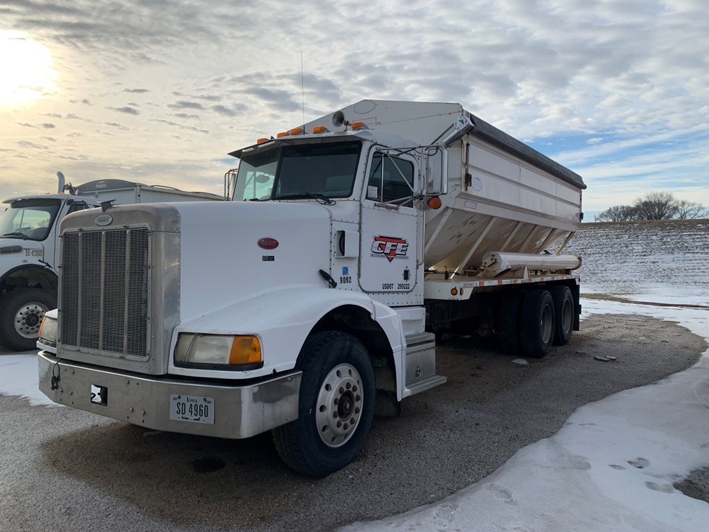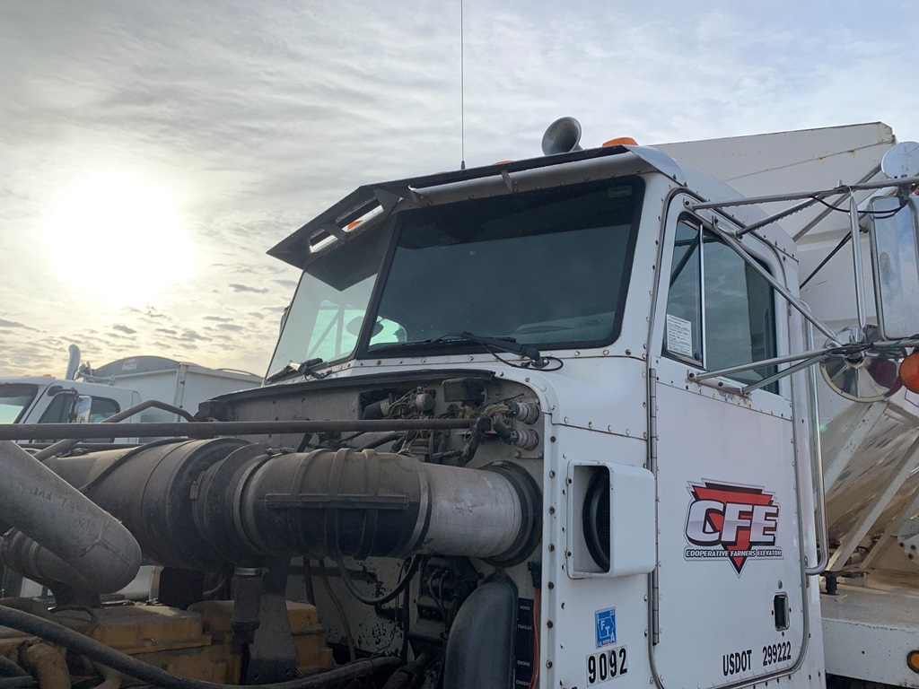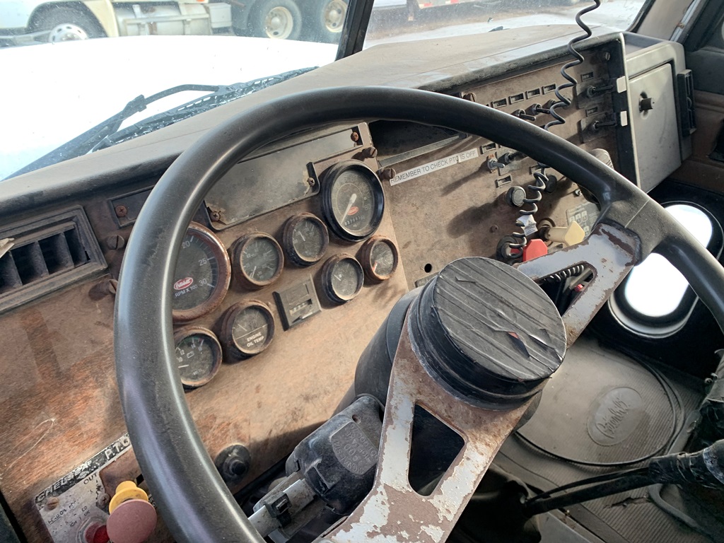1991 Peterbilt 377 Day Cab Tender Truck (CP0258), Cat 3176 engine, 9 speed transmission, Rayman 16 ton side shooter, air ride suspension, 11R22.5 tires, 837,083 miles.