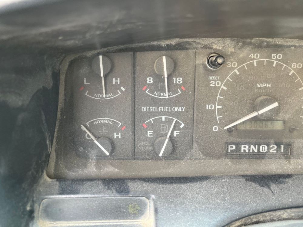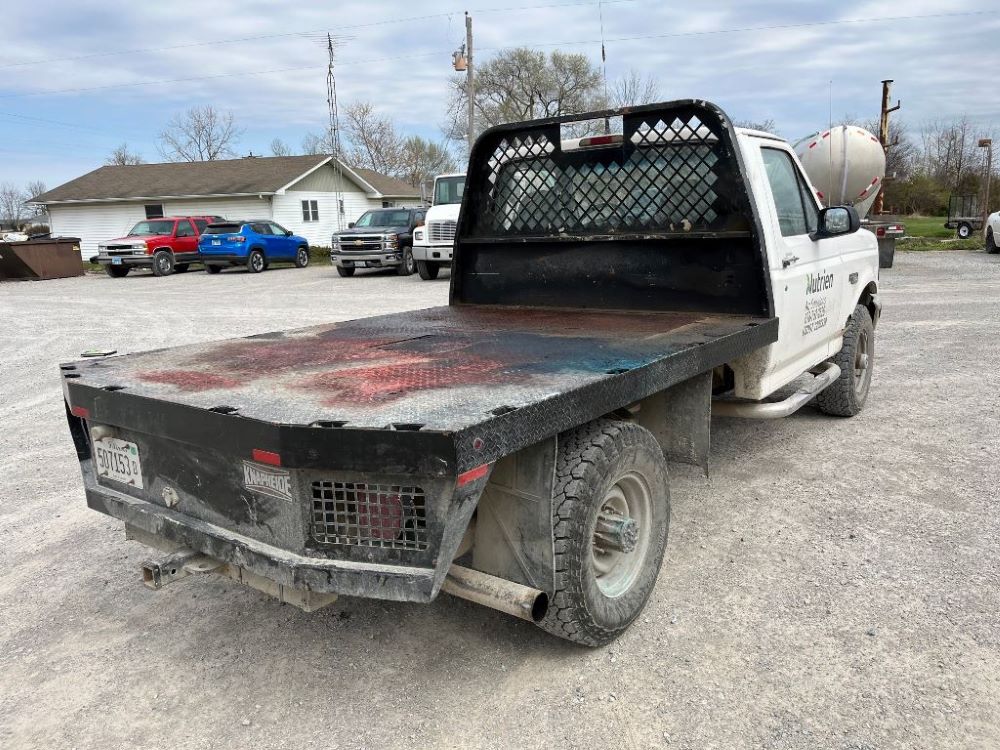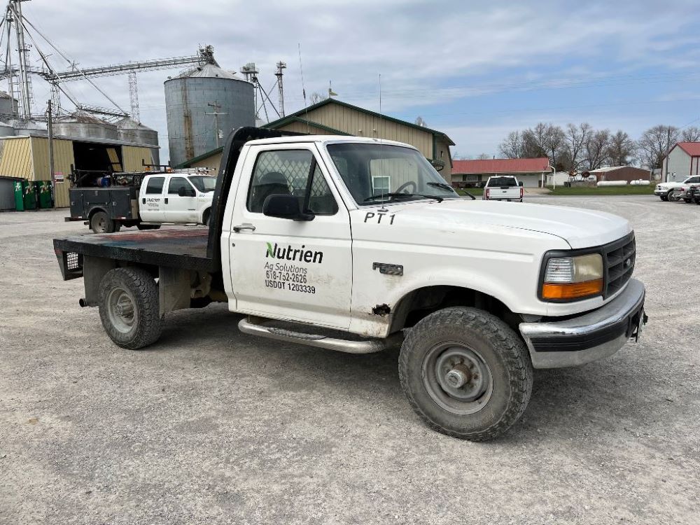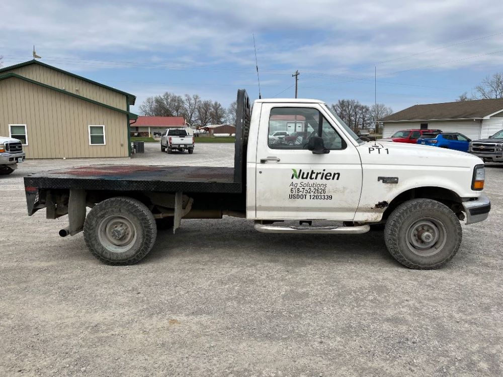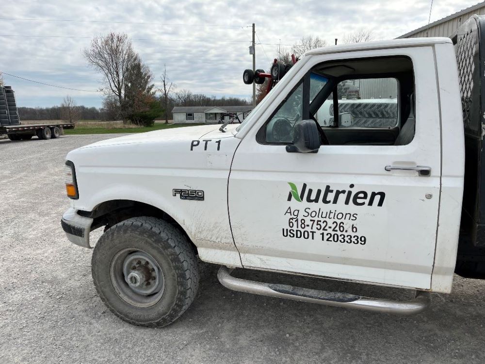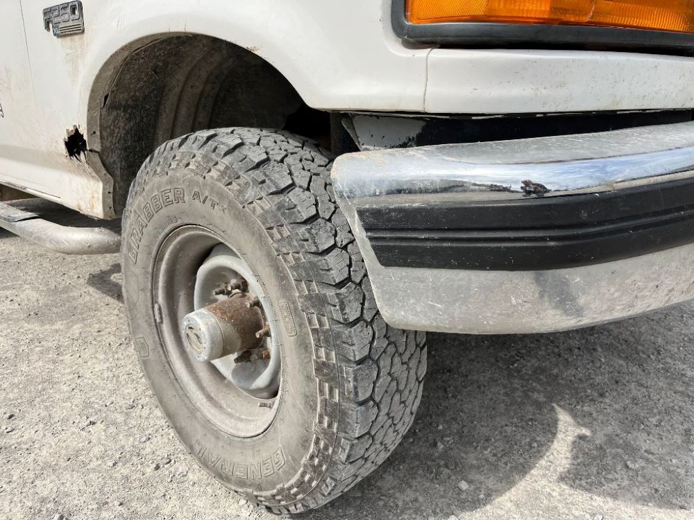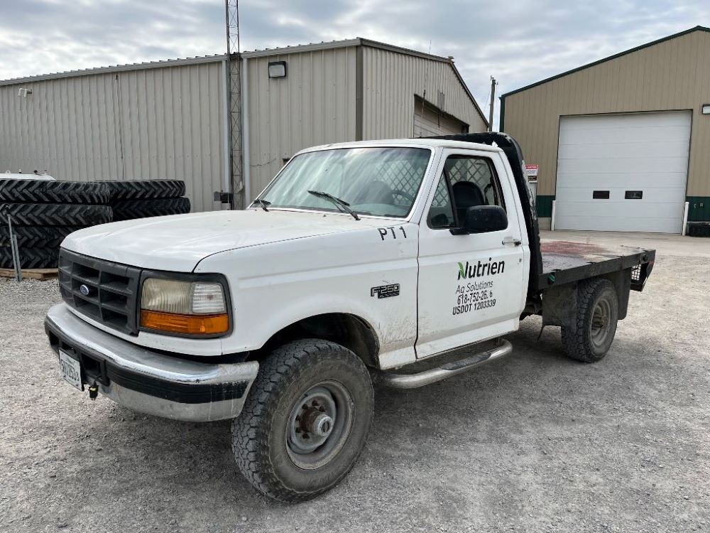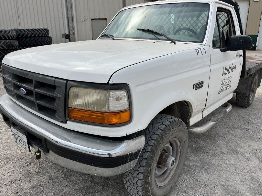1995 Ford F250XL Flatbed (DB0146, Unit 121540), 4x4, diesel engine, automatic transmission, air conditioning, heat, Am/Fm radio, cruise control, single axle, running boards, rear hitch, Knapheide steel flatbed, headache rack, 5th wheel ball, LT235/85R16 tires, shows 303,006 miles.
