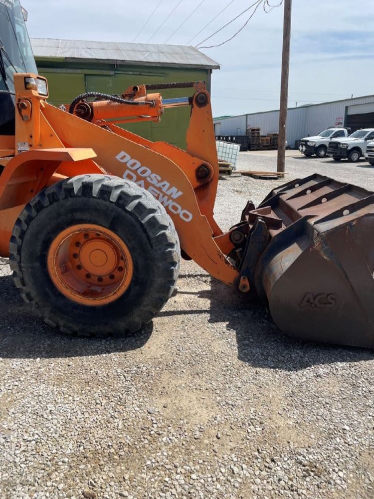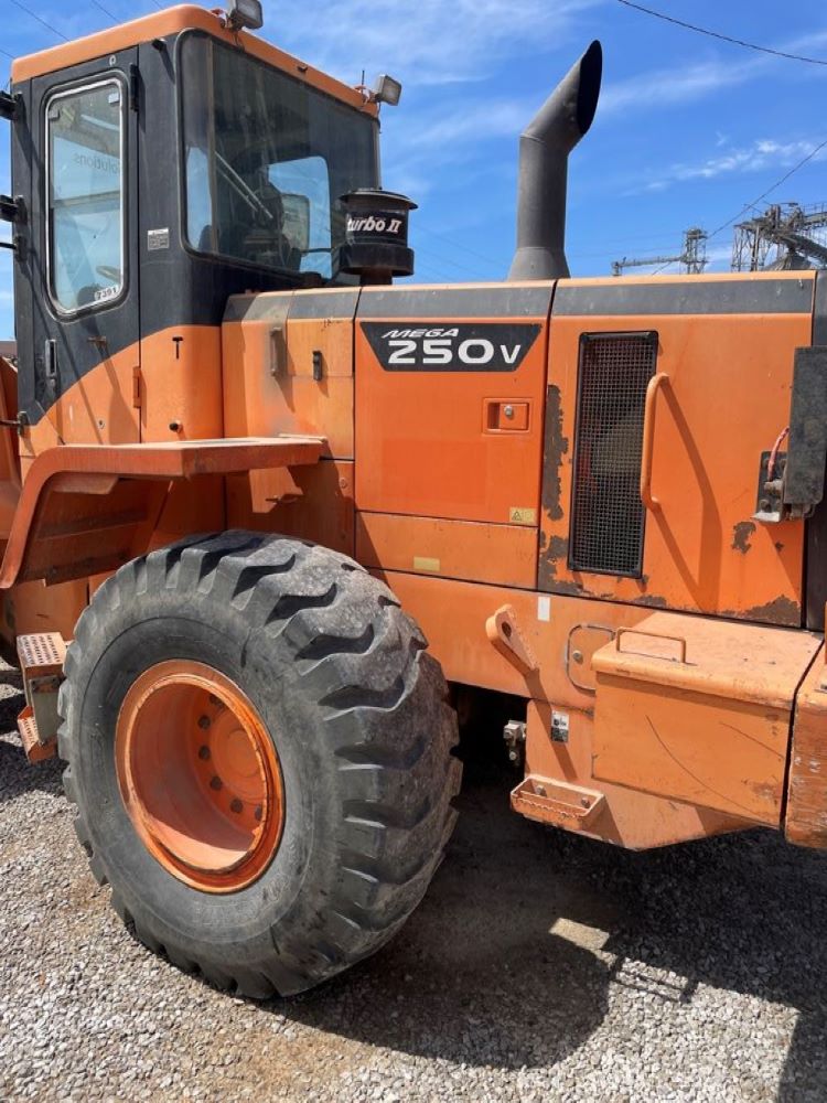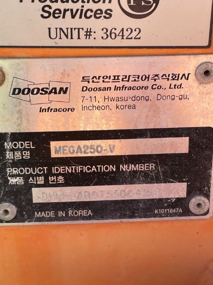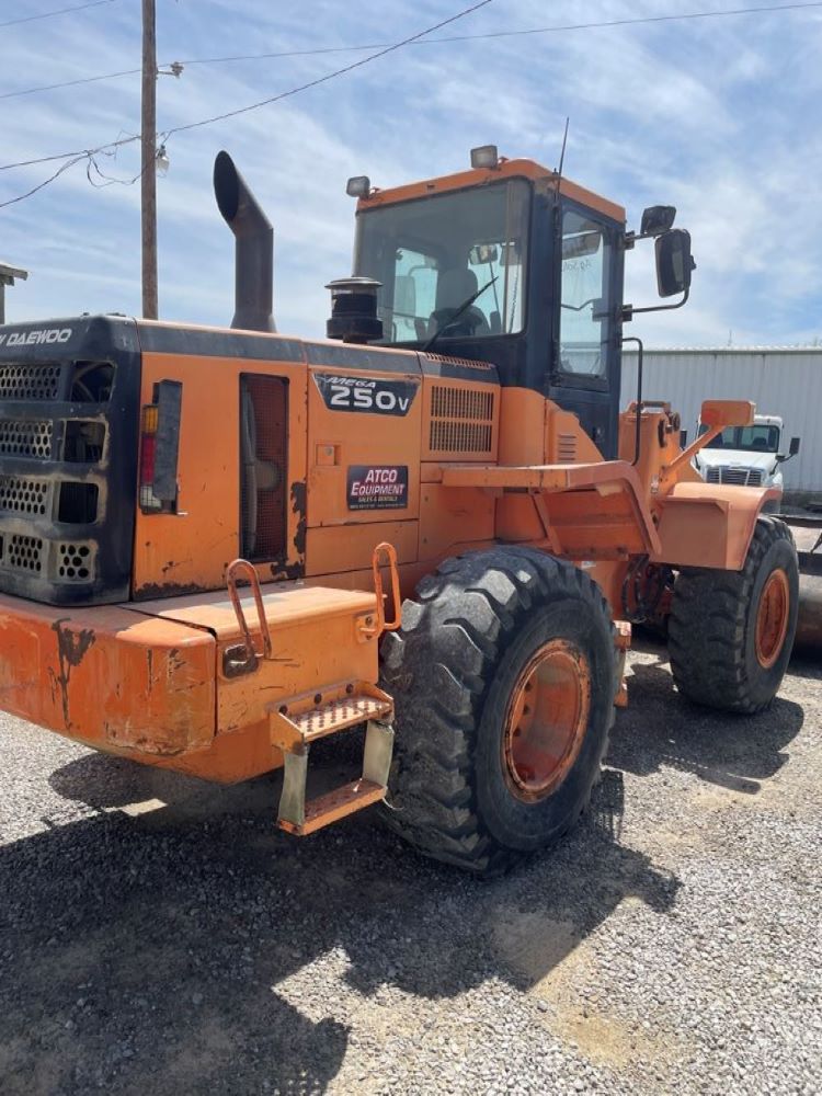 2006 Doosan Daewoo Mega 250V Loader (PZ12085, Unit 36422), diesel engine, shuttle shift transmission, cab, lights, heat, ACS bucket, ACS forks, 20.5-25 tires, shows 4,332 hours.