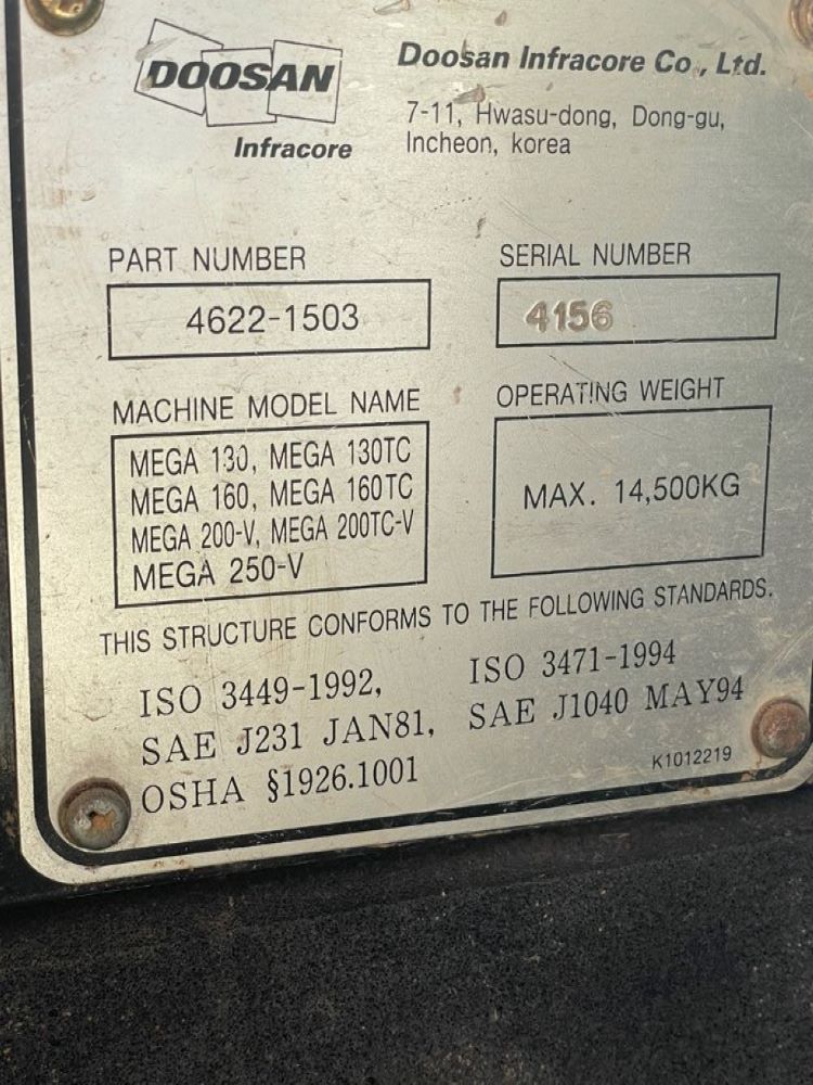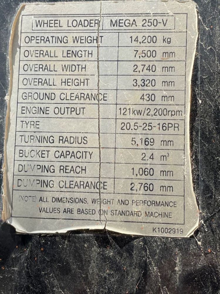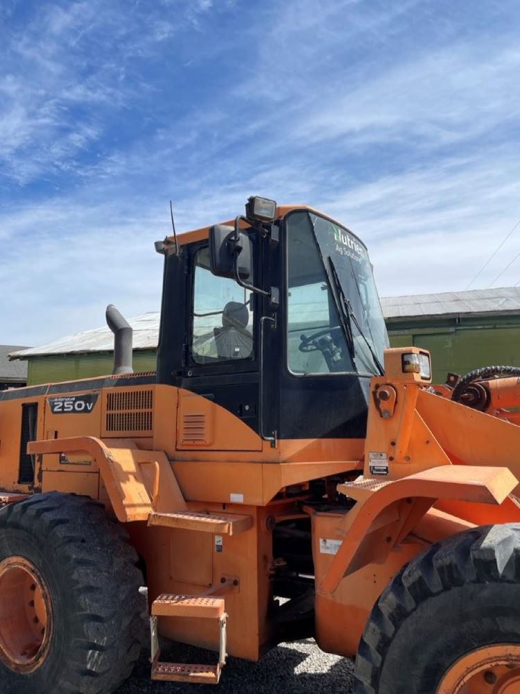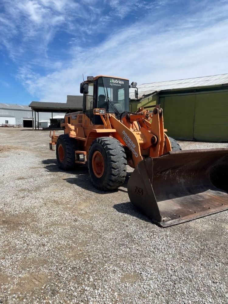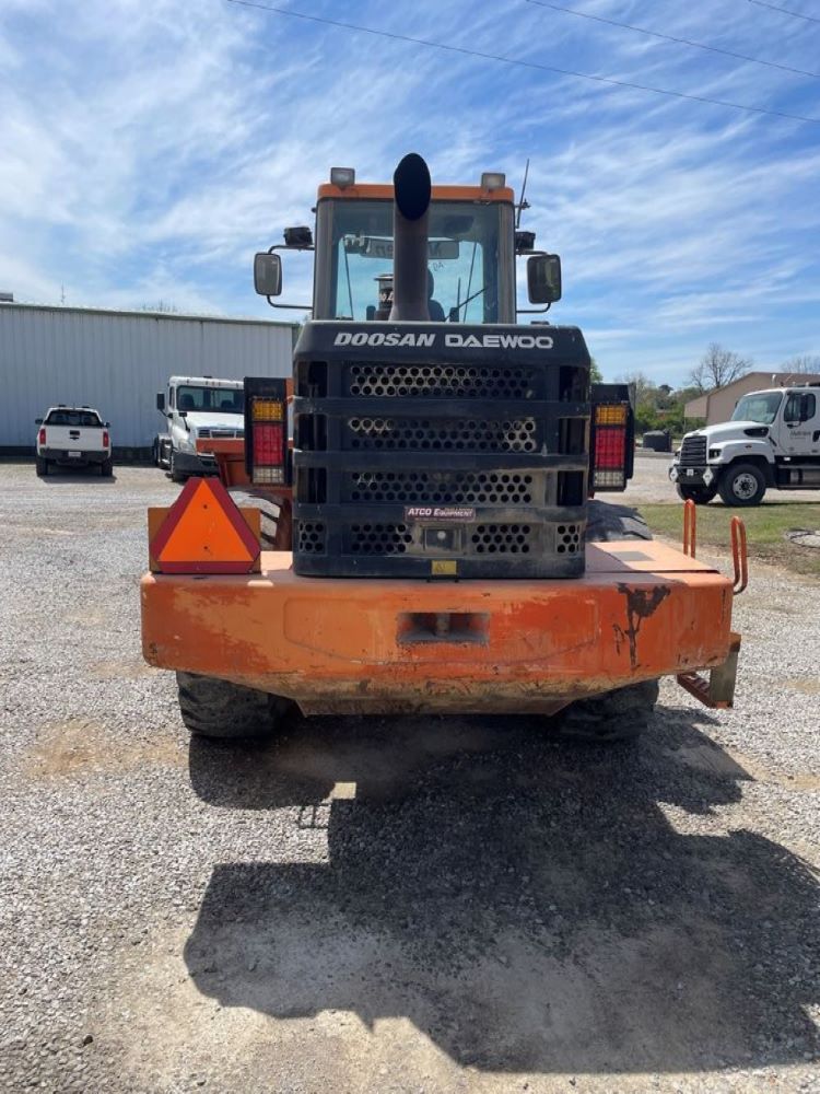 2006 Doosan Daewoo Mega 250V Loader (PZ12085, Unit 36422), diesel engine, shuttle shift transmission, cab, lights, heat, ACS bucket, ACS forks, 20.5-25 tires, shows 4,332 hours.