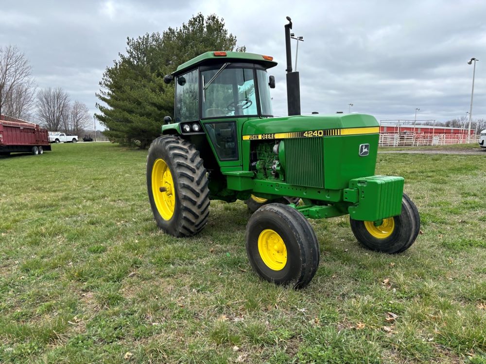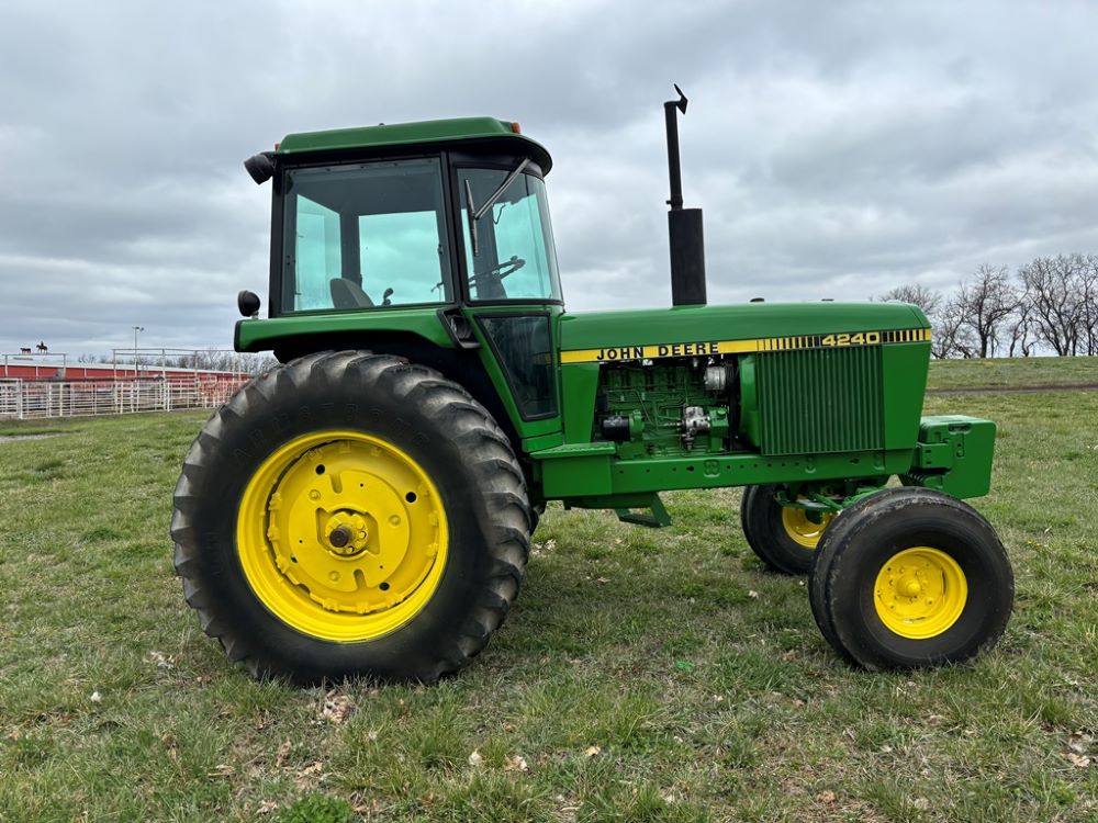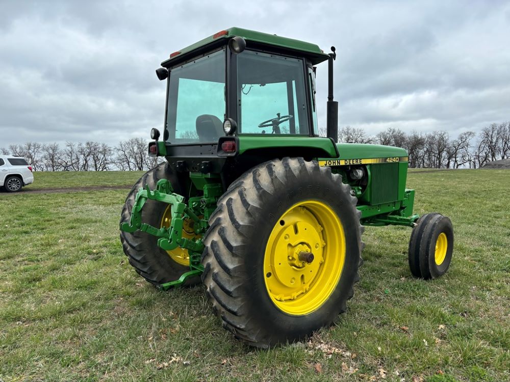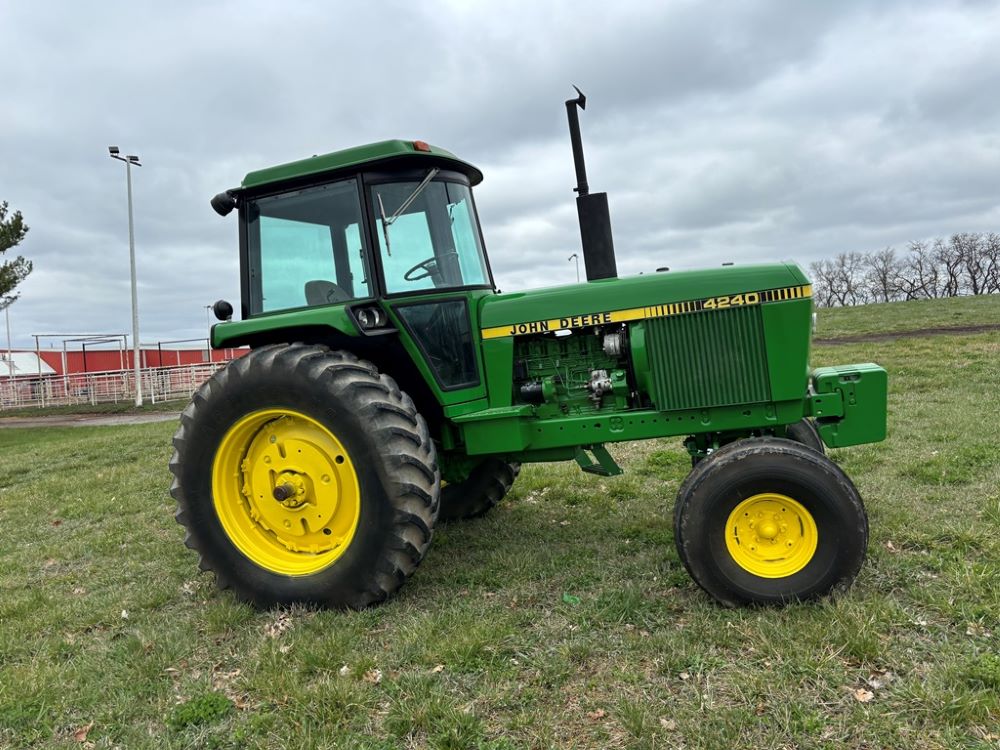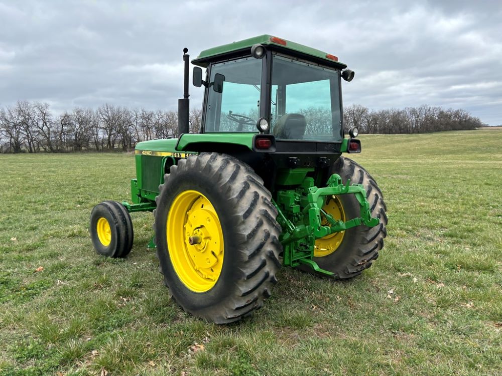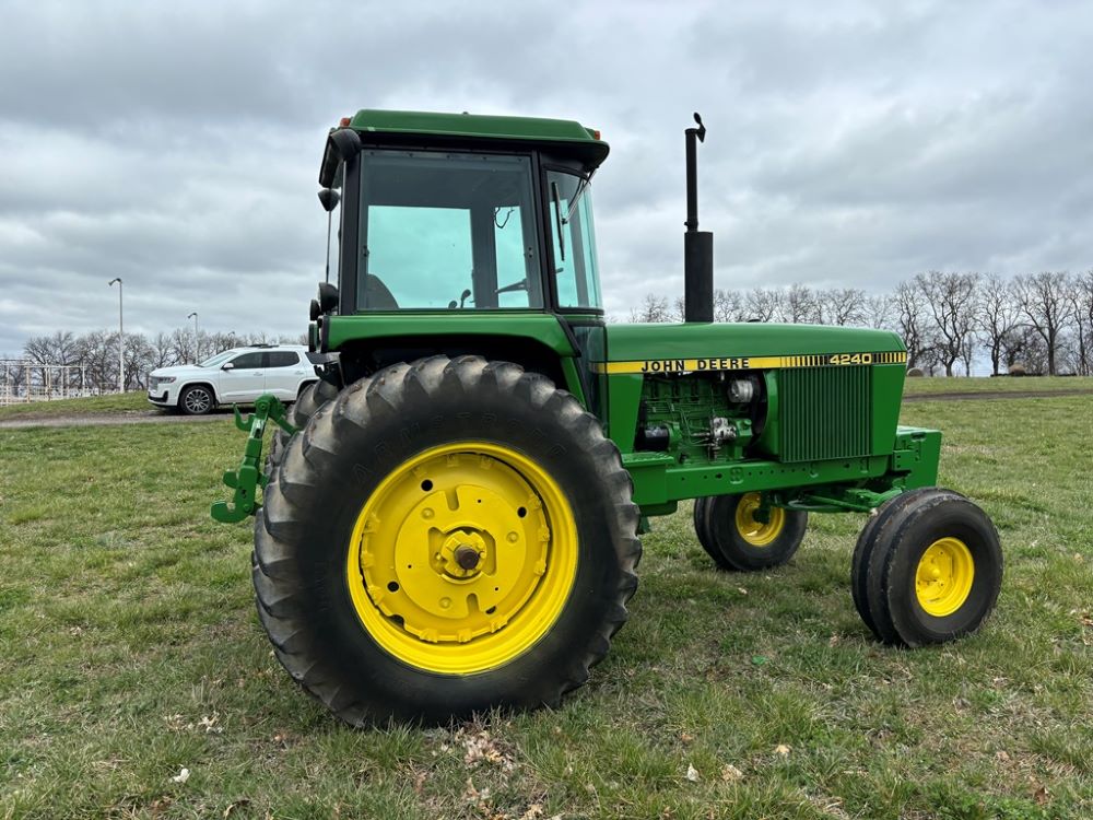 John Deere 4240 Tractor (GP6945), cab, John Deere diesel engine (S/N 6466DR-02 060828RG), Power Shift transmission, heat, air conditioning, quick hitch, 540 PTO, 3 port hydraulics, (8) 45KG front suitcase weights, 11.00-16 front tires, 18.4R38 rear tires, 3,725 ACTUAL HOURS.