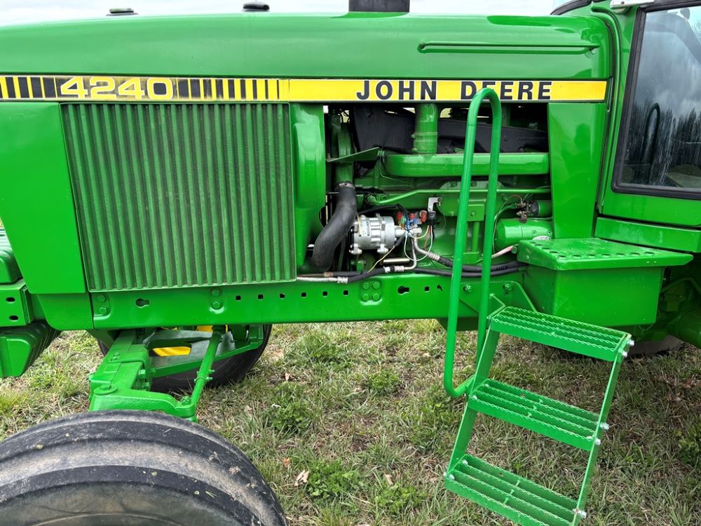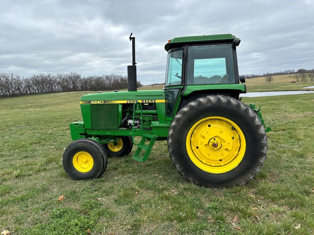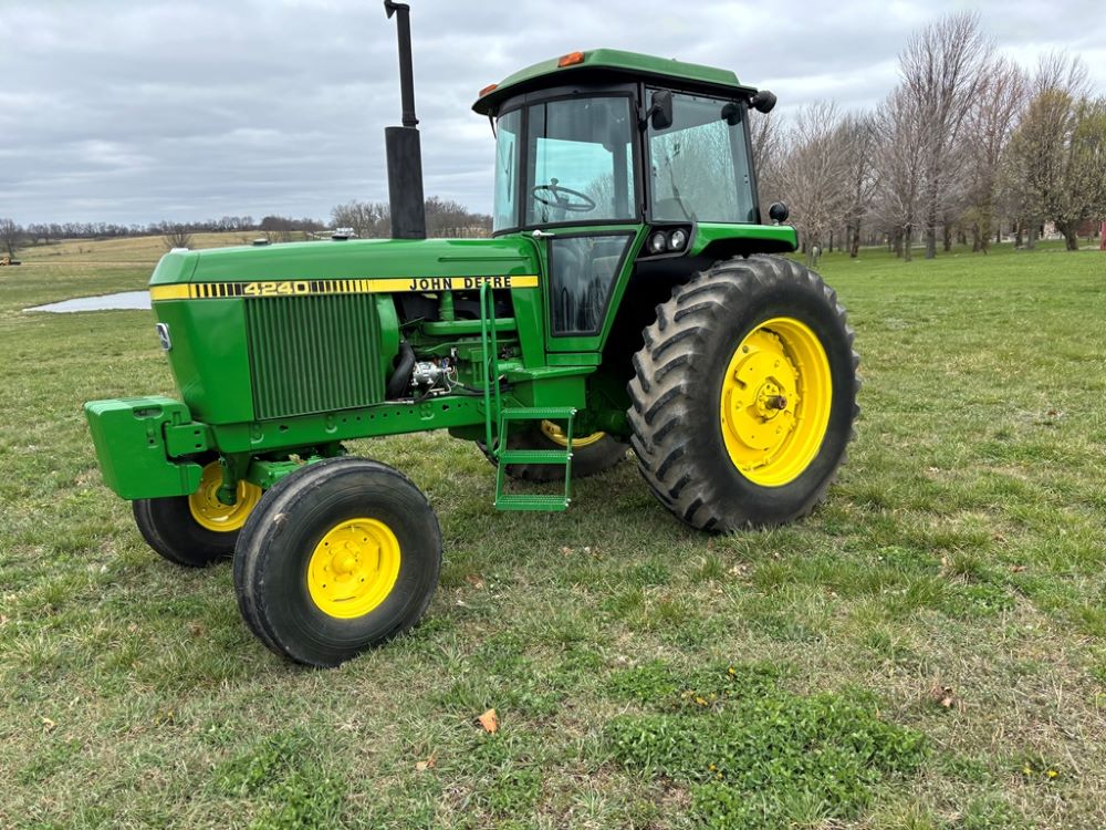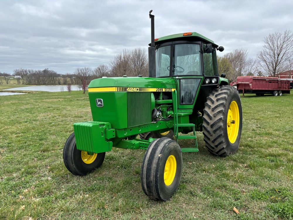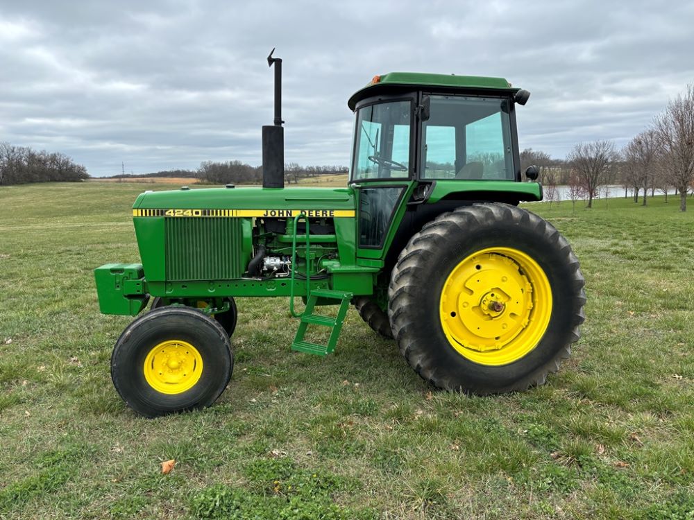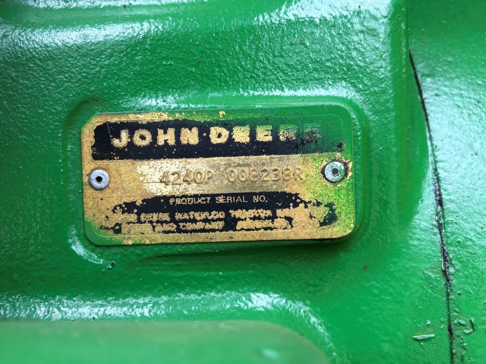 John Deere 4240 Tractor (GP6945), cab, John Deere diesel engine (S/N 6466DR-02 060828RG), Power Shift transmission, heat, air conditioning, quick hitch, 540 PTO, 3 port hydraulics, (8) 45KG front suitcase weights, 11.00-16 front tires, 18.4R38 rear tires, 3,725 ACTUAL HOURS.