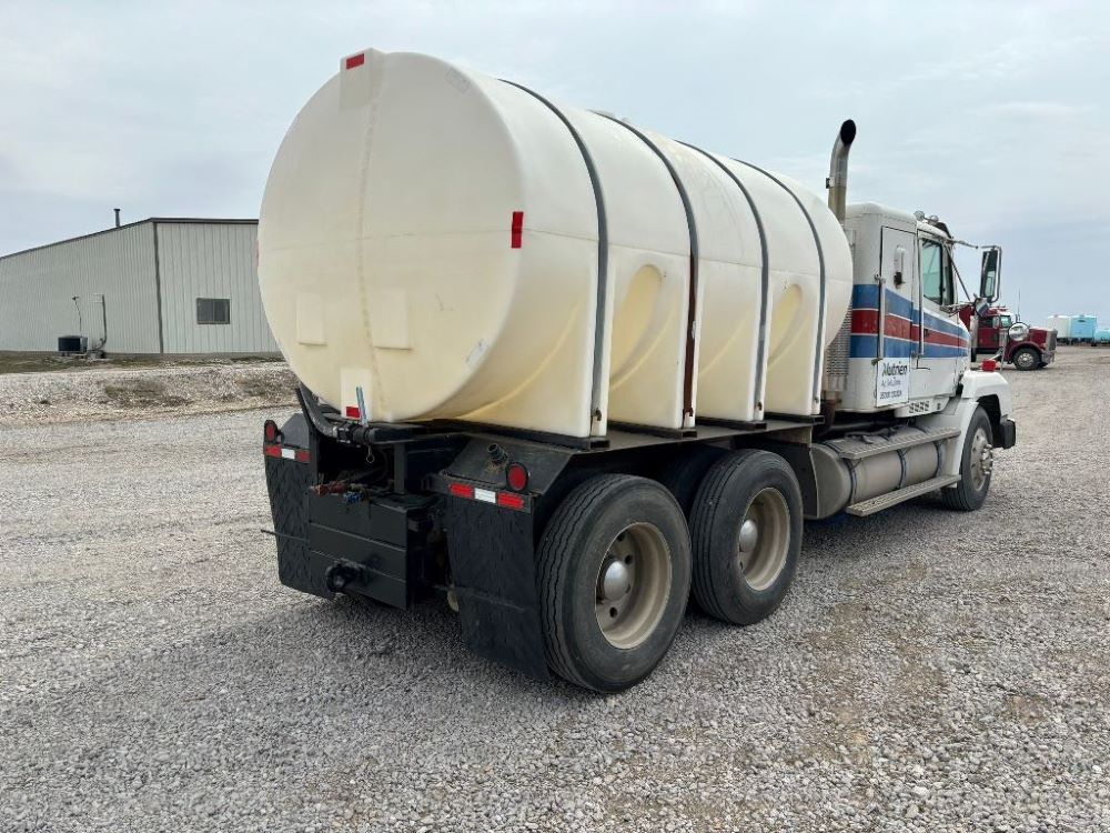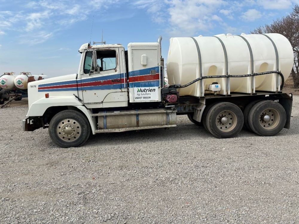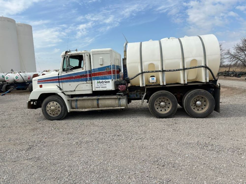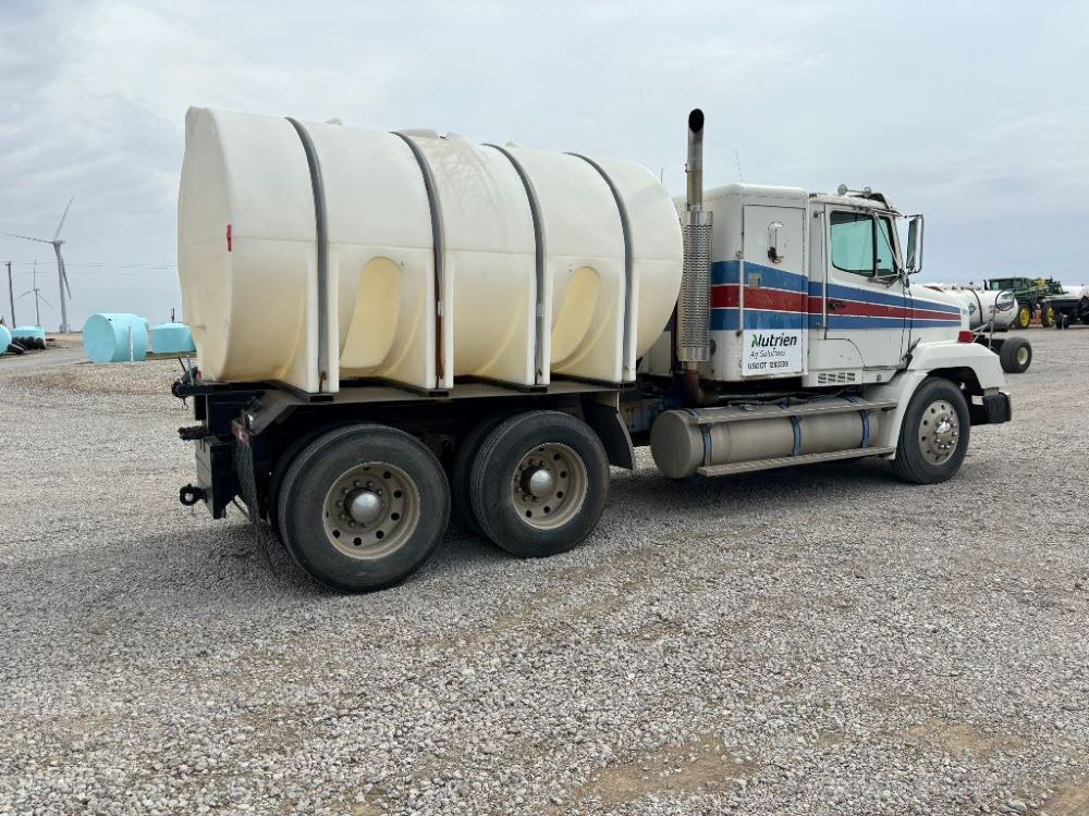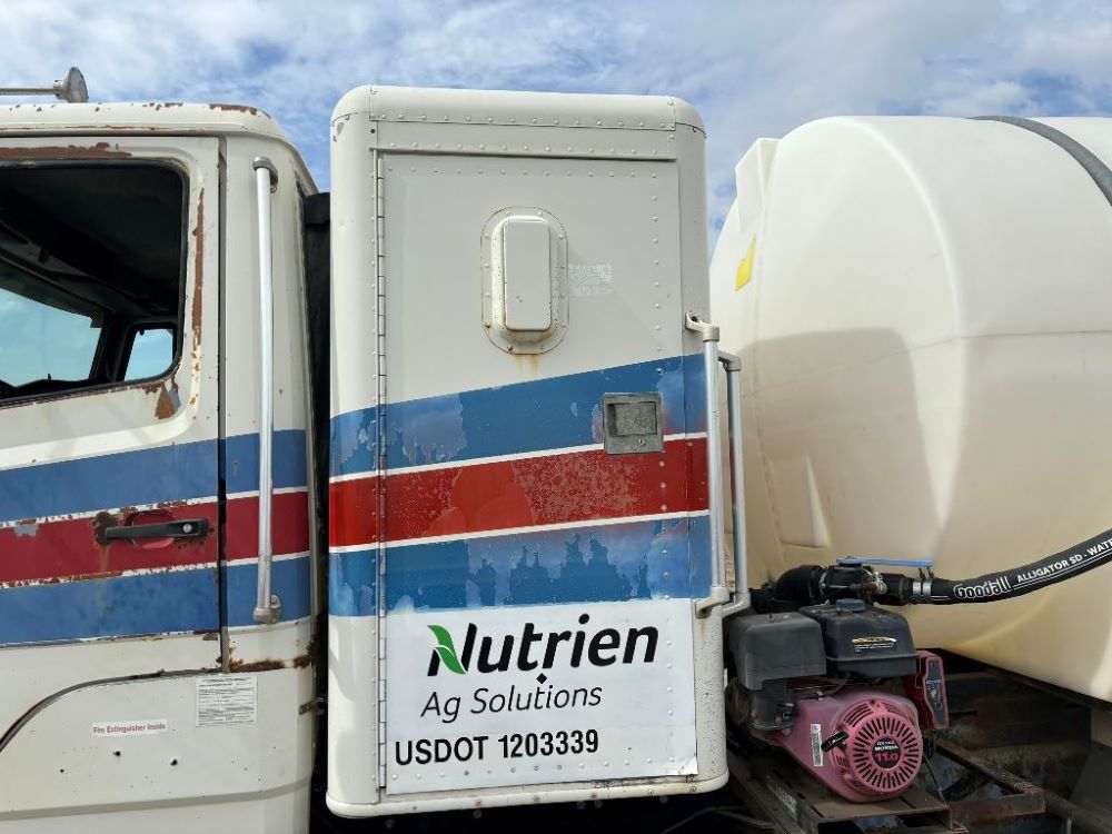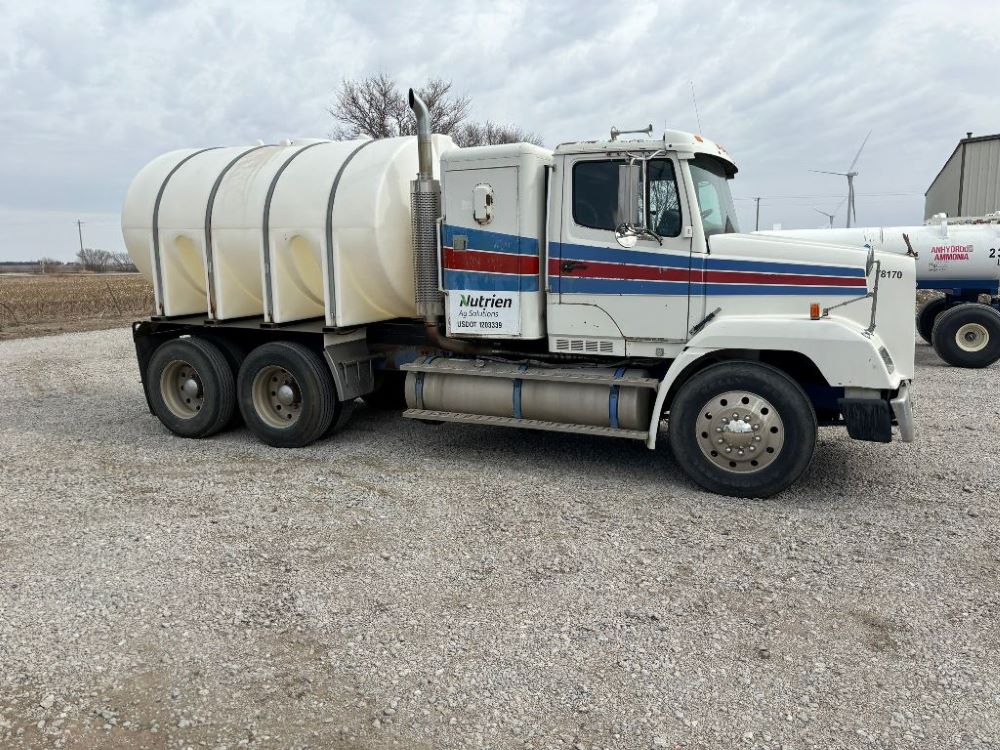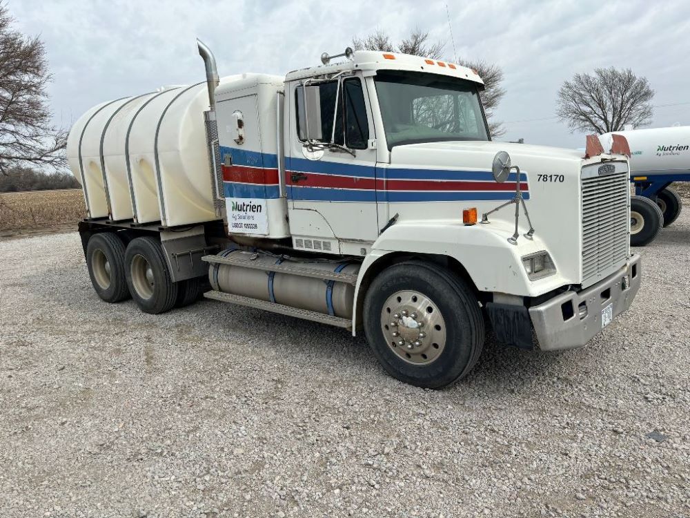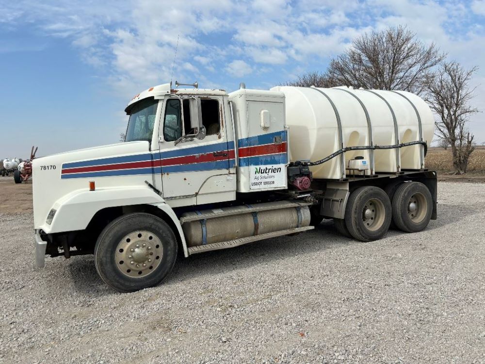 1988 Freightliner Liquid Nurse Truck (GP6728, Unit 78170), Cat 3306 10.5L diesel engine, Eaton Fuller Roadranger transmission, heat, tandem axle, spring suspension, approx. 3,000 gallon poly flat bottom liquid tank, Honda GX340 11.0HP electric start gas motor, pump, dual fuel tanks, single exhaust, 11R24.5 tires.