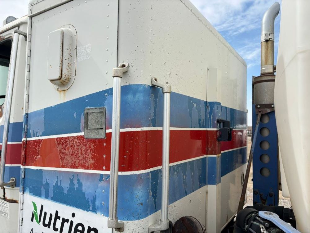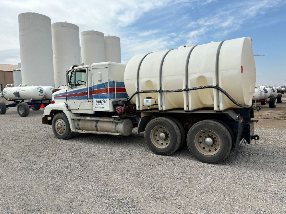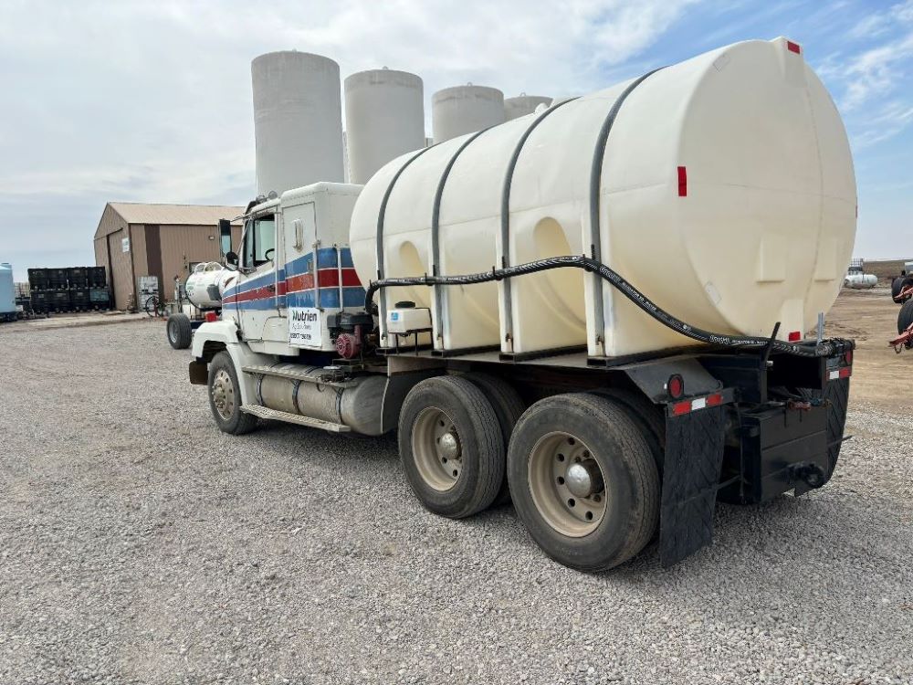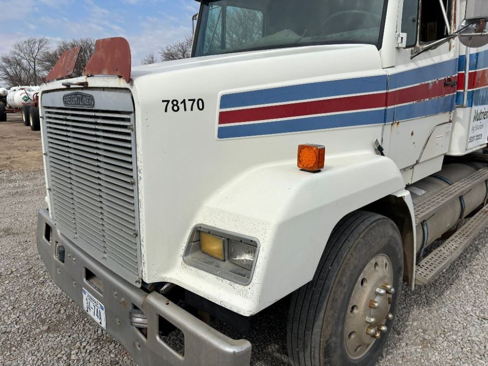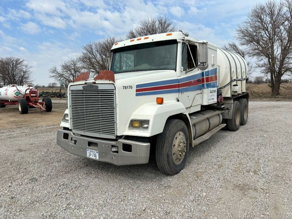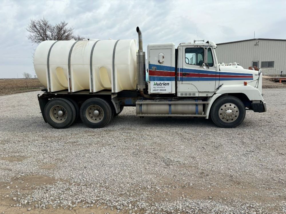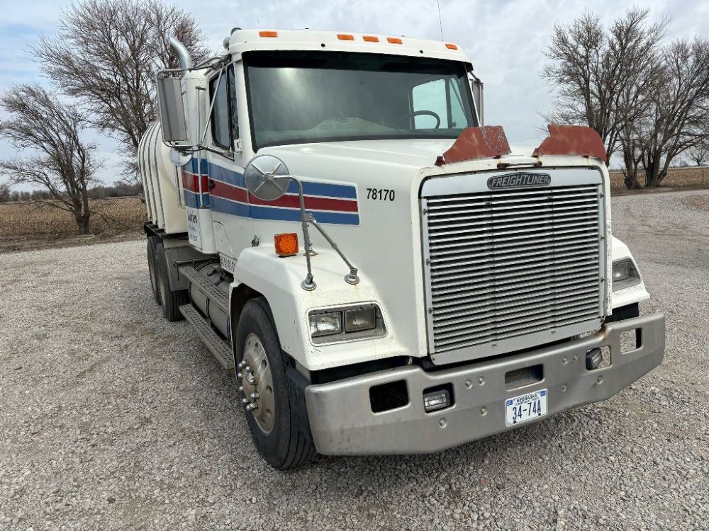 1988 Freightliner Liquid Nurse Truck (GP6728, Unit 78170), Cat 3306 10.5L diesel engine, Eaton Fuller Roadranger transmission, heat, tandem axle, spring suspension, approx. 3,000 gallon poly flat bottom liquid tank, Honda GX340 11.0HP electric start gas motor, pump, dual fuel tanks, single exhaust, 11R24.5 tires.