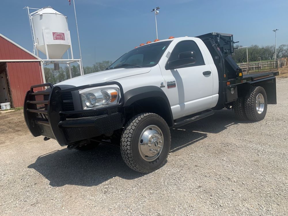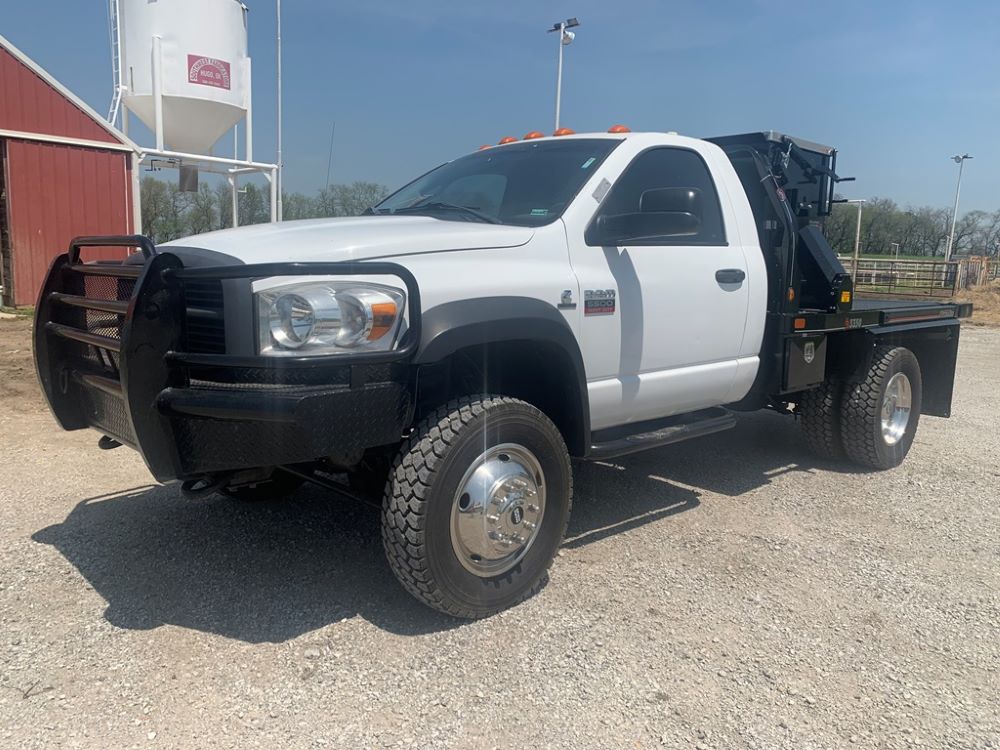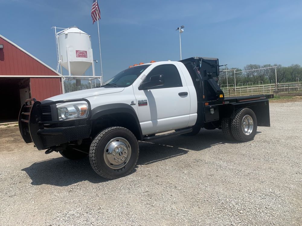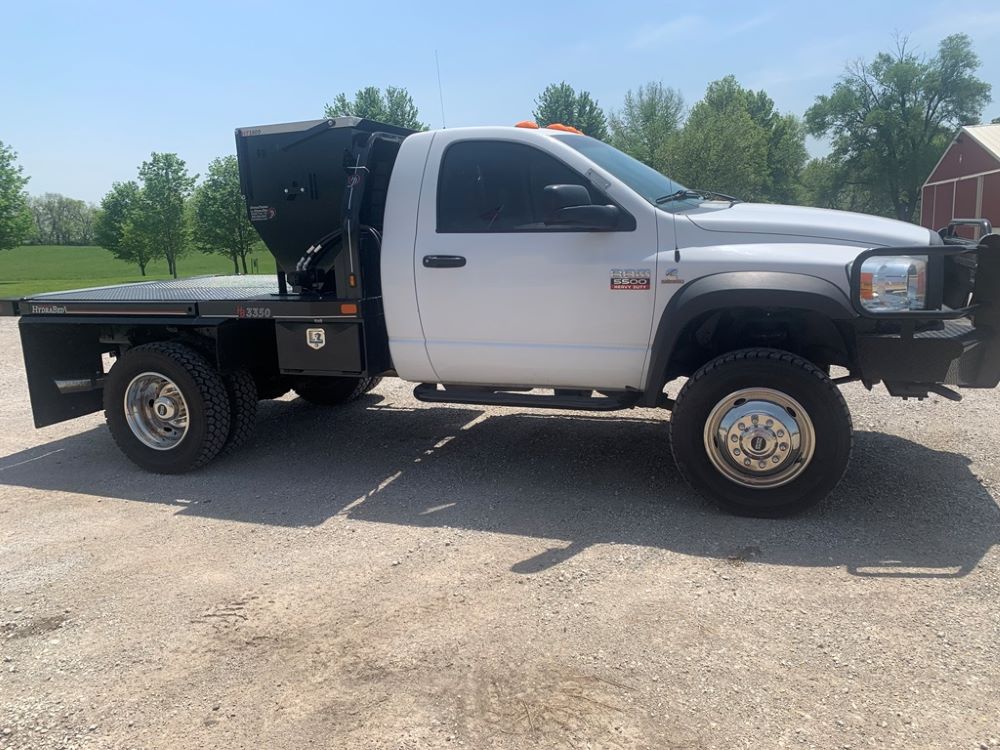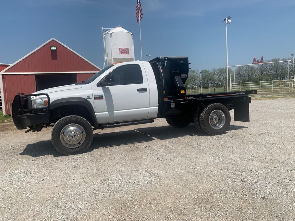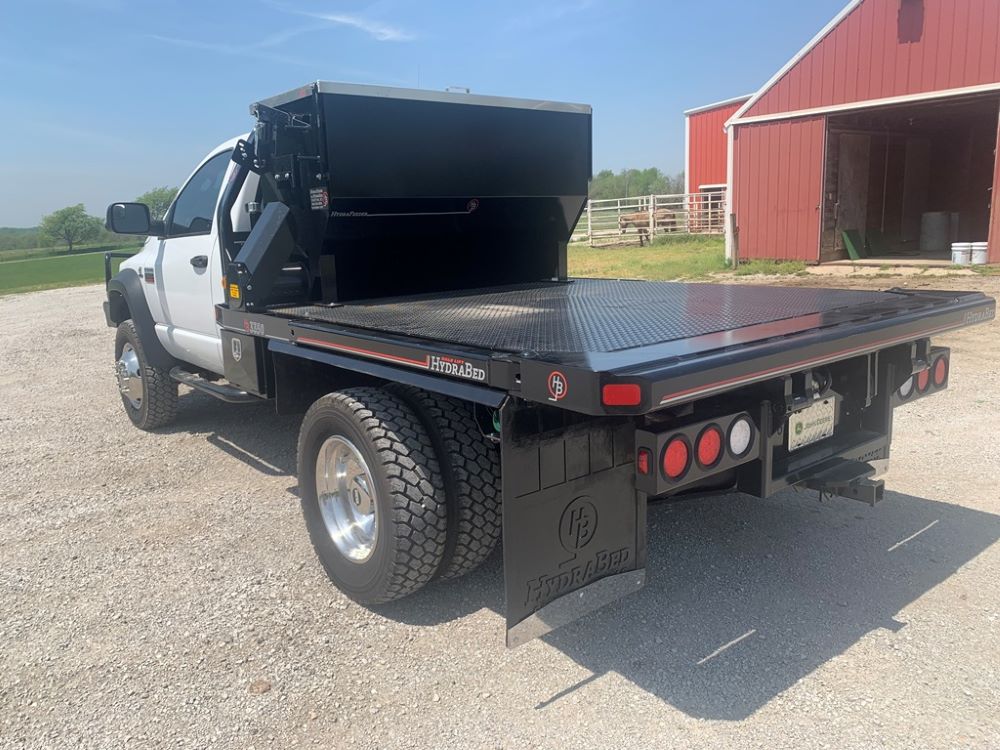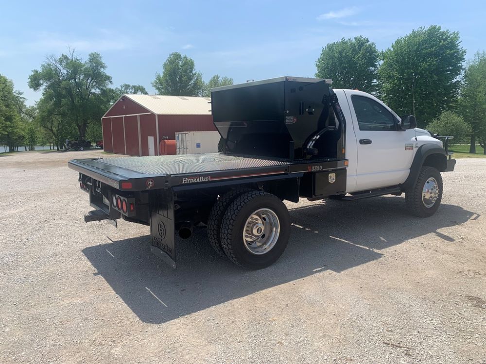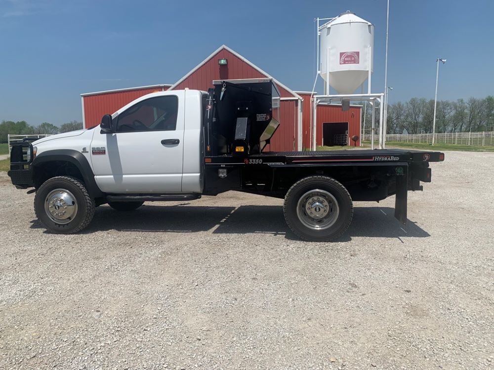 2009 Dodge Ram 5500 Heavy Duty 4x4 Pickup (CP3842), Cummins 6.7L turbo diesel engine, remanufactured automatic transmission, heat, air conditioning, Am/Fm radio, cruise control, HydraBed Model HB3350 Bale Lift w/ HydraFeeder HF1800, dually, front grill guard, running boards, rear receiver hitch, 265/70R19.5 tires, shows 194,234 miles.