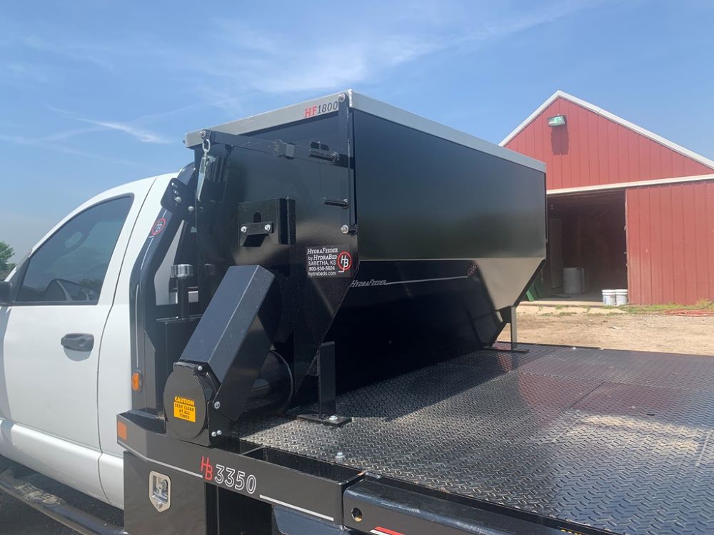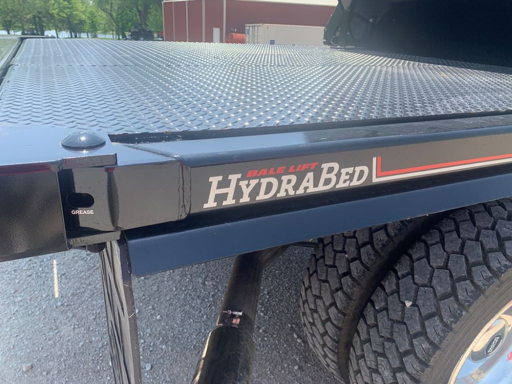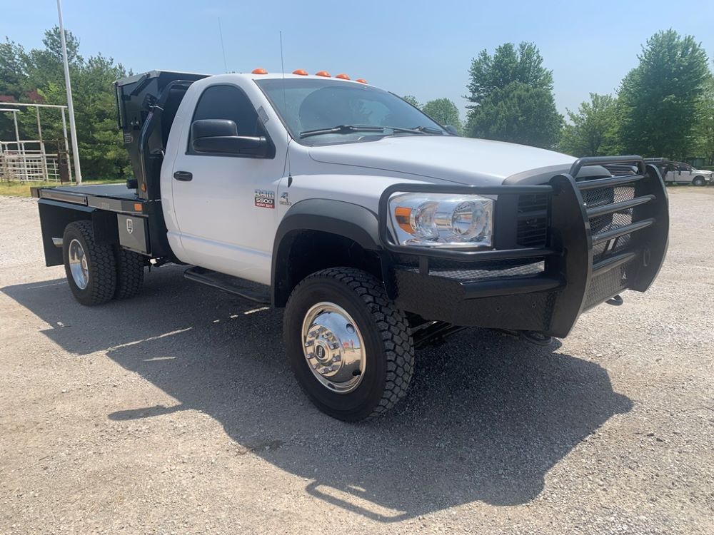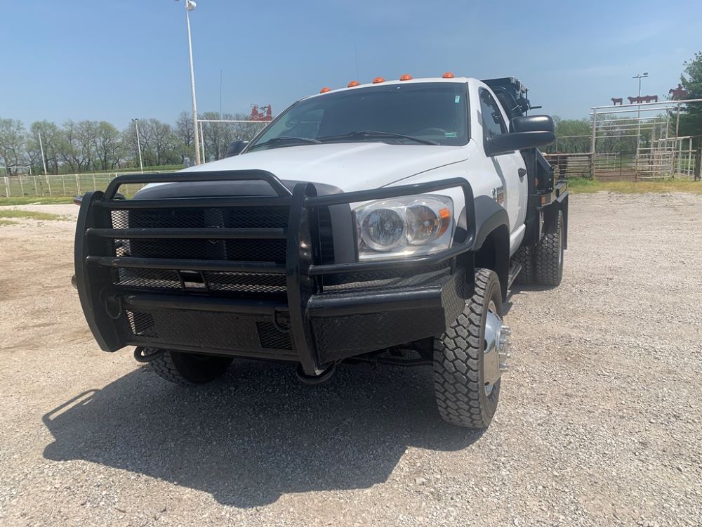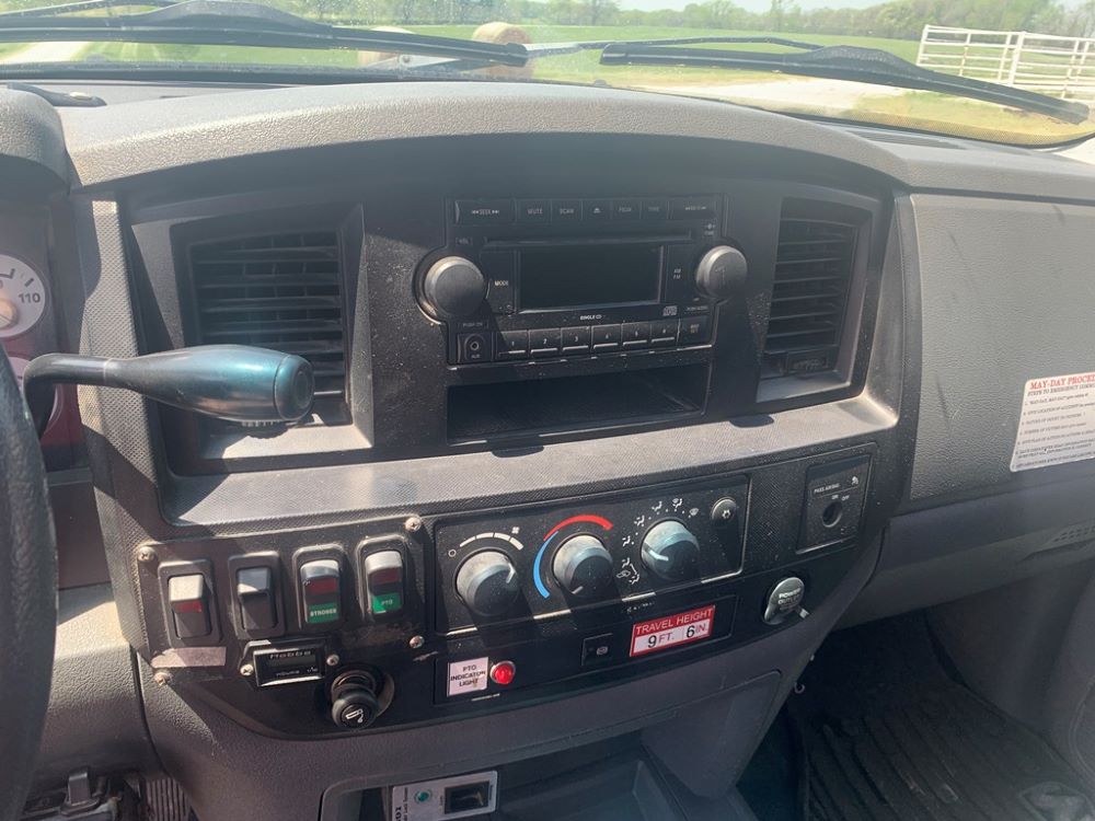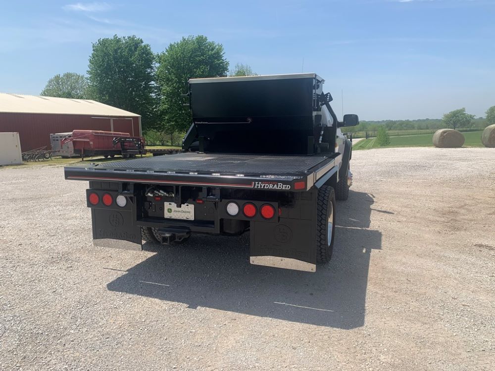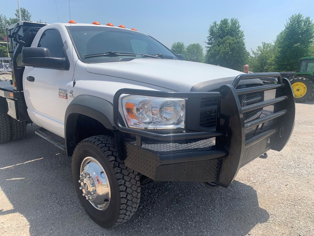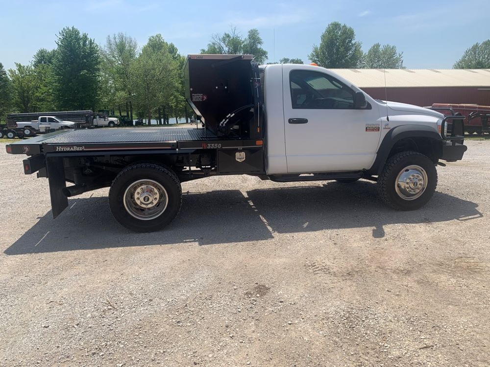 2009 Dodge Ram 5500 Heavy Duty 4x4 Pickup (CP3842), Cummins 6.7L turbo diesel engine, remanufactured automatic transmission, heat, air conditioning, Am/Fm radio, cruise control, HydraBed Model HB3350 Bale Lift w/ HydraFeeder HF1800, dually, front grill guard, running boards, rear receiver hitch, 265/70R19.5 tires, shows 194,234 miles.