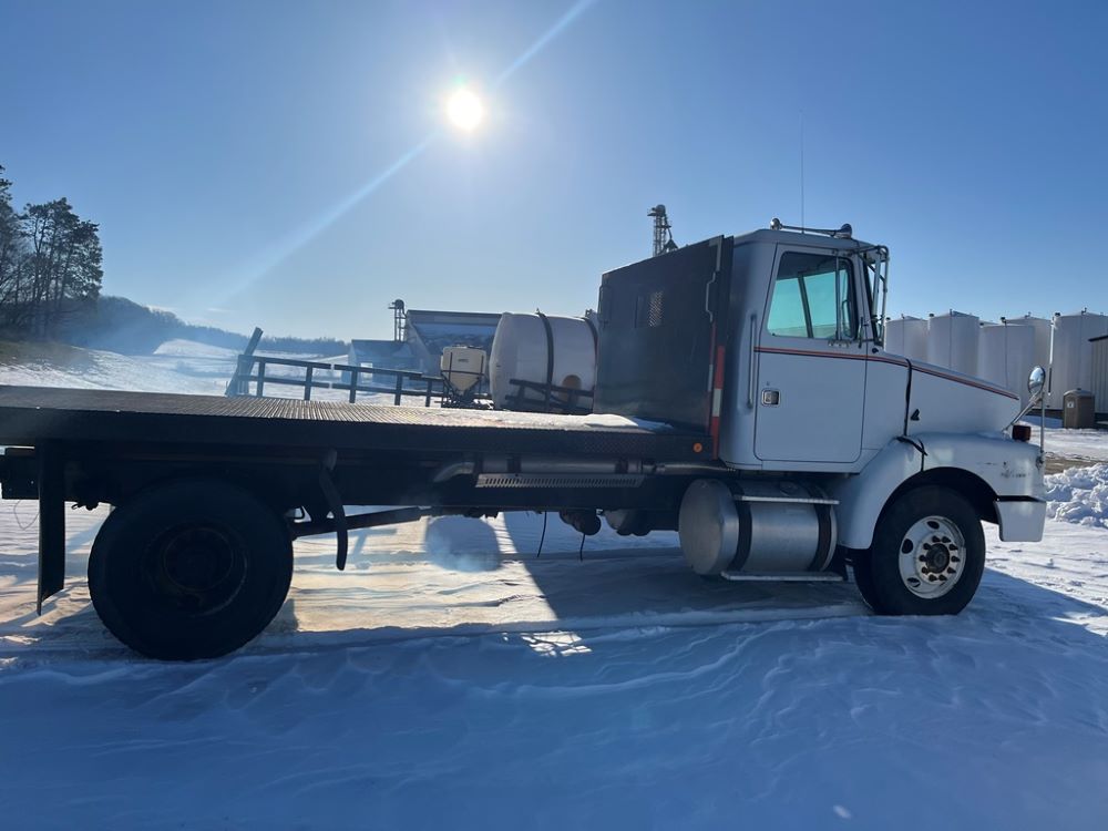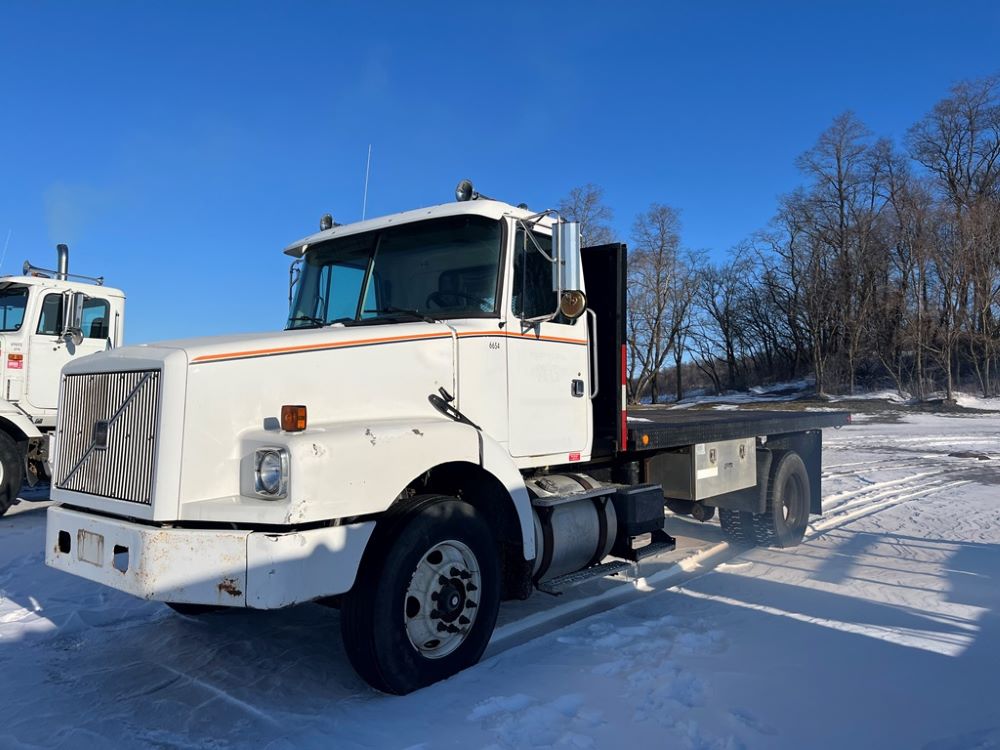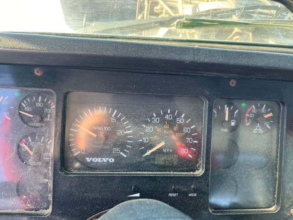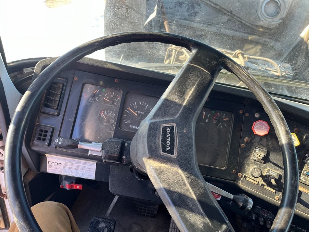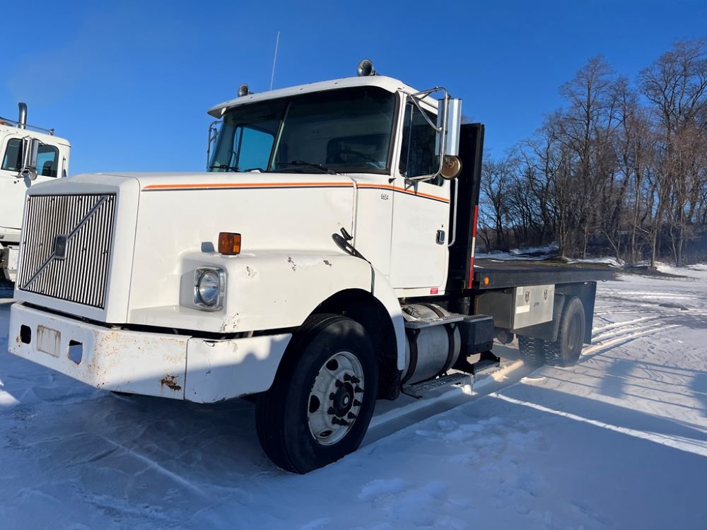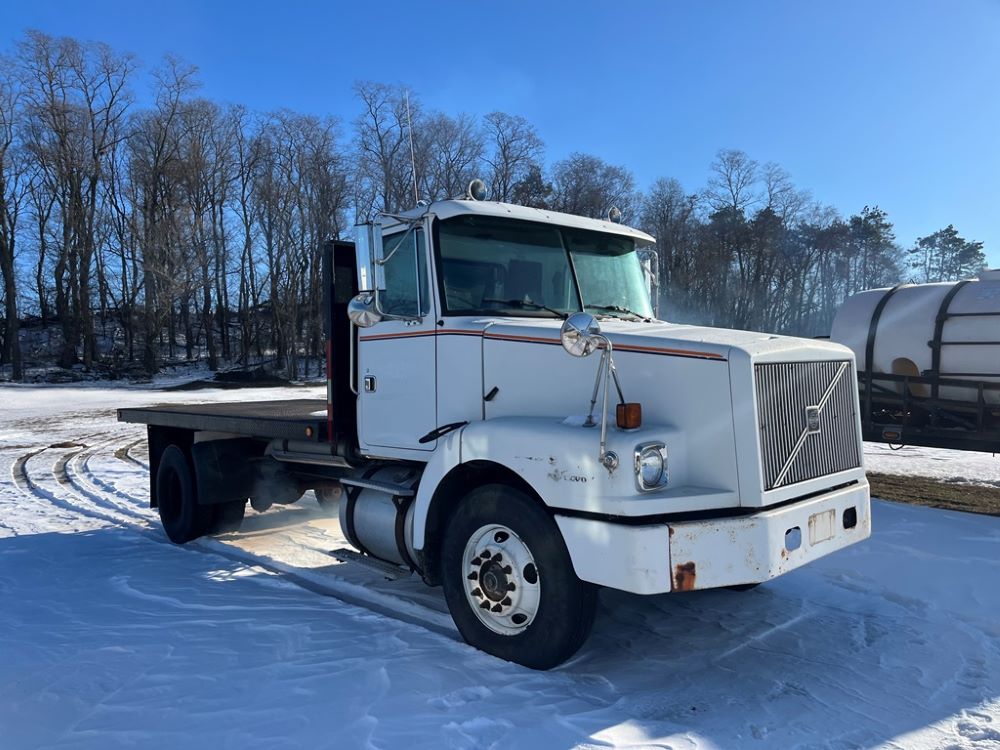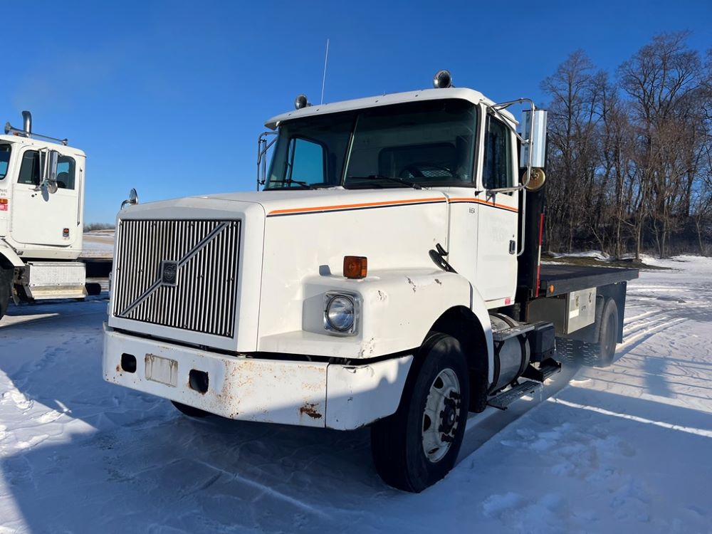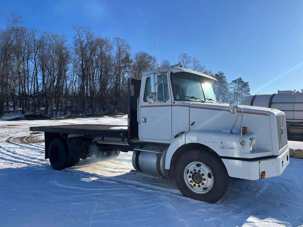 1996 Volvo Flatbed Truck (DR8113 Unit 6654), Cummins diesel engine, 10 speed transmission, single axle, dual aluminum fuel tanks, frame mounted storage box, 16' steel flatbed, cab heat/air conditioning, 22.5 tires.