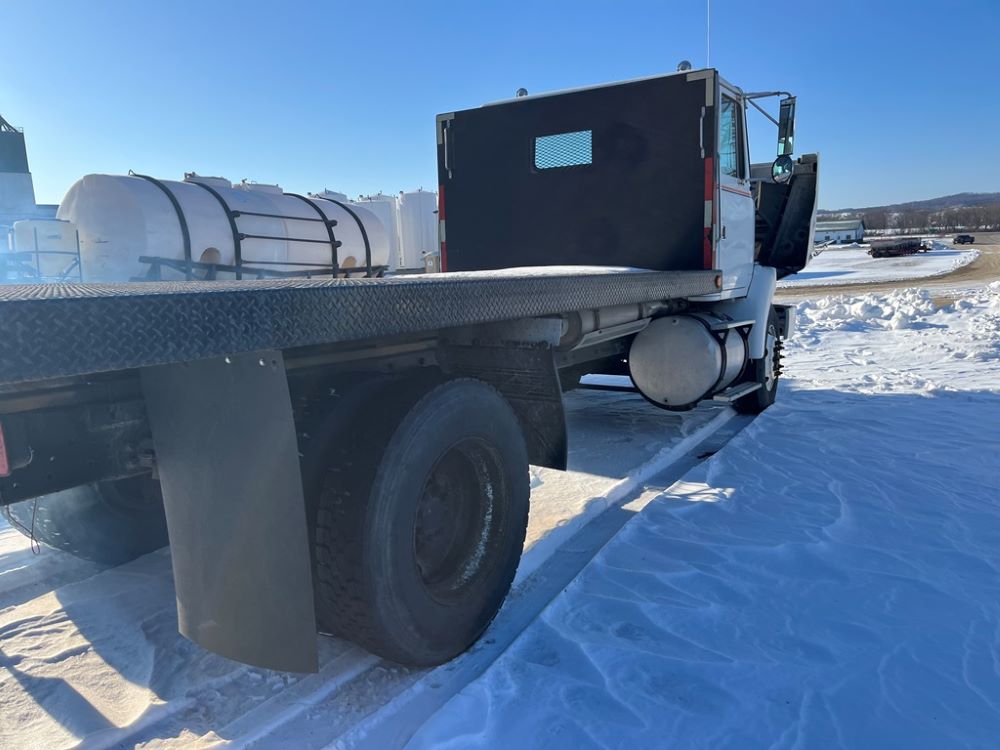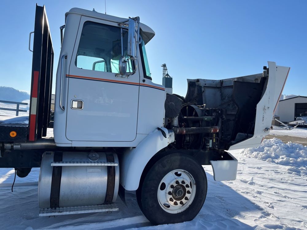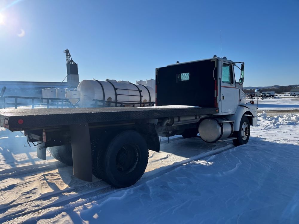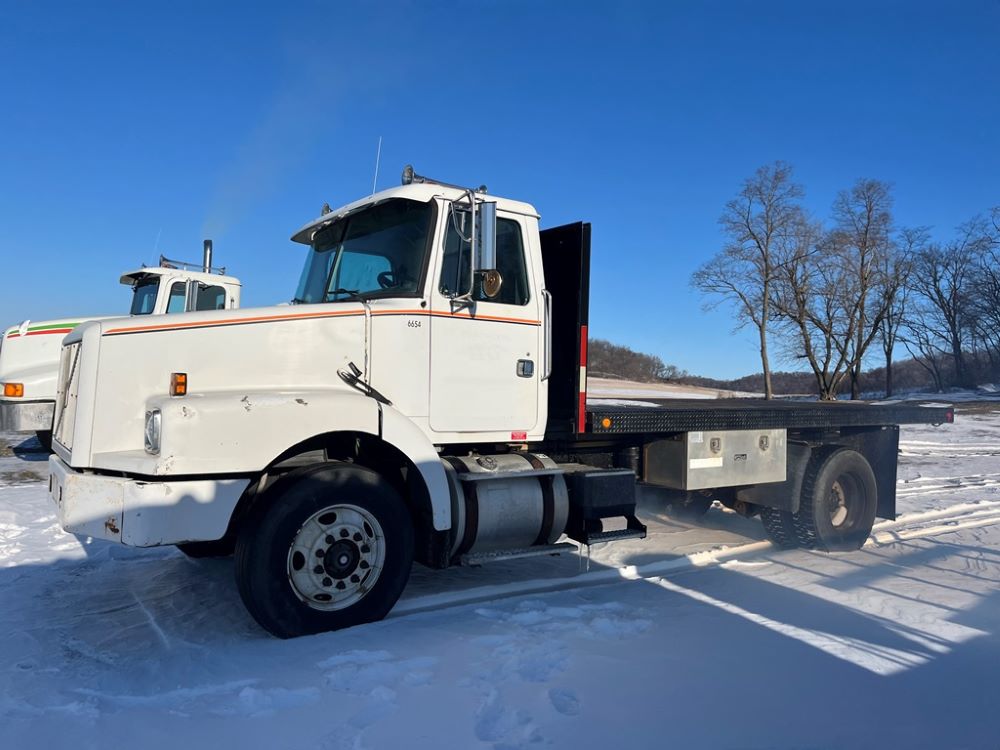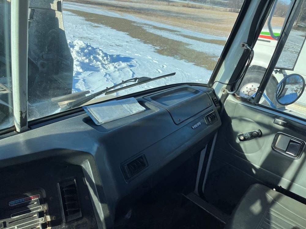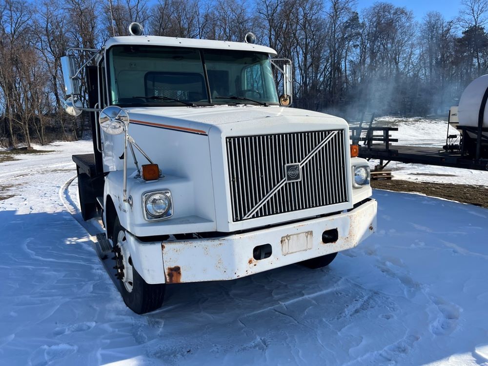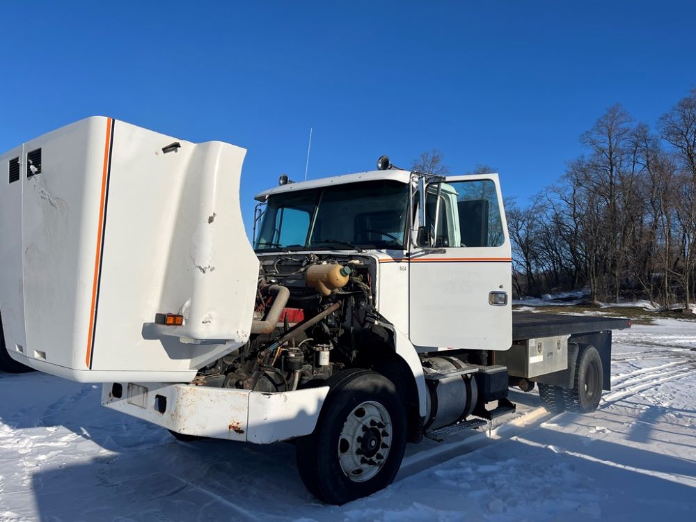 1996 Volvo Flatbed Truck (DR8113 Unit 6654), Cummins diesel engine, 10 speed transmission, single axle, dual aluminum fuel tanks, frame mounted storage box, 16' steel flatbed, cab heat/air conditioning, 22.5 tires.
