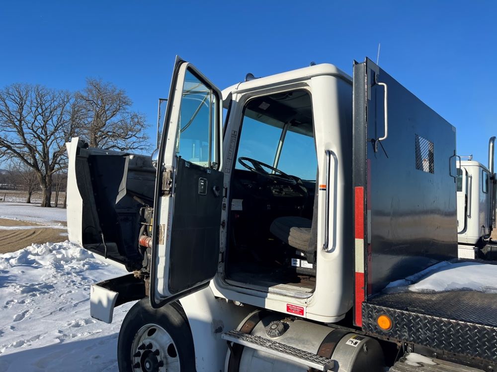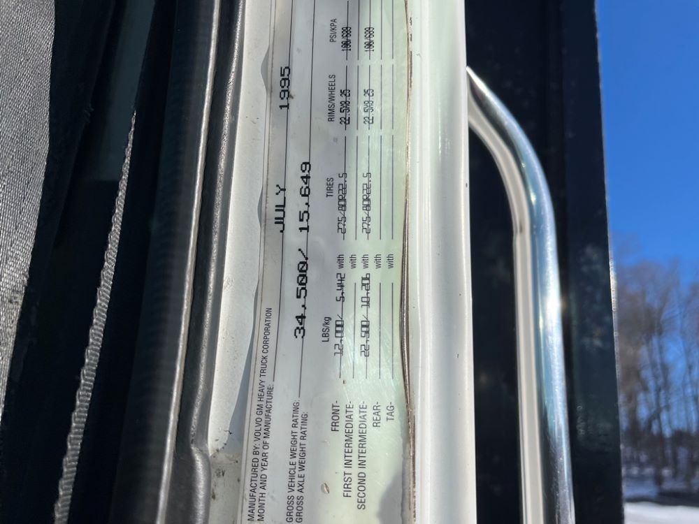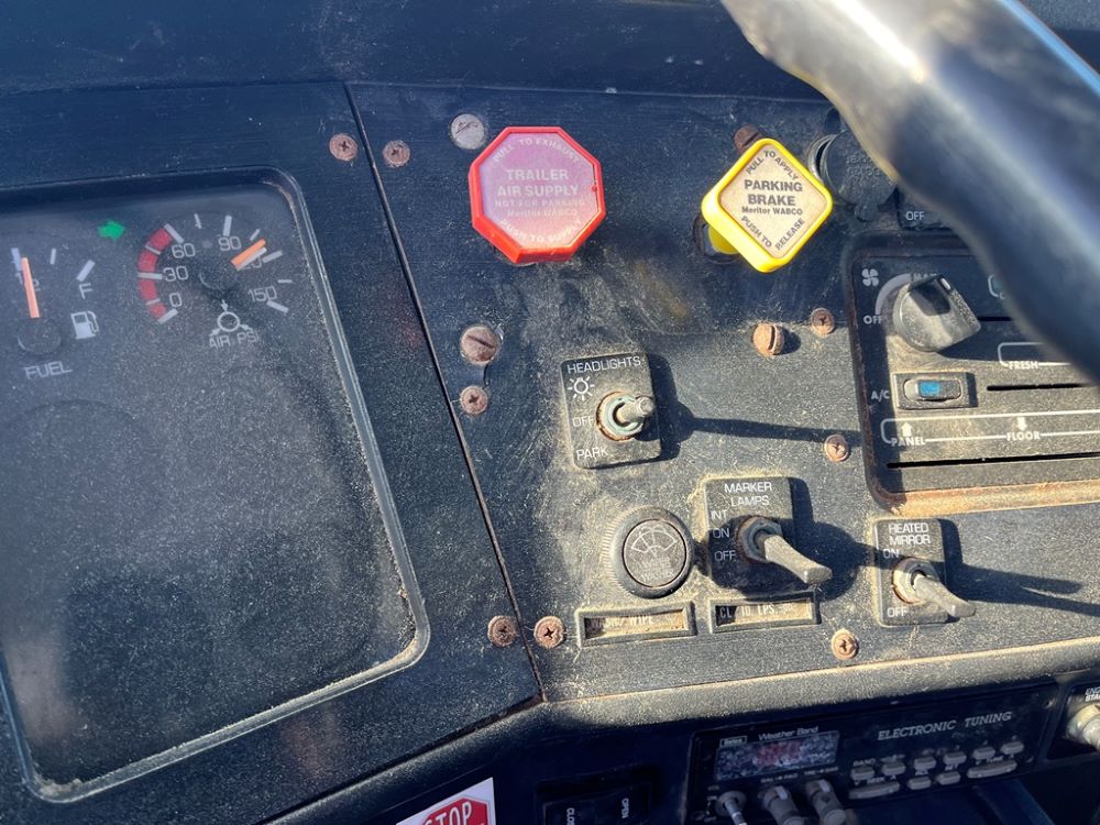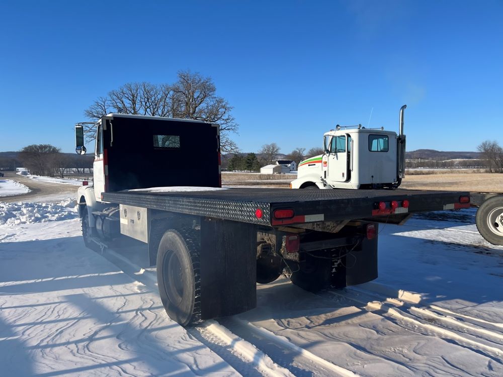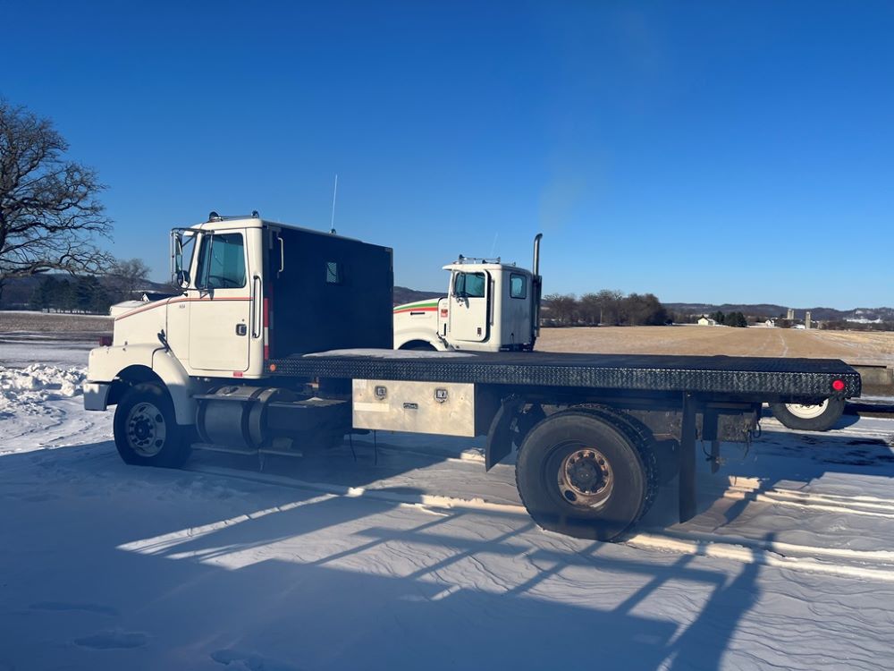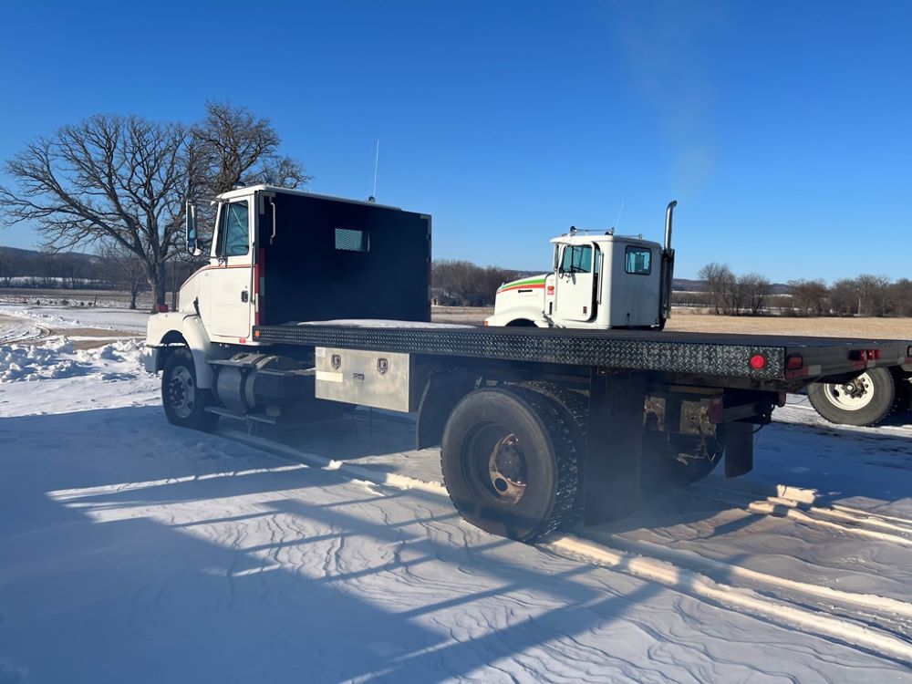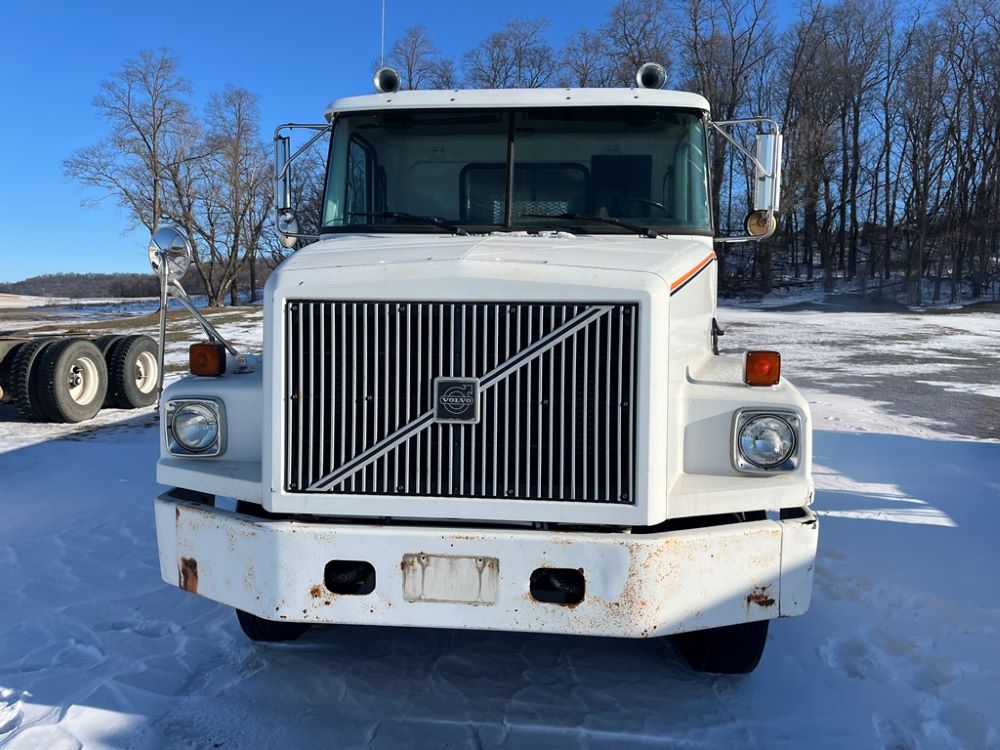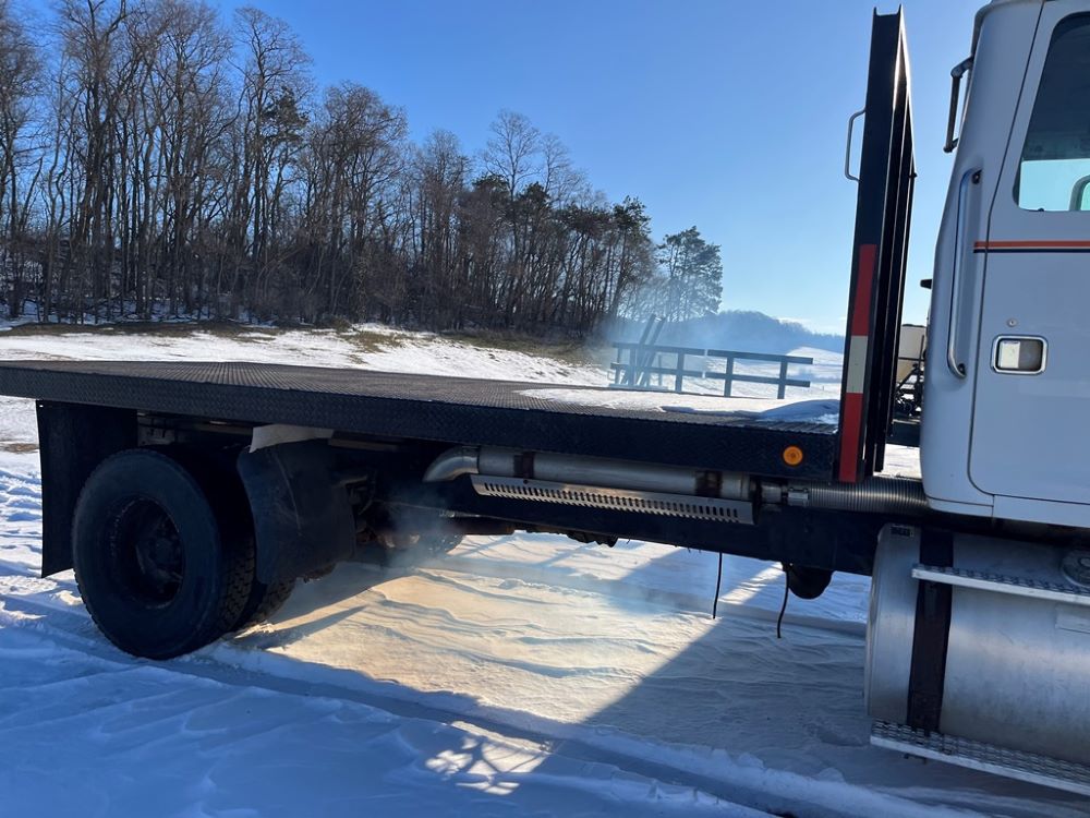 1996 Volvo Flatbed Truck (DR8113 Unit 6654), Cummins diesel engine, 10 speed transmission, single axle, dual aluminum fuel tanks, frame mounted storage box, 16' steel flatbed, cab heat/air conditioning, 22.5 tires.