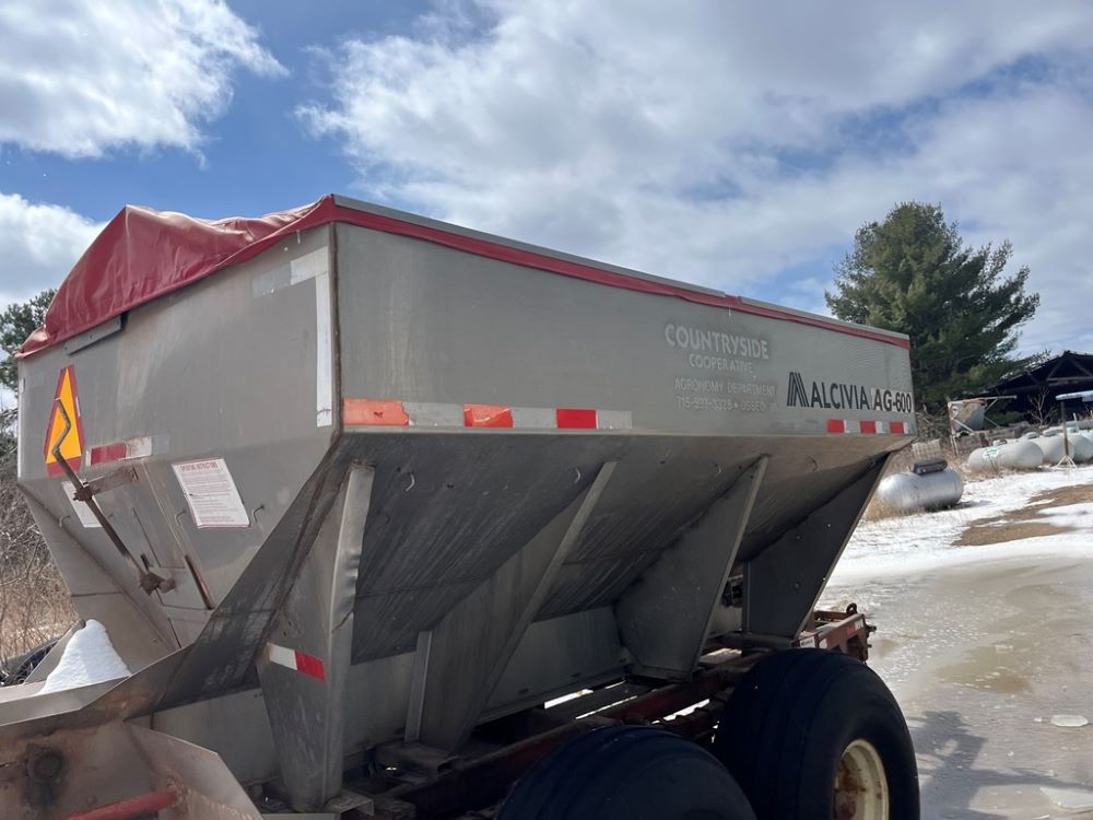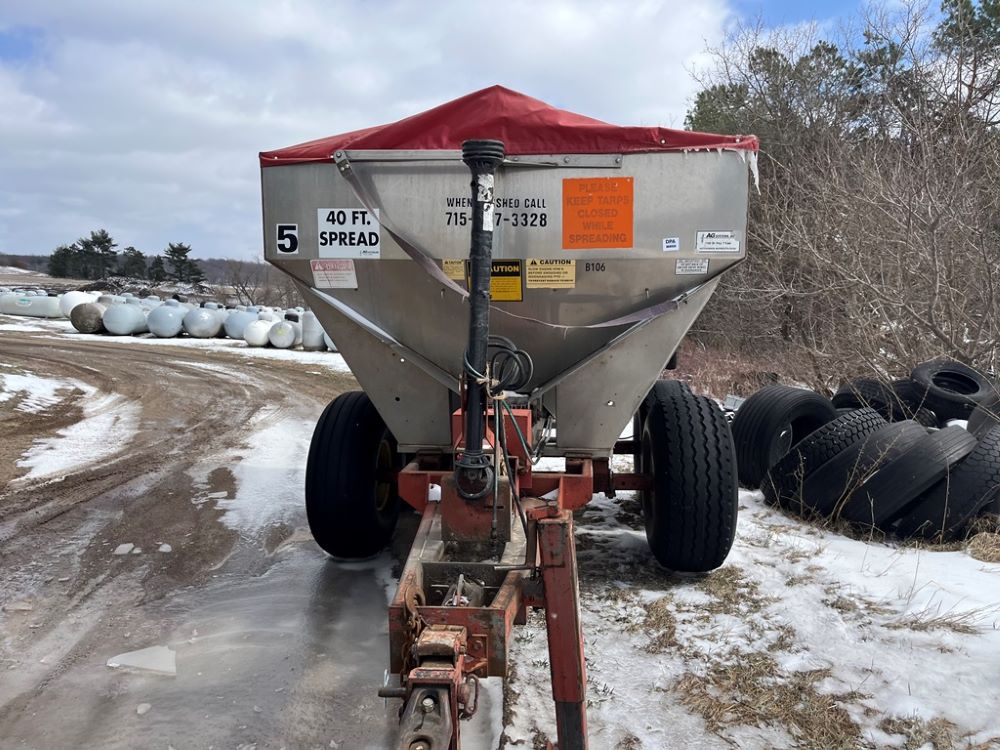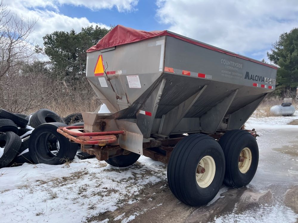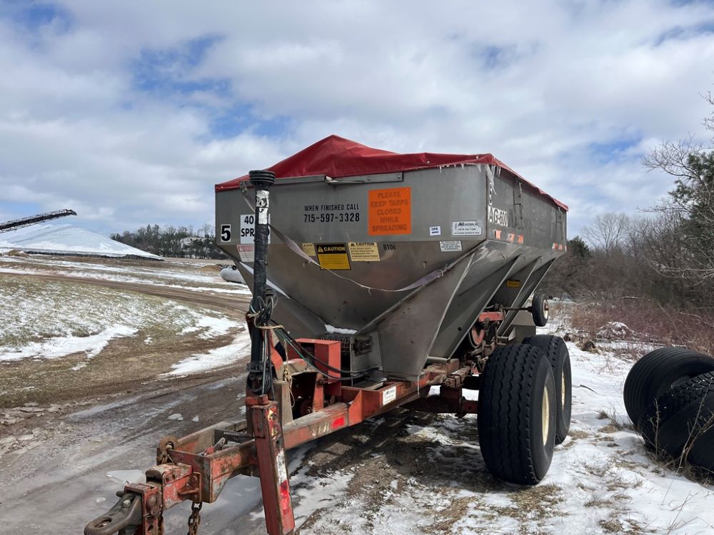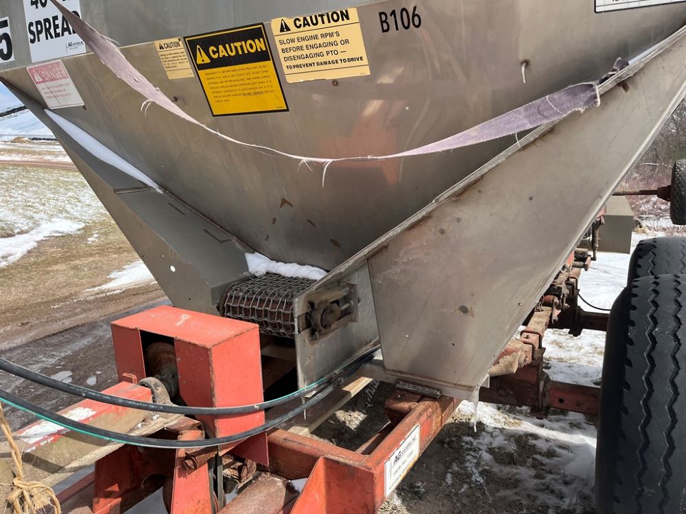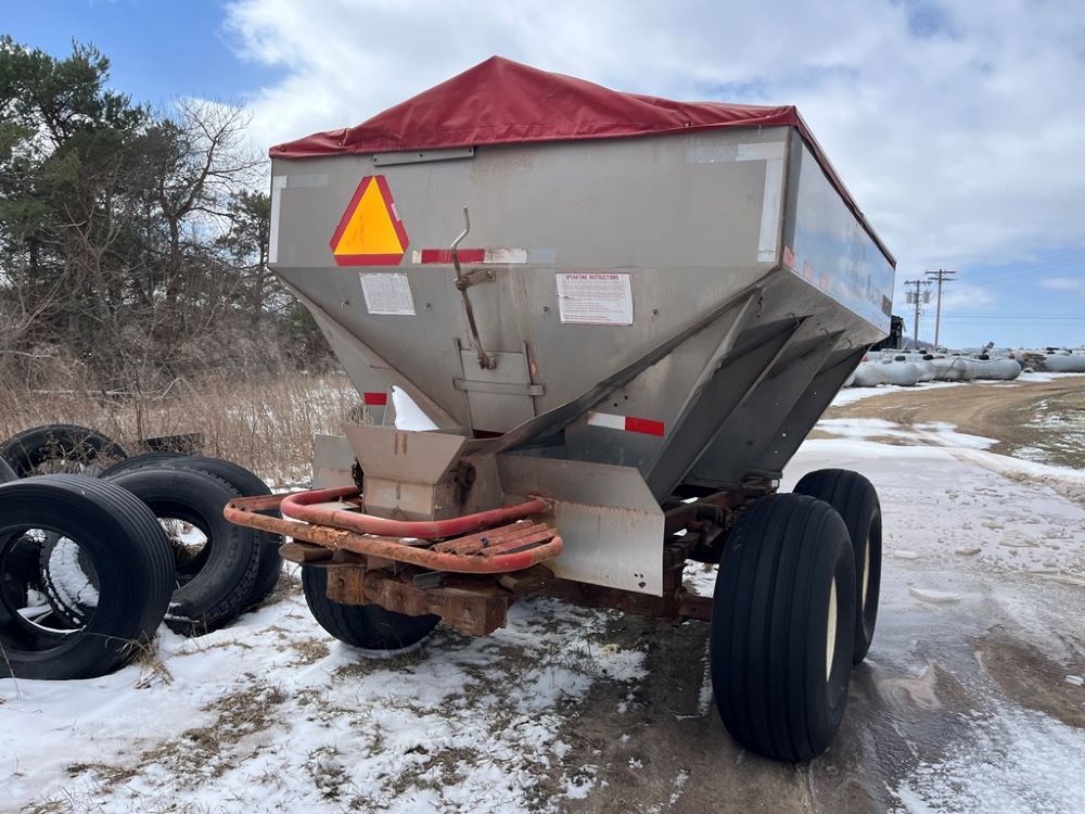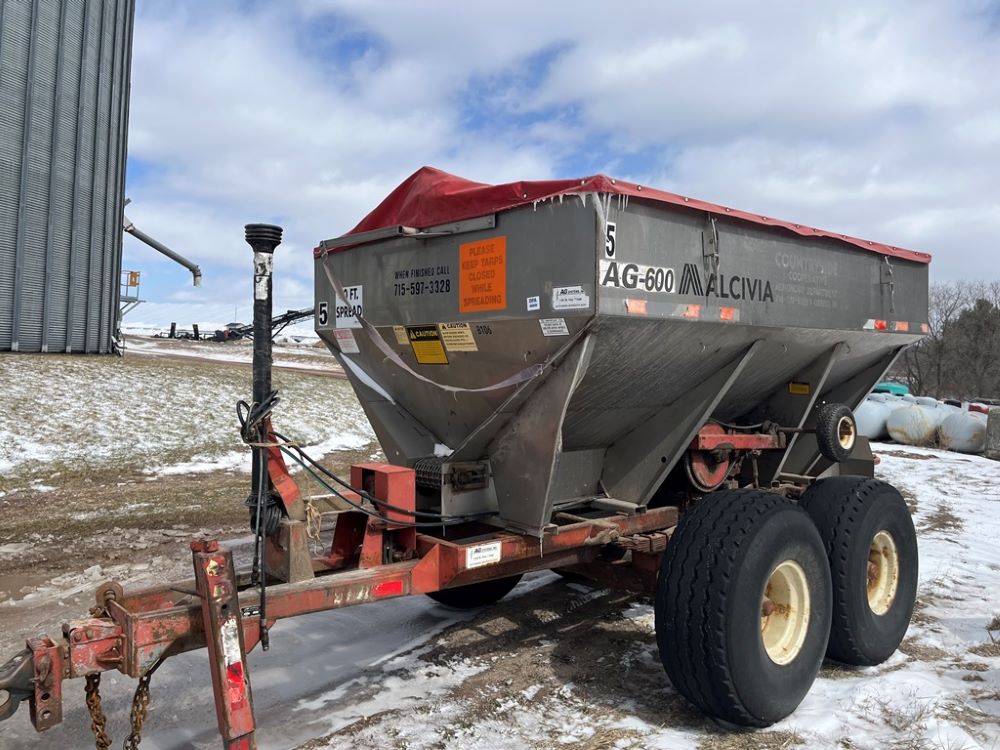 Ag Systems Spreader (DR8099), model AG600 stainless steel dry spreader buggy, dual ground drive rear spinner pans, PTO drive web chain w/hydraulic shutoff, manual tarp, 16.5L-16.1 tires.
