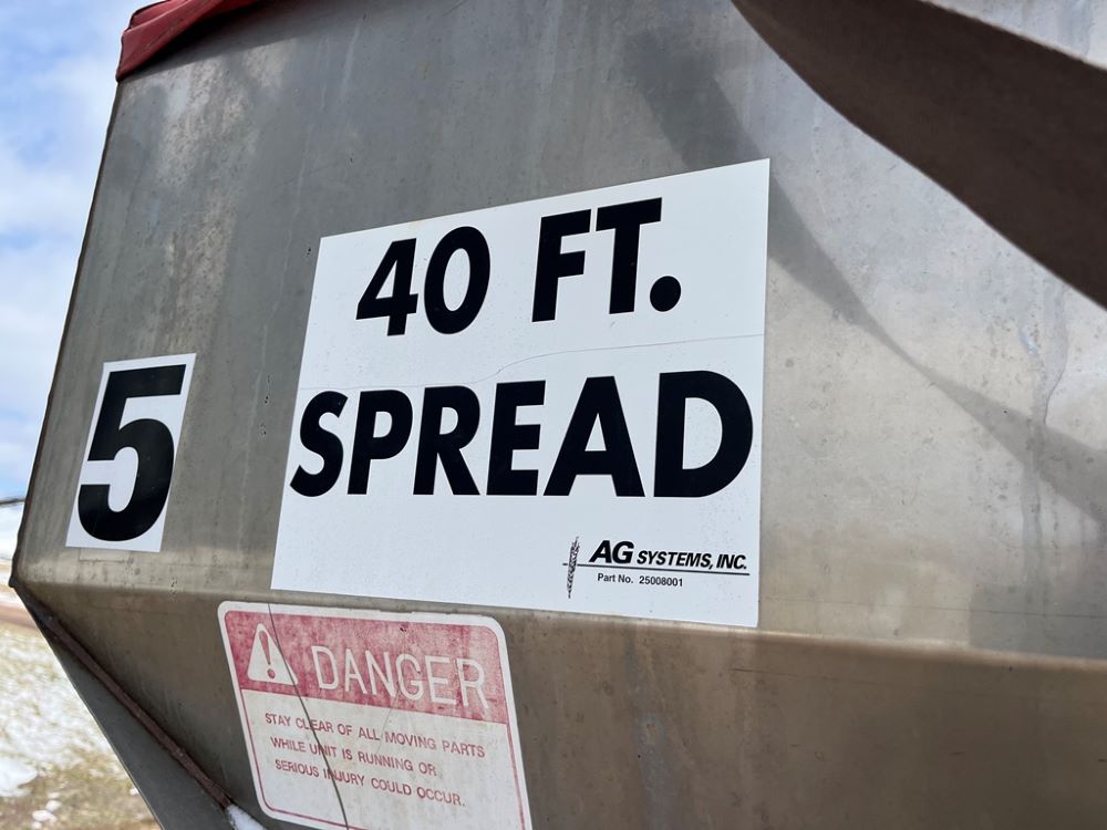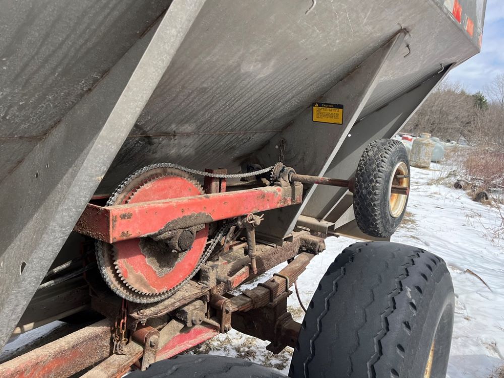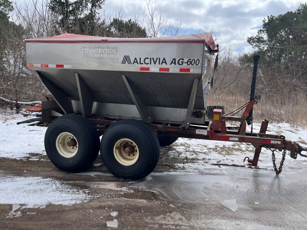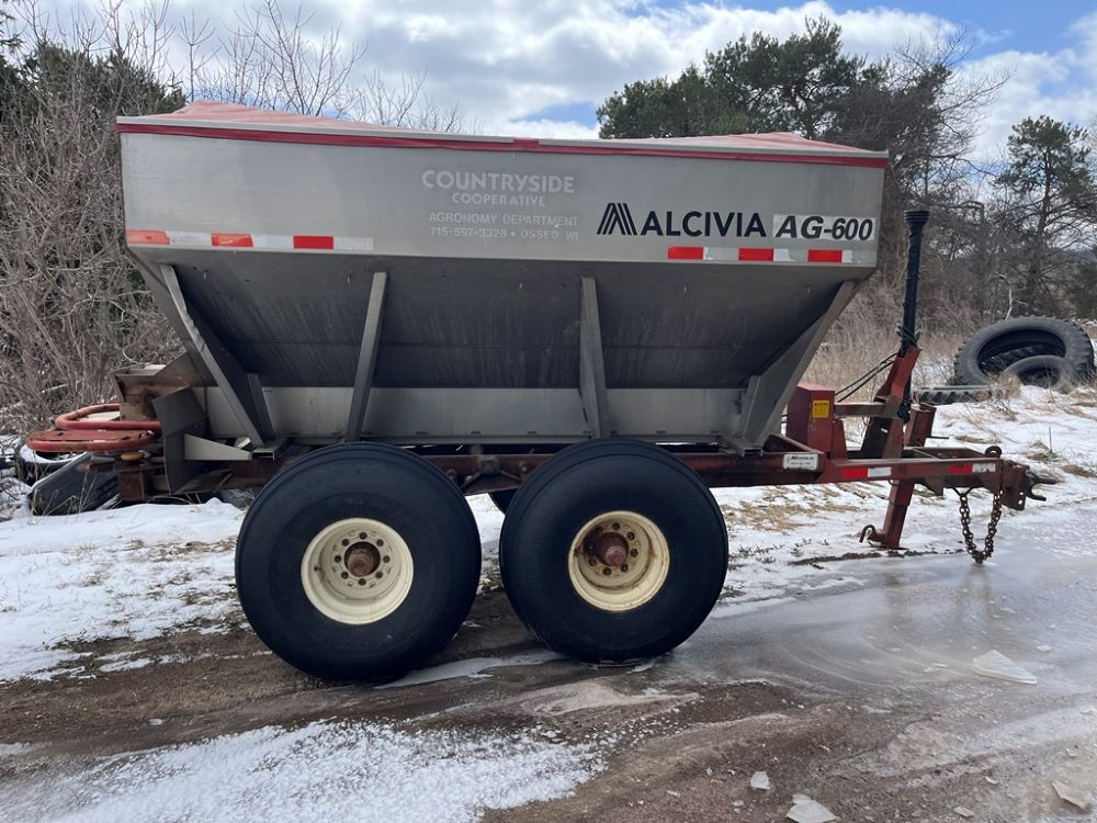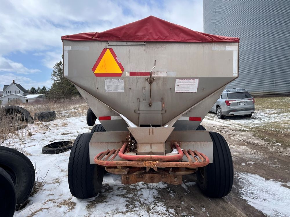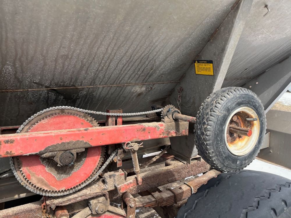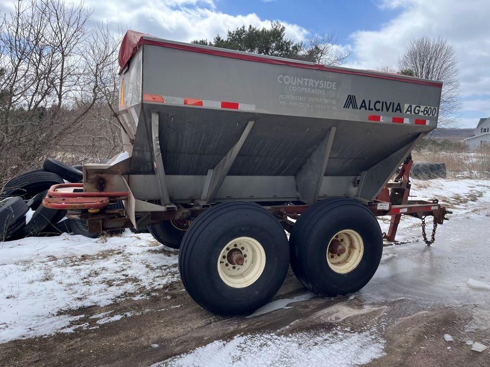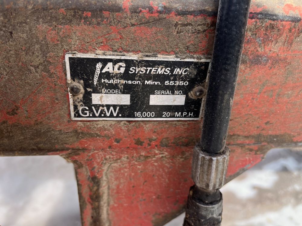 Ag Systems Spreader (DR8099), model AG600 stainless steel dry spreader buggy, dual ground drive rear spinner pans, PTO drive web chain w/hydraulic shutoff, manual tarp, 16.5L-16.1 tires.