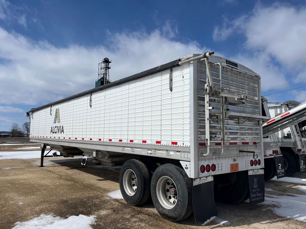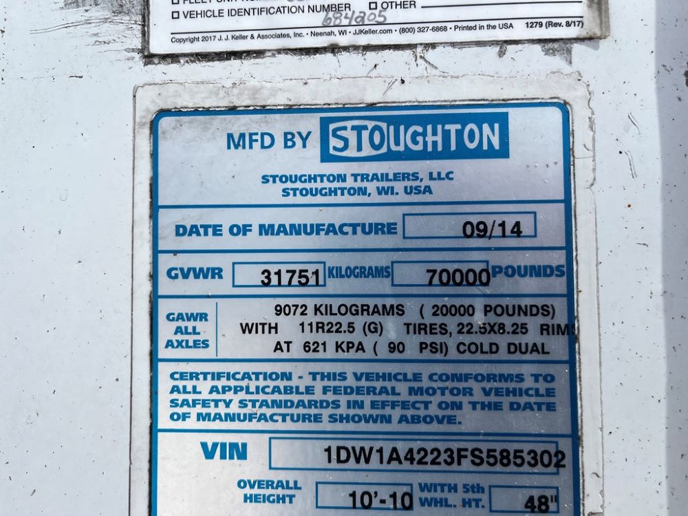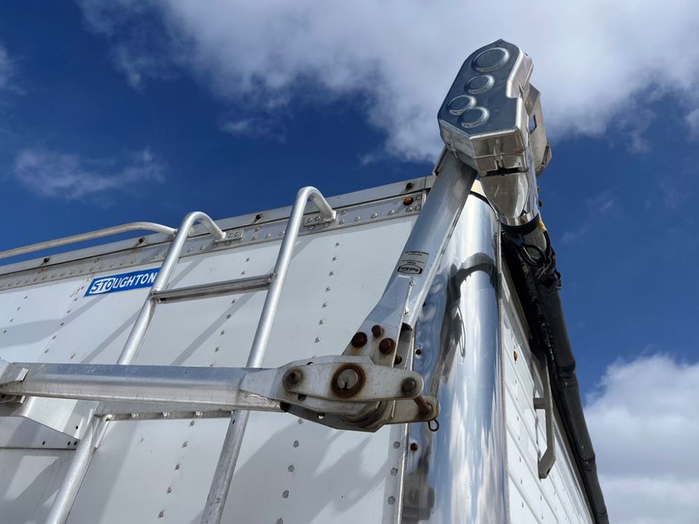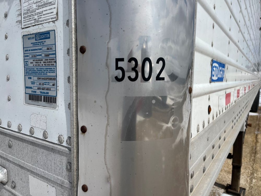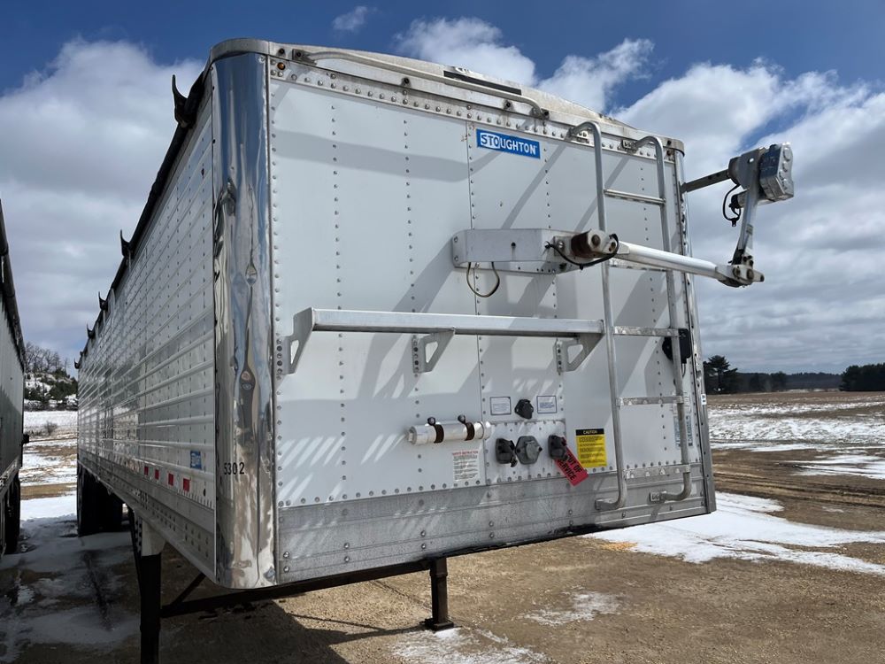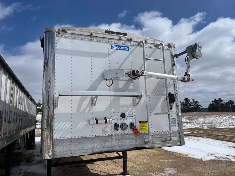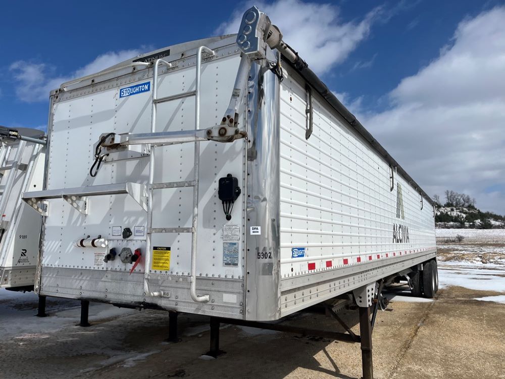 2015 Stoughton Hopper Trailer (DR8100 Unit 5302), aluminum grain hopper trailer, 66'' sides, electric roll over tarp, ag hoppers, air ride suspension, tandem axle, 22.5 tires, all aluminum wheels.
