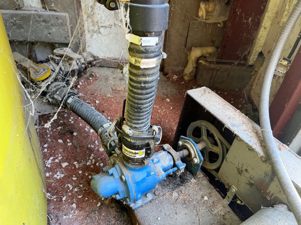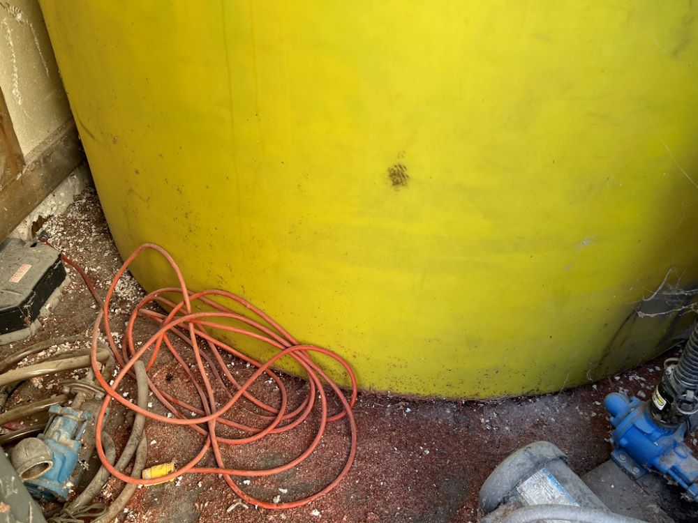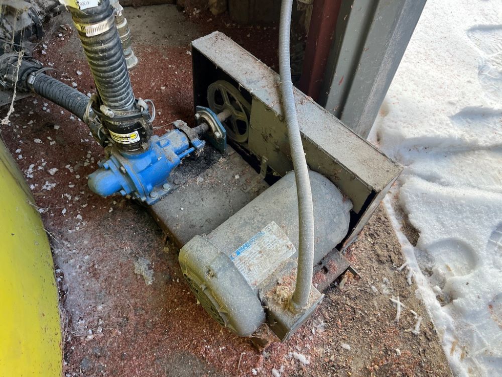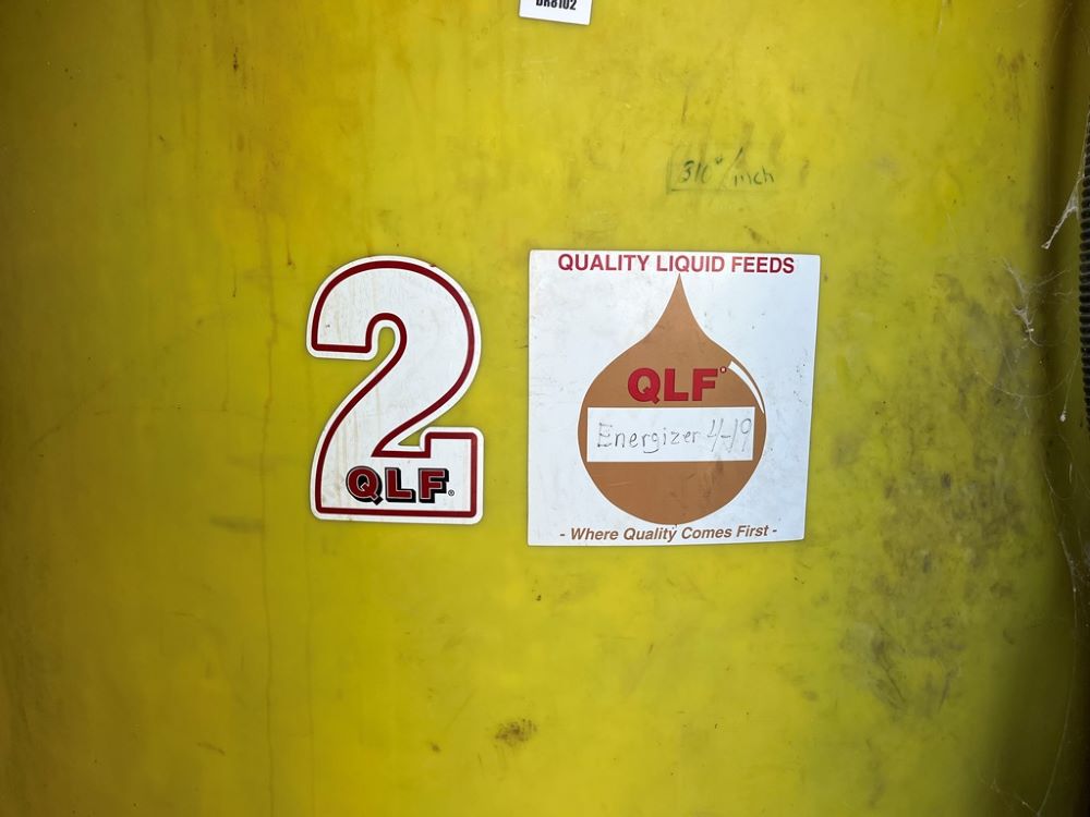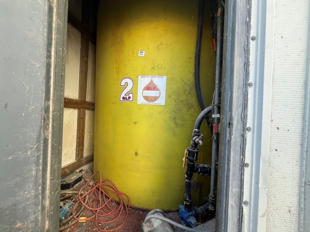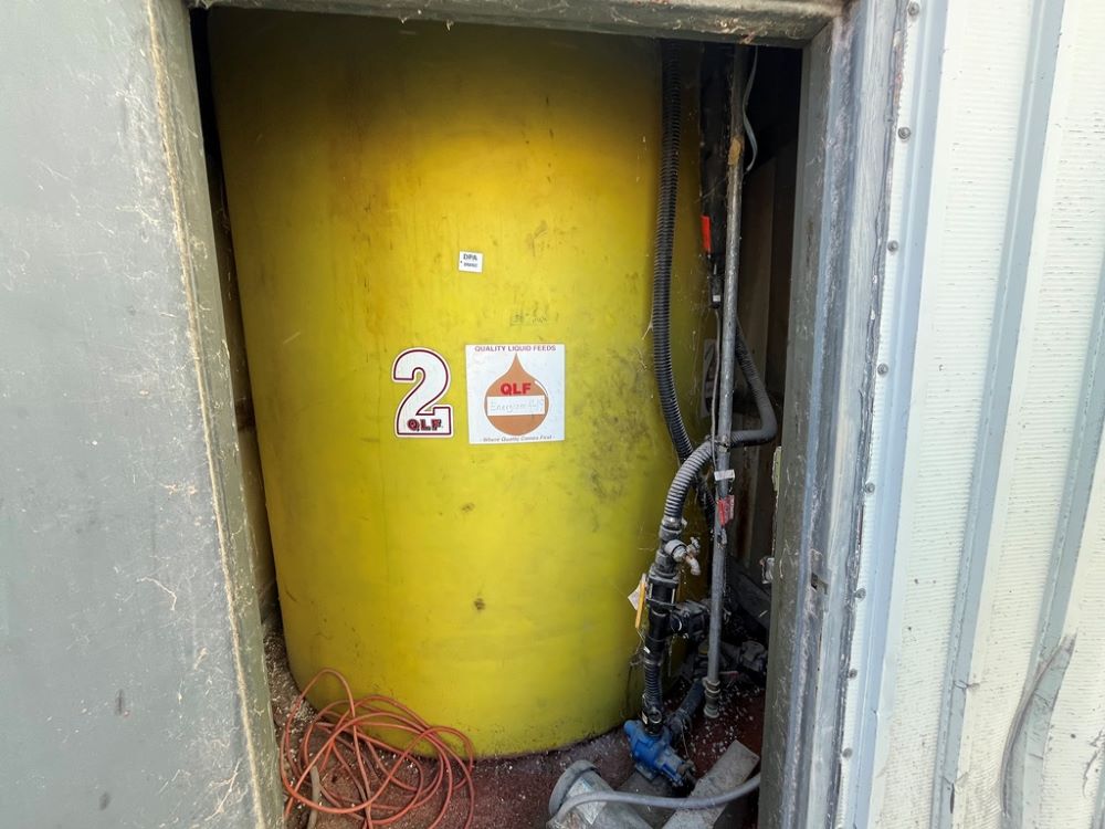 Poly Fat Tank (DR8102), approximately 2,000 gallon poly flat bottom liquid tank, was used in insulated building molasses, molasses pump and electric motor.