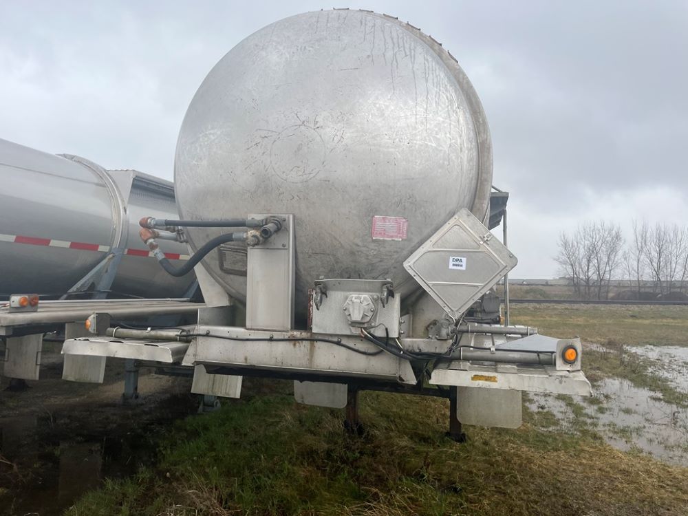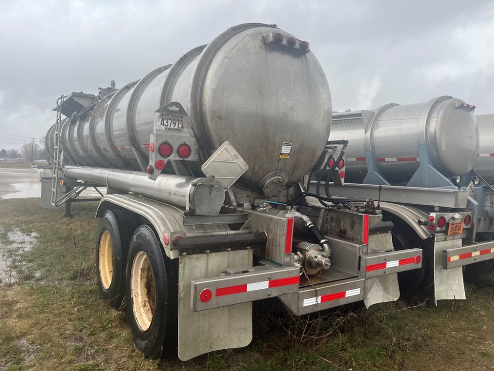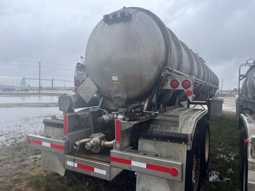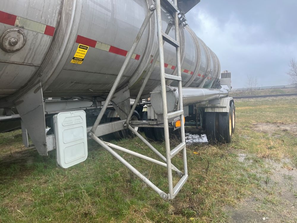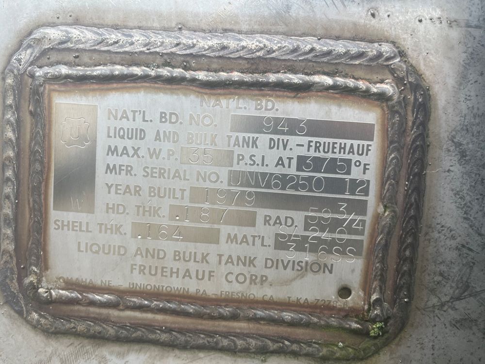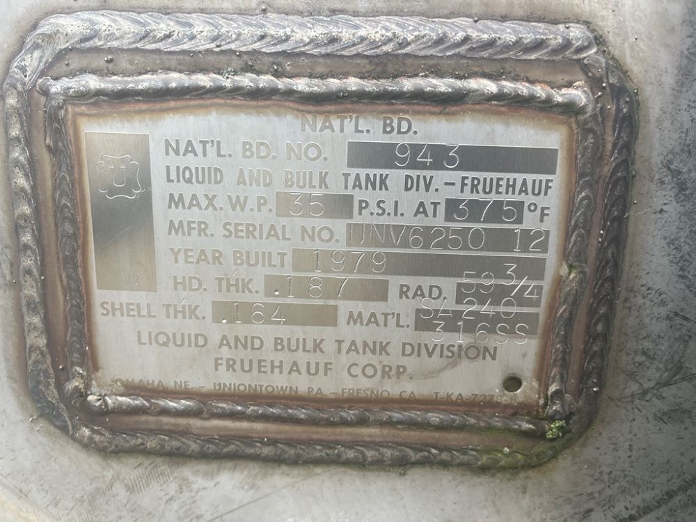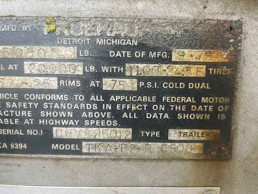 1979 Fruehauf Liquid Trailer (DR8056 Unit 5012), single compartment stainless steel liquid trailer, 5,500 gallon capacity, PTO hydraulic pump, rear discharge, tandem axle, data tag, 24.5 tires.